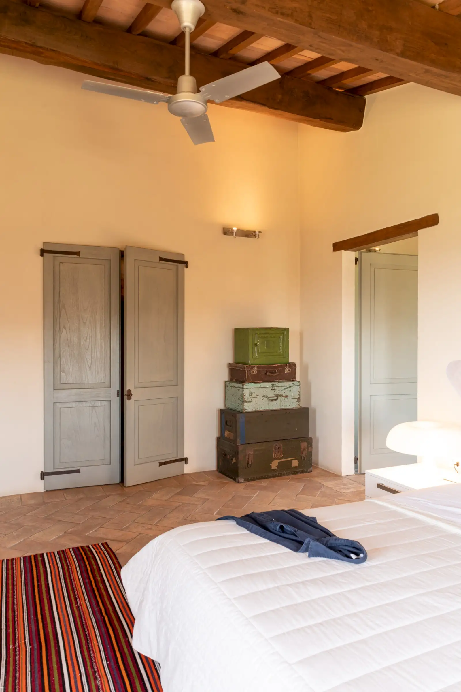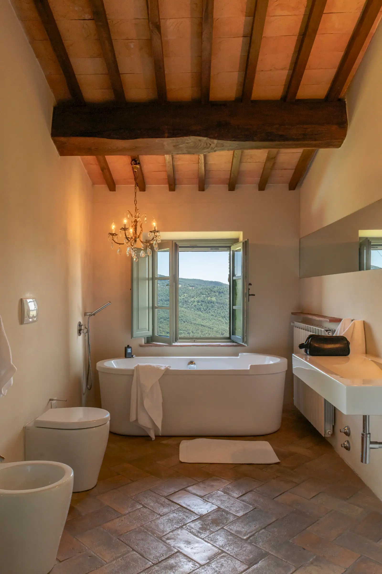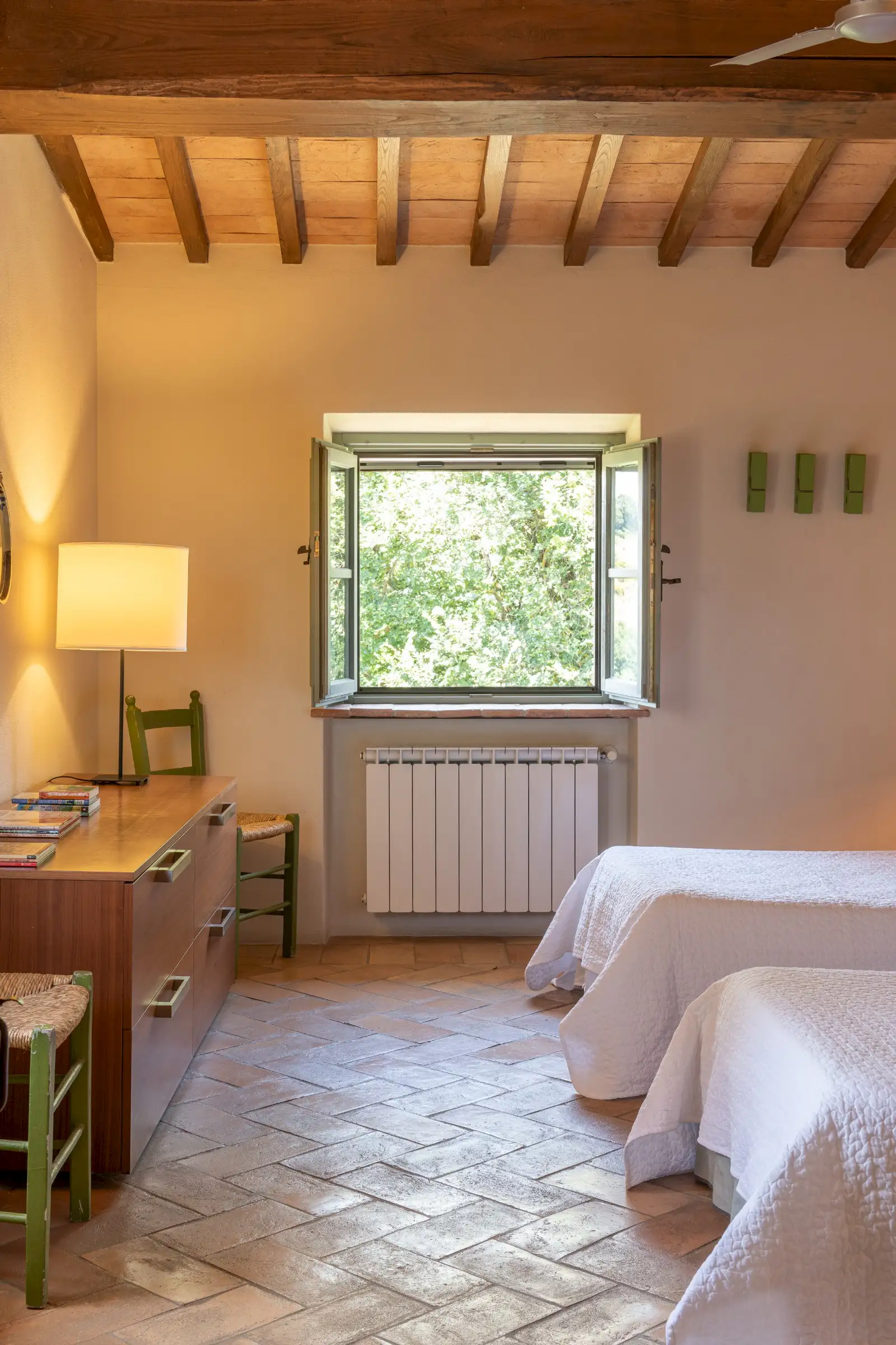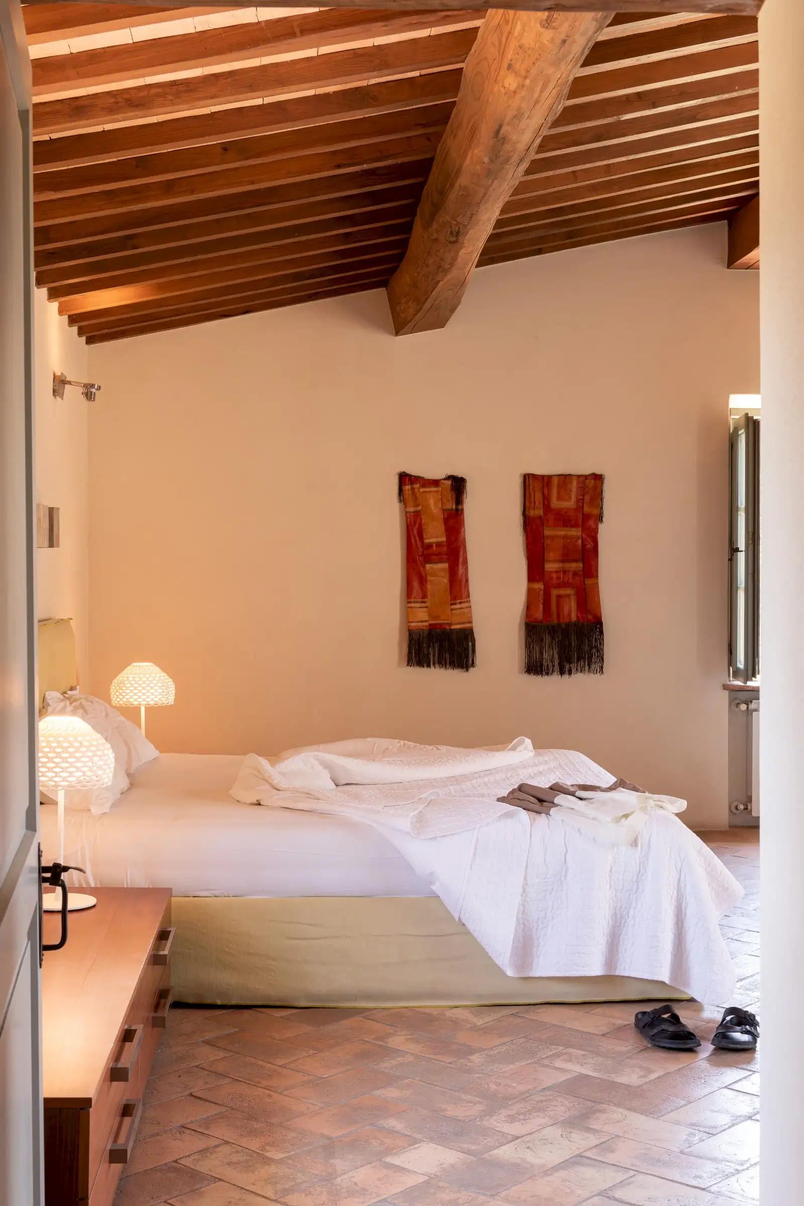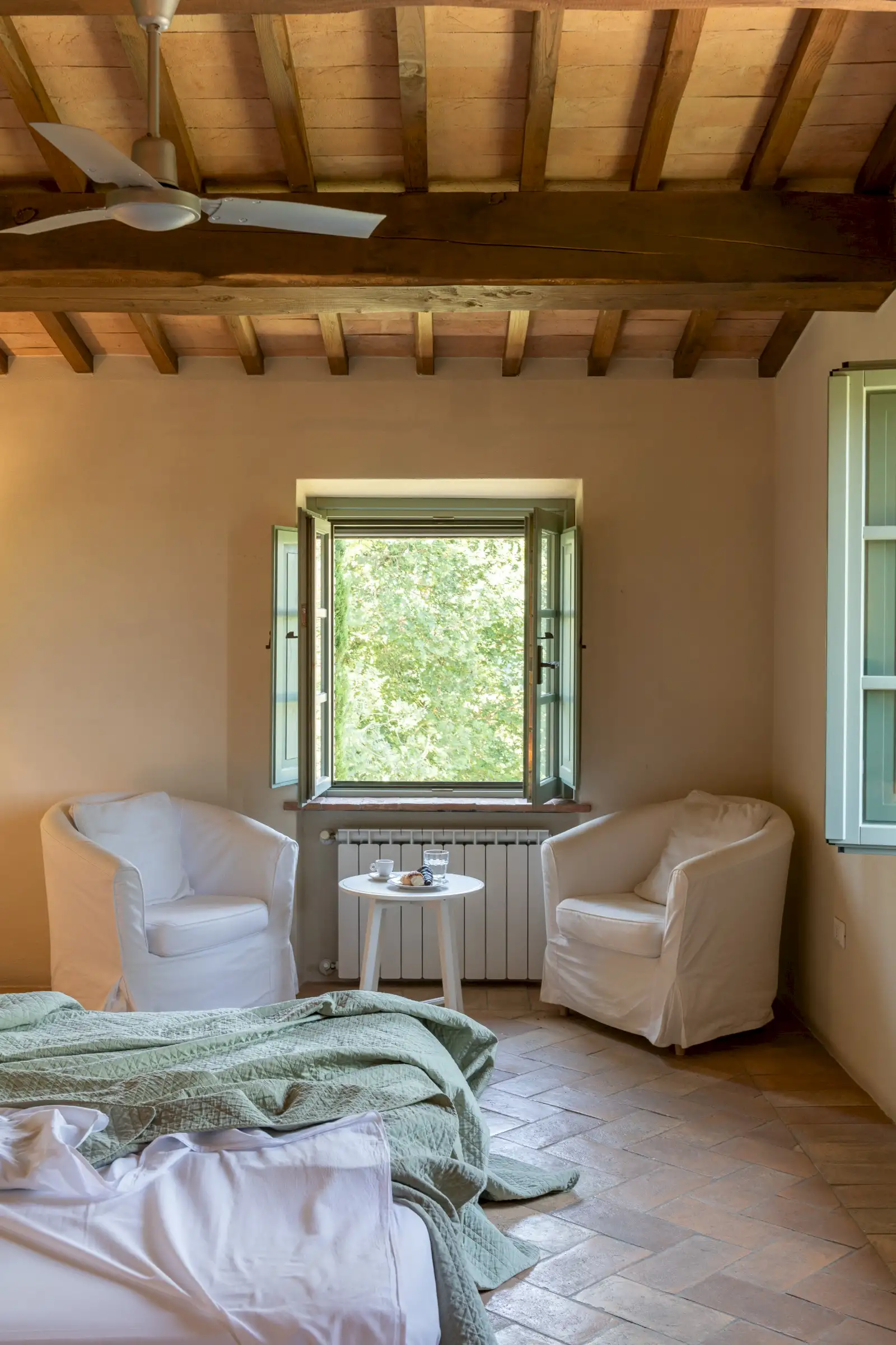 4 rooms with king size beds, 1 with a twin bed, 2 extra spear beds   All bedrooms have ceiling fans, built-in closets, and plenty of drawer space.  On the ground floor is the bedroom Amiata with a king size bed and a large en suite bathroom with wheelchair accessible shower. With windows facing pastures, ravines, and hills to the west, this bedroom is especially convenient for anyone who may have difficulty climbing stairs.  There are four bedrooms on the first floor. Bedroom Rufeno has a king size bed and luxurious private bath with a shower and a freestanding bathtub. It has exceptional views of Trevinano and the regional park across the valley.  Bedroom Proceno has a king size bed, a fireplace with sitting area, a private outdoor terrace and entrance. The bathroom has a spacious shower and two sinks. In addition to views of Monte Rufeno, it offers a spectacular panorama of the valley of the Paglia River, Acquapendente, Proceno, and in the distance the profile of the caldera of Lake Bolsena.  Bedroom Trevinano has a king size bed with sitting area and features unspoiled views of Trevinano looking up the valley as well as pastures, hills, and ravines below. Since the room is exceptionally large, an extra single bed can easily be added to accommodate an additional person. Adjacent is a large full bathroom with separate shower, bathtub, and two sinks which is shared with Bedroom Cetona.  Bedroom Cetona is a cozy room equipped with two twin beds. It has windows facing south and west and shares a bathroom with Bedroom Trevinano.