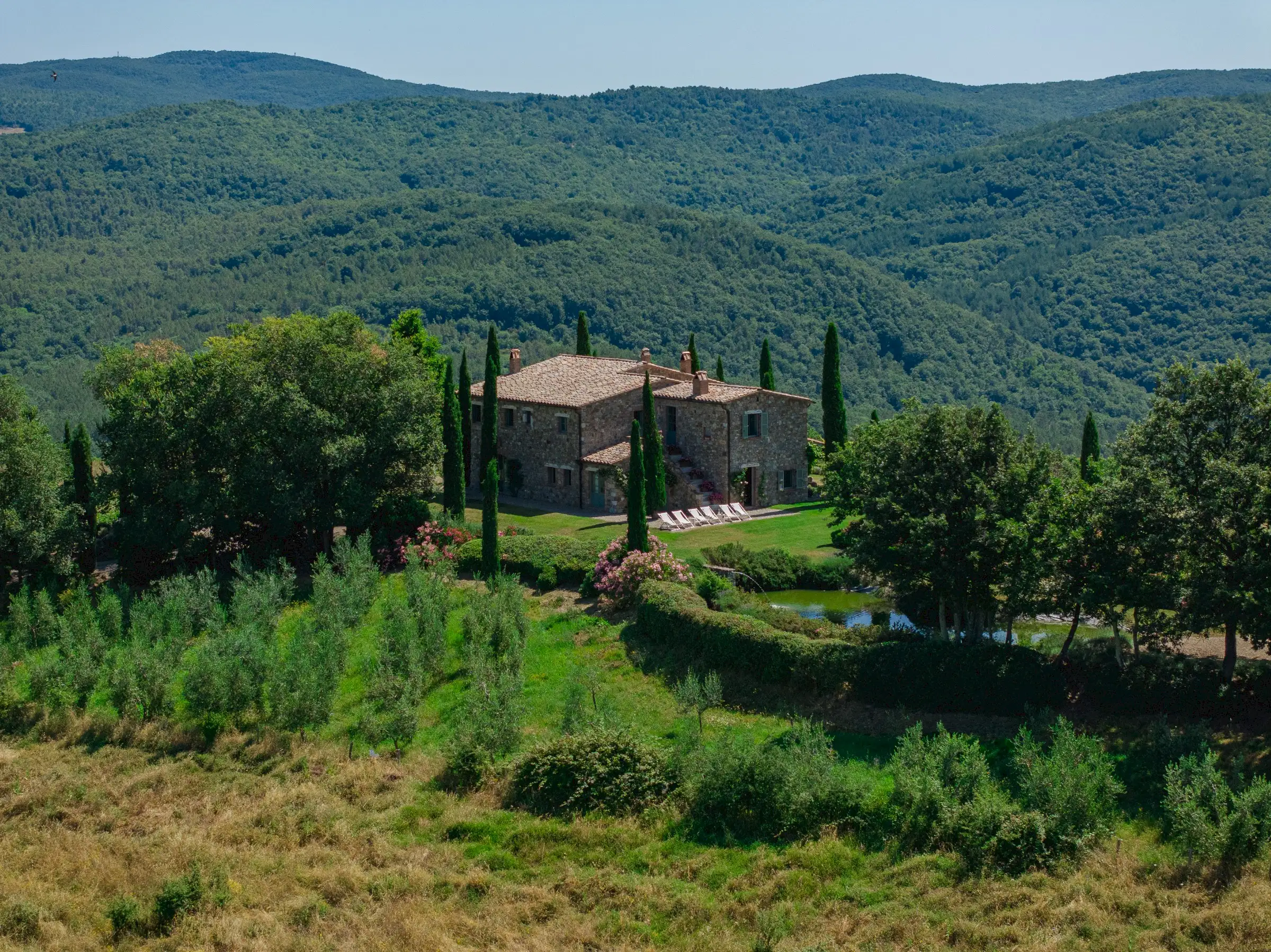 This spacious and airy villa, measuring 370 square meters, has five bedrooms, four bathrooms, splendid grounds including a pond, an infinity pool, and a portico for outdoor dining. It can serve as a home base for a family or group of friends who want to explore all the beauty and history that central Italy has to offer and to enjoy outdoor activities like hiking, horseback riding, sailing, cycling, windsurfing and much more.