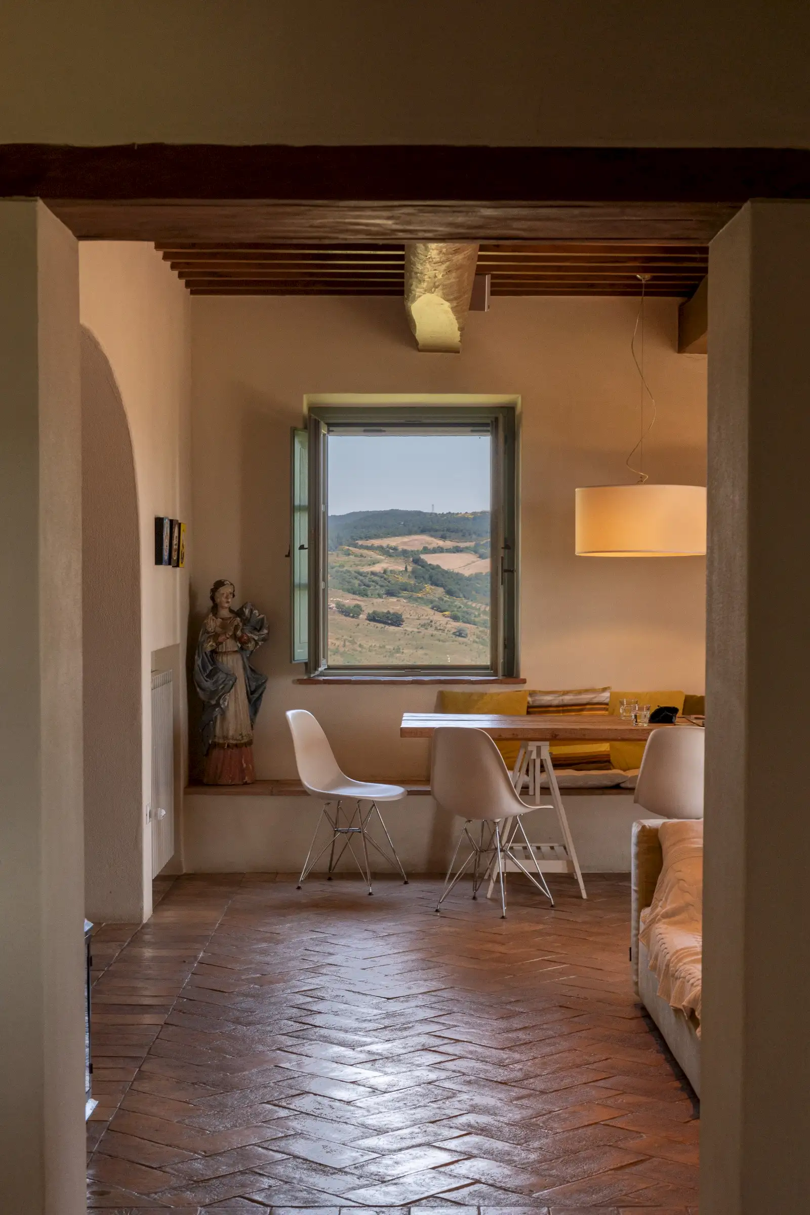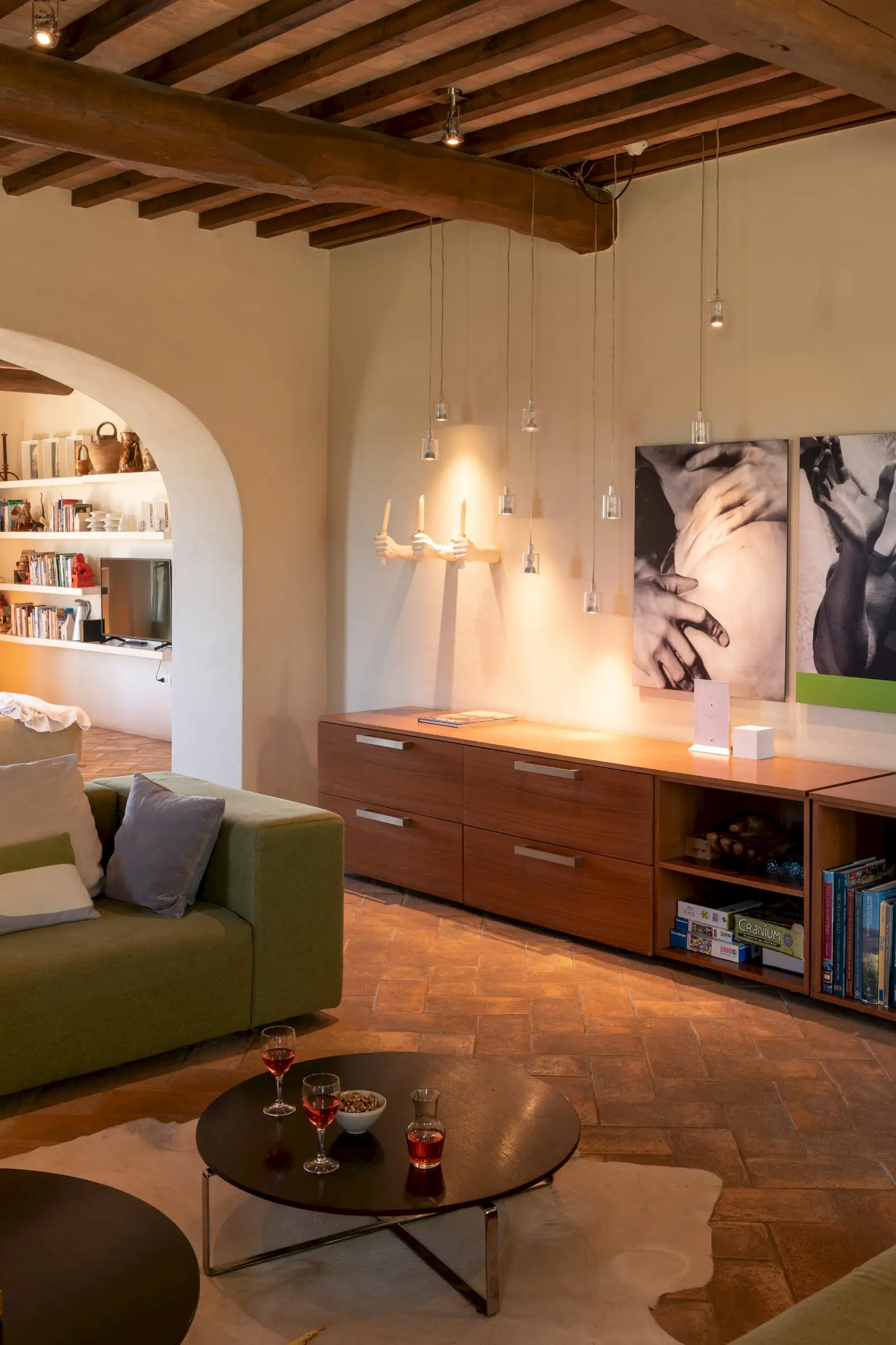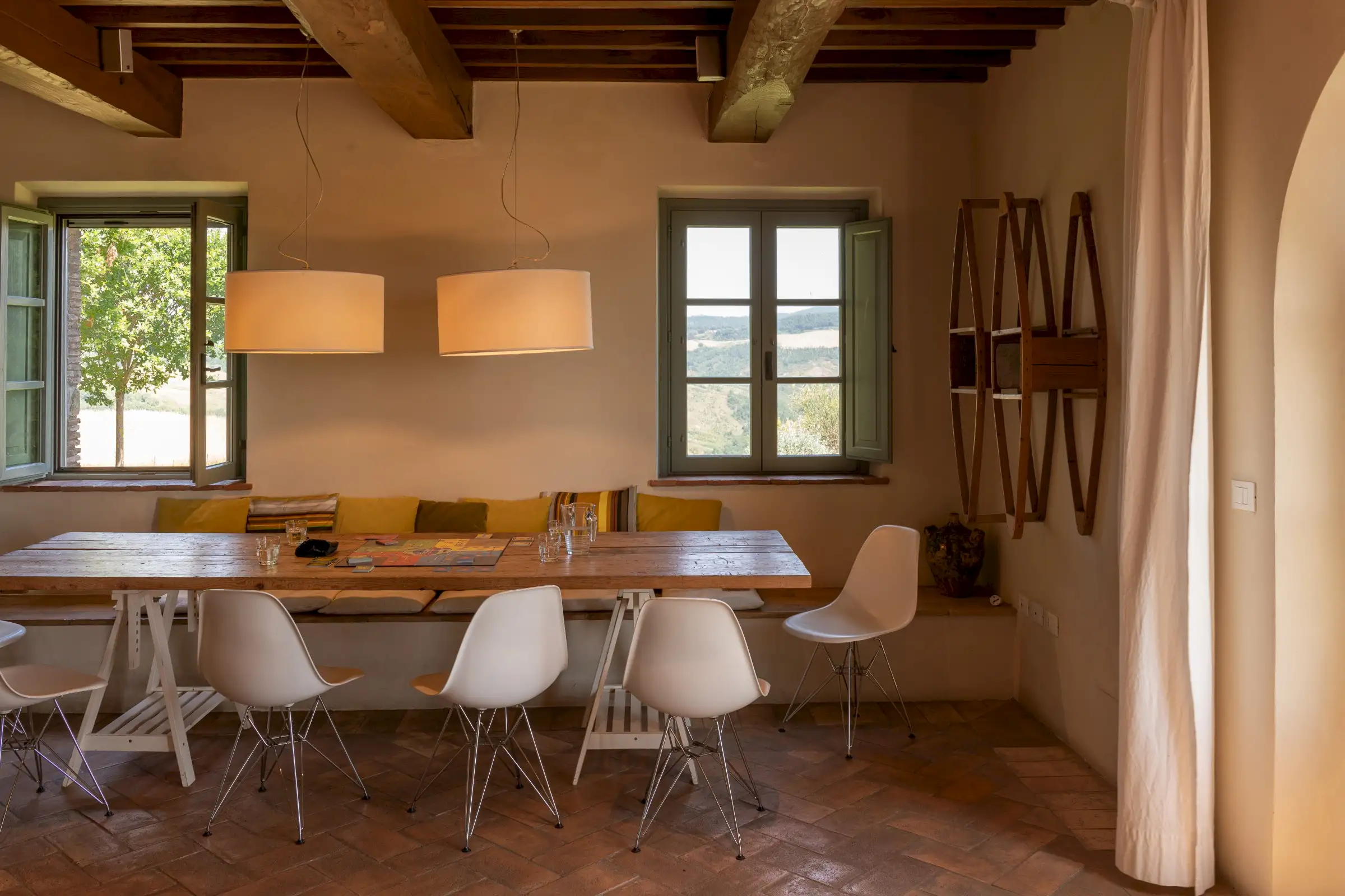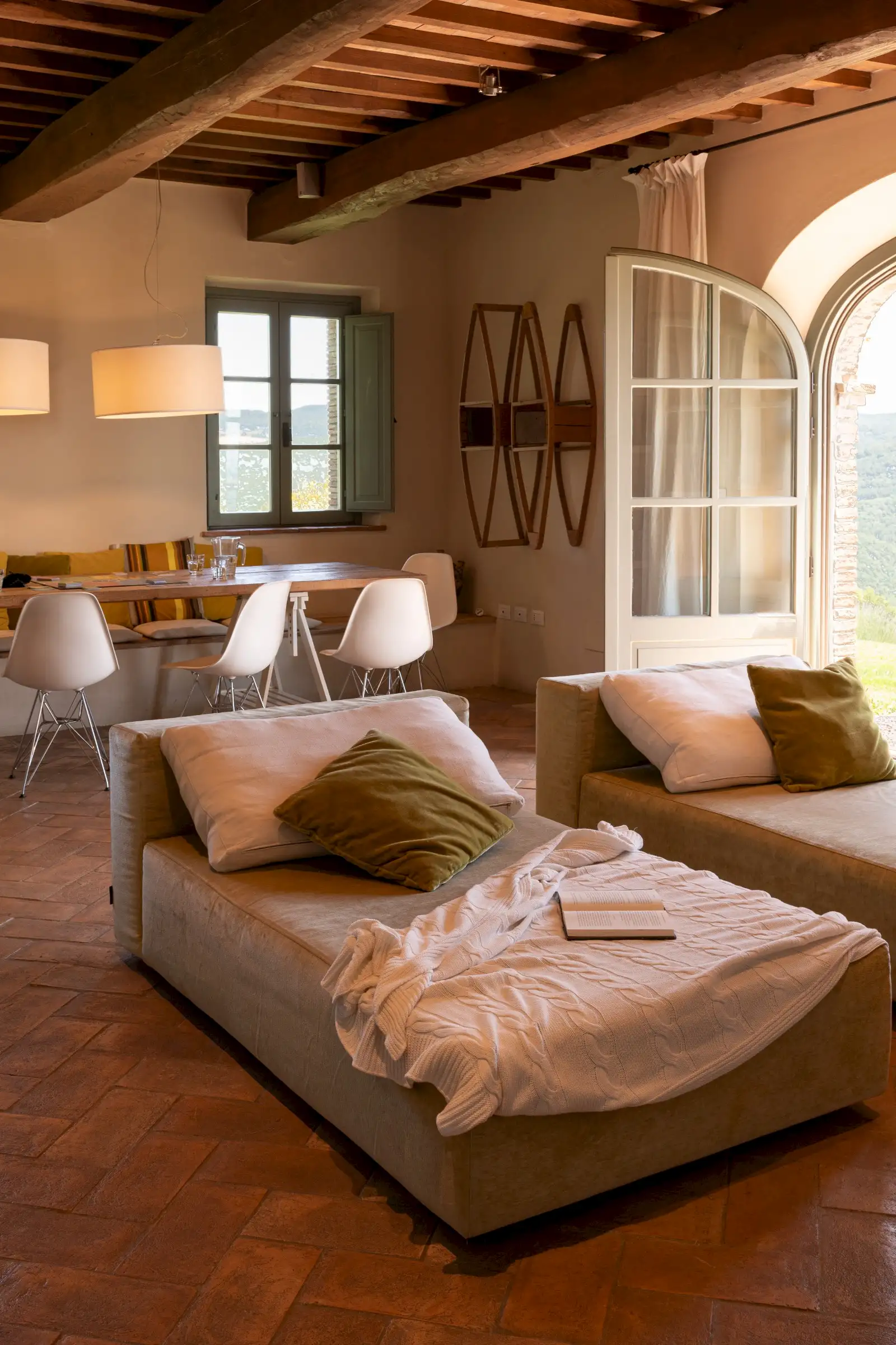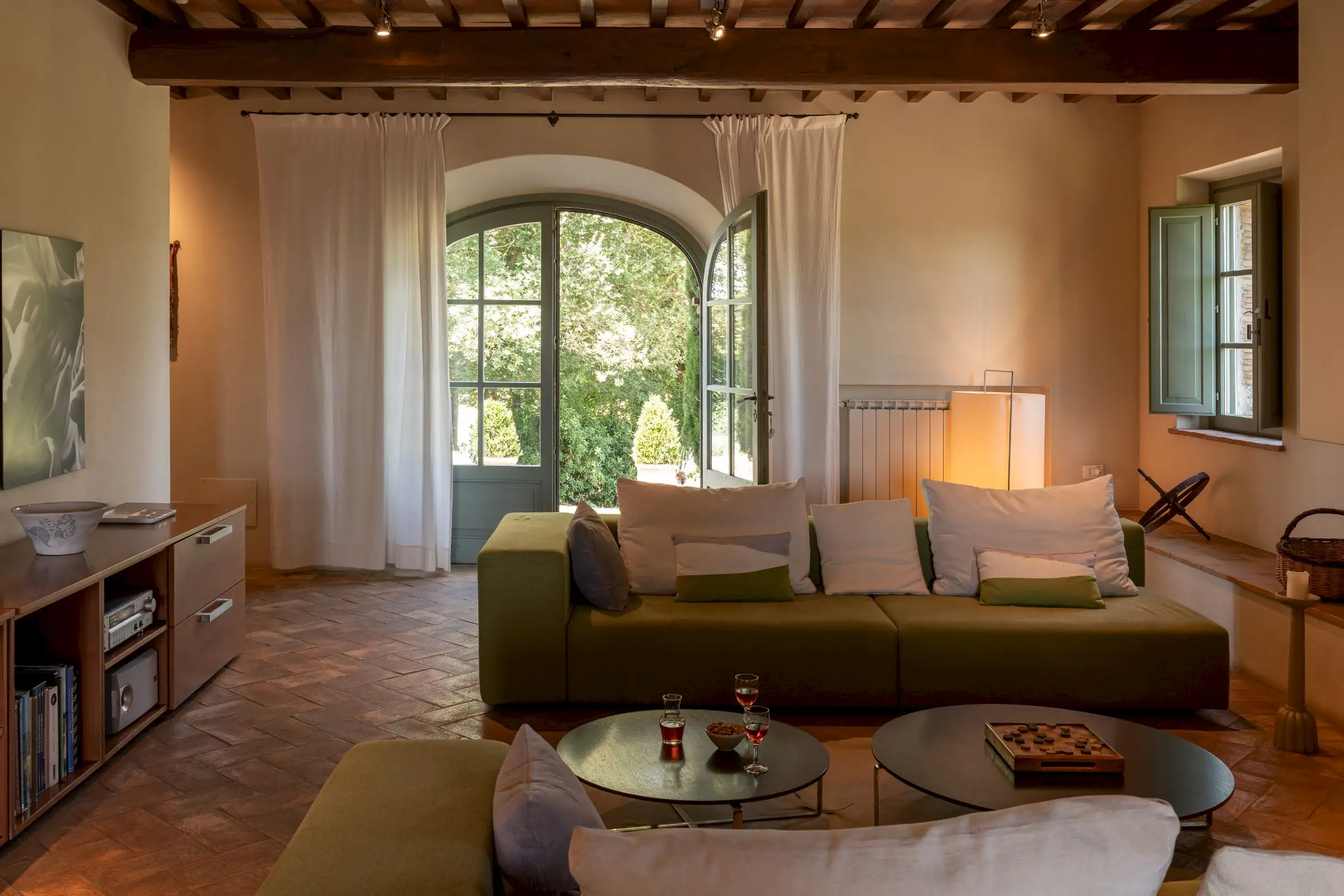 The main entrance to the house features arched French doors which open into a large and comfortable living room with views of the medieval town of Trevinano. It is furnished with two large sofas set in front of a large, modern wood burning fireplace and across from a credenza with satellite TV and DVD player, as well as a stereo with an MP-3 player connected to a built-in sound system. The dining room shares its views of Trevinano with the living room and has arched French doors opening onto a patio which overlooks the infinity pool and the verdant woods of Monte Rufeno across the valley. The dining room seats twelve around a rustic table and includes a sitting area with library.