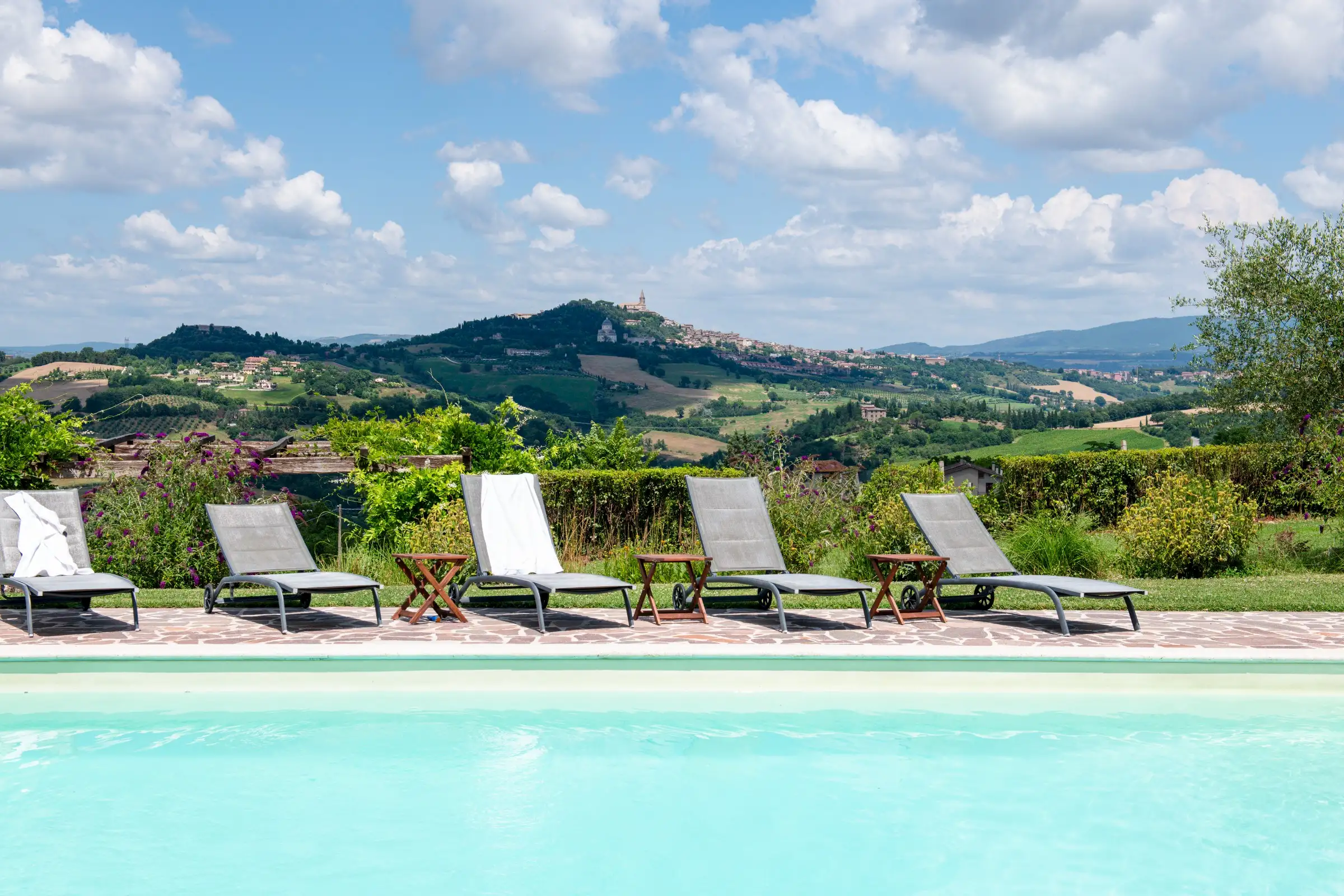 Villa Caledonia is in the hills just to the south of Todi, in the Tiber Valley National Park. The house has an uninterrupted view of this ancient hilltop town that is only 10 minutes’ drive away. The property is close to several other towns and cities in both Umbria and Tuscany that are of great historical, artistic and cultural interest, including: Orvieto (32km); Perugia (40km); Spoleto (40km); Assisi (55km); Spello (60km); Gubbio (70km); Florence (90km); Siena (145km); and Rome (130km).