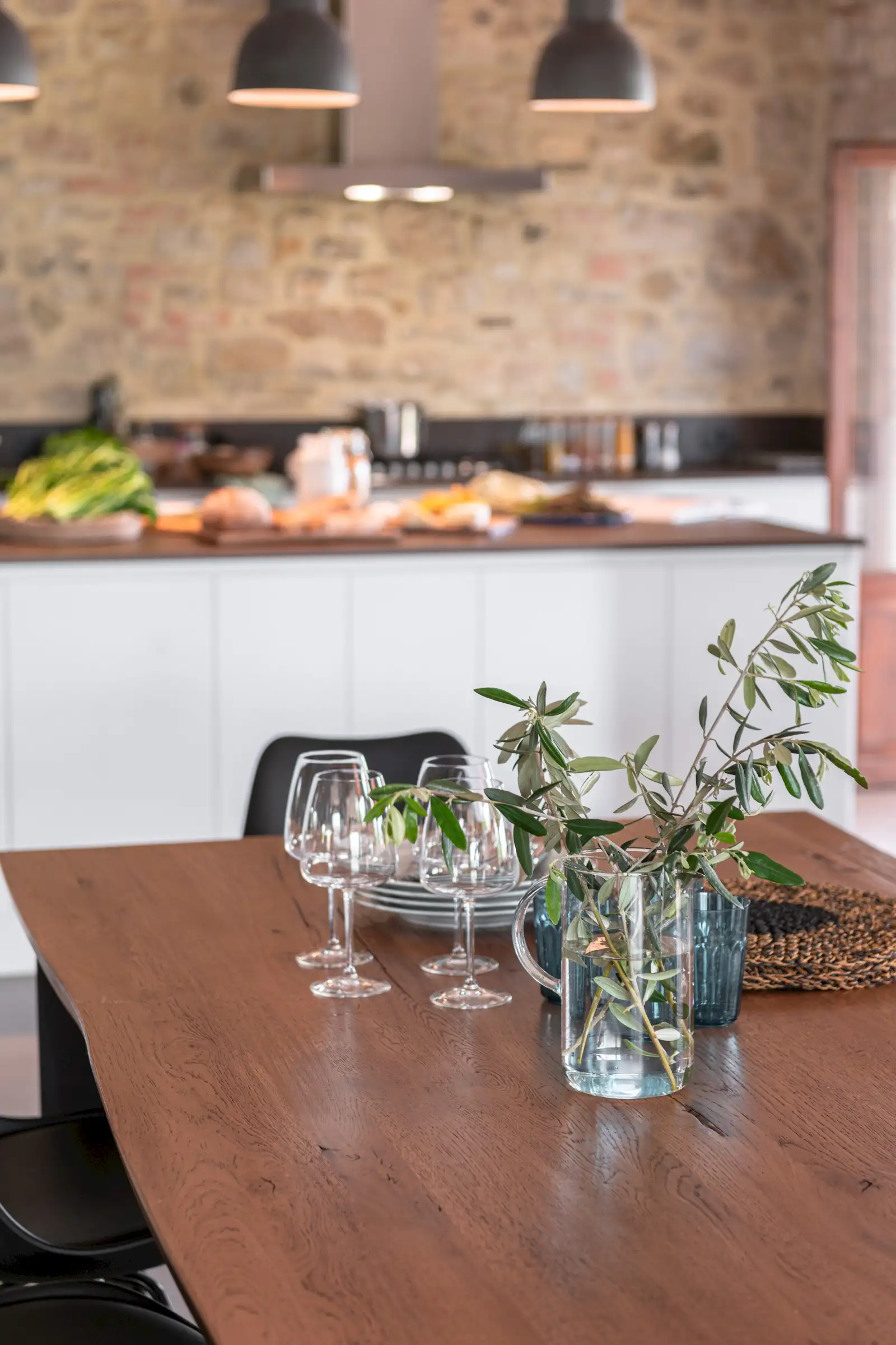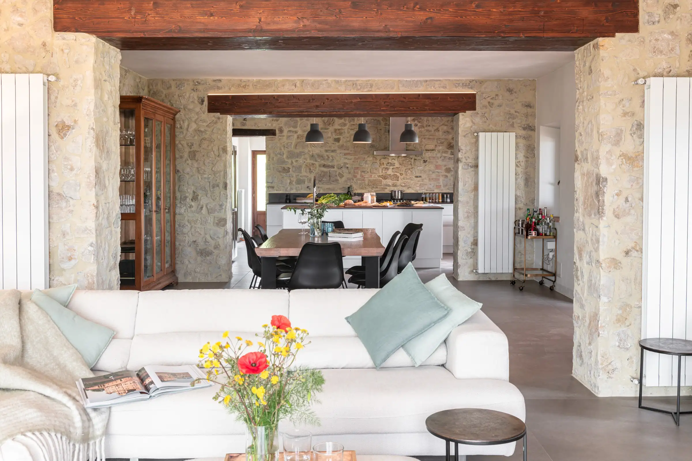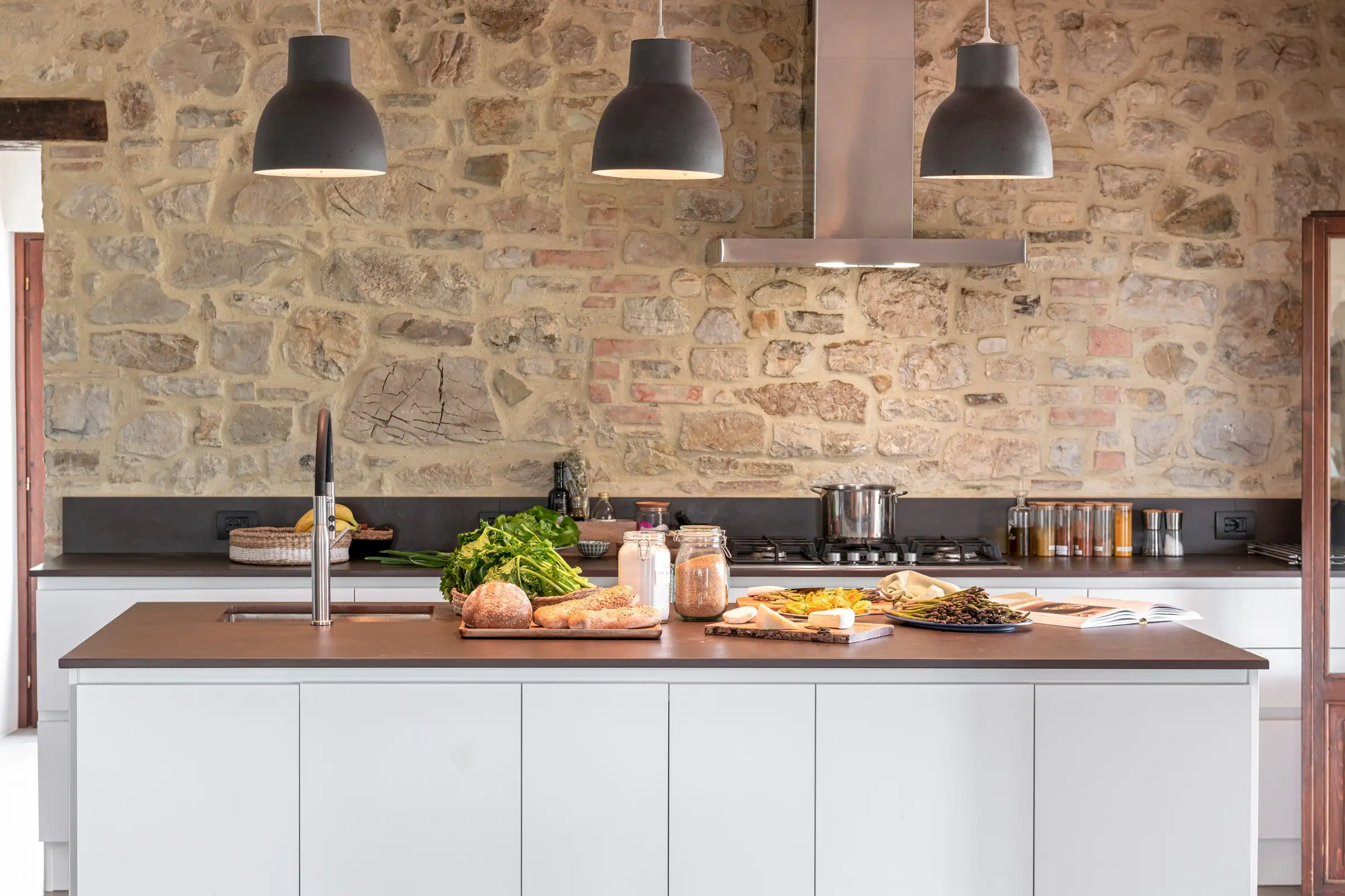 The ground floor of the villa is open-plan in the sense that there are wide open doorways between the various rooms. This provides a fabulous feeling of space and flow while retaining the original architecture and layout. The expertly equipped kitchen has a large central island in white gloss that contrasts with the exposed traditional stone wall. There are double doors out to the terrace.