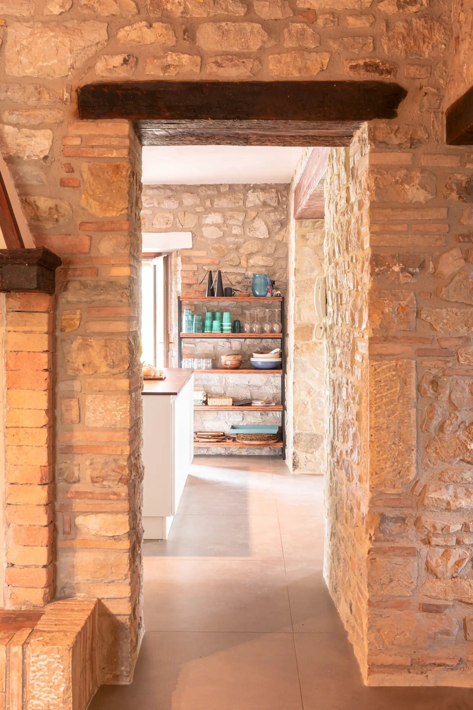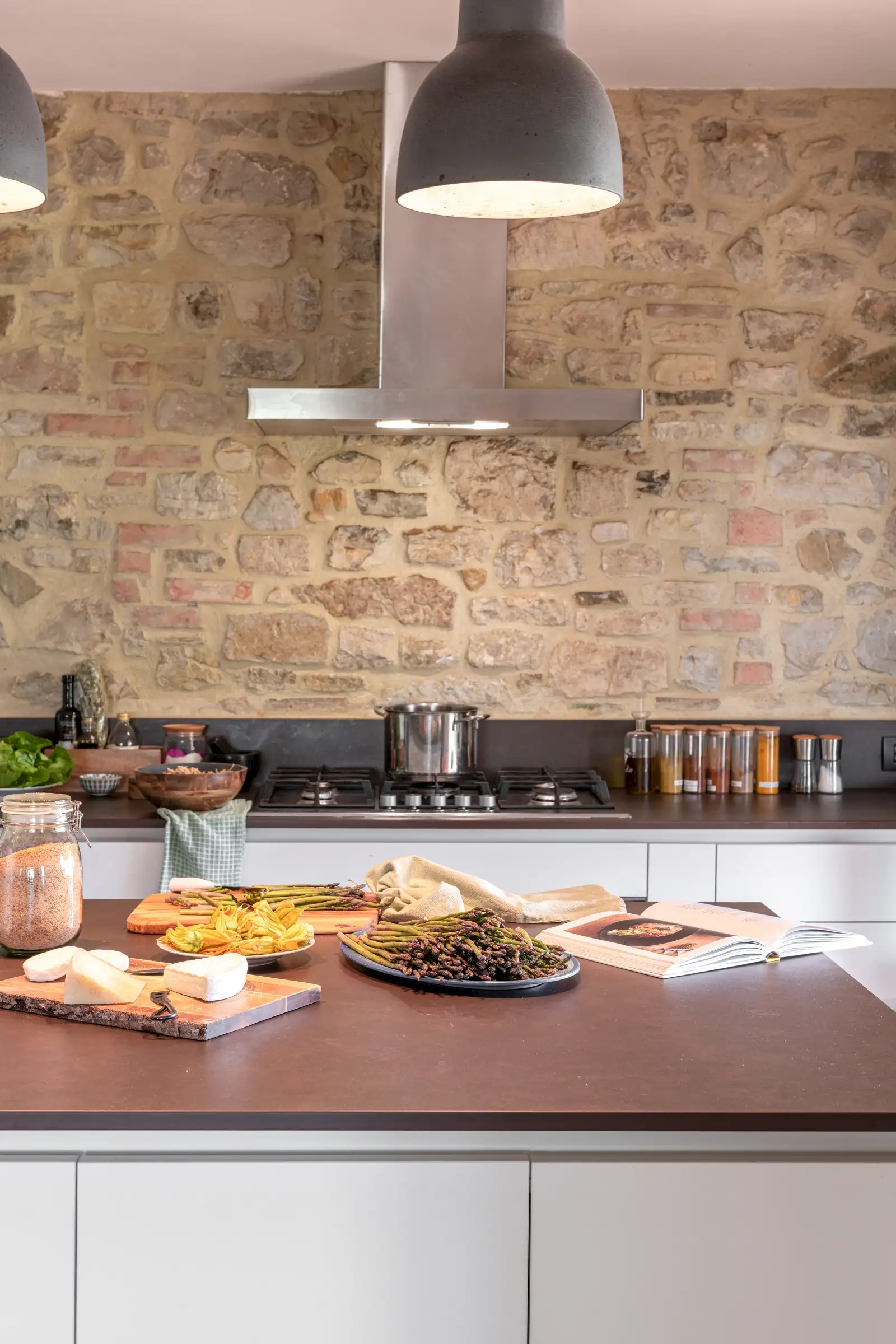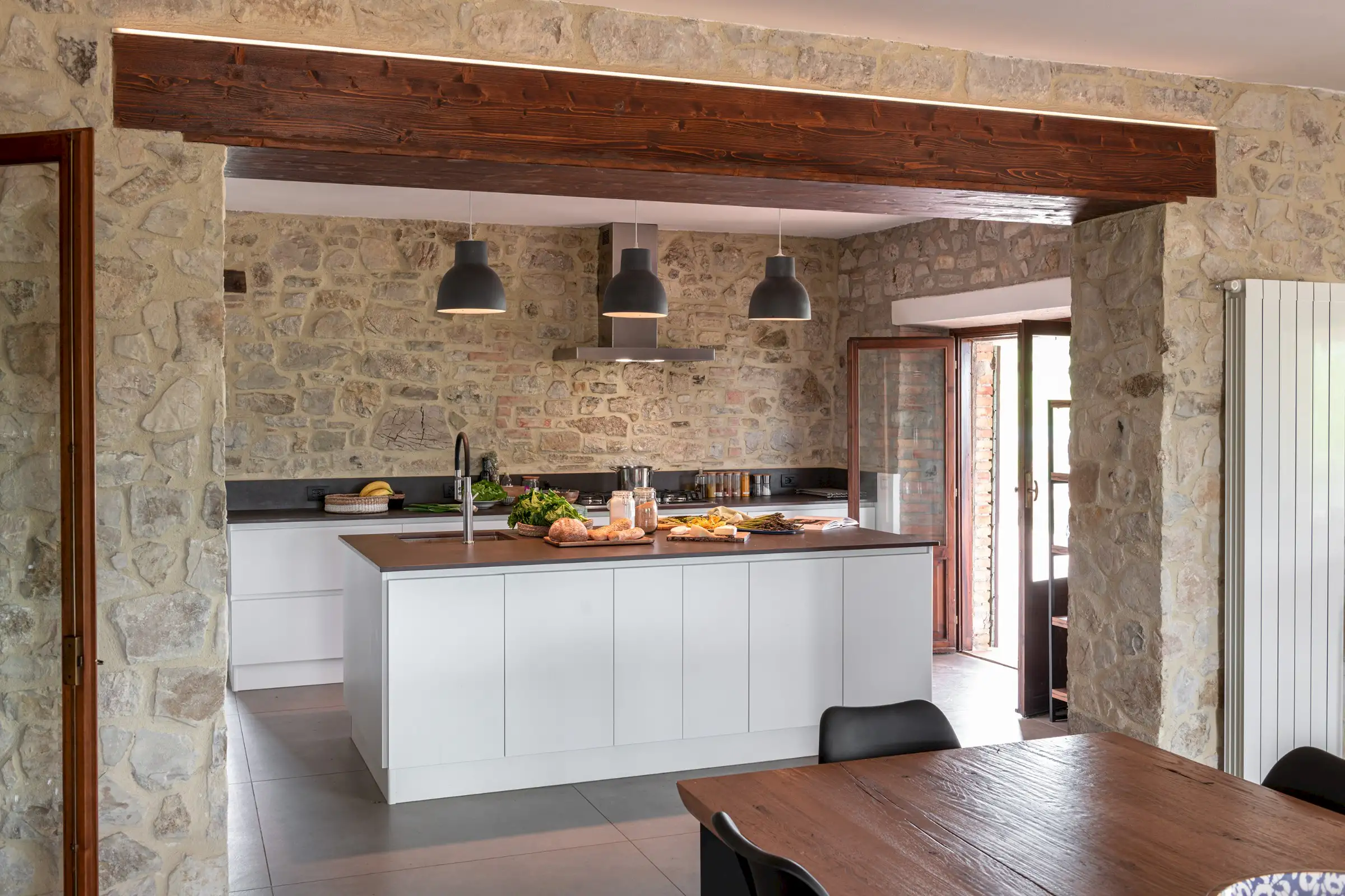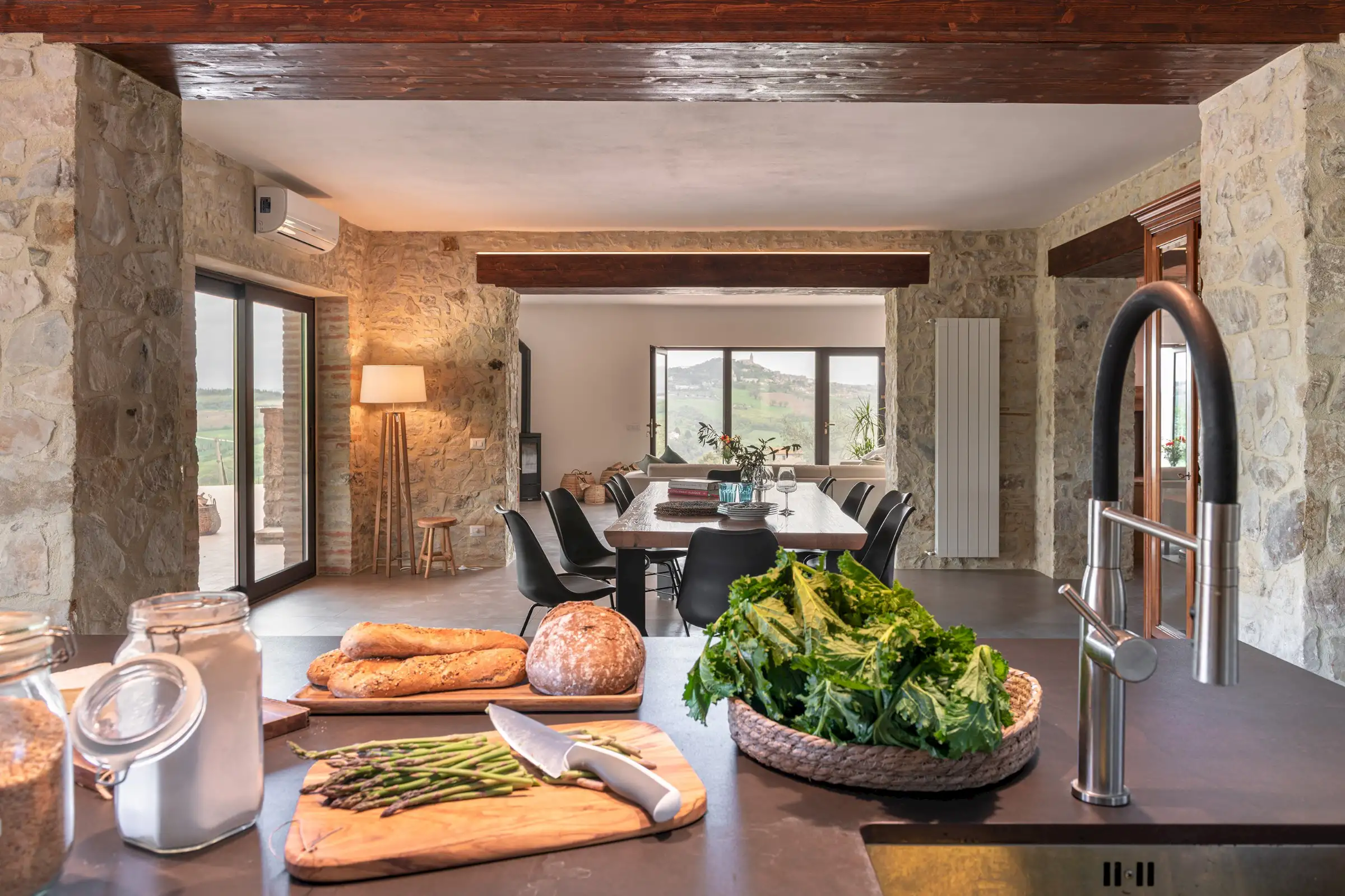 The ground floor of the villa is open-plan in the sense that there are wide open doorways between the various rooms. This provides a fabulous feeling of space and flow while retaining the original architecture and layout. The expertly equipped kitchen has a large central island in white gloss that contrasts with the exposed traditional stone wall. There are double doors out to the terrace.