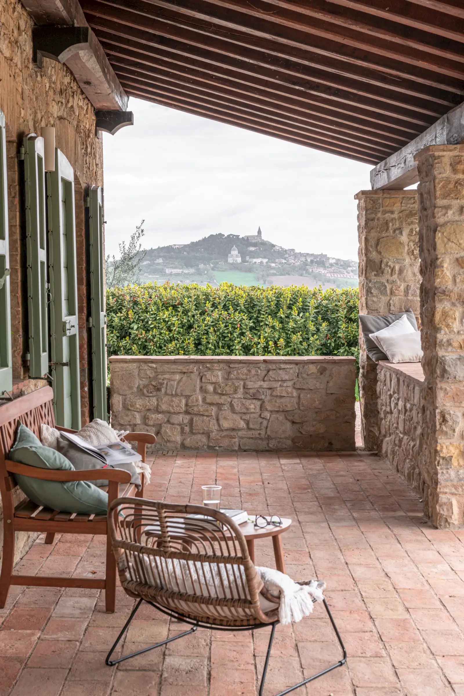 Outside, there is a sun lounger per guest around the salt-water pool and there are two big seating areas and a long dining table under the veranda. Guests are welcome to pick fruit, nuts, vegetables and herbs in season and long, lazy lunches and dinners are very much encouraged, especially with the exquisite view of hill-top Todi, it’s tower silhouetting the horizon as the sun sets behind it.