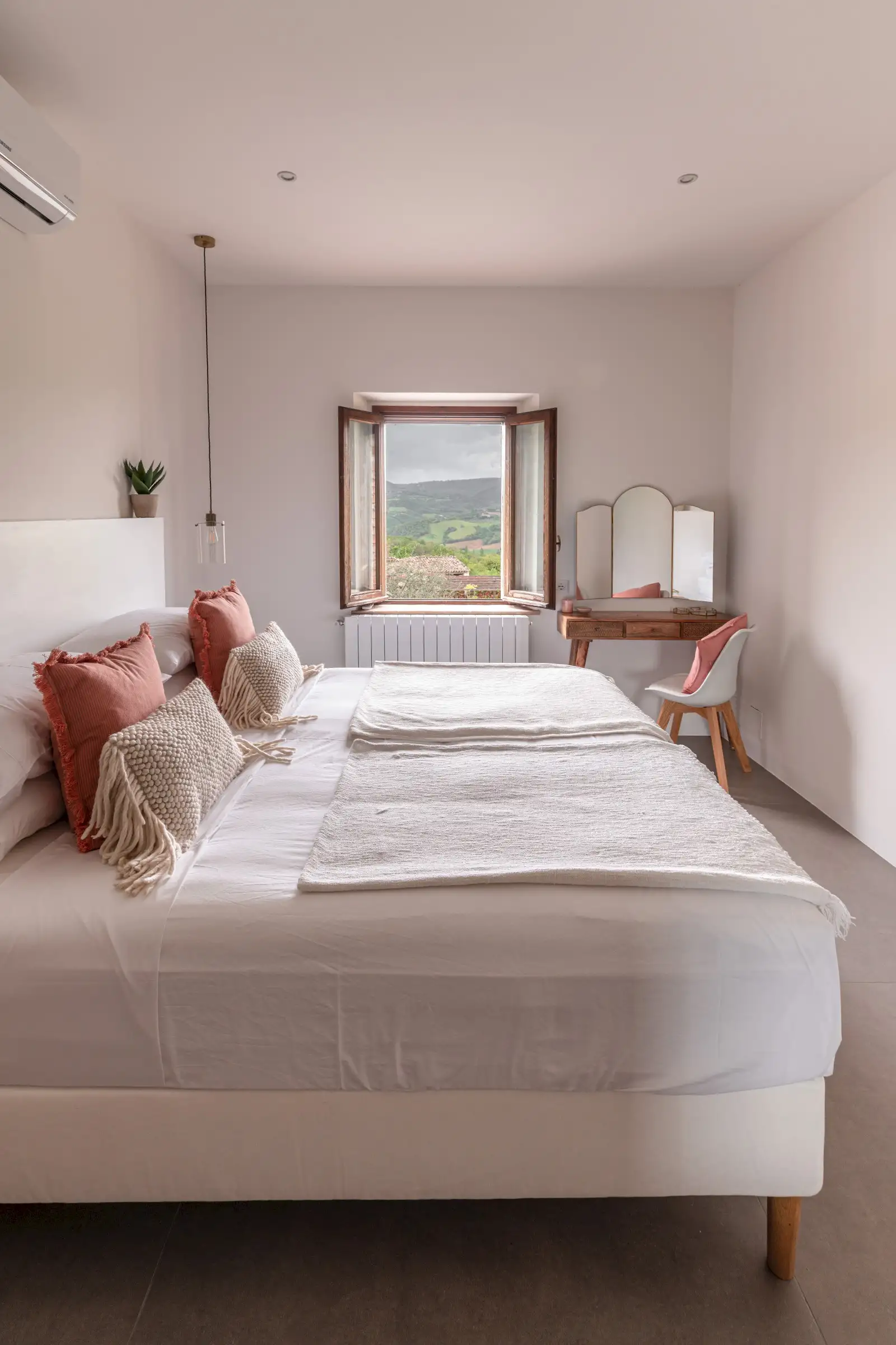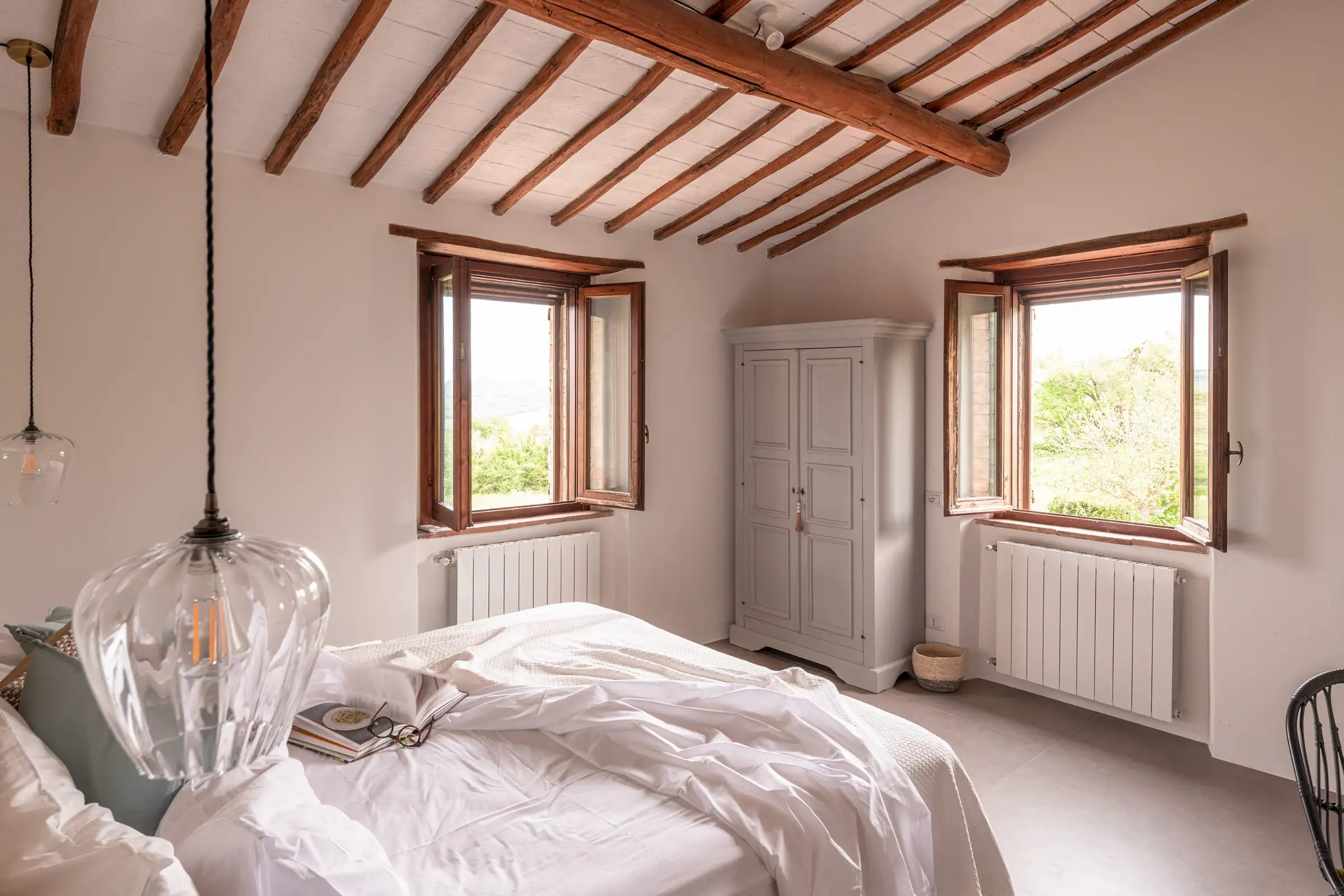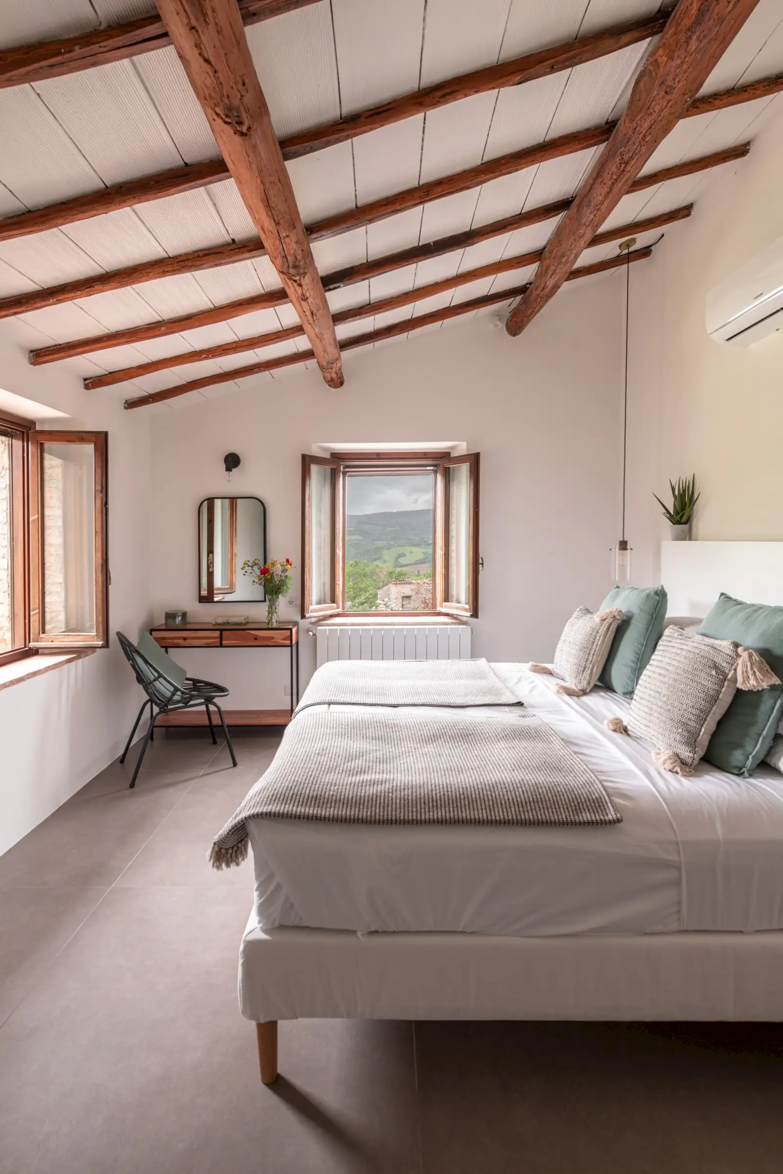The principal bedroom has wooden ceiling beams, a large picture window with a glass door to a balcony, and fabulous views of Todi. As well as being accessed from inside, there is also an external staircase that leads from the balcony to the garden. The en-suite shower room has a walk-in shower, double basins and matt black fixtures and fittings.