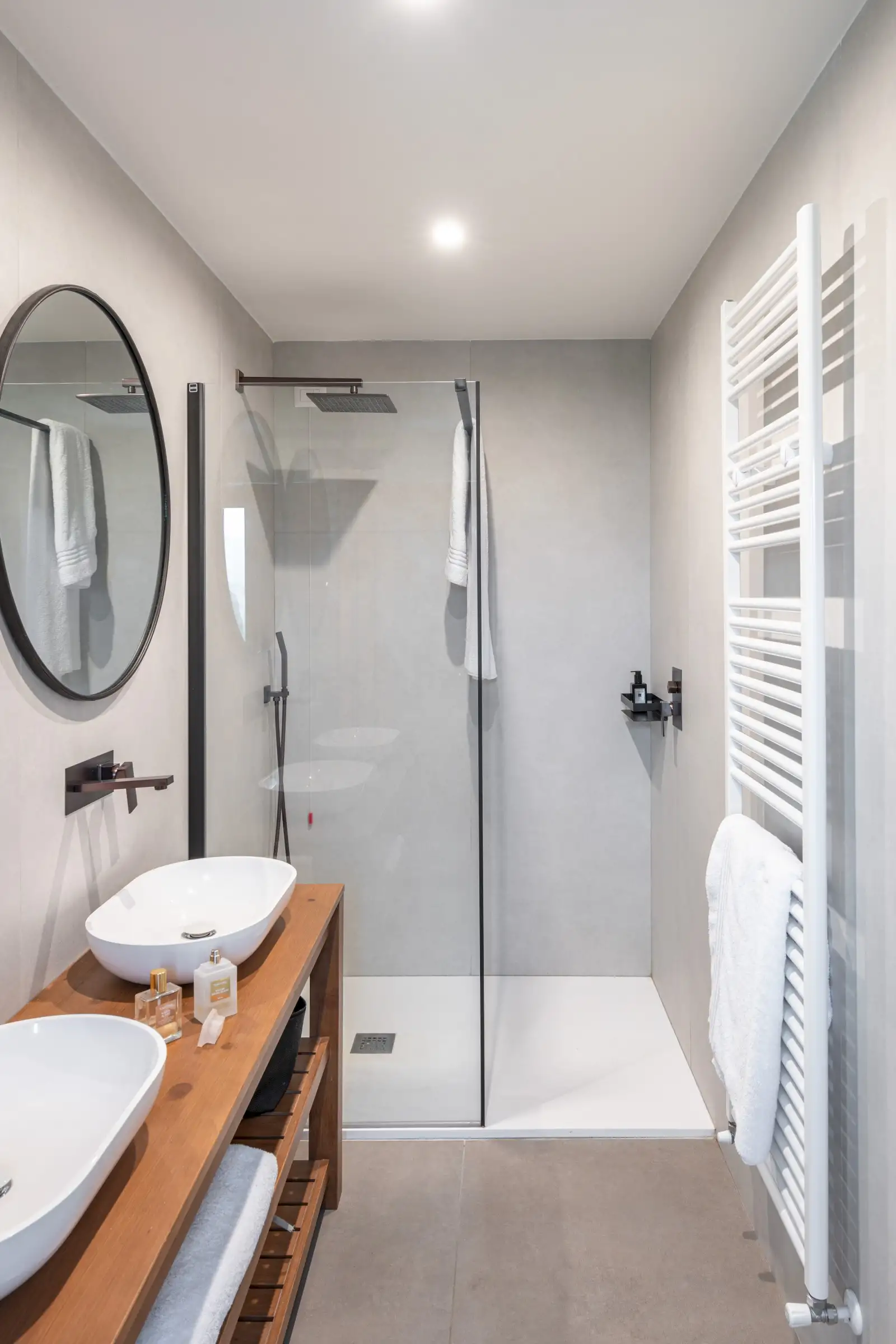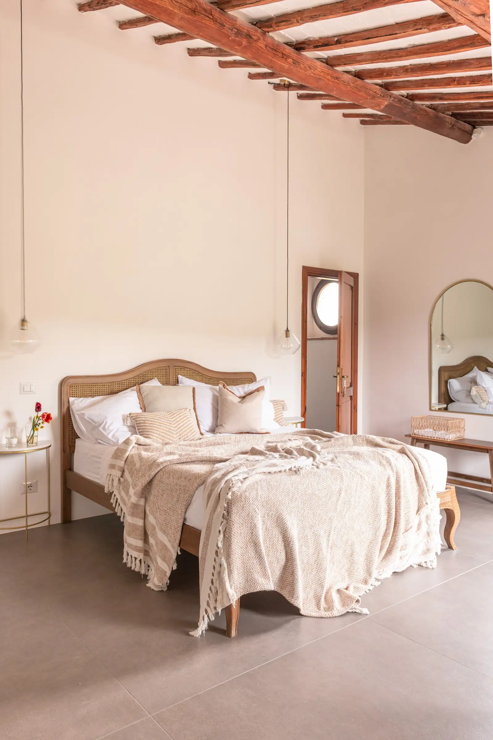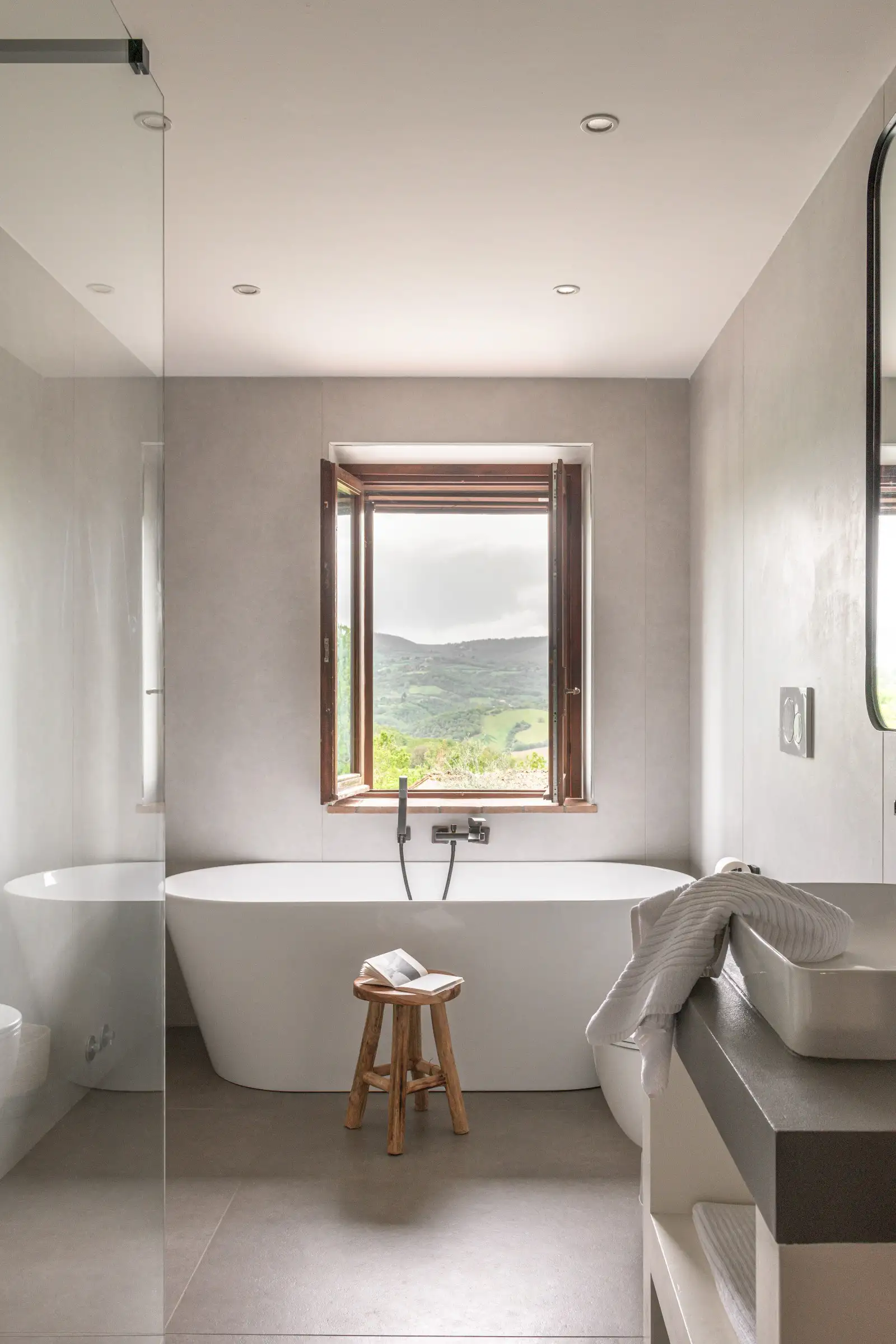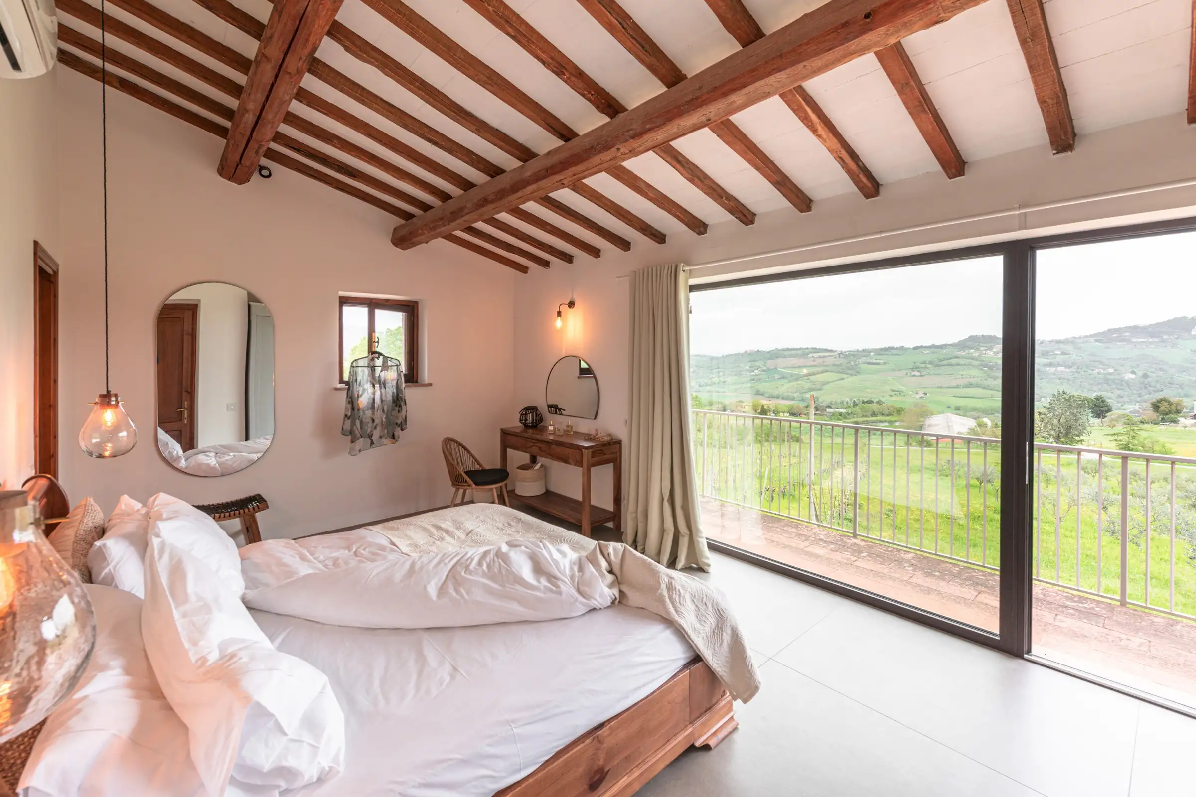 The principal bedroom has wooden ceiling beams, a large picture window with a glass door to a balcony, and fabulous views of Todi. As well as being accessed from inside, there is also an external staircase that leads from the balcony to the garden. The en-suite shower room has a walk-in shower, double basins and matt black fixtures and fittings.
