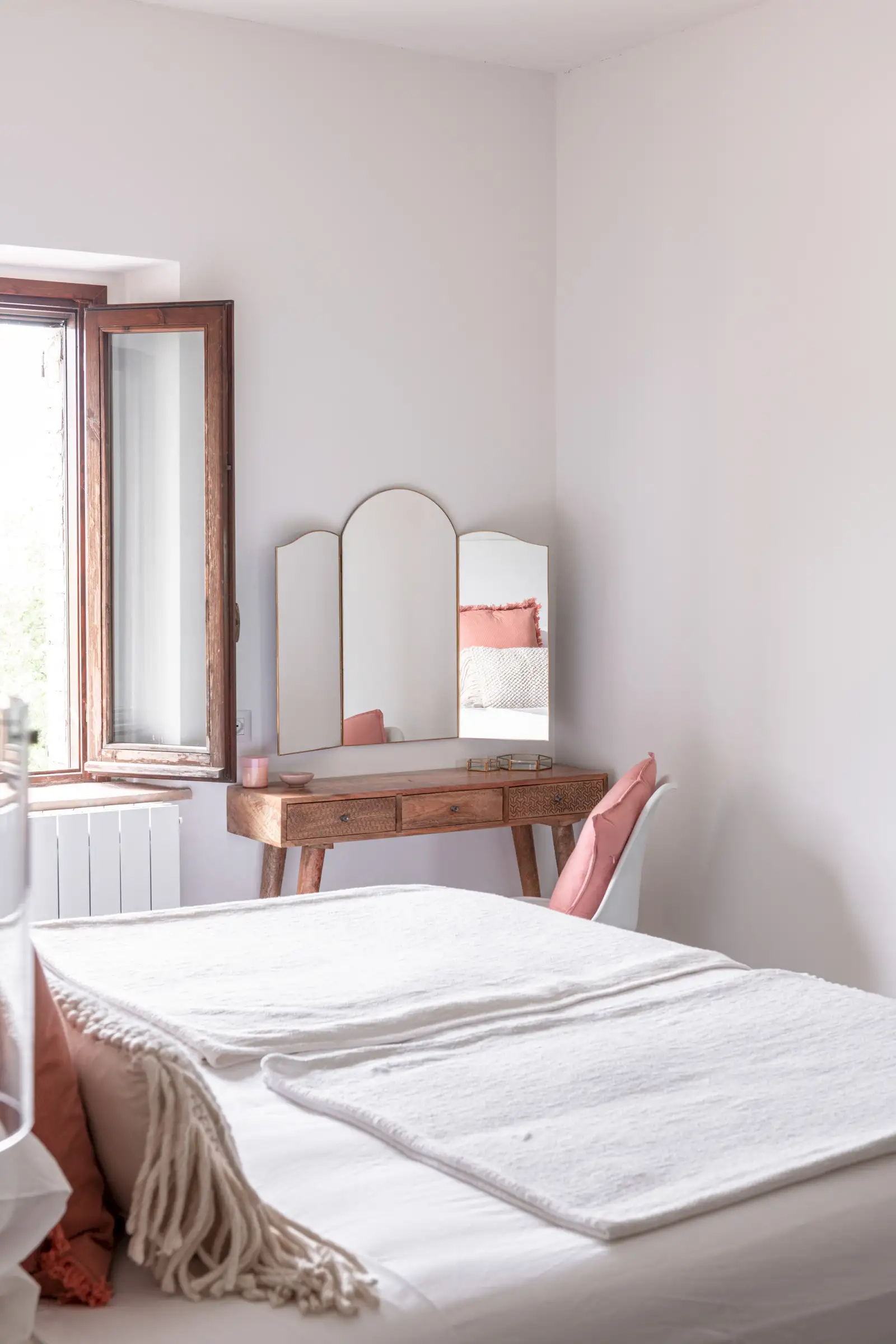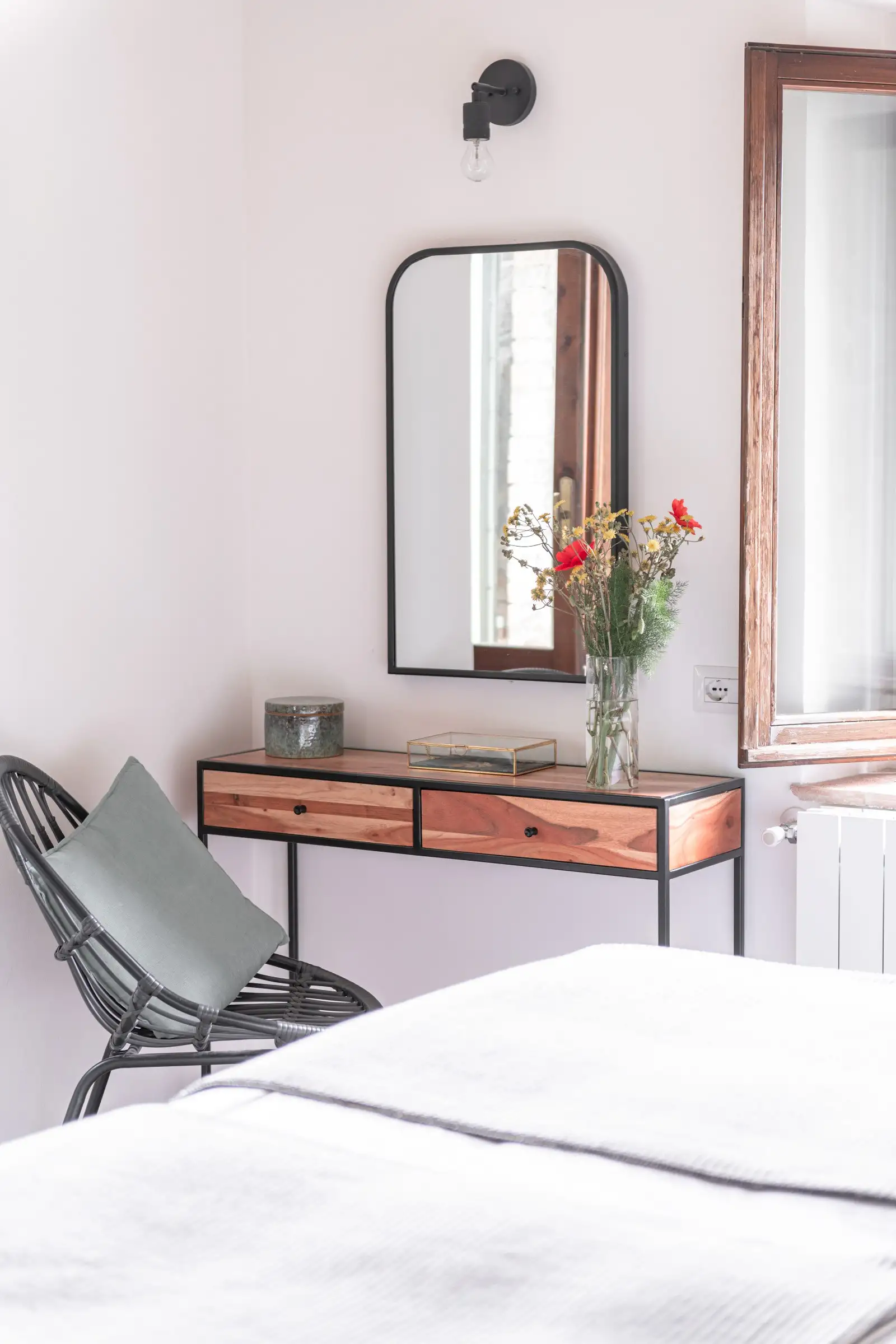 This is the largest bedroom in the house and it has wooden ceiling beams and a traditional corner fireplace (that can’t be lit). A window looks out from the front of the house while French windows lead to a private terrace with views to Todi and the pool area. A small table and chairs and a pair of sunloungers make this a discreet spot for a morning coffee or an evening aperitivo.