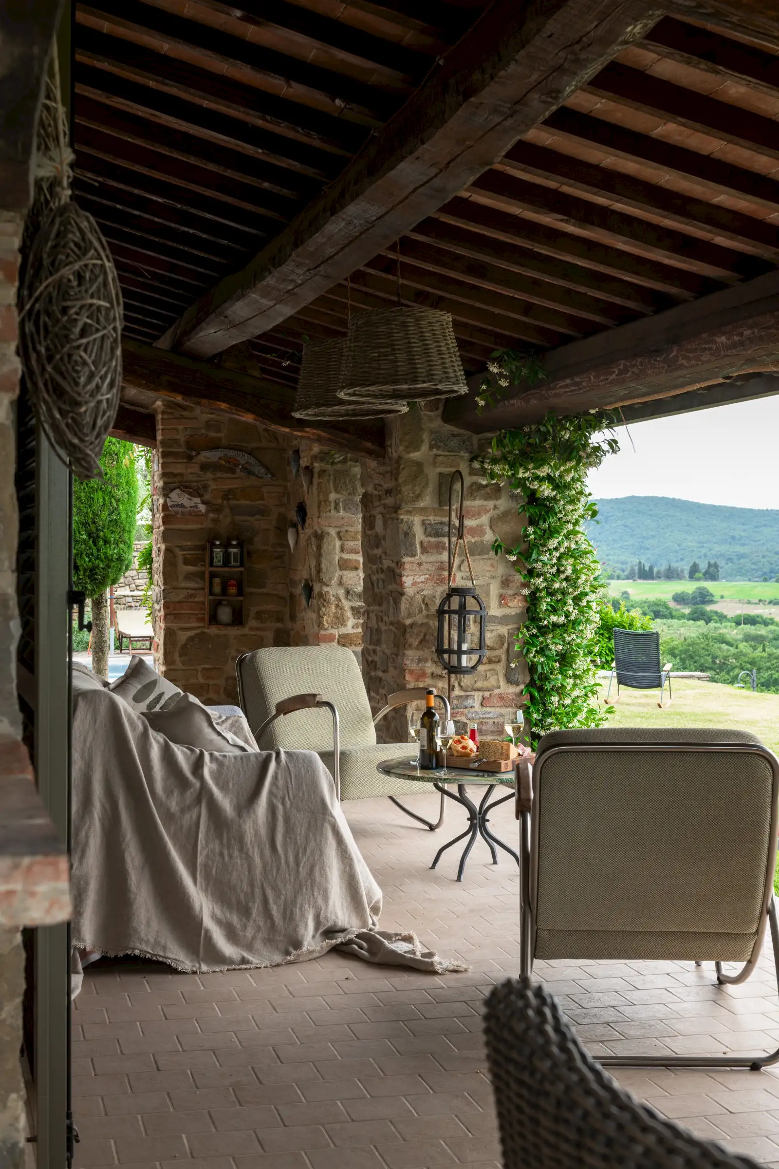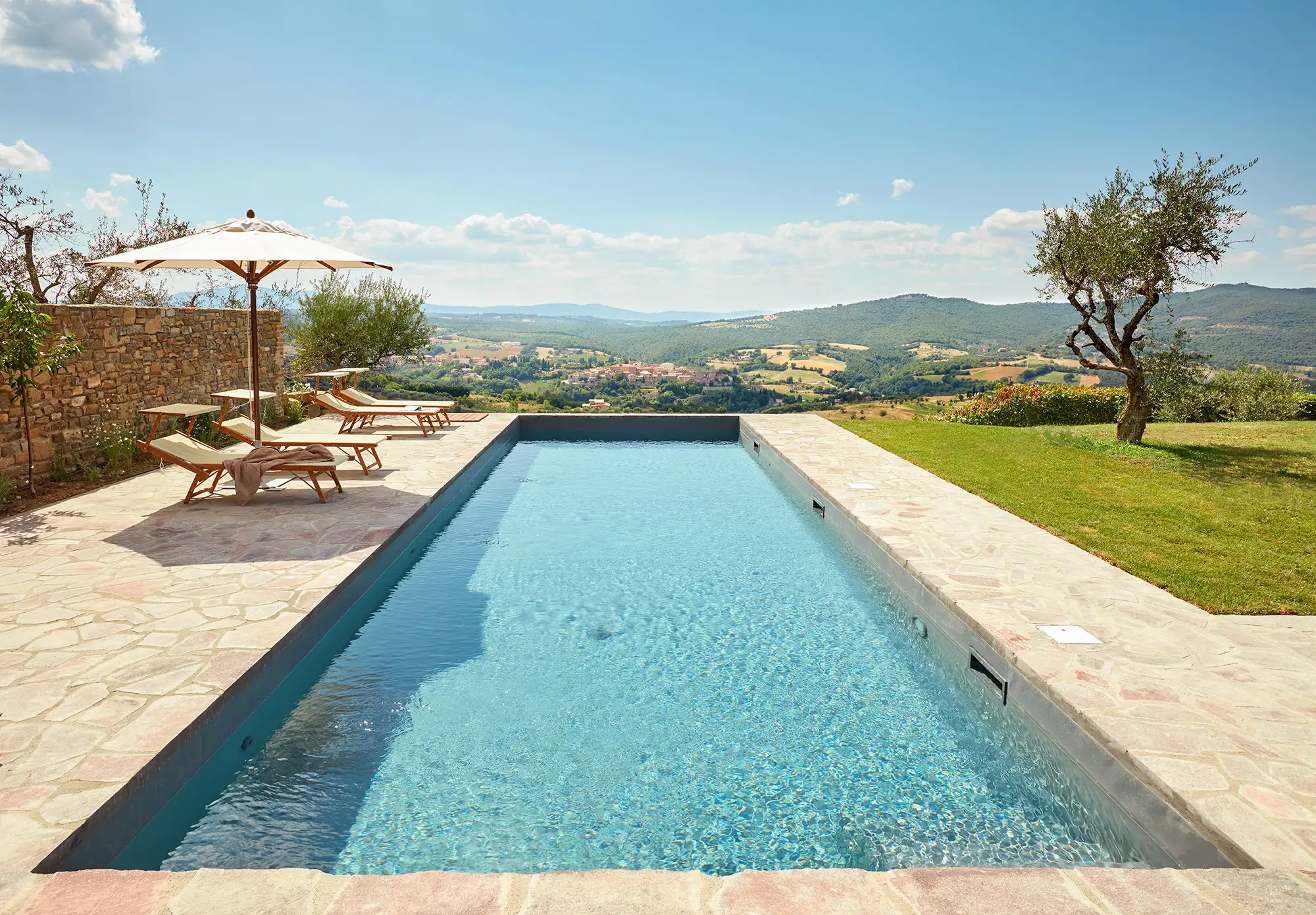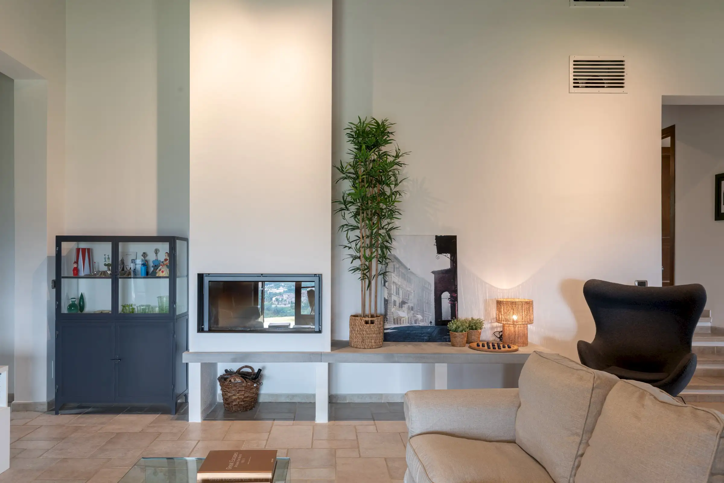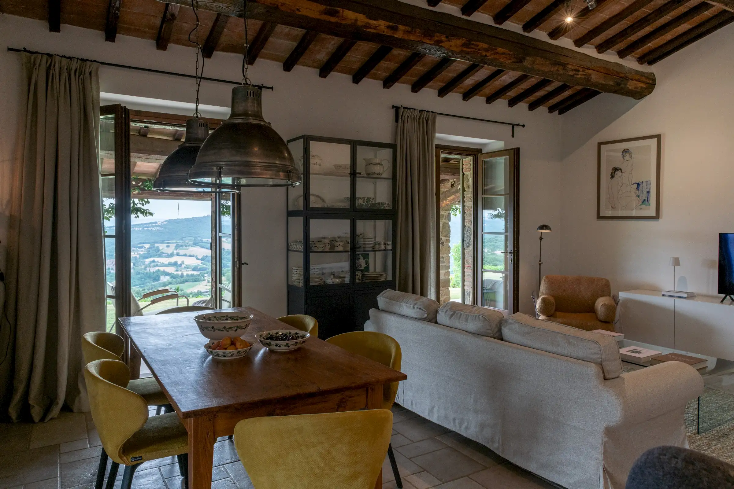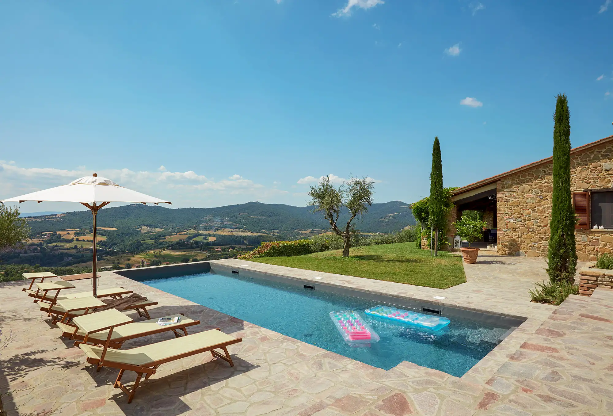 The interior is done in a light modern, colorful and cosy style. The house is dominantly positioned on an important Umbrian hillside near Lake Trasimeno and Perugia, enjoying spectacular vast views to Tuscany (Montepulciano). The outside sofas are the perfect place to stay all day. There is an outside fireplace which is the BBQ area in the summer and the perfect heating for sitting outside during chilly evenings. Il Sogno has a lovely garden with olive and fruit trees and some lawn around. The old Medieval small town of Piegaro is 2 kilometers away where the A1 Motorway exits for Rome and Florence only 20 minutes drive.