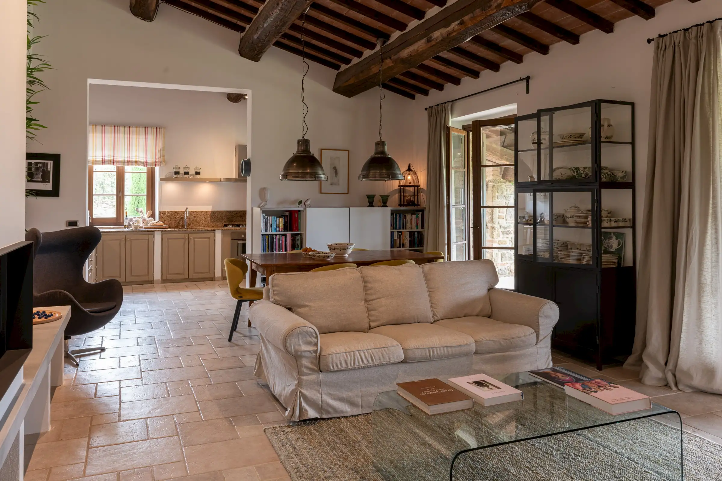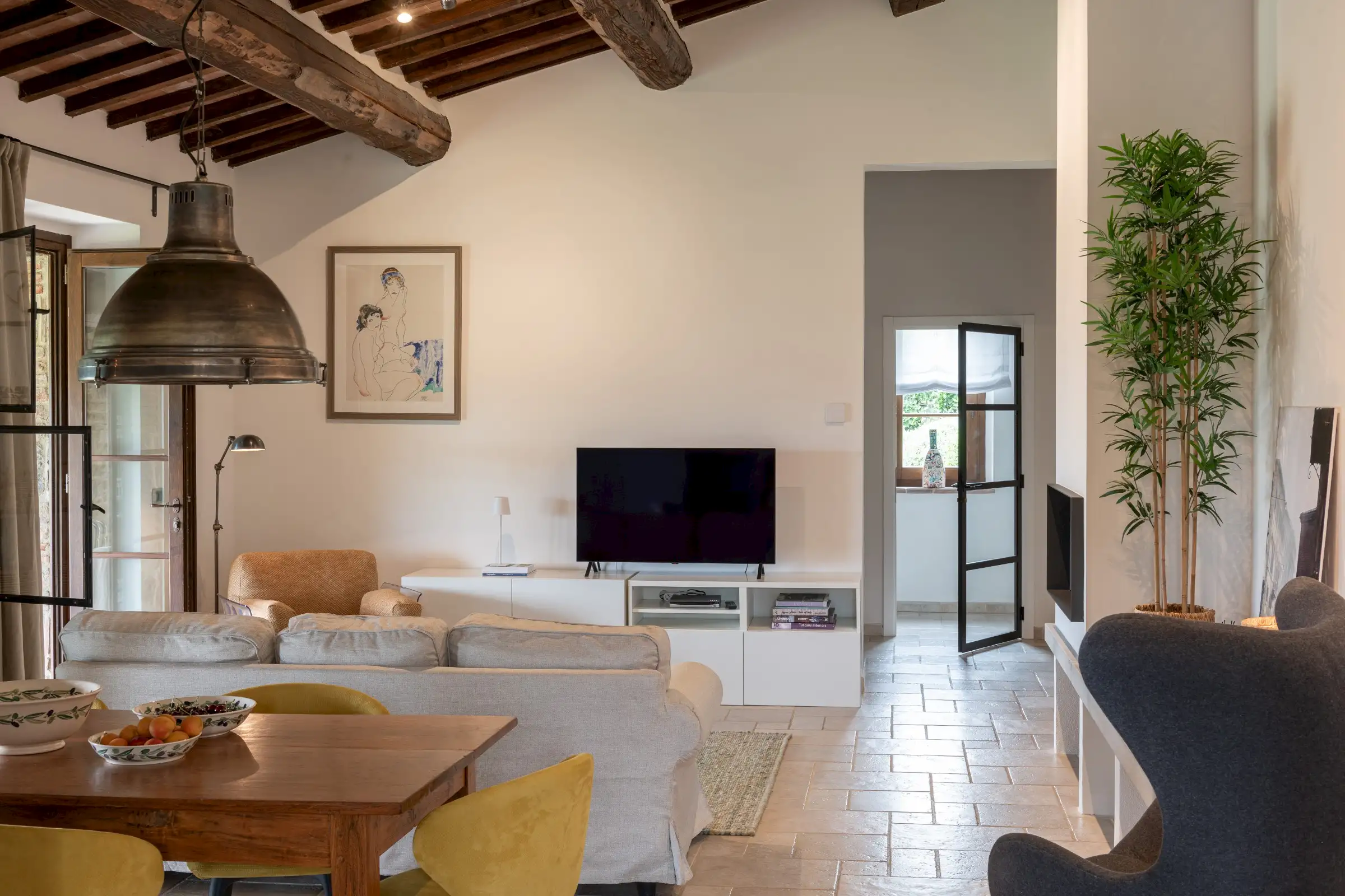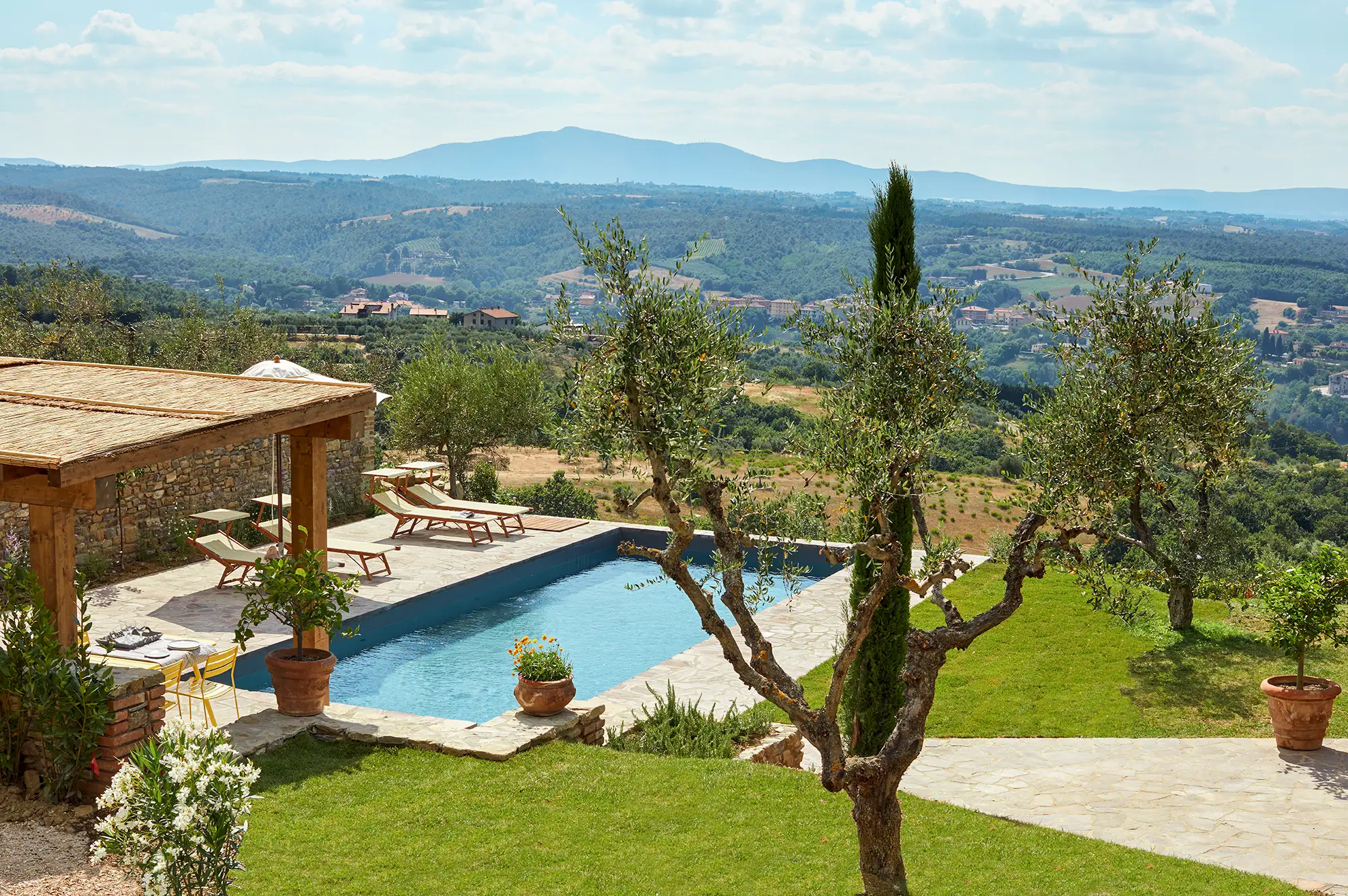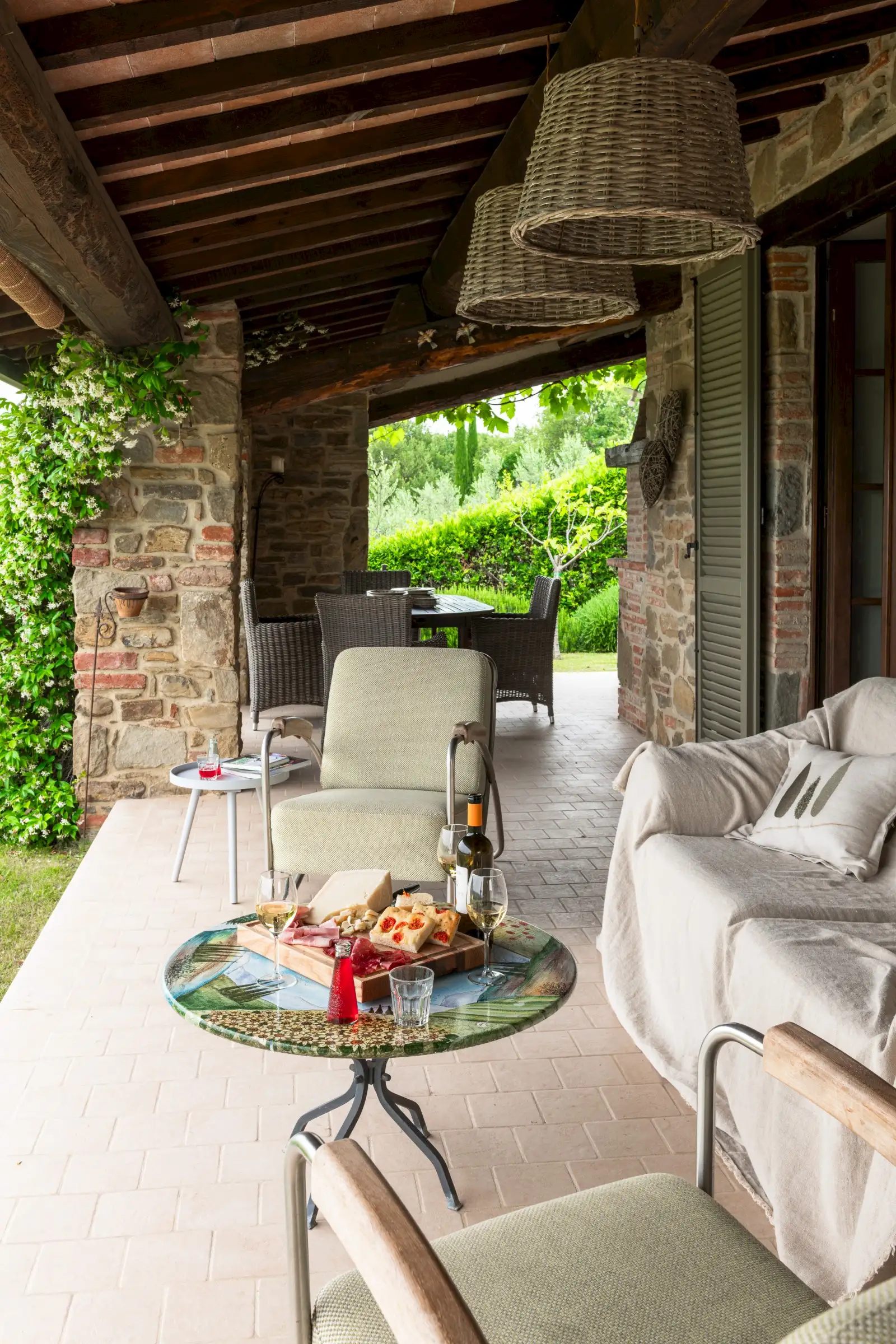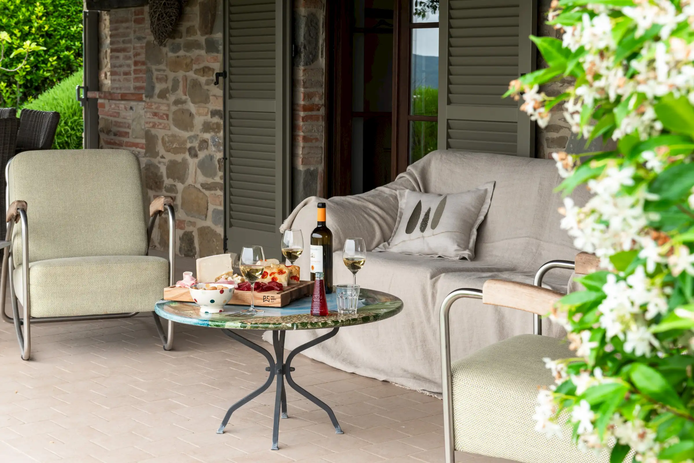 The interior is done in a light modern, colorful and cosy style. The house is dominantly positioned on an important Umbrian hillside near Lake Trasimeno and Perugia, enjoying spectacular vast views to Tuscany (Montepulciano). The outside sofas are the perfect place to stay all day. There is an outside fireplace which is the BBQ area in the summer and the perfect heating for sitting outside during chilly evenings. Il Sogno has a lovely garden with olive and fruit trees and some lawn around. The old Medieval small town of Piegaro is 2 kilometers away where the A1 Motorway exits for Rome and Florence only 20 minutes drive.