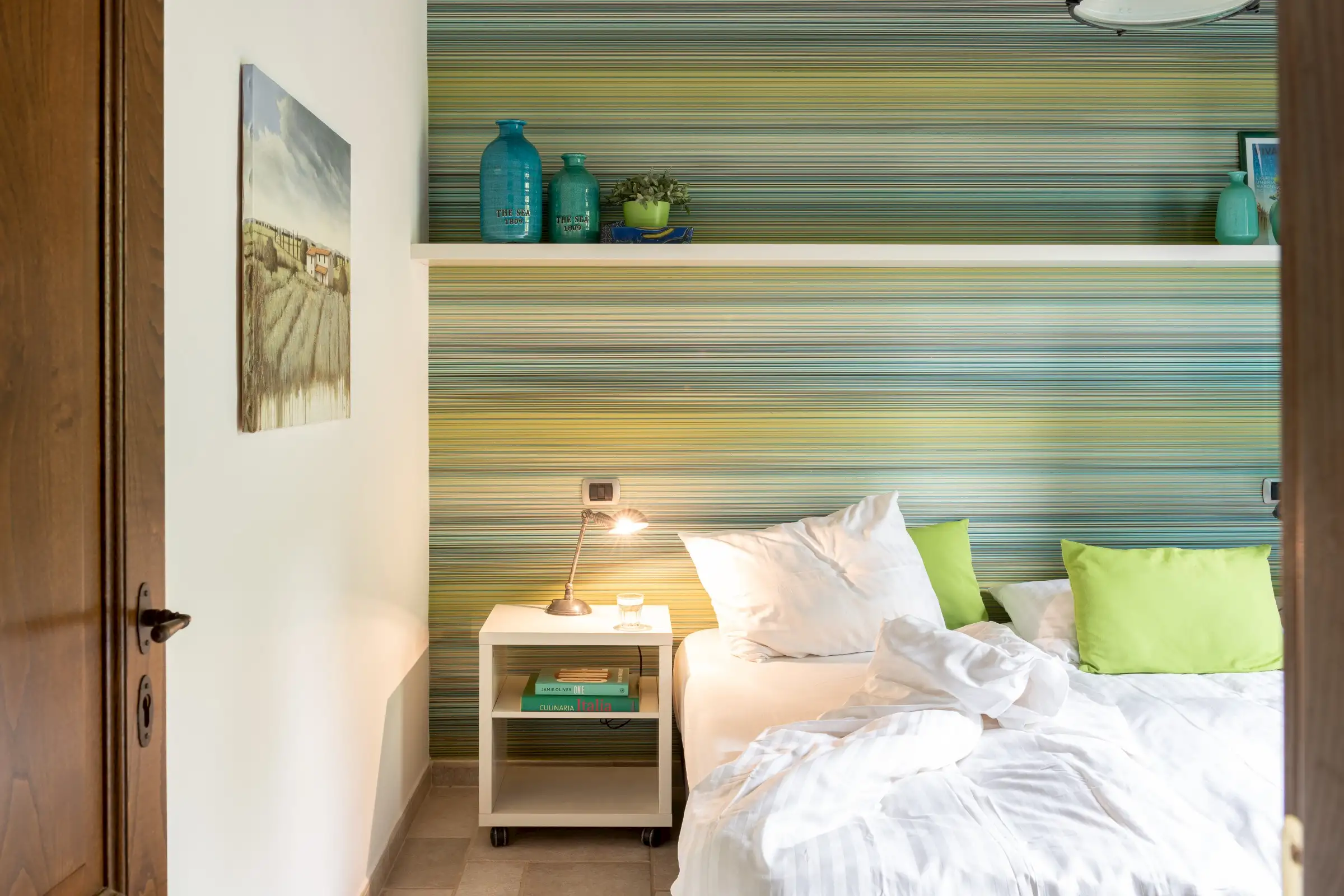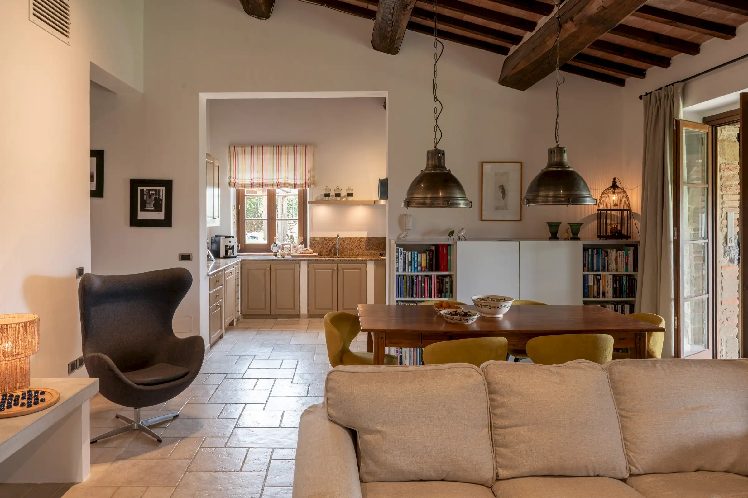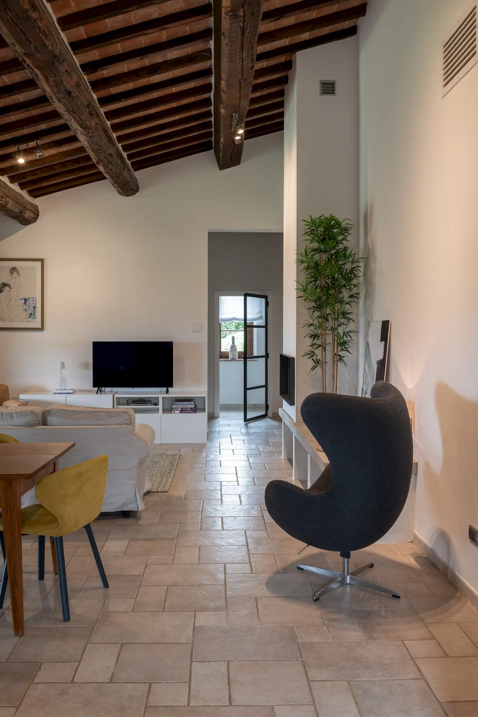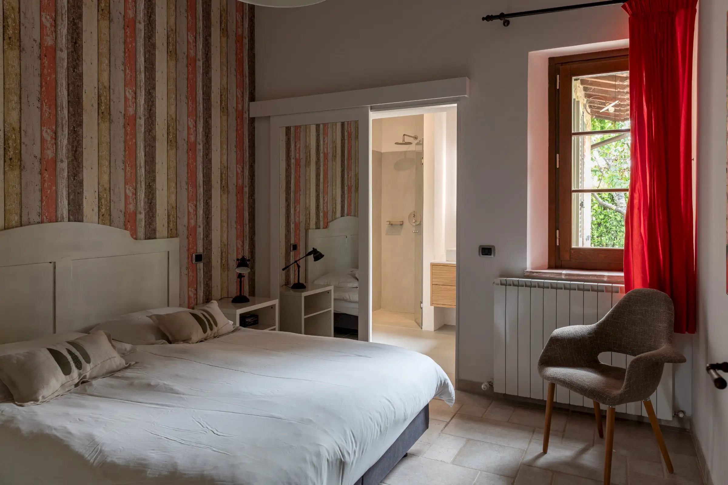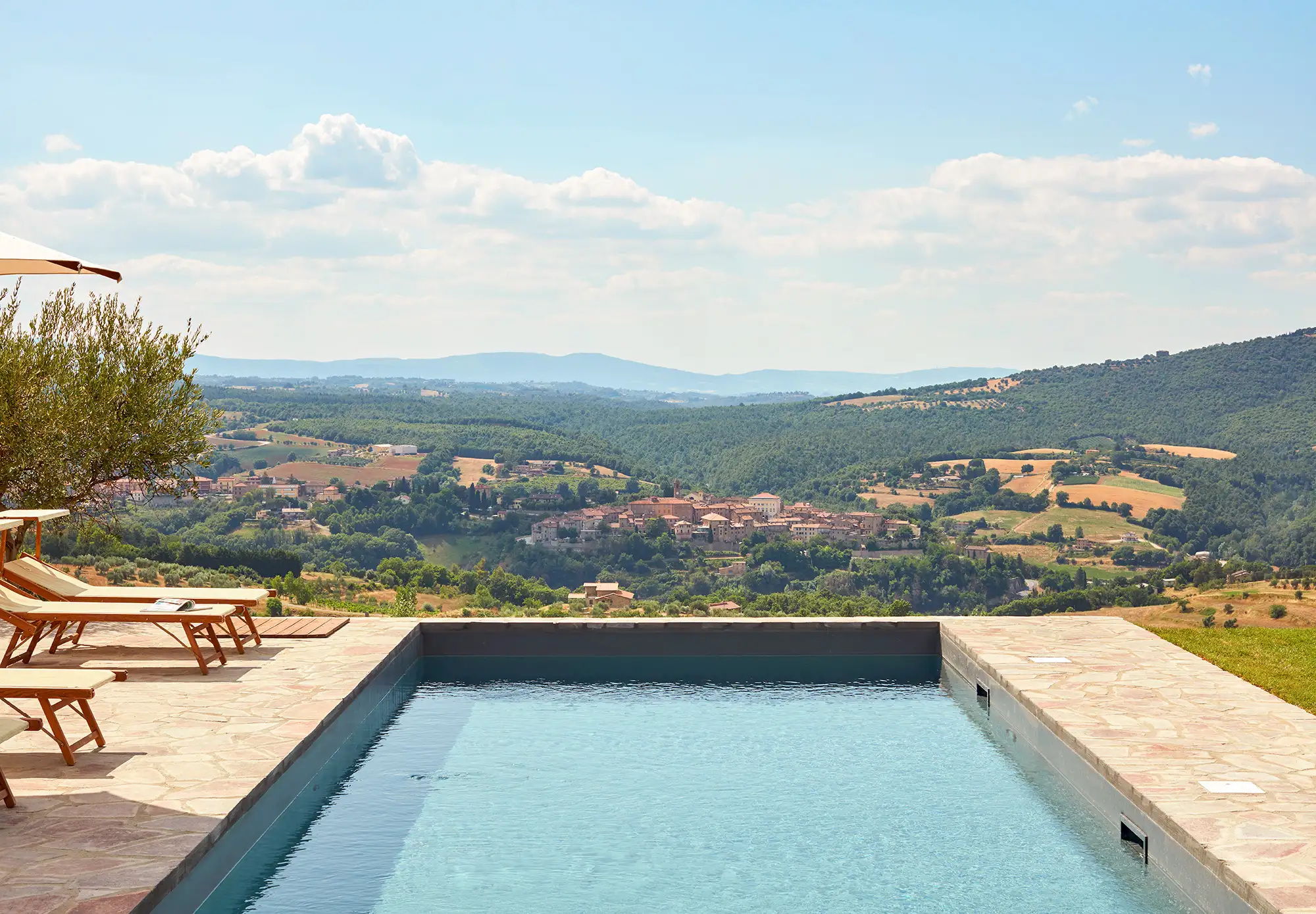 The interior is done in a light modern, colorful and cosy style. The house is dominantly positioned on an important Umbrian hillside near Lake Trasimeno and Perugia, enjoying spectacular vast views to Tuscany (Montepulciano). The outside sofas are the perfect place to stay all day. There is an outside fireplace which is the BBQ area in the summer and the perfect heating for sitting outside during chilly evenings. Il Sogno has a lovely garden with olive and fruit trees and some lawn around. The old Medieval small town of Piegaro is 2 kilometers away where the A1 Motorway exits for Rome and Florence only 20 minutes drive.