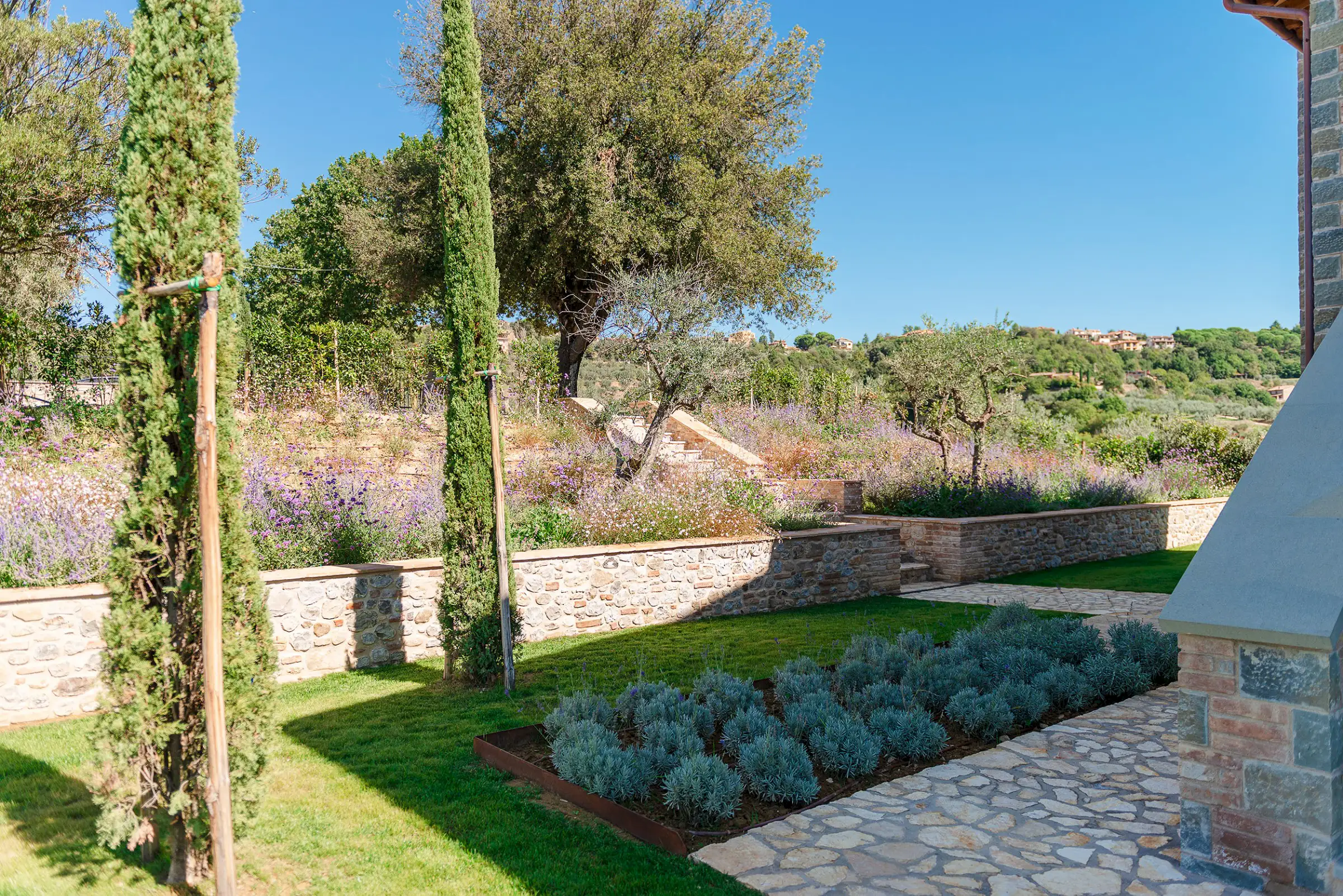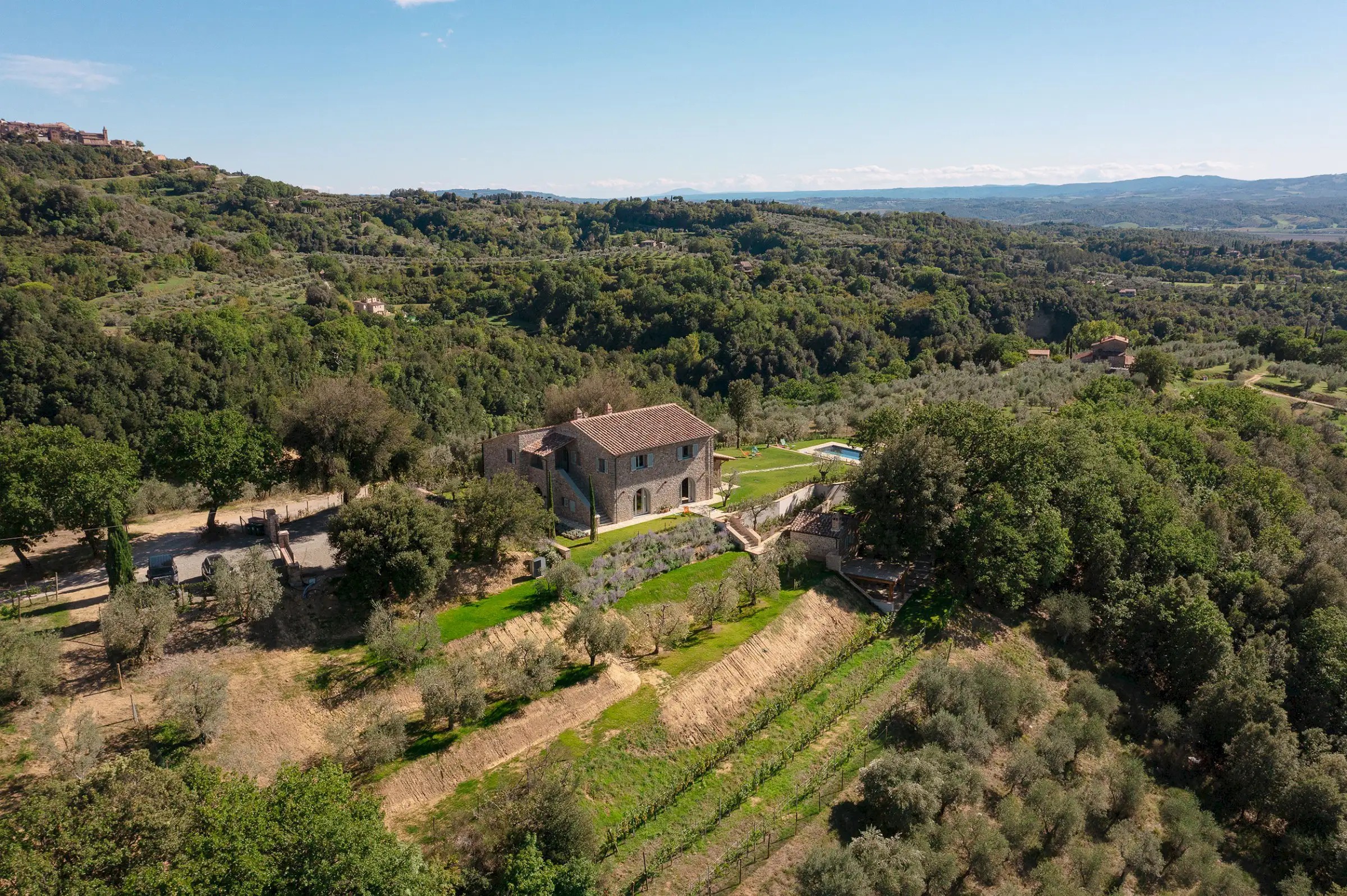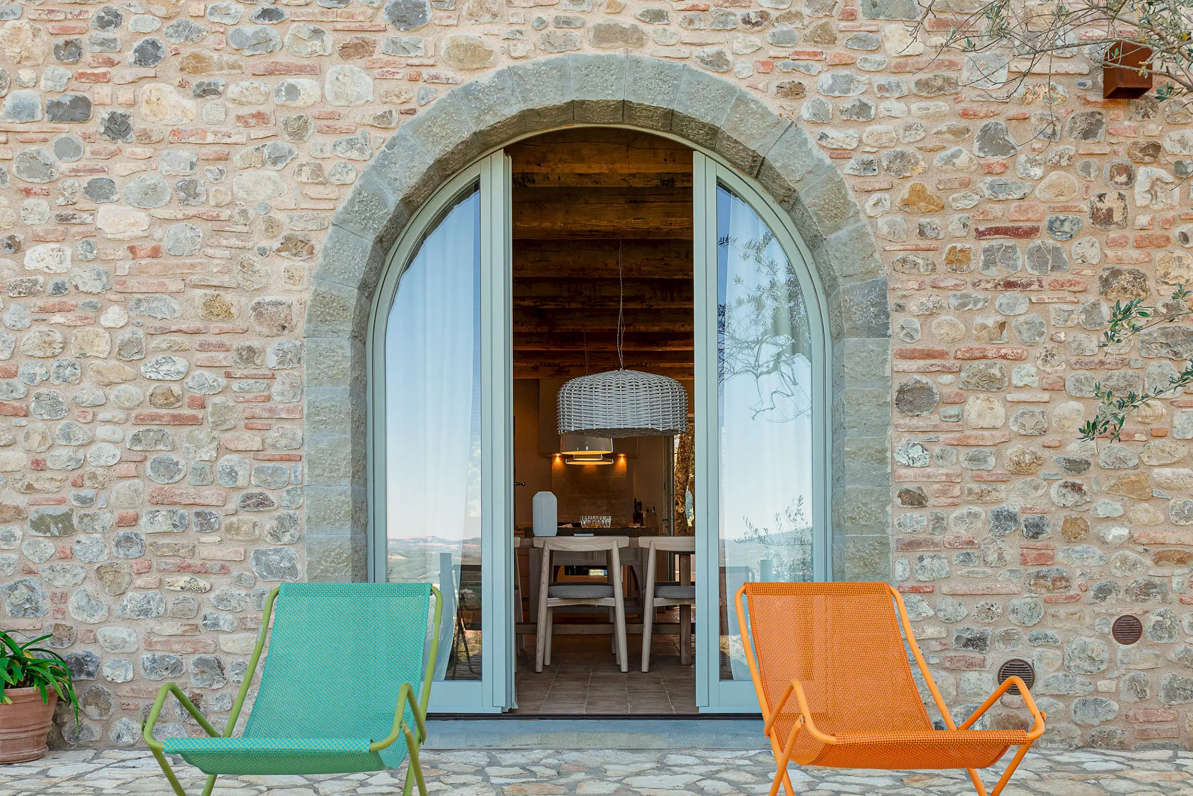 Fontesecca is a 350sqm villa that has been built on the site of a derelict farmhouse, from which as many materials as possible were repurposed for the new building. The house’s unique location, tucked into the hills just five minutes from Città della Pieve, offers picture-book views towards the pretty hilltop town, a valley on one side, the Val di Chiana the other, and Tuscany beyond.