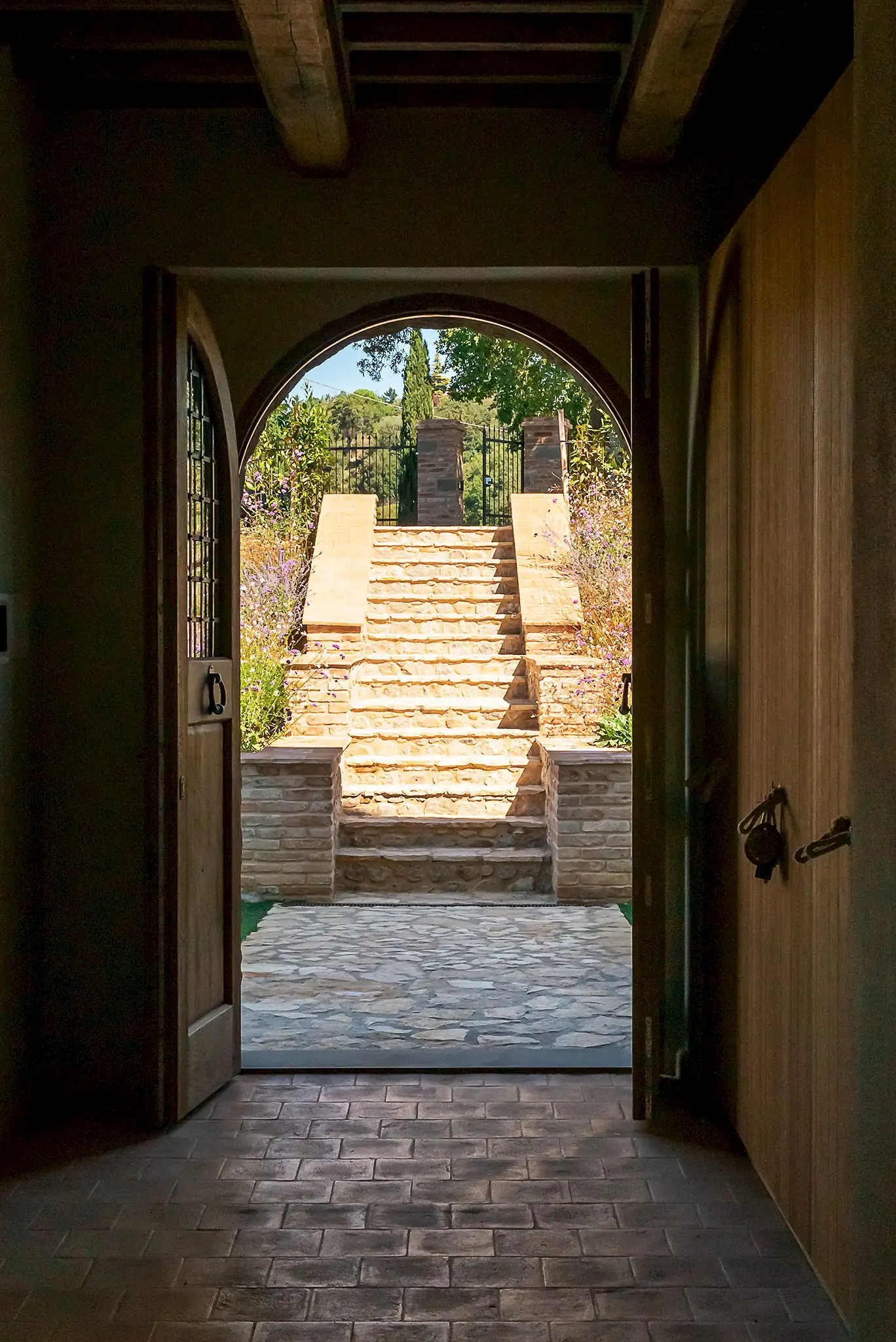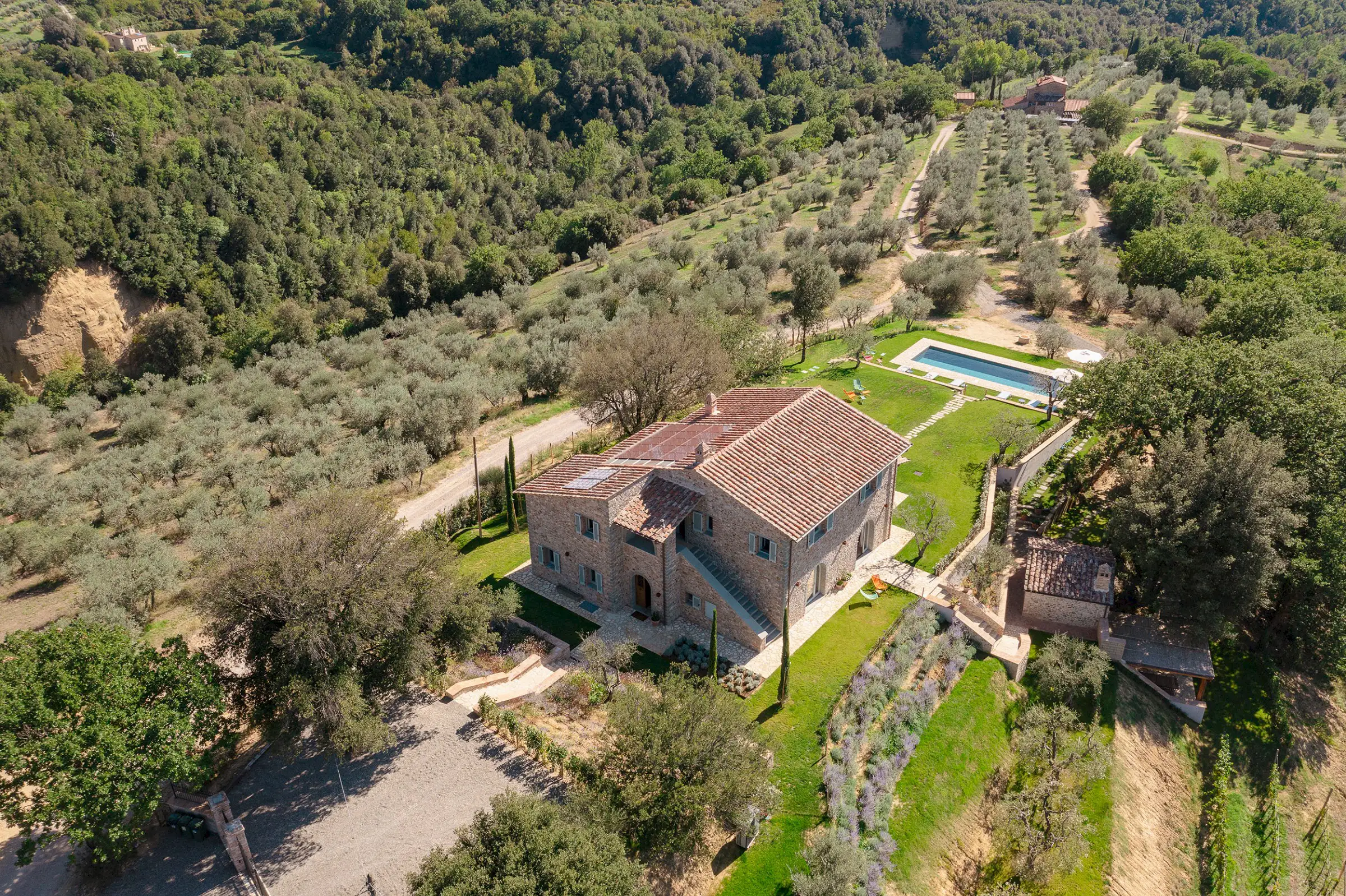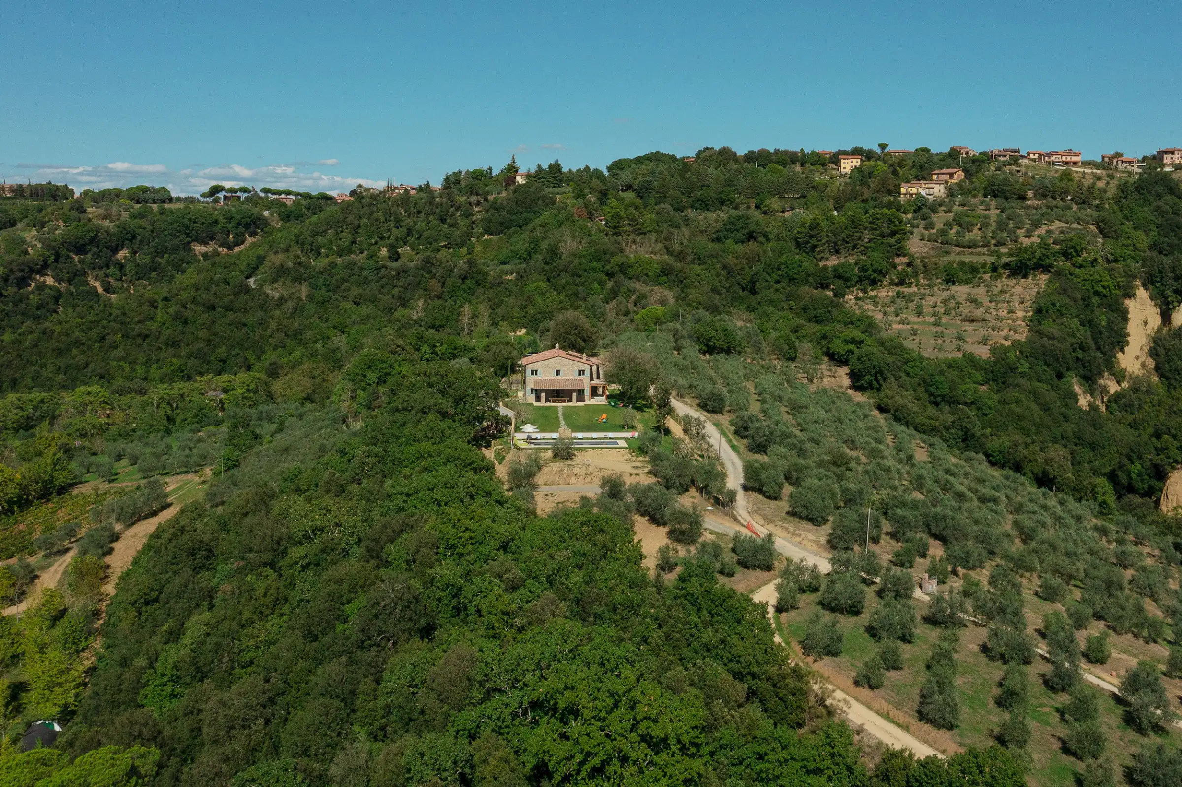 Fontesecca is a 350sqm villa that has been built on the site of a derelict farmhouse, from which as many materials as possible were repurposed for the new building. The house’s unique location, tucked into the hills just five minutes from Città della Pieve, offers picture-book views towards the pretty hilltop town, a valley on one side, the Val di Chiana the other, and Tuscany beyond.