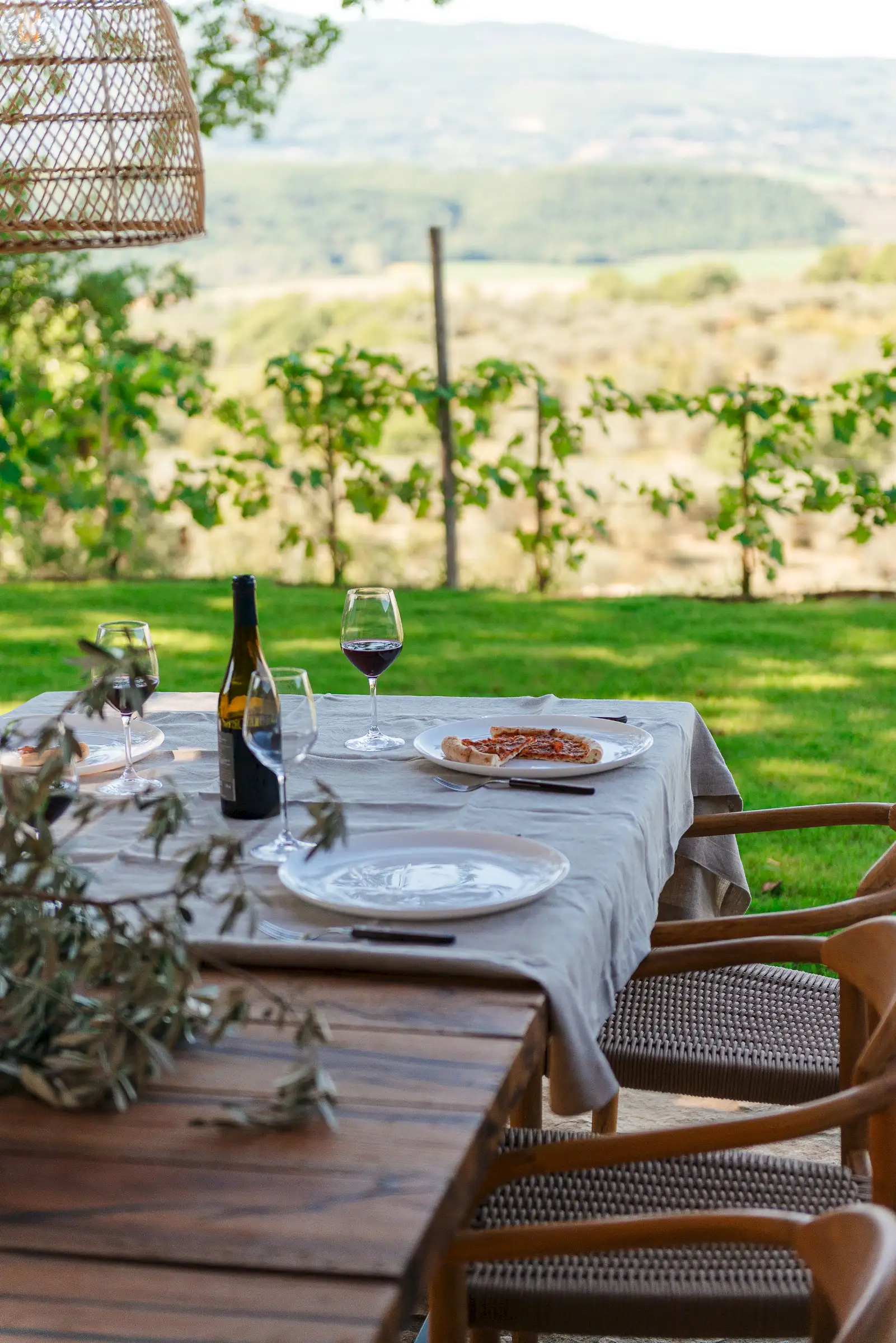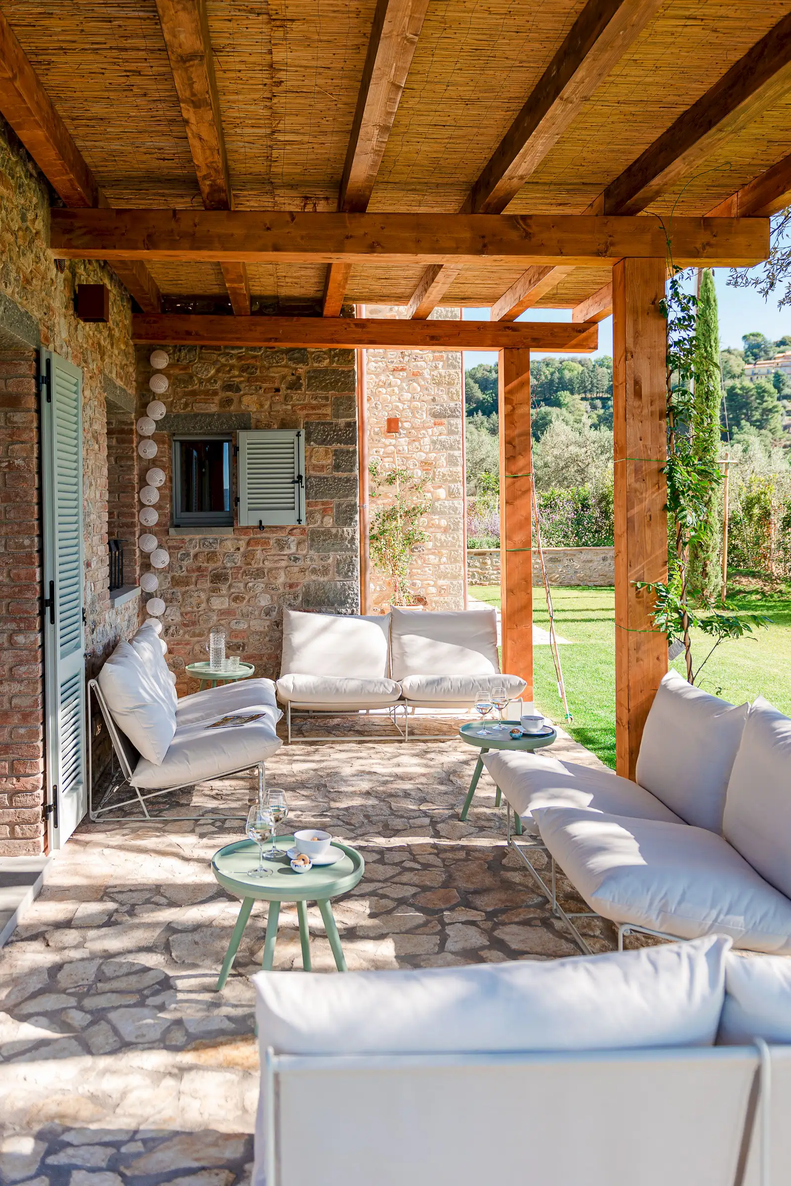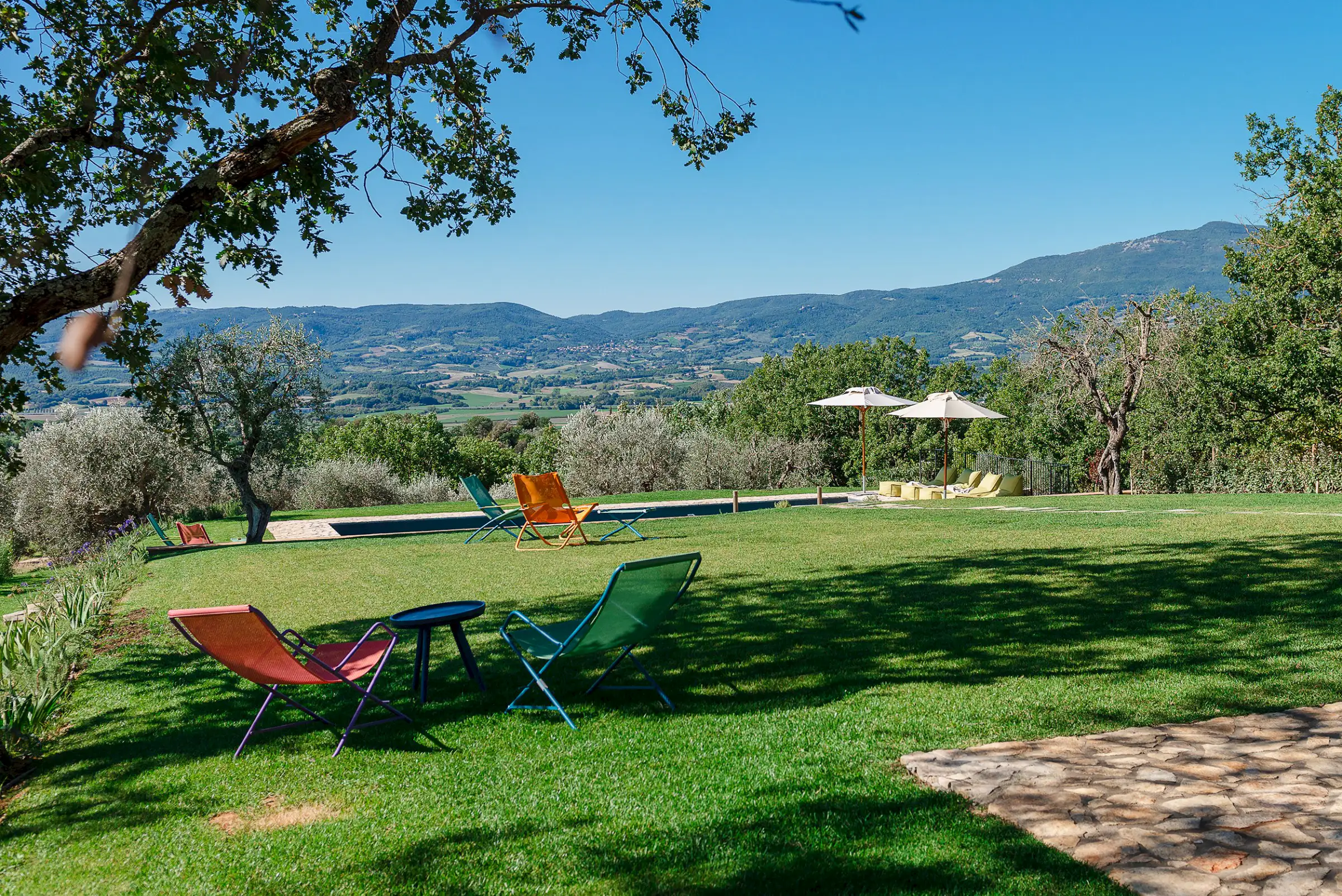 A short stroll from the main house is the cantina, located in the only original structure to remain, which was once a wine cellar. The upper part is garden storage but the lower part is where the magic happens. This inside/outside space has a kitchen, and a pizza oven has filled the gap of what was once a window. The dining table under the portico outside is a dreamy setting for large group meals with a mesmerising view, personifying all the best bits of Italy, and Umbria in particular. In the Villa you will find the soap, shampoo and shower gel exclusively produced in Umbria and composed by bio agriculture and essential oils.