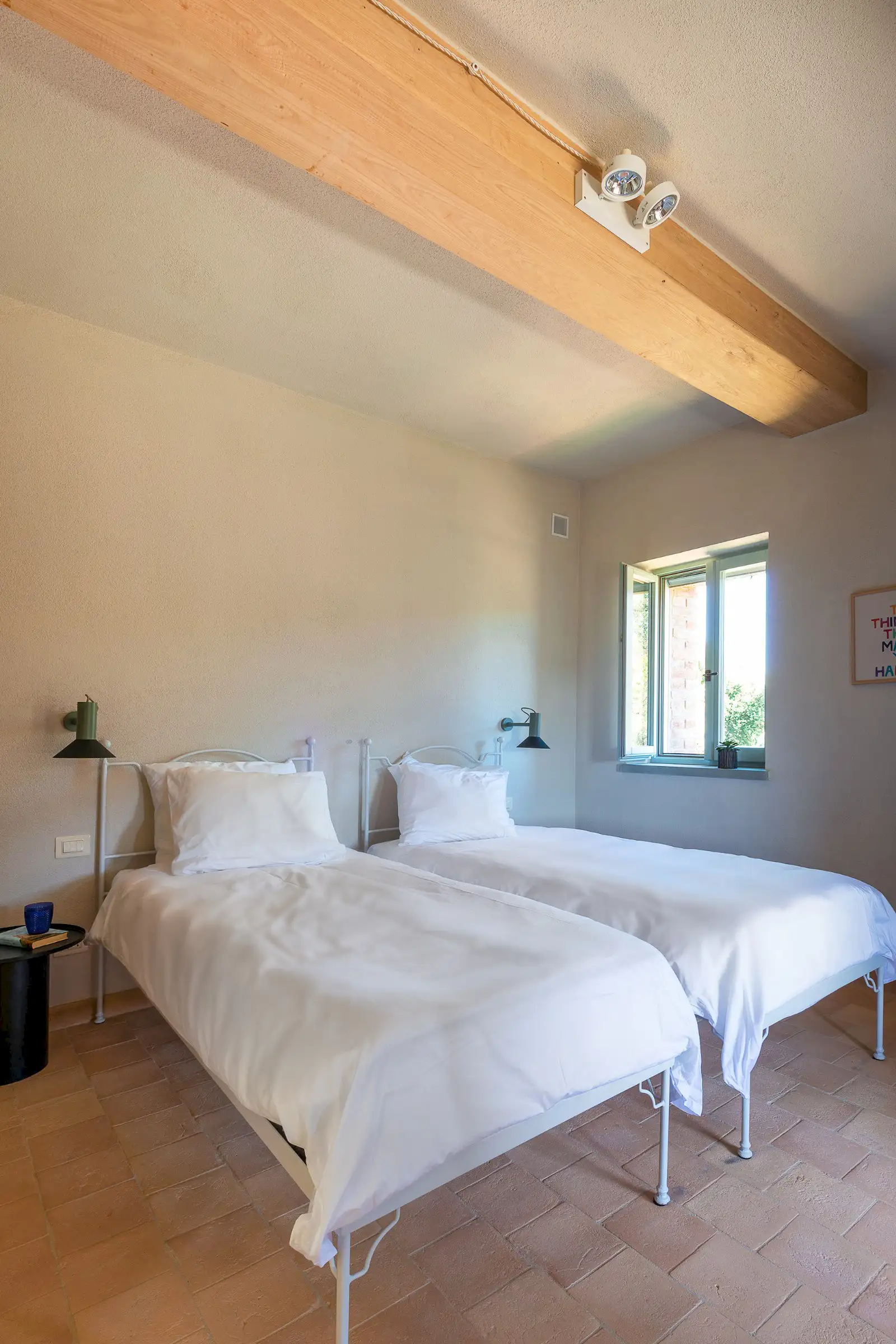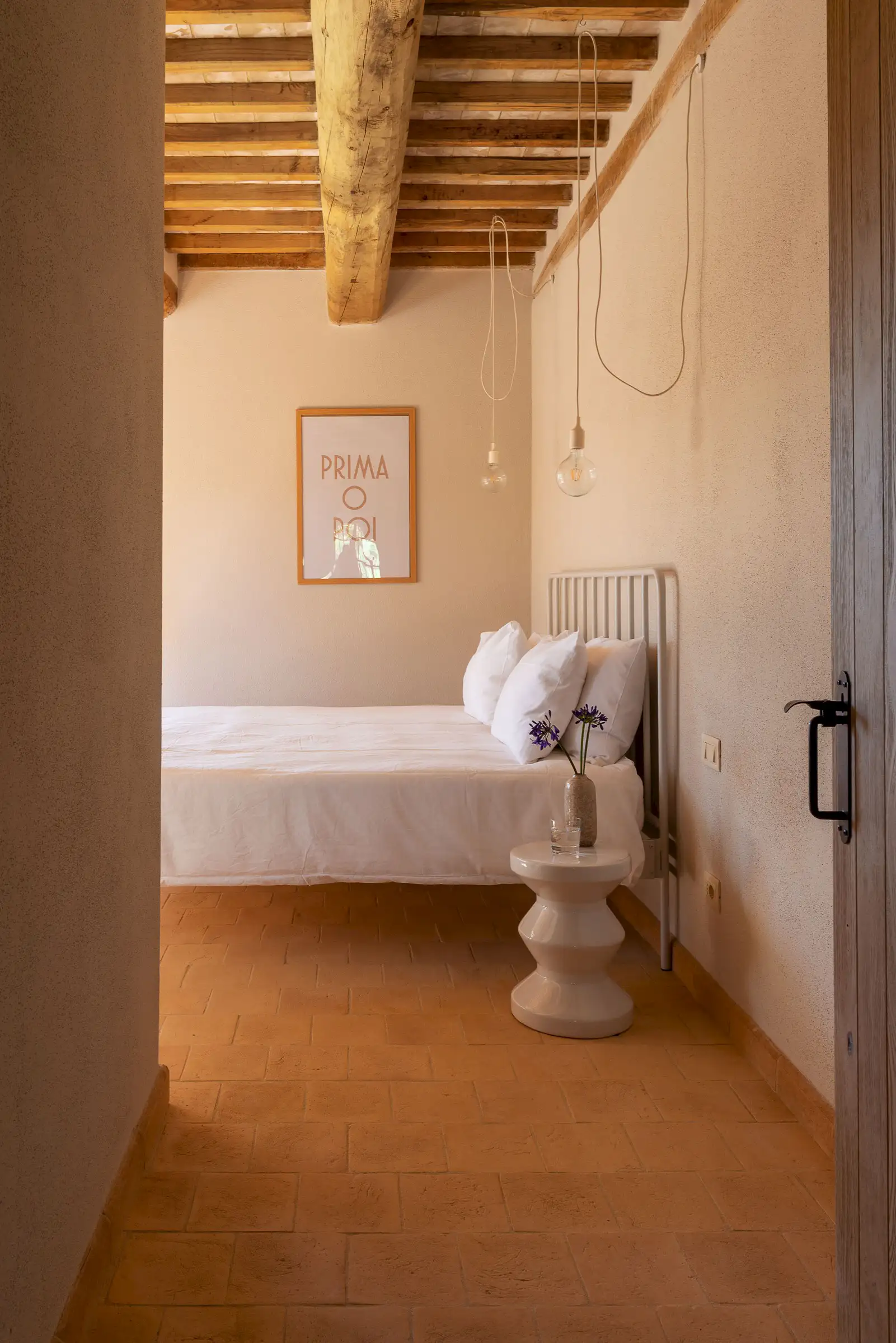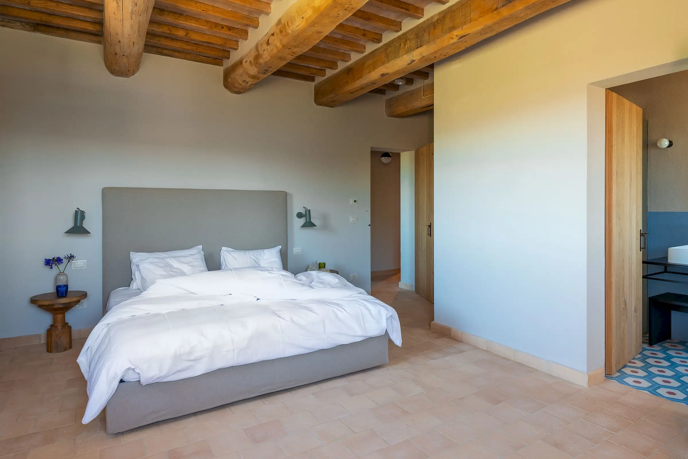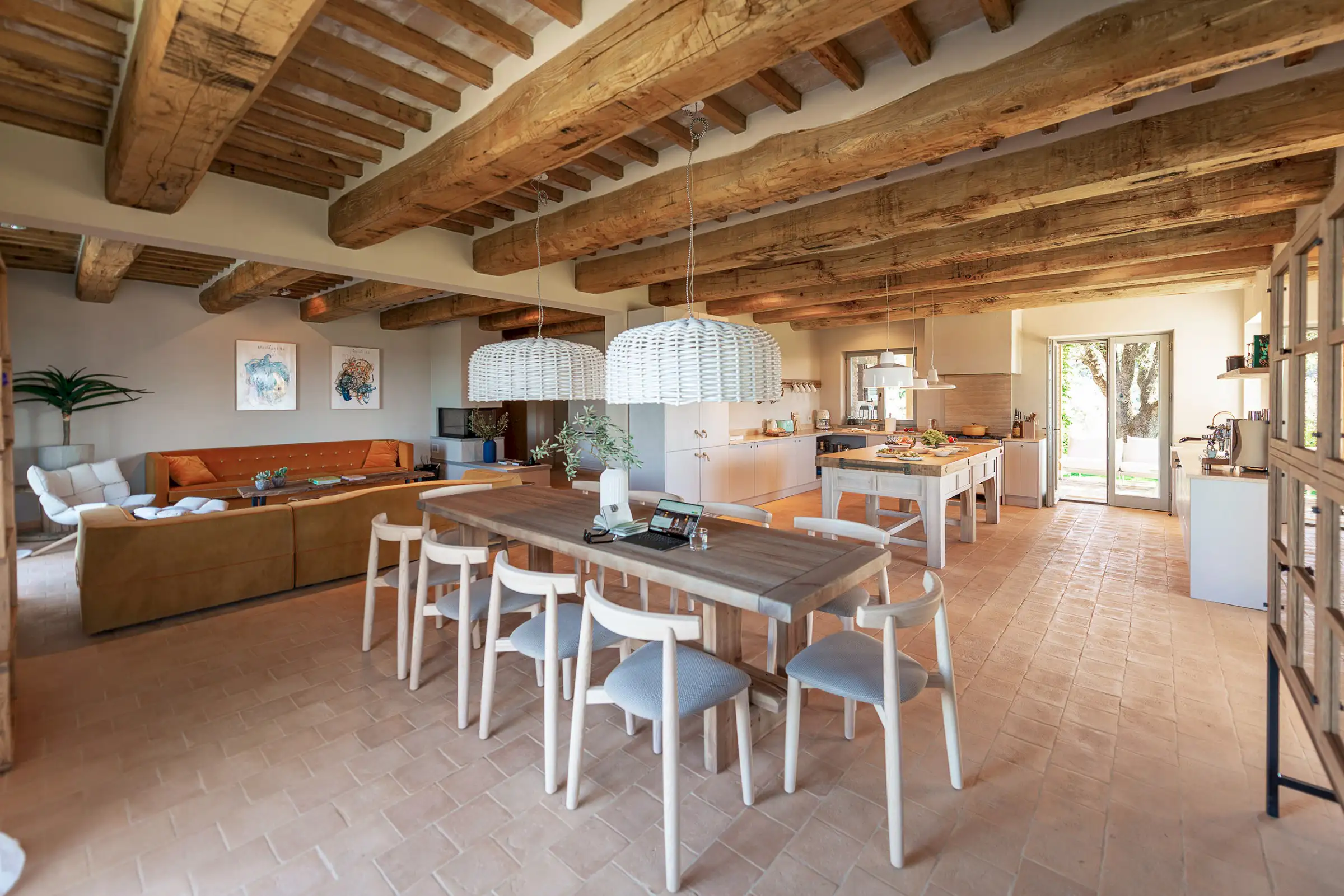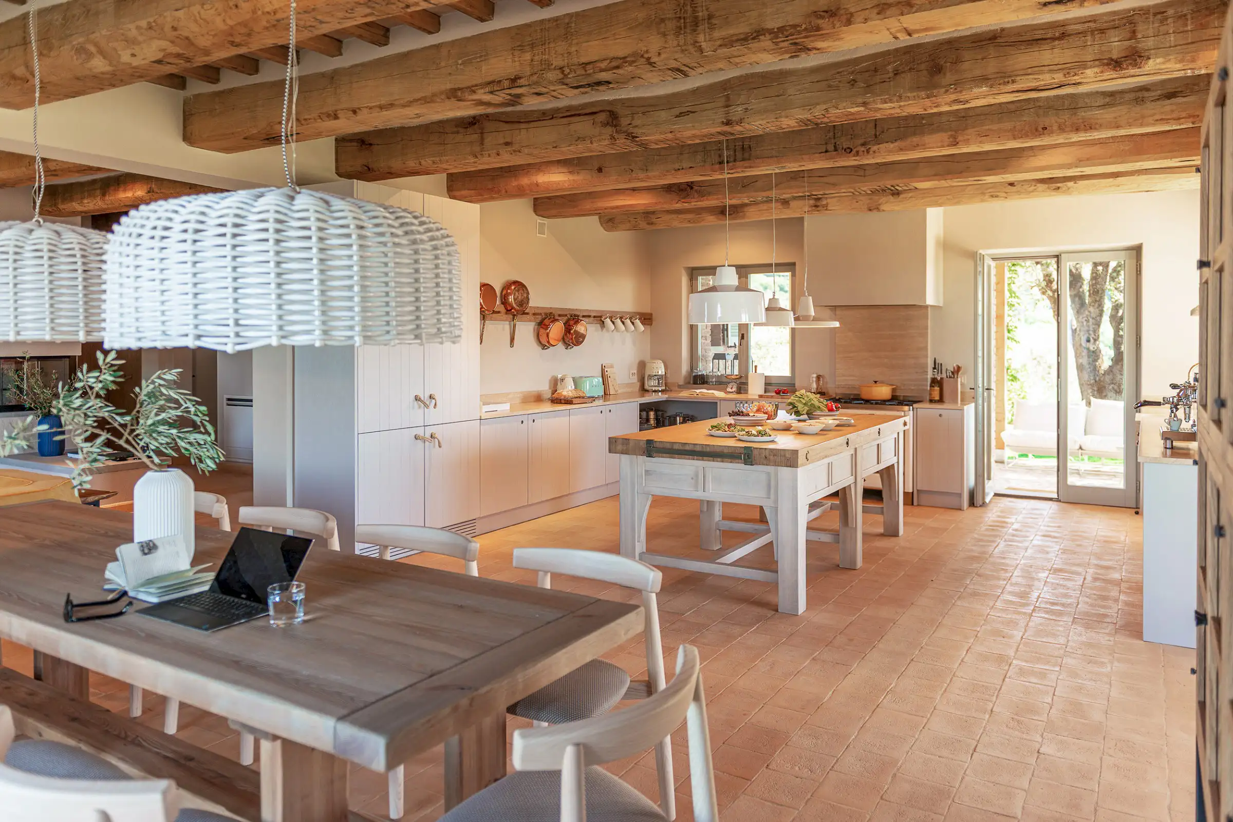 The property sleeps ten in five spacious en-suites, including four doubles on the first floor and one twin on the ground floor. The rooms have traditional beamed ceilings and handmade cotto floor tiles with an under-floor cooling system. The beds have luxurious memory-foam mattresses and are dressed with comfortable, cool linens, while the furniture, including Kave Home desks in a couple of the rooms, is a subtle mix of rustic wood and sleek Italian design pieces, giving a modern, calm, country feel.