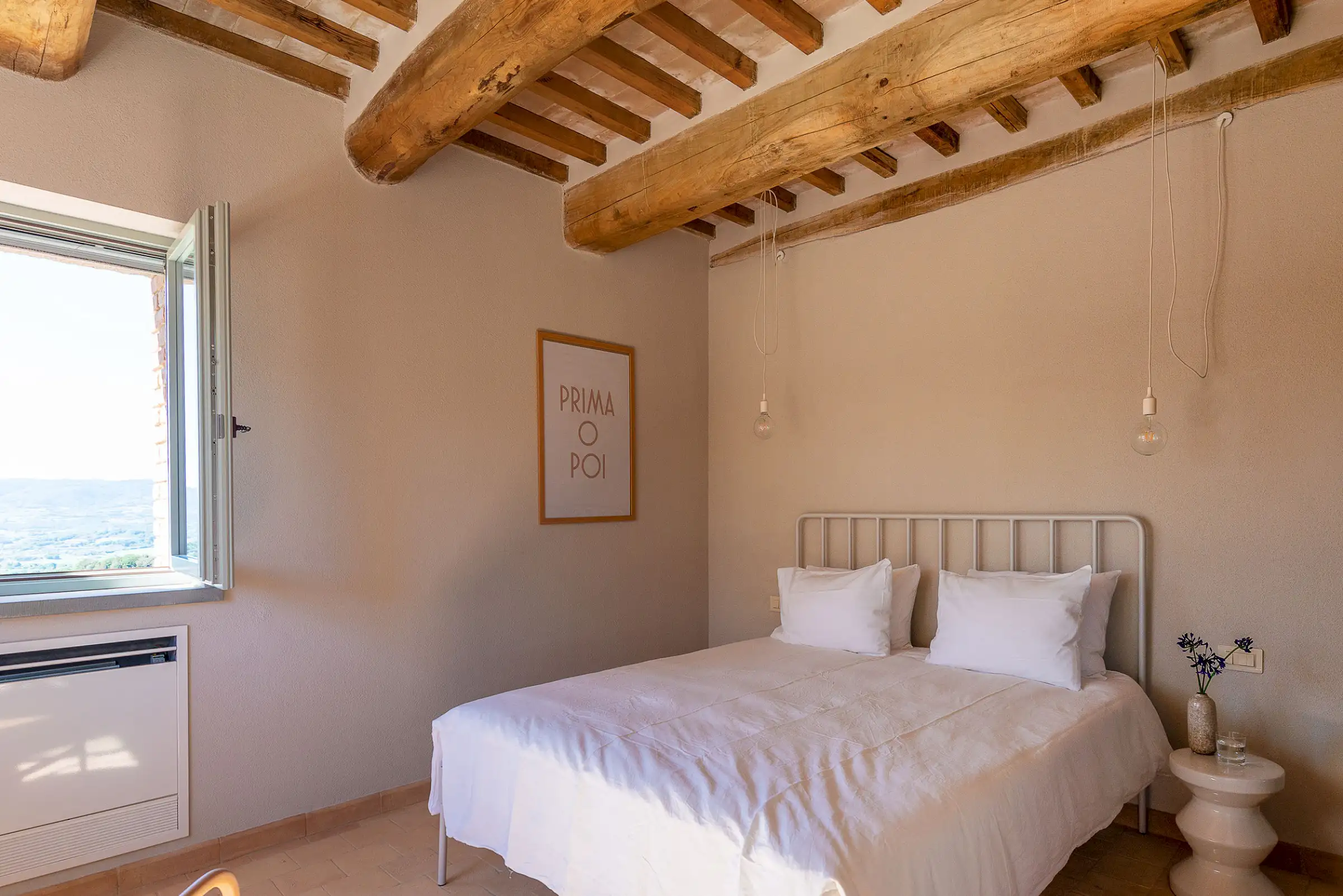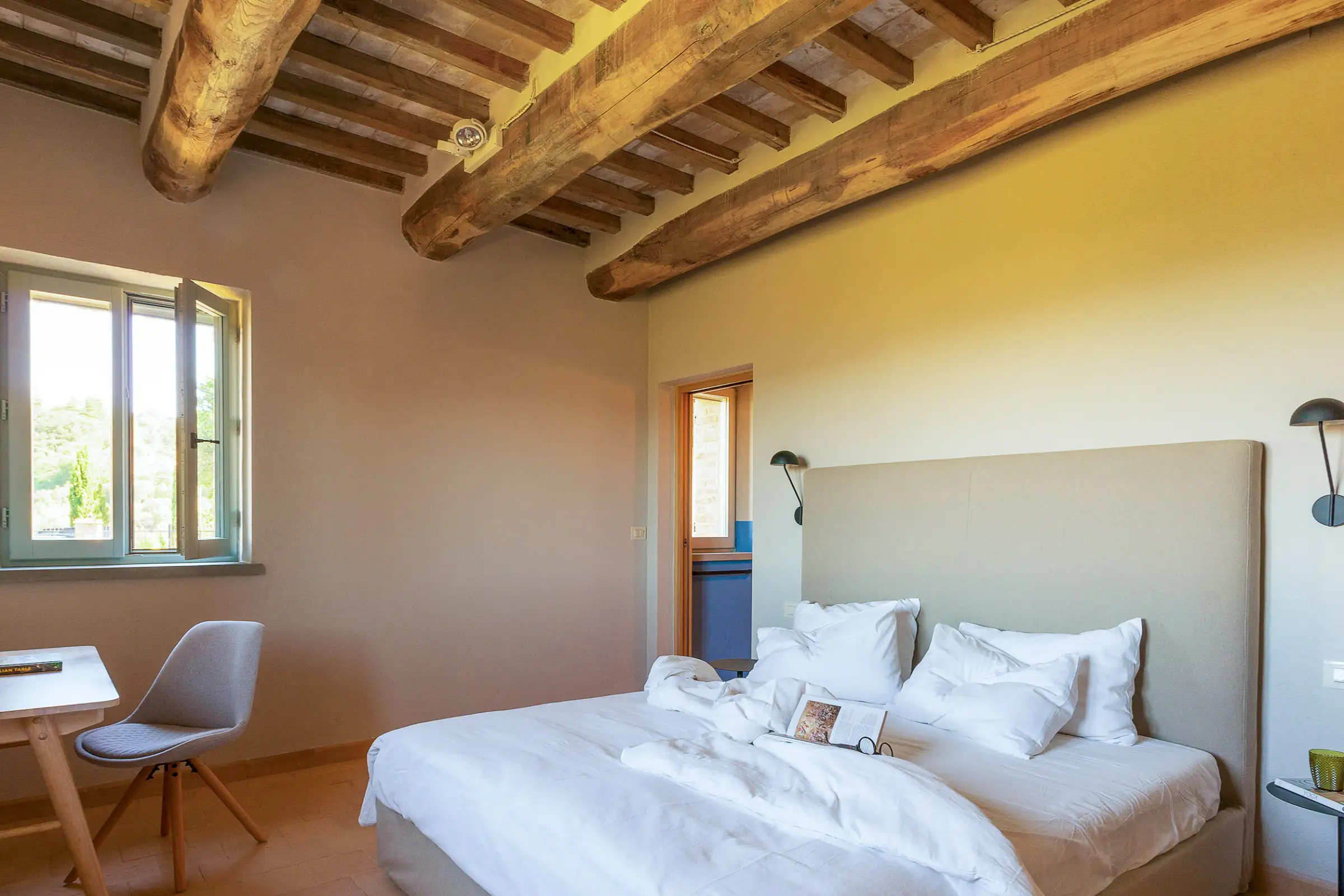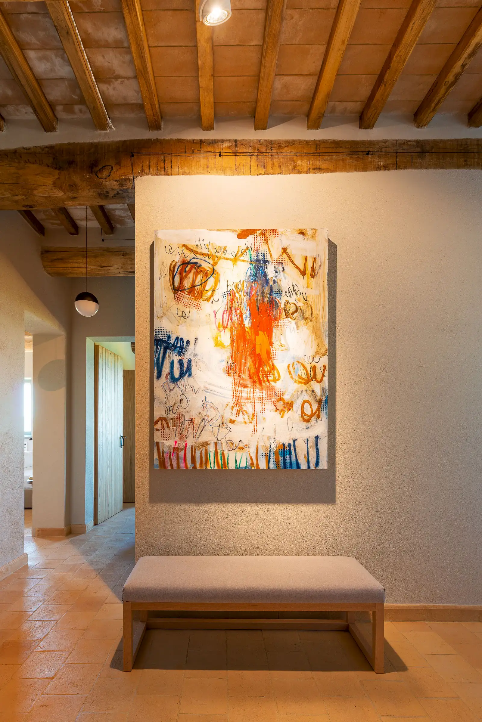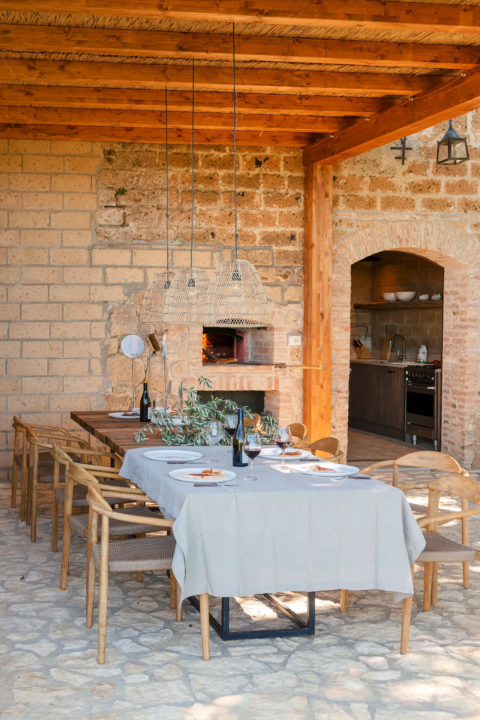 The property sleeps ten in five spacious en-suites, including four doubles on the first floor and one twin on the ground floor. The rooms have traditional beamed ceilings and handmade cotto floor tiles with an under-floor cooling system. The beds have luxurious memory-foam mattresses and are dressed with comfortable, cool linens, while the furniture, including Kave Home desks in a couple of the rooms, is a subtle mix of rustic wood and sleek Italian design pieces, giving a modern, calm, country feel.