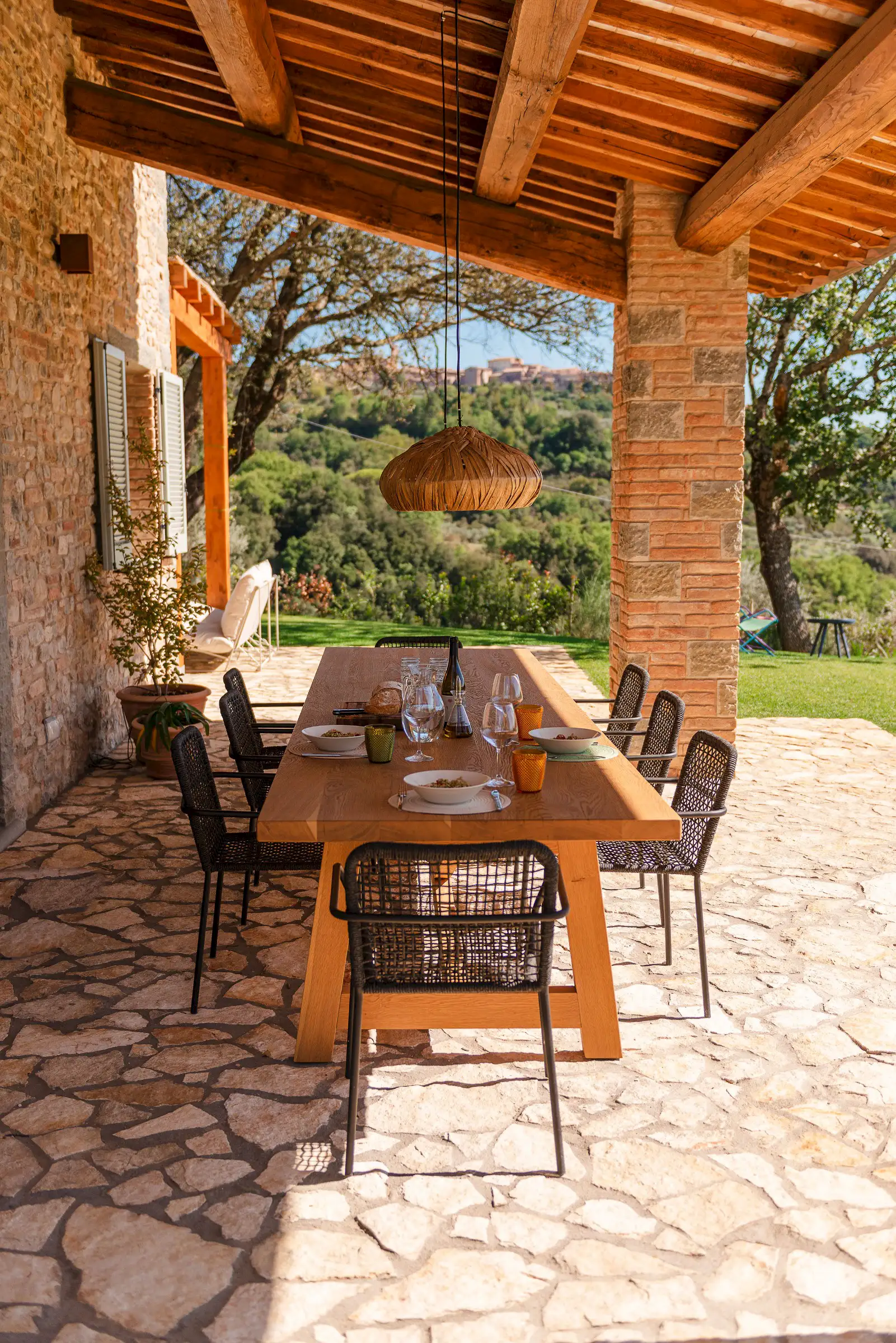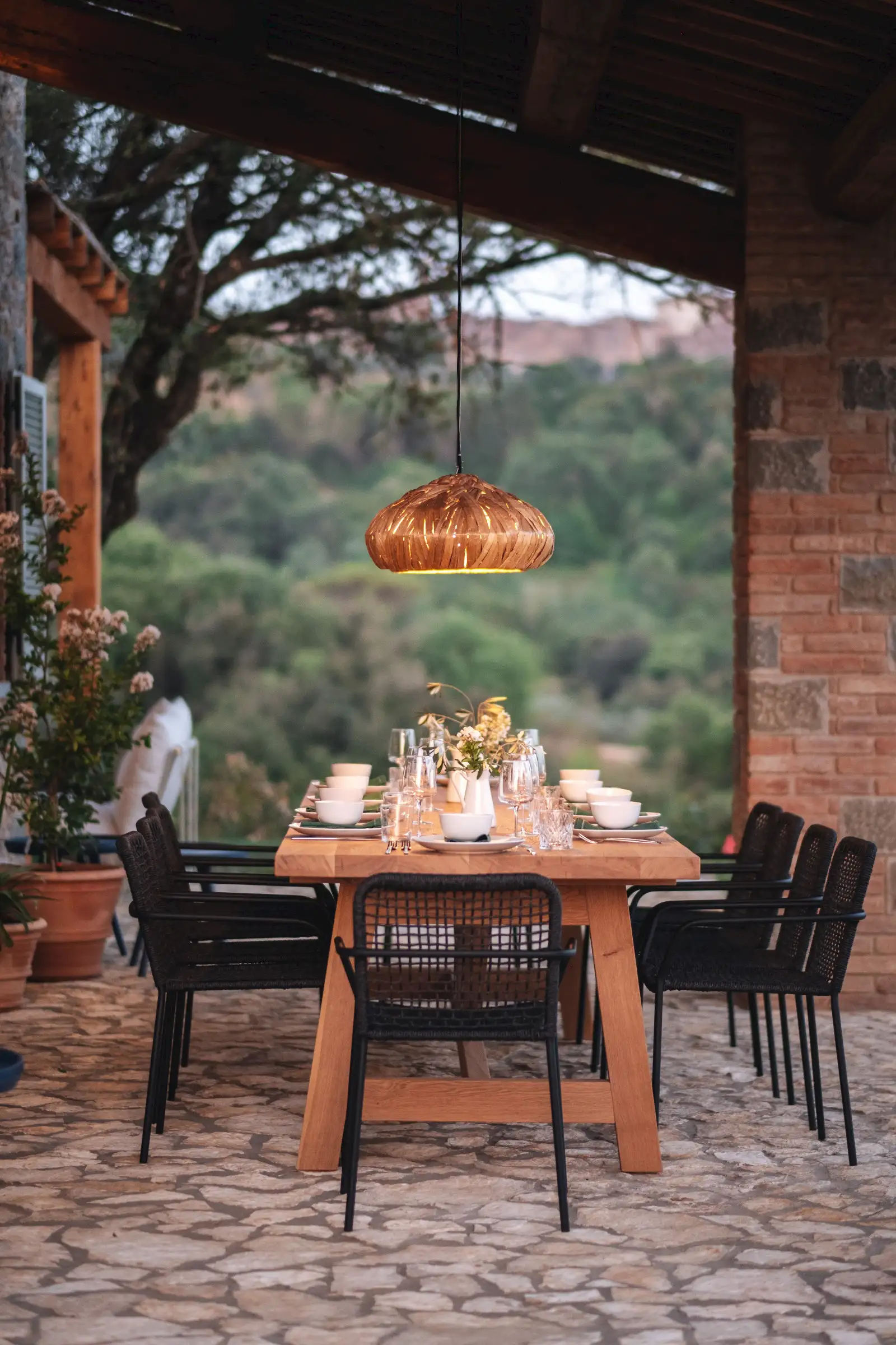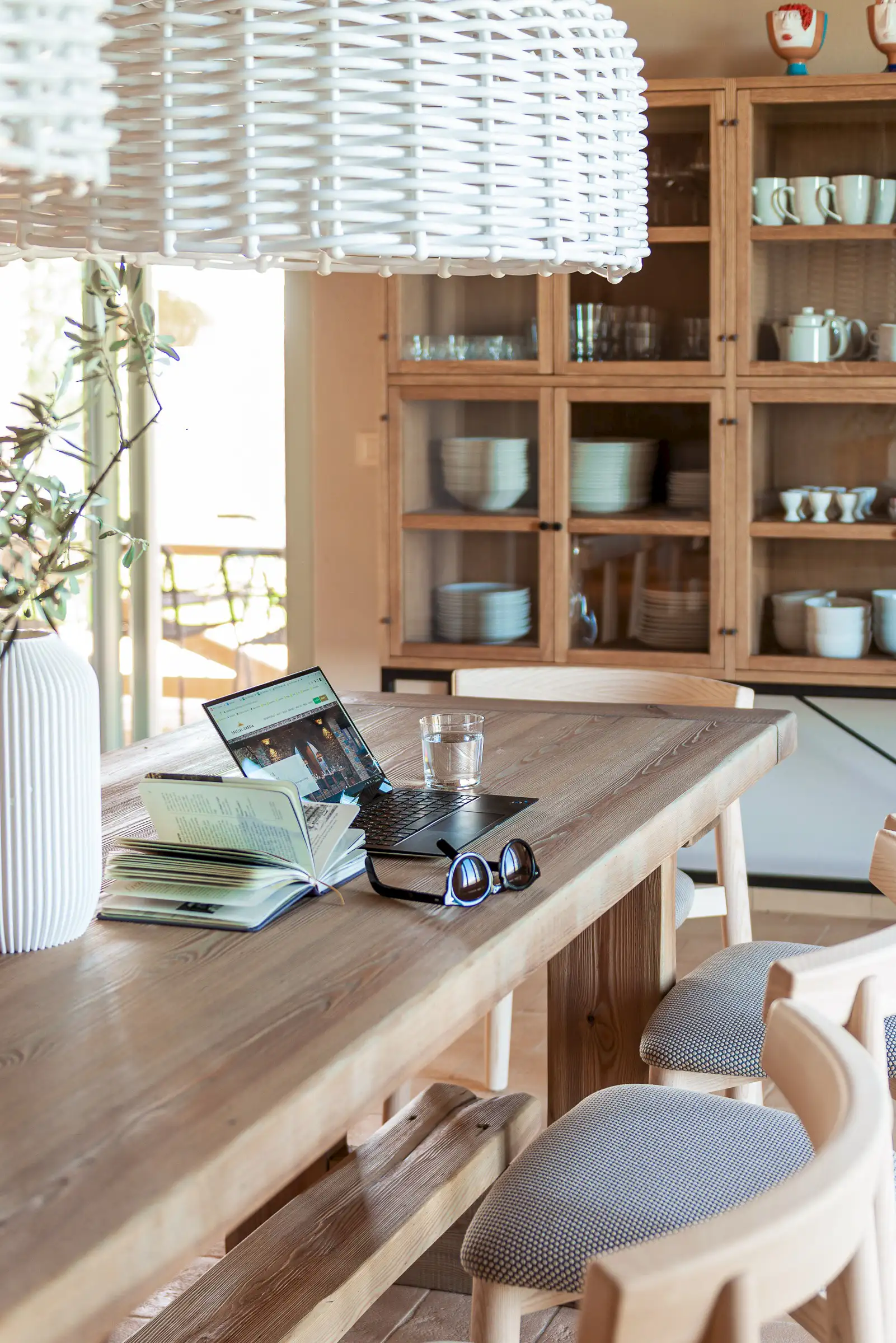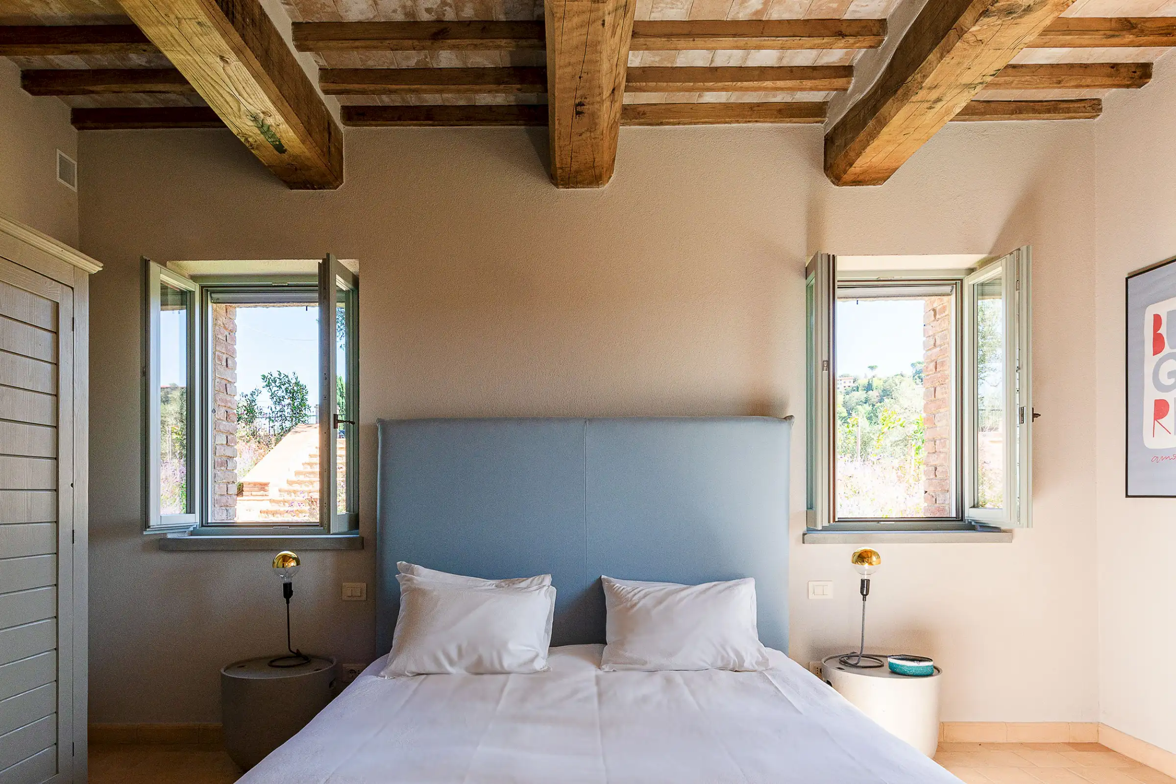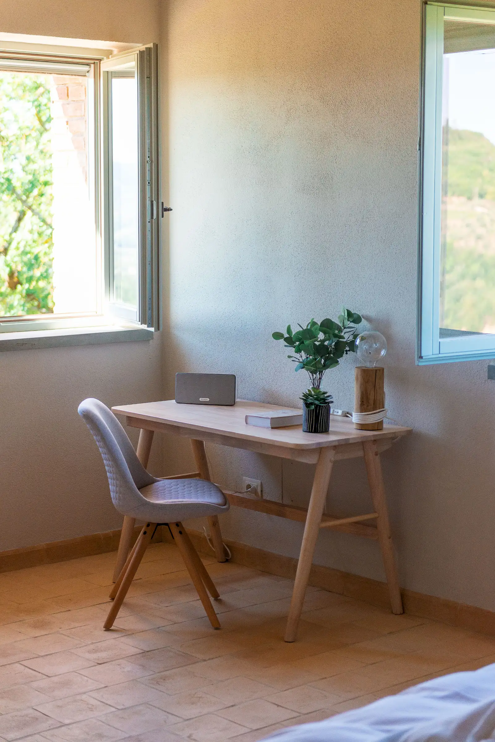 The property sleeps ten in five spacious en-suites, including four doubles on the first floor and one twin on the ground floor. The rooms have traditional beamed ceilings and handmade cotto floor tiles with an under-floor cooling system. The beds have luxurious memory-foam mattresses and are dressed with comfortable, cool linens, while the furniture, including Kave Home desks in a couple of the rooms, is a subtle mix of rustic wood and sleek Italian design pieces, giving a modern, calm, country feel.