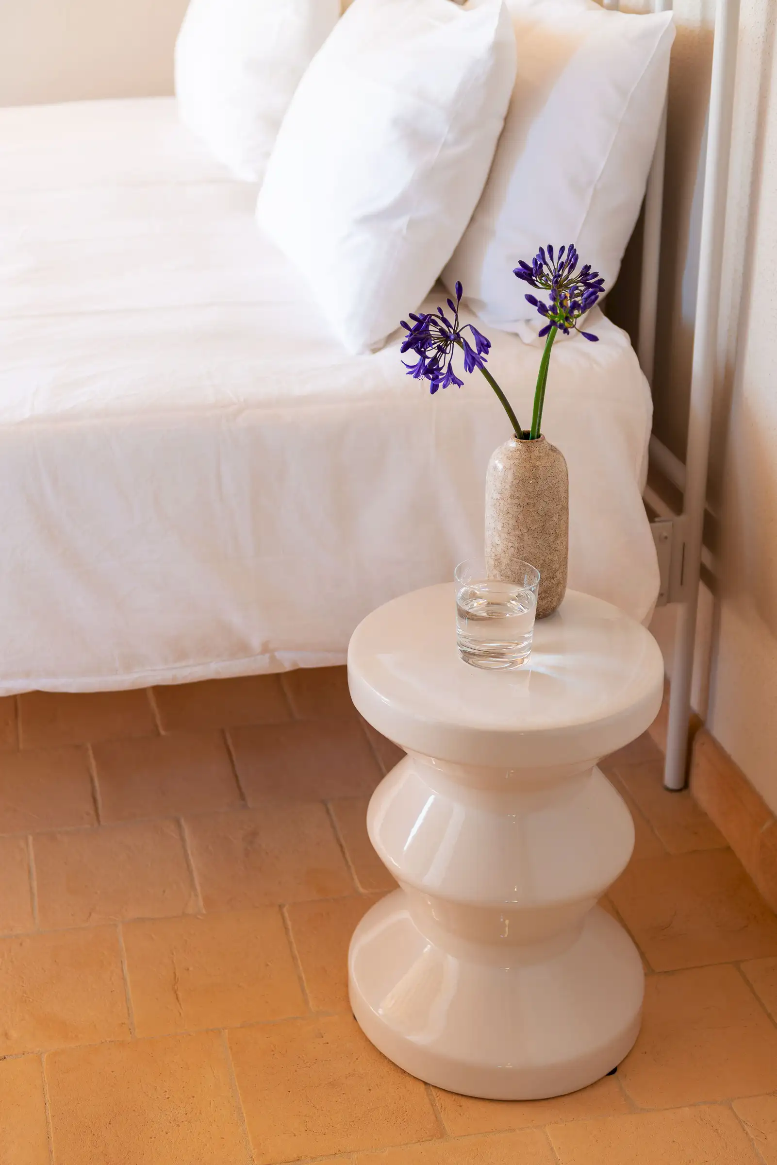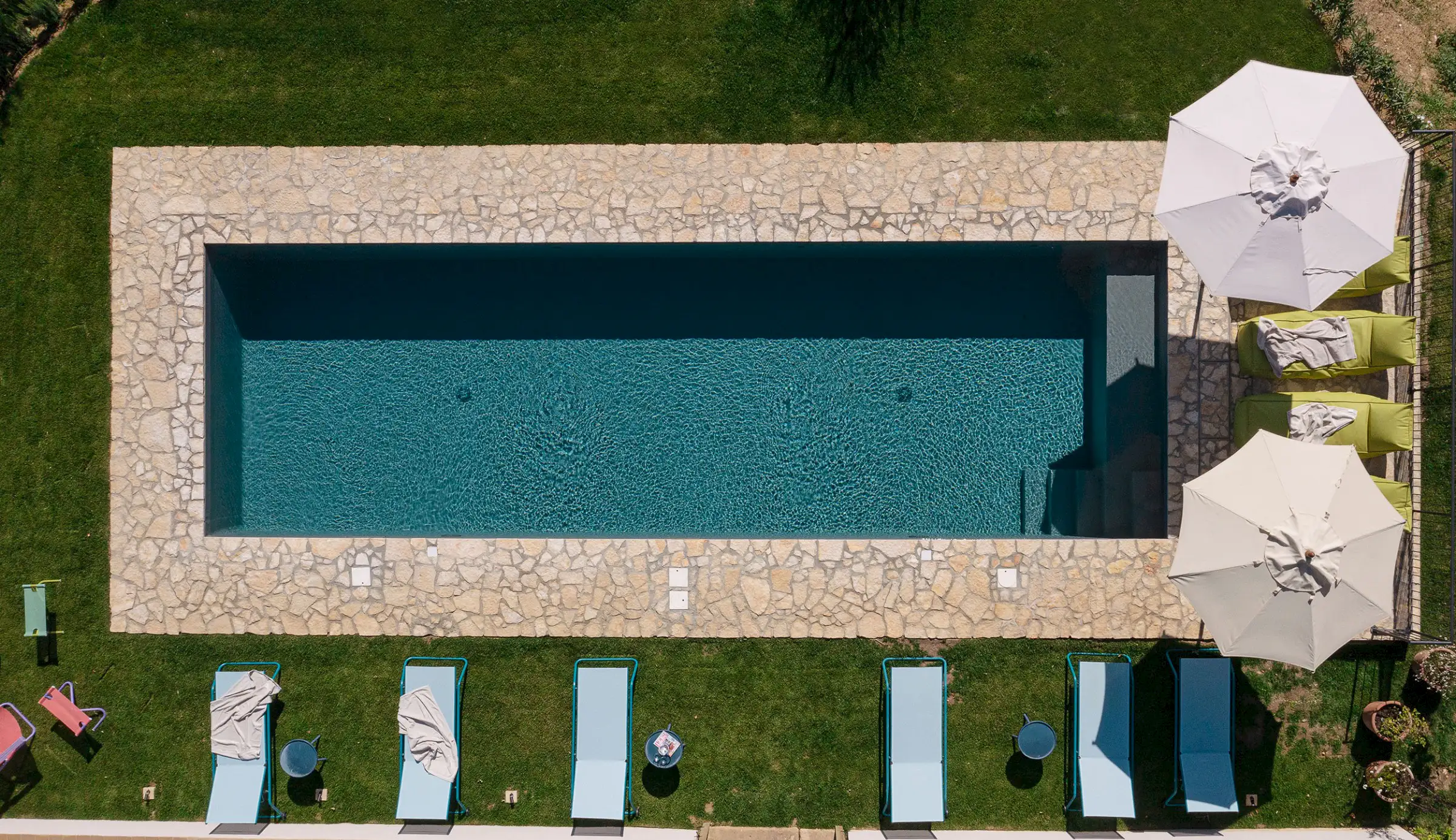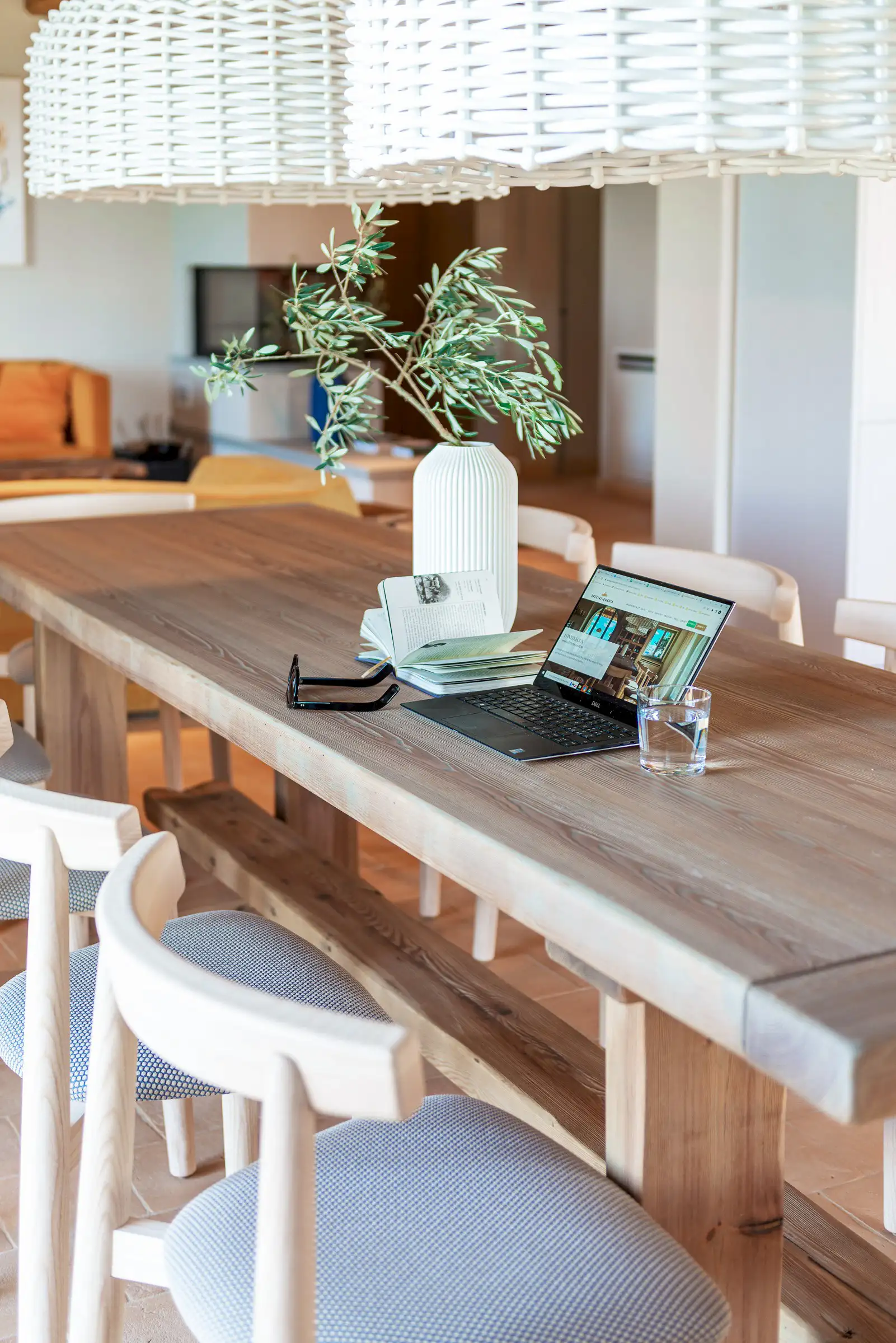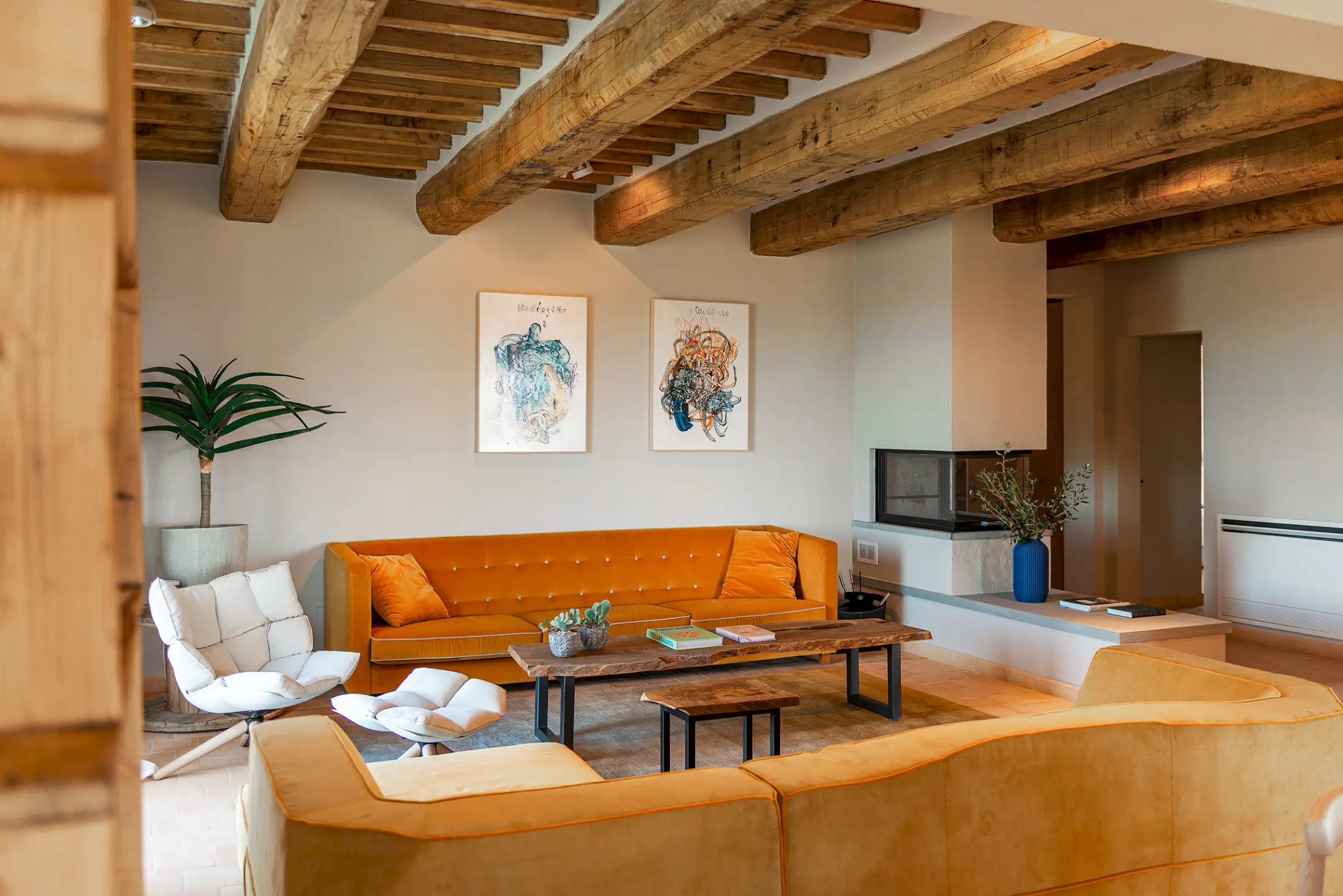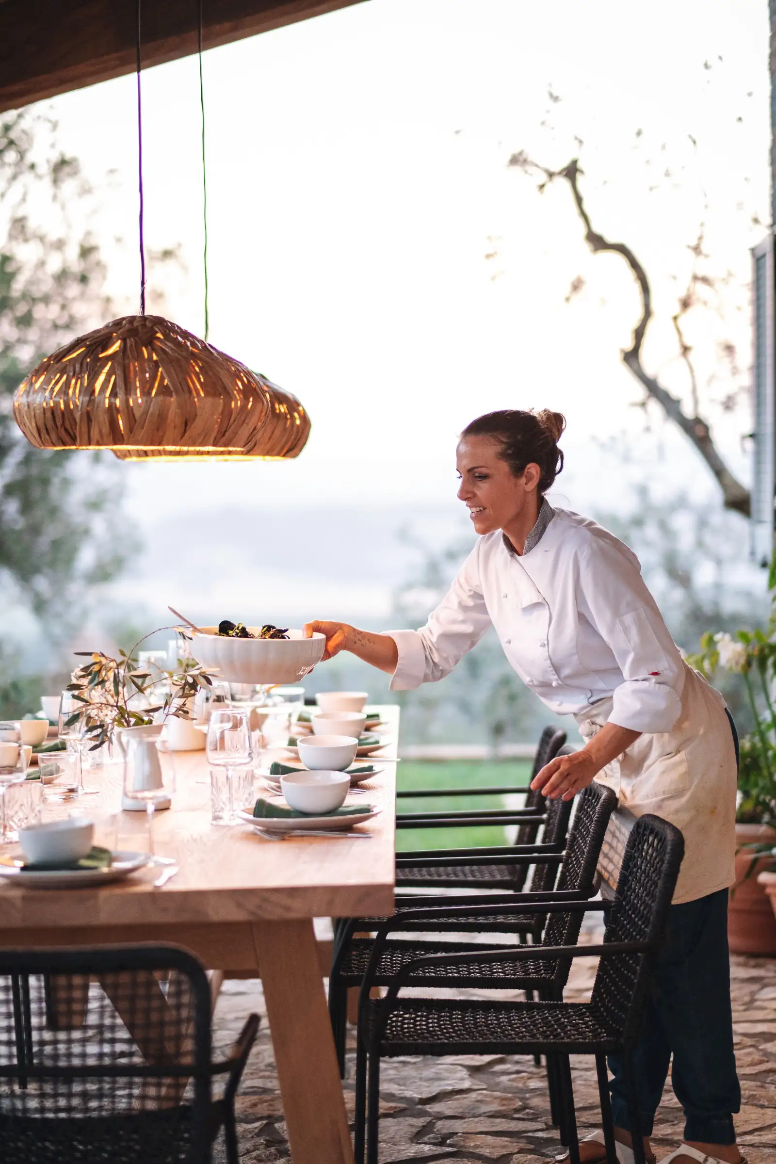 The property sleeps ten in five spacious en-suites, including four doubles on the first floor and one twin on the ground floor. The rooms have traditional beamed ceilings and handmade cotto floor tiles with an under-floor cooling system. The beds have luxurious memory-foam mattresses and are dressed with comfortable, cool linens, while the furniture, including Kave Home desks in a couple of the rooms, is a subtle mix of rustic wood and sleek Italian design pieces, giving a modern, calm, country feel.