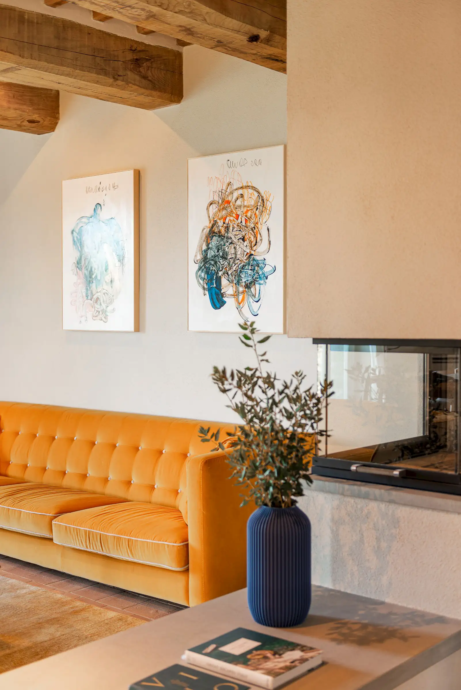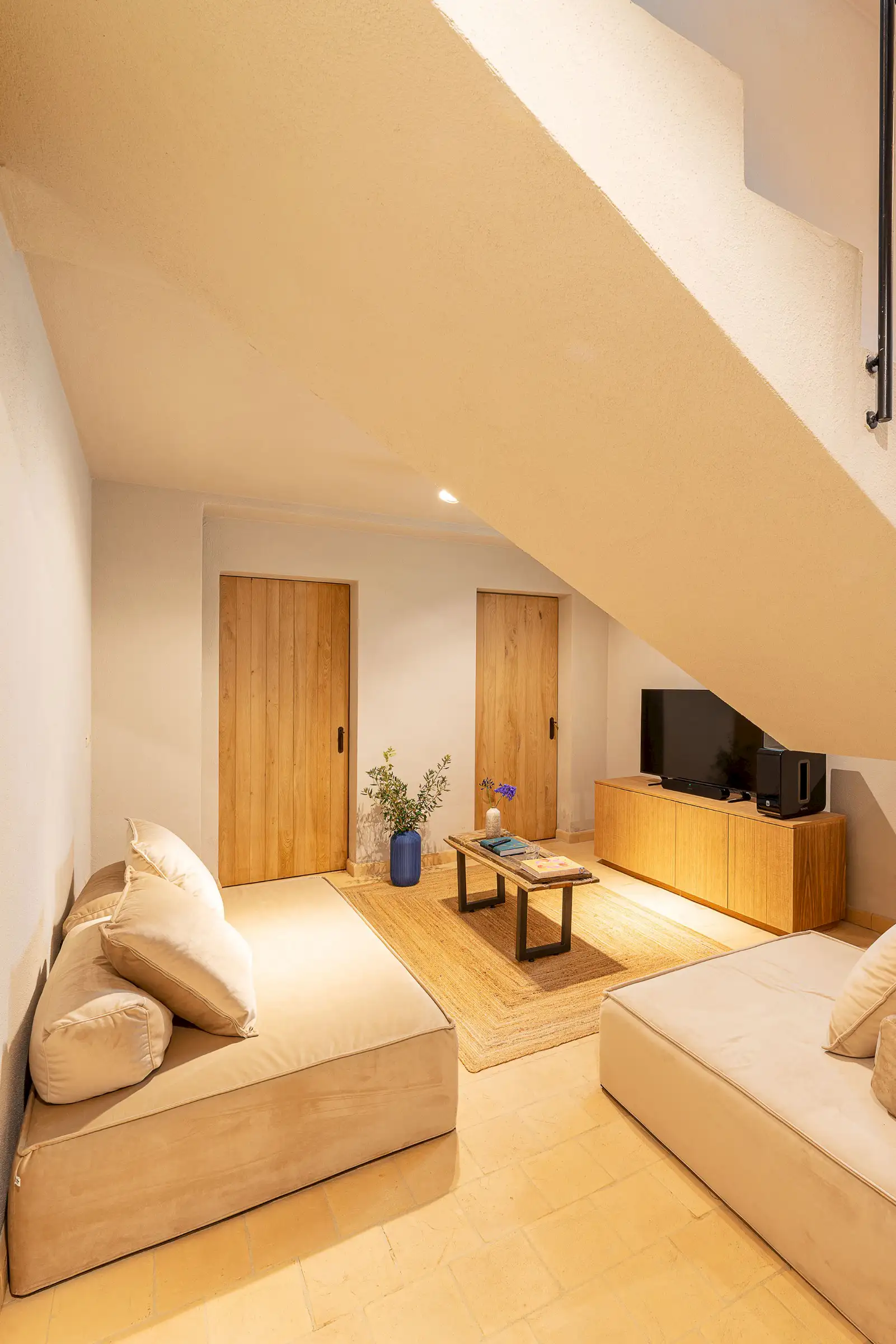 The entire living space is a celebration of natural materials, colours and handcrafted techniques, reflecting the beauty of the property’s location. The modern fireplace is on a bench, creating a stylish fender, while the handcrafted metal banister nods to the agricultural origins of the property. The smooth resin staircase is a joyful piece of functional sculpture and there is plenty of space in which guests can gather, relax or party. On the lower ground floor there is a large TV room that is ideal for children to use as a playroom.