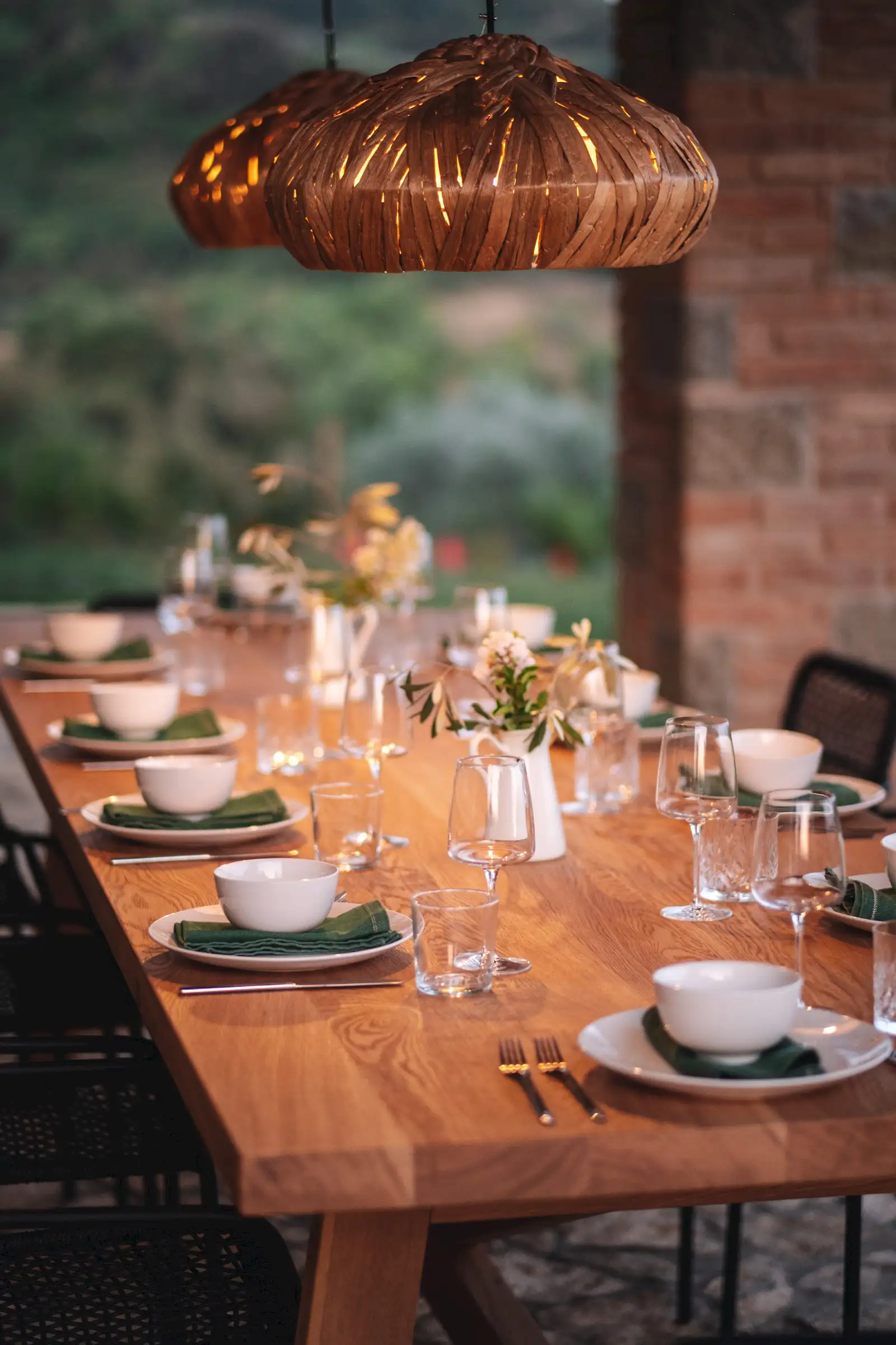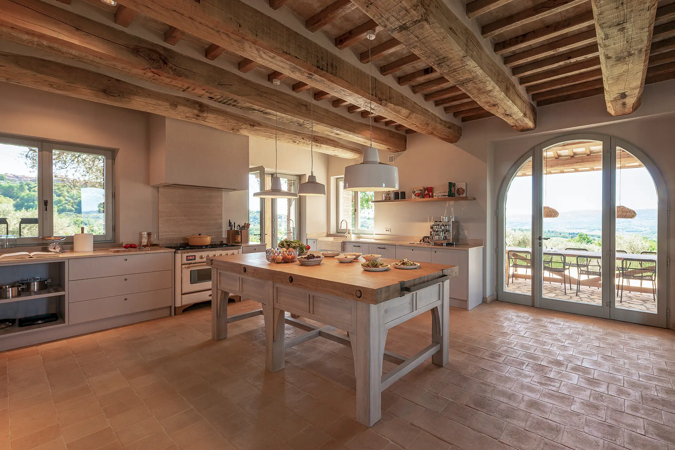The modern farmhouse kitchen has, like the rest of the house, handmade cotto floor tiles and a beamed ceiling. There is a strong focus on local, natural materials, such as the large wooden, freestanding island, the marble sink with brass taps, and the worktop made from smooth travertino di San Casciano. Meanwhile, the island pendants by Karman marry form and function in a sleek design. Open to the living and dining areas, the kitchen is expertly equipped with a large double oven by Ilve and, for ease, two dishwashers and two fridges.
