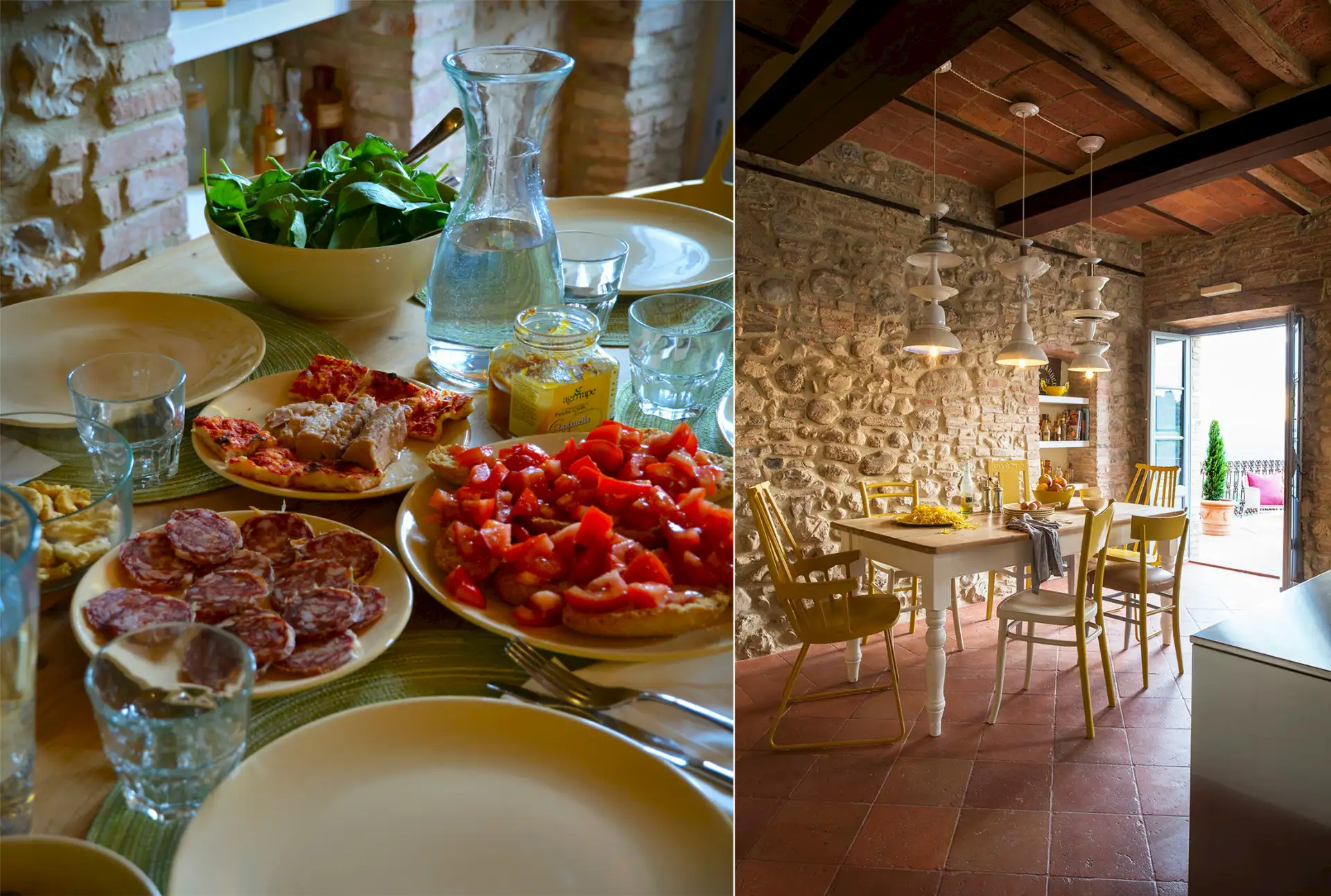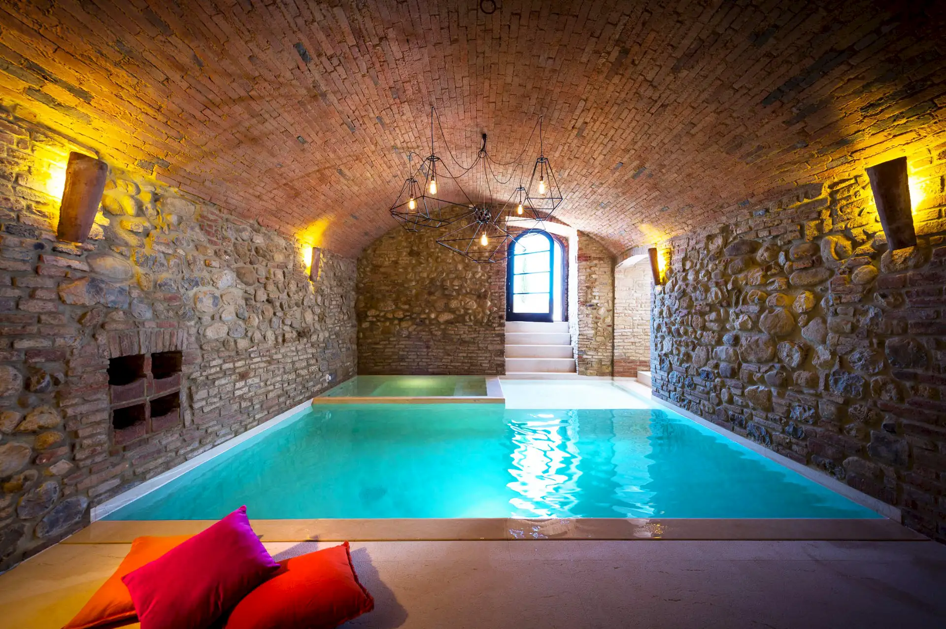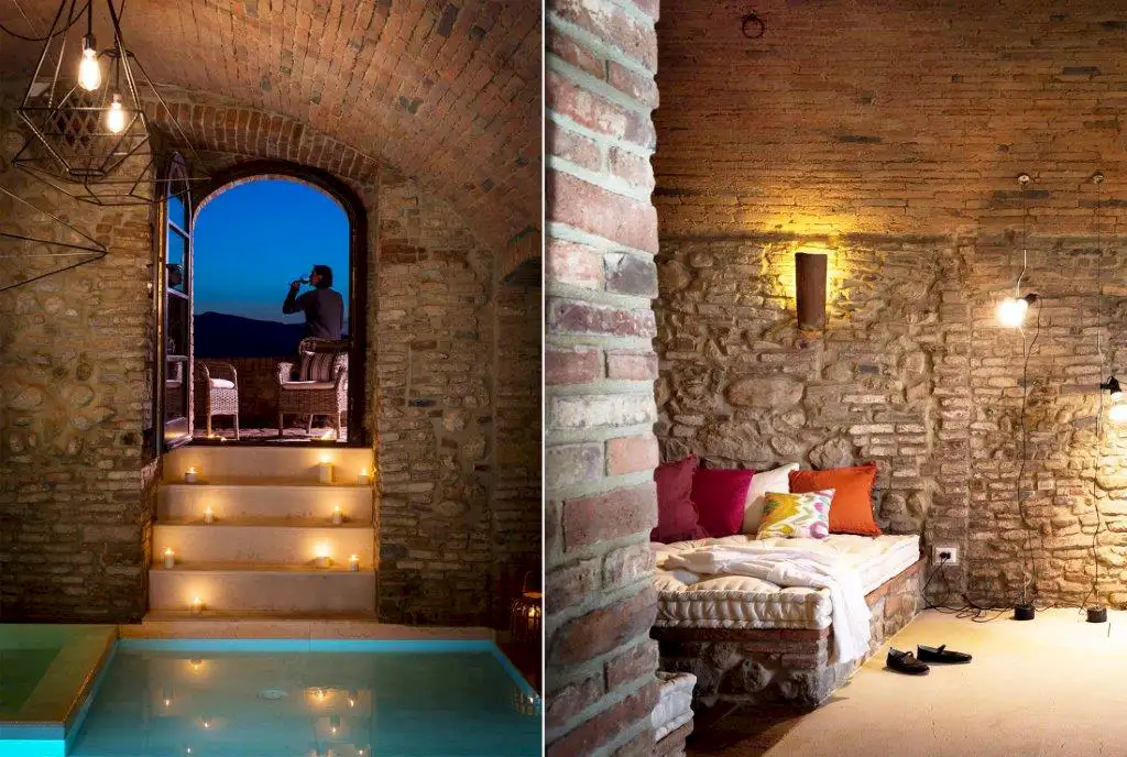 Monteleone14 has been a restoration project which was completed early May 2014. This is one of the most special places we have seen in years. This townhouse (3 bedrooms, 3 bathrooms) with private pool in the medieval cellar is a one of a kind property. This house, which was owned by a noble family is all frescoed and was restored in detail in the last year. The interior was done in the best modern design (Flos, B&B Italia, Kartell etc) and together with the colorful, antique frescoes and old tiled floors this is in all senses unique. Here you feel part of an Umbrian town and will you experience the best views you can imagine from the spacious terrace. In the cellar a concrete pool was built in the medieval foundations of the house. The pool (heated in winter) and hottub, together with the wine cellar for guest use only makes this an experience hard to forget. The pool gives access to a small street/square which makes it also ideal for children to swim and play.