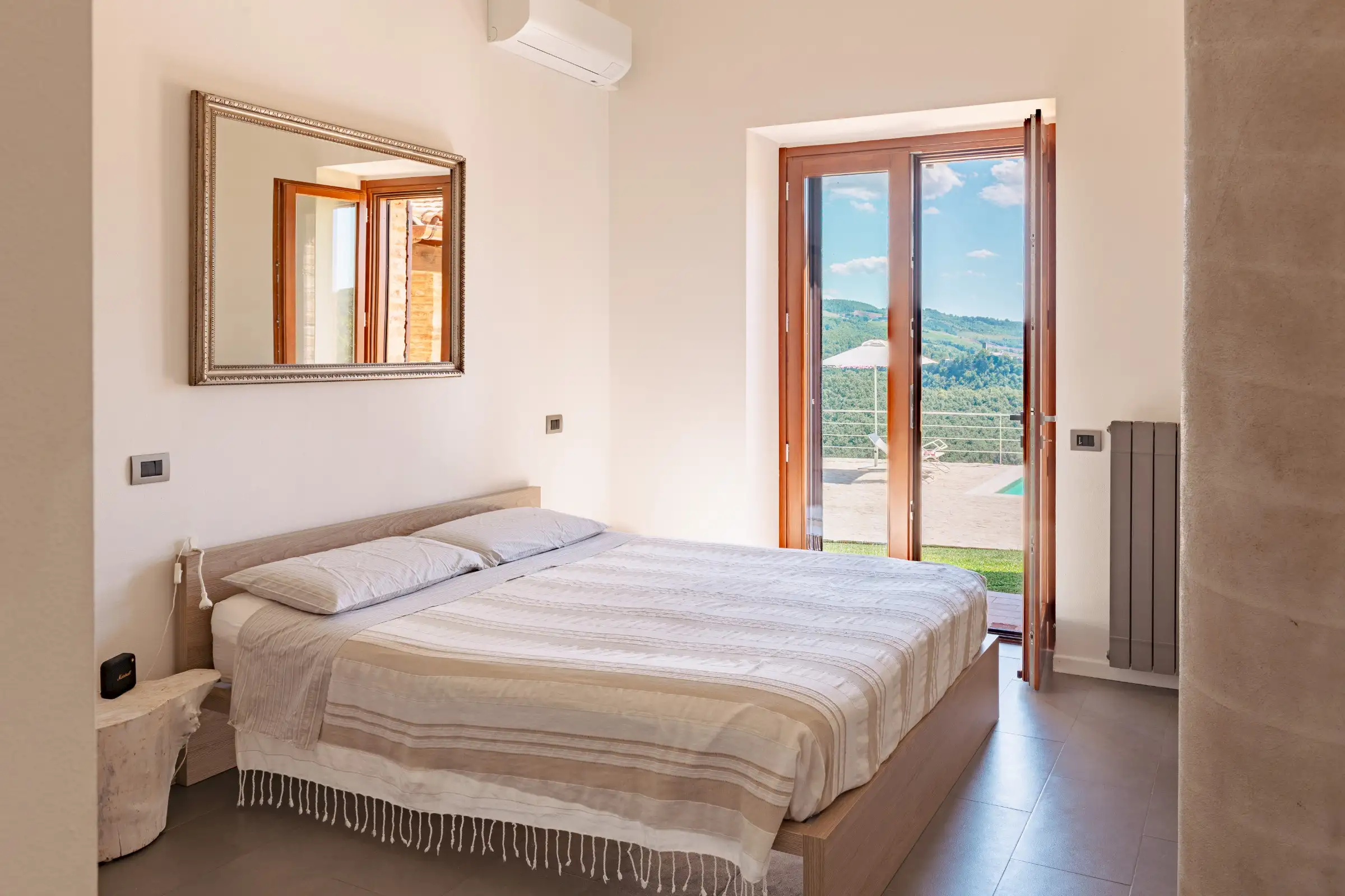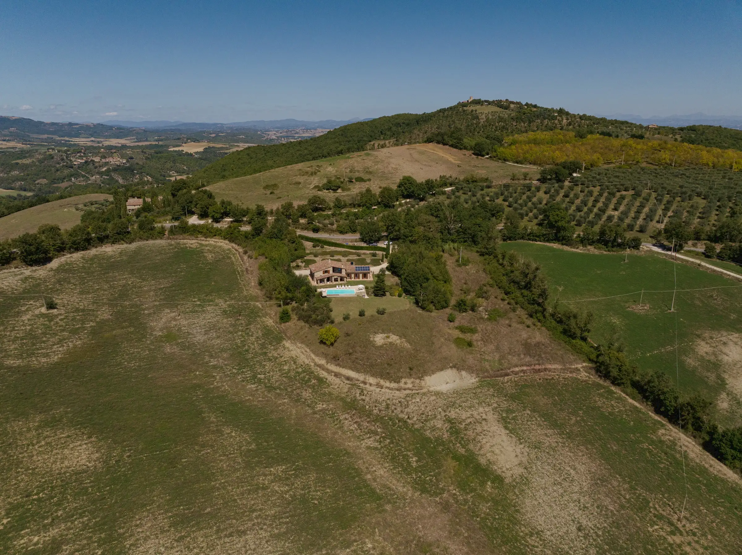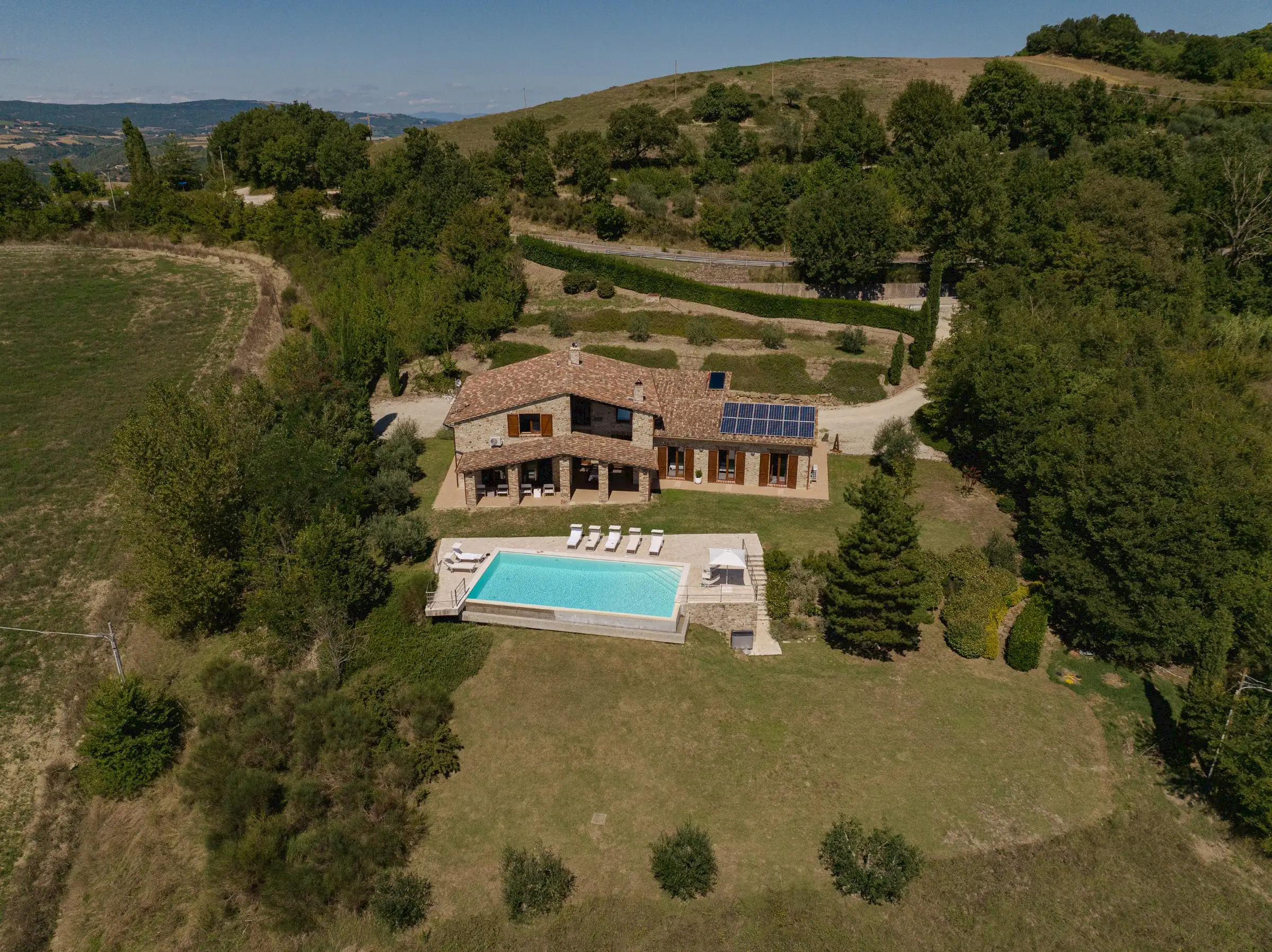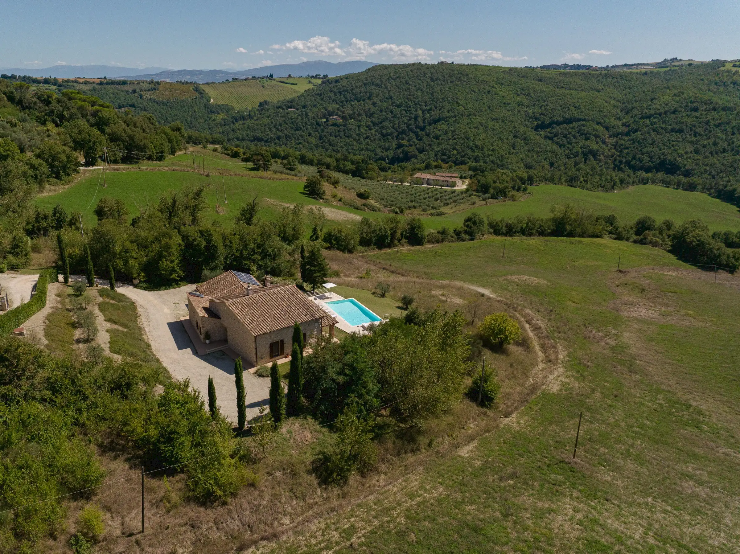 The house respects traditional Umbrian architecture while the interior, with its double-height reception room, is finished in a light, modern style. Each detail has been carefully considered and the sight lines through the property offer exceptional framed views of the surrounding landscape. Three of the bedrooms are on the ground floor with doors to the terrace, while the principal suite is on the first floor.