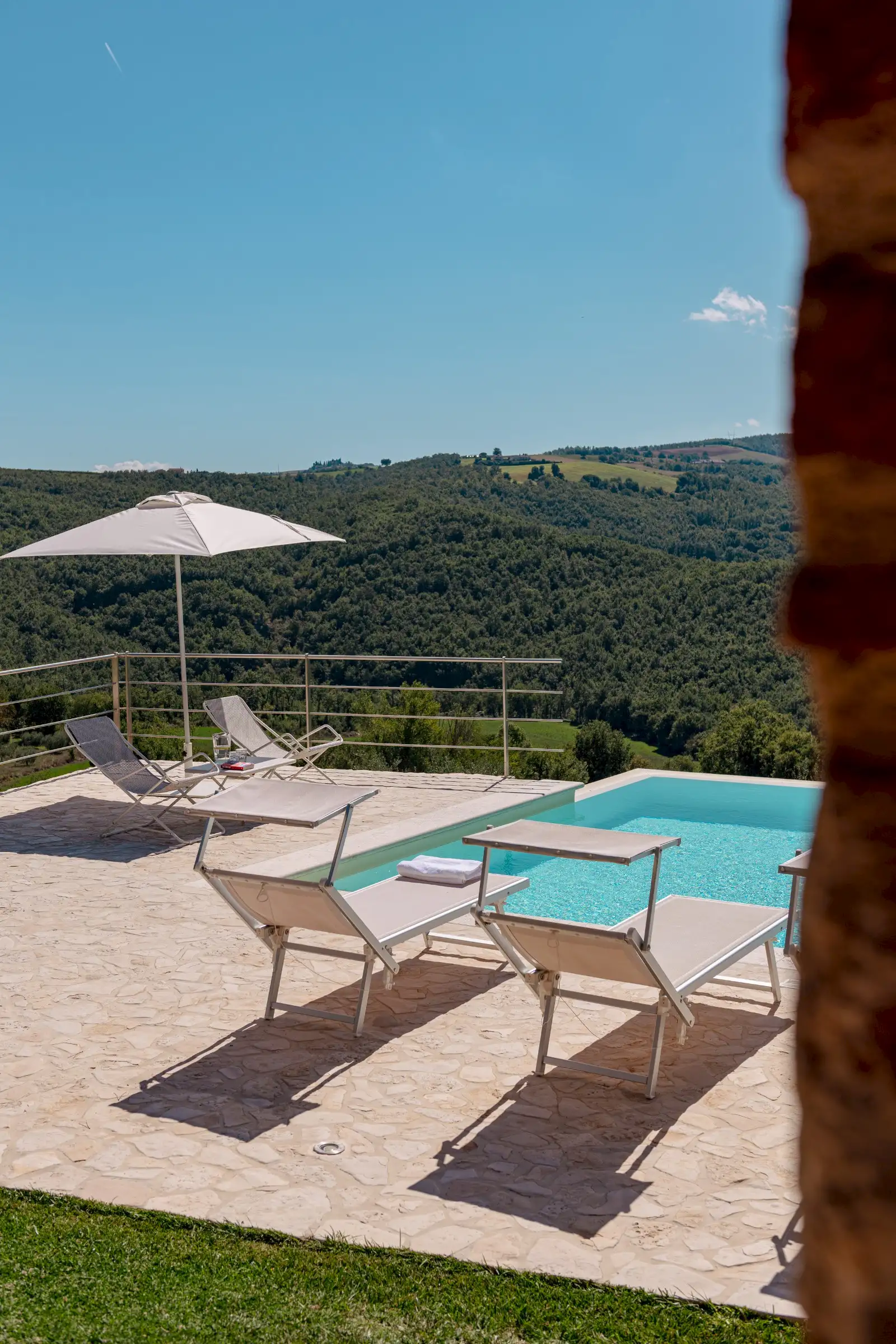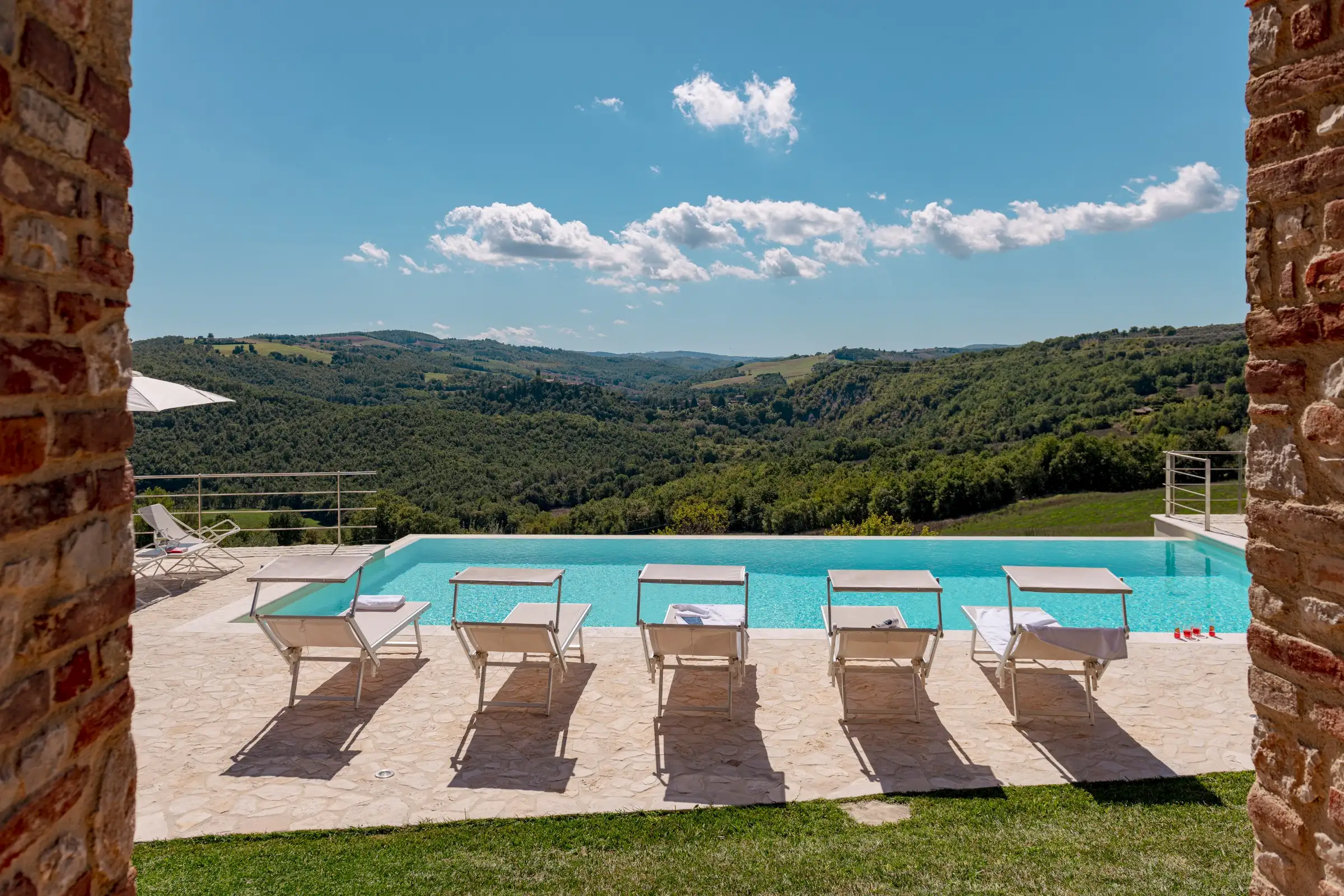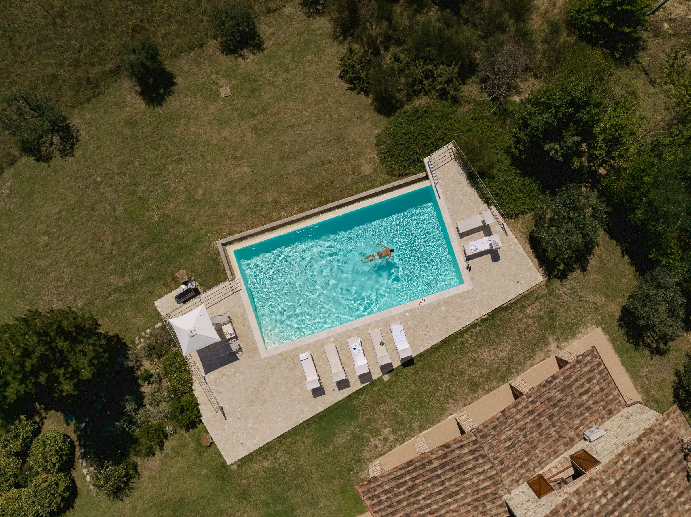 Podere Sassone is surrounded by olive groves, woodland and rolling fields. Set back from a quiet country road, the drive curls round a hedge and opens up in front of the house where there is plenty of space for parking and electric charging points. From the other side of the house, the well-maintained garden is bordered by mature trees and blends into the surrounding fields. A saltwater, heated infinity pool (5.5m x 11m) with a paved surround sits in front of the main terrace where there is a chimney with a raised fireplace for cooking. There are uninterrupted views from the sitting room, kitchen and bedrooms over the pool to the hills beyond, in the centre of which is Rotecastello, a medieval hamlet that is beautifully lit at night.