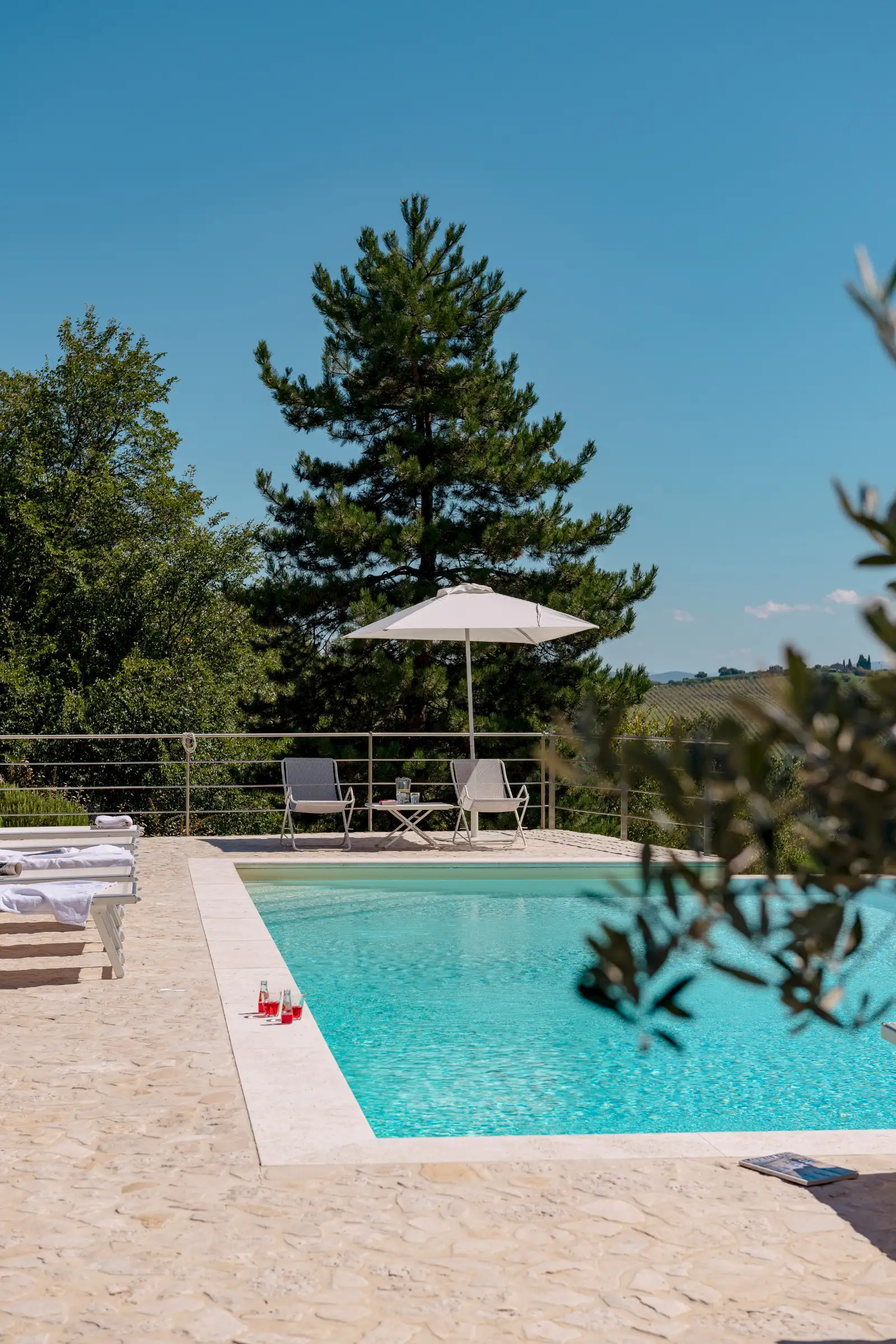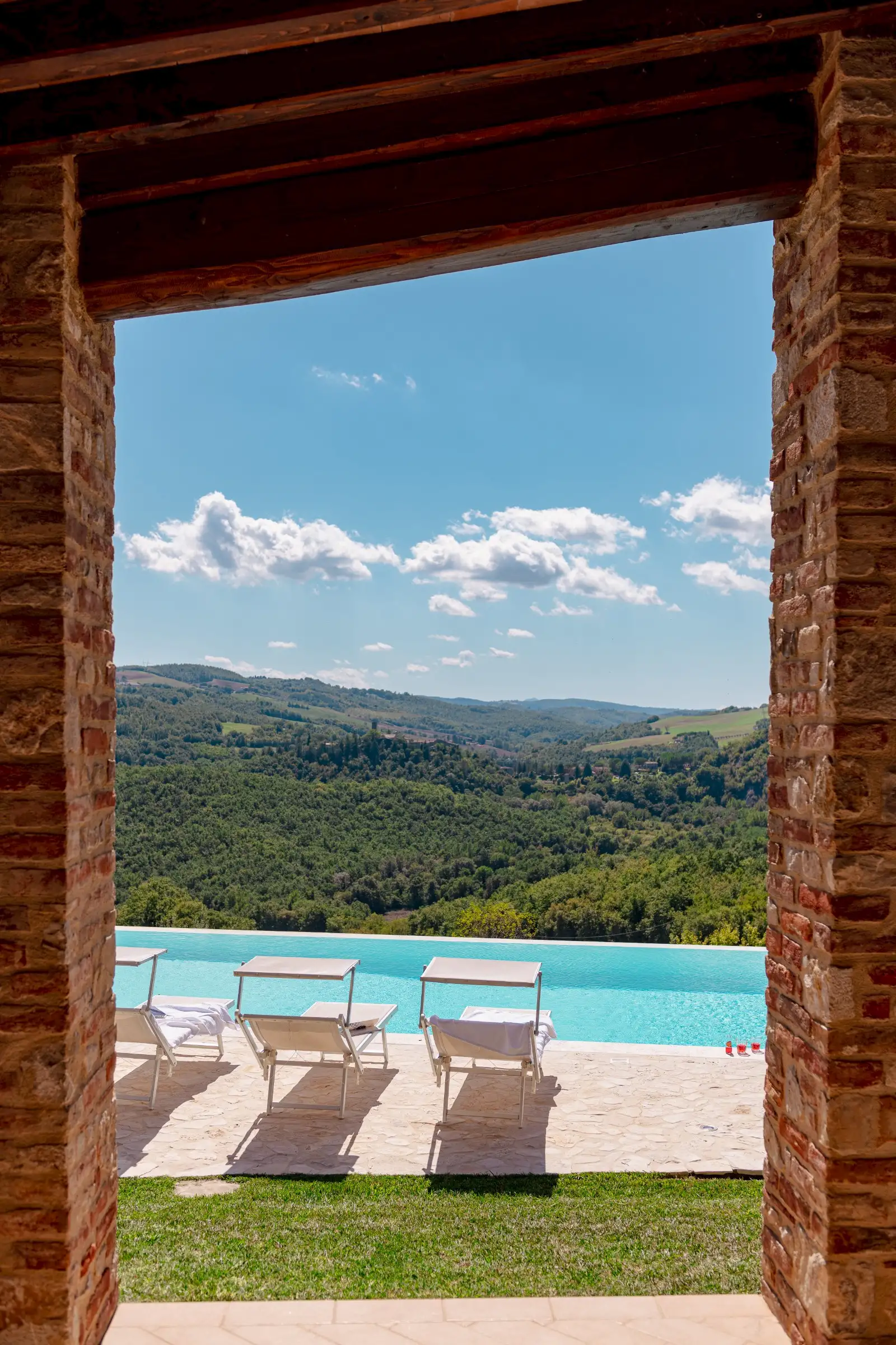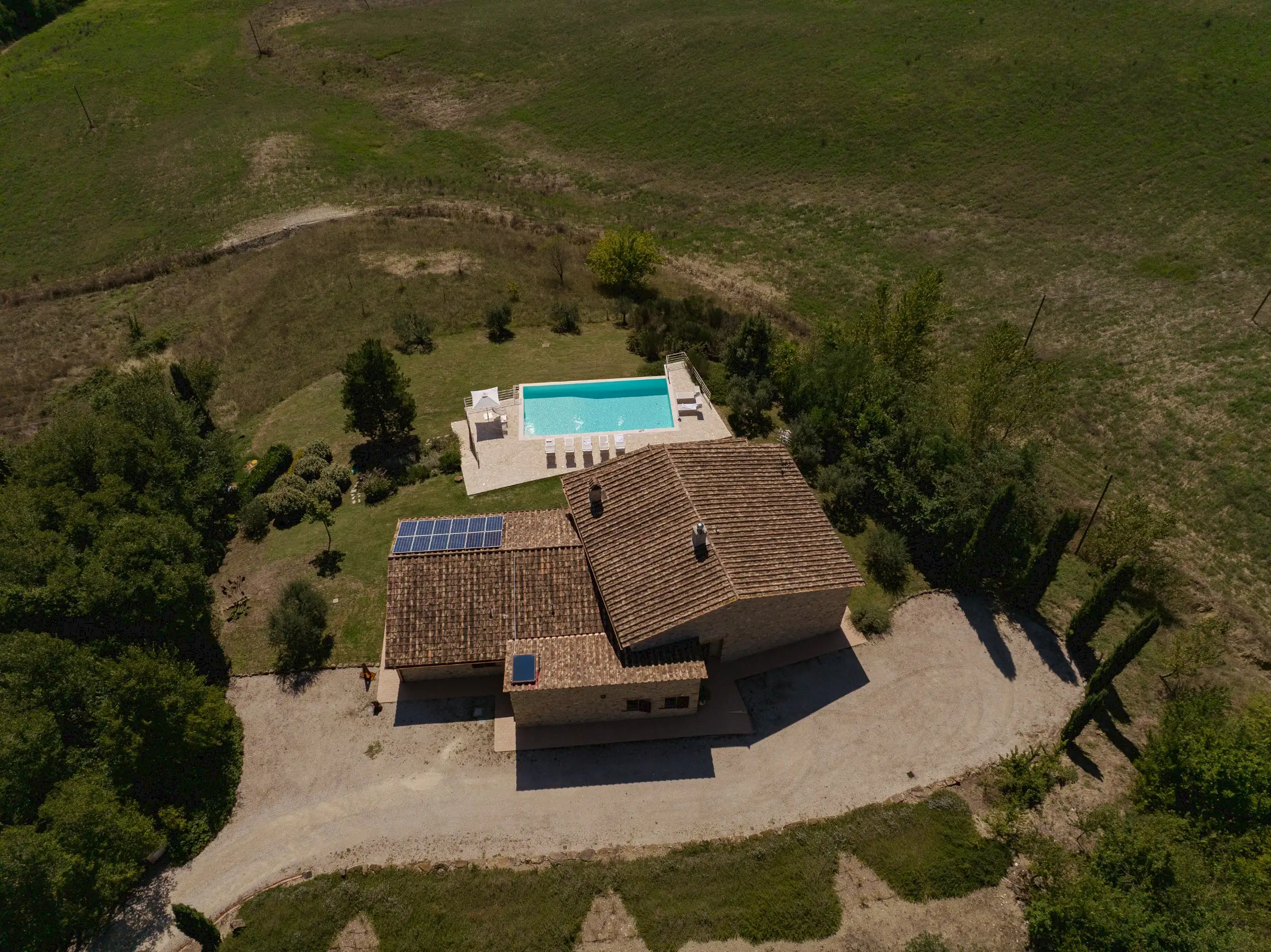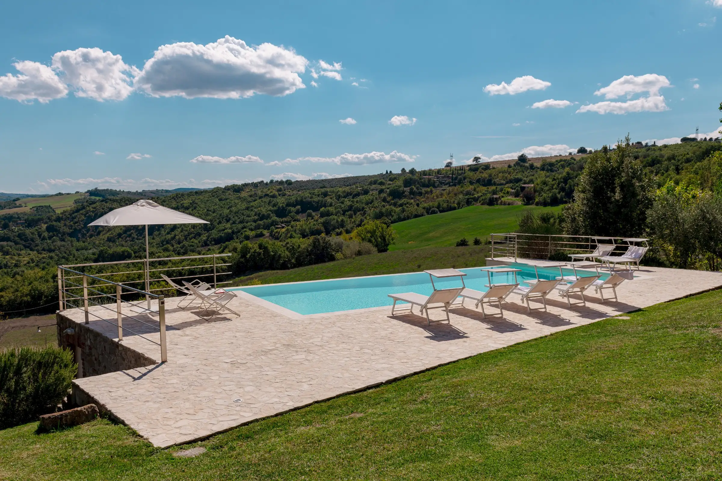 Podere Sassone is surrounded by olive groves, woodland and rolling fields. Set back from a quiet country road, the drive curls round a hedge and opens up in front of the house where there is plenty of space for parking and electric charging points. From the other side of the house, the well-maintained garden is bordered by mature trees and blends into the surrounding fields. A saltwater, heated infinity pool (5.5m x 11m) with a paved surround sits in front of the main terrace where there is a chimney with a raised fireplace for cooking. There are uninterrupted views from the sitting room, kitchen and bedrooms over the pool to the hills beyond, in the centre of which is Rotecastello, a medieval hamlet that is beautifully lit at night.