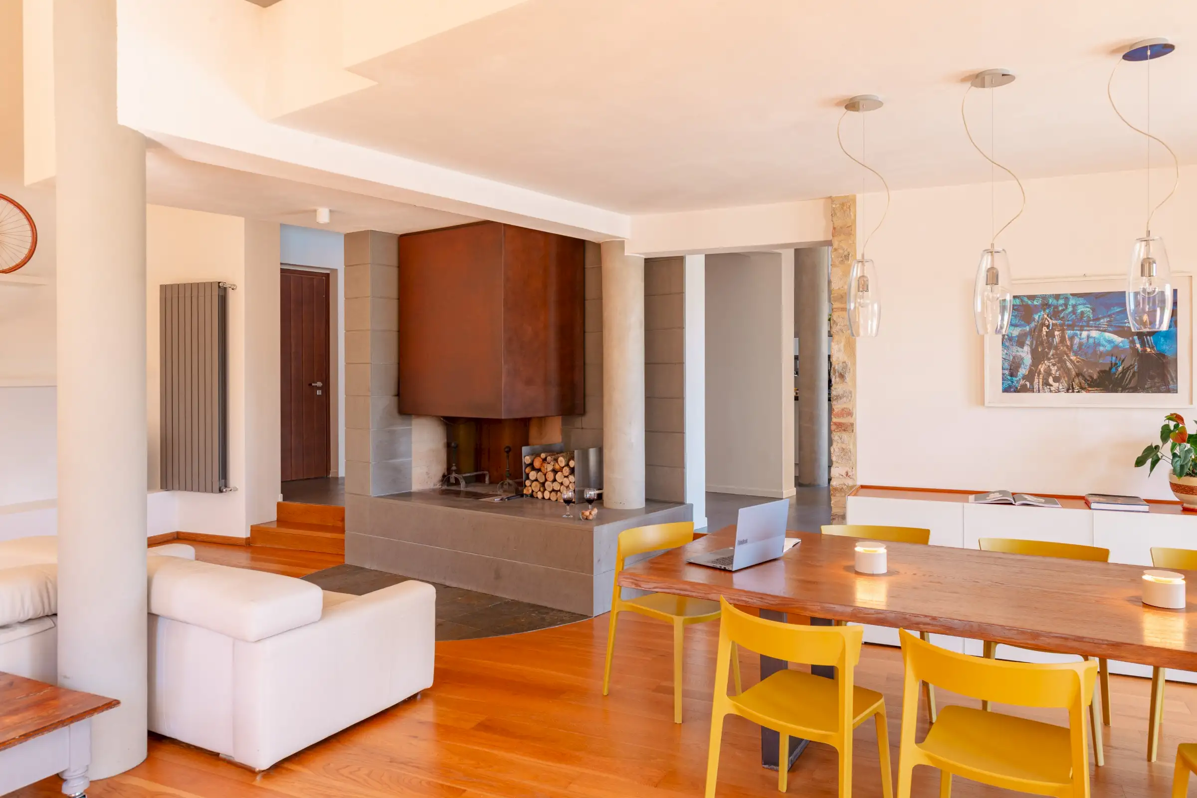 The open-plan sitting and dining room are connected to the kitchen. Part double-height, the modern design includes a large corner fireplace that can also be used to cook on in the colder months. There's a wide-screen TV and a Sonos Music system. The large dining table is made of reclaimed wood from the former farm that was on the site.