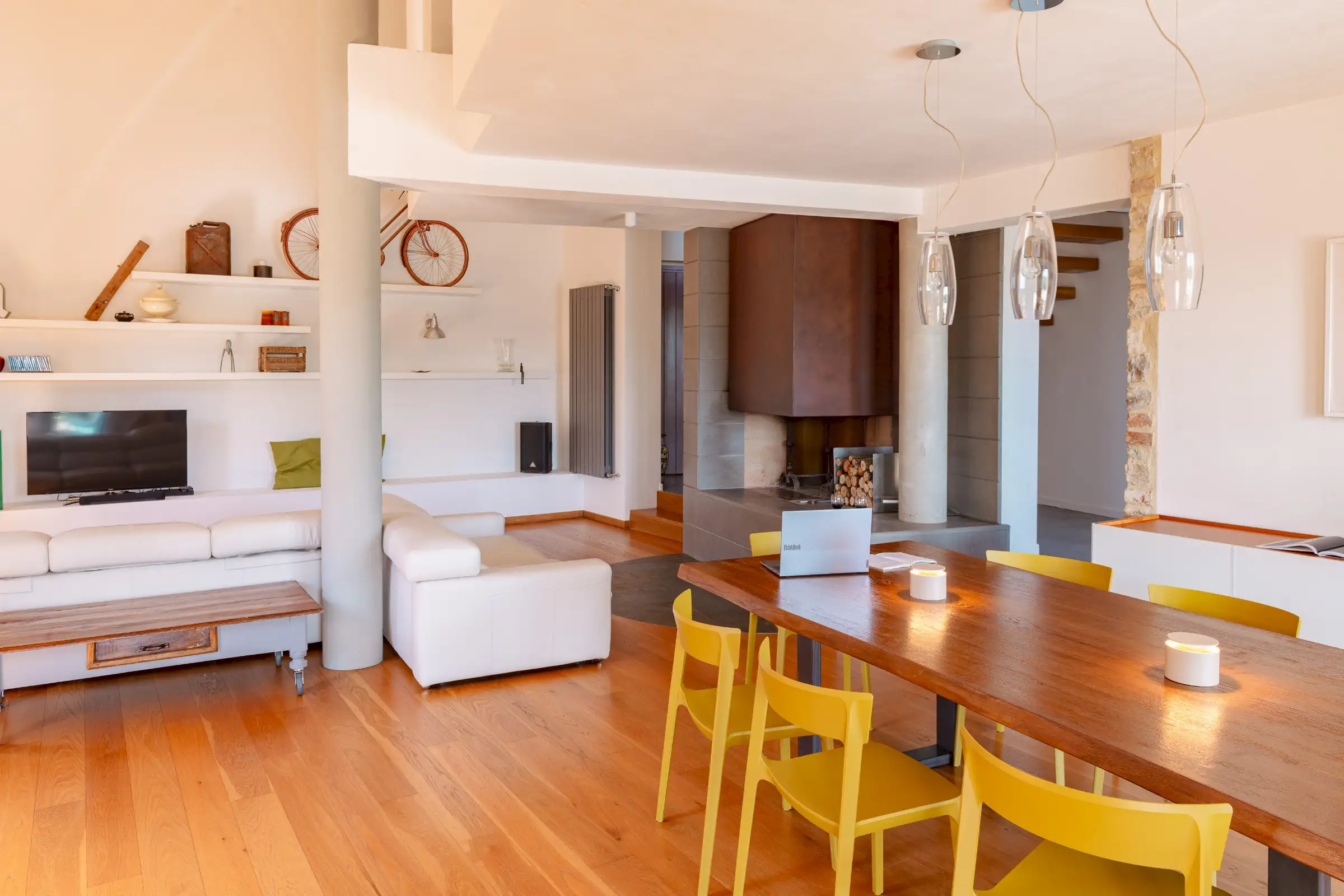 The modern-style kitchen is on the ground floor and has double doors out to the veranda. Expertly equipped - there's even a professional slicing machine - there is lots of cupboard space and a central island that houses the gas hob. There is a chimney on the veranda which includes an open oven, perfect for roasts.