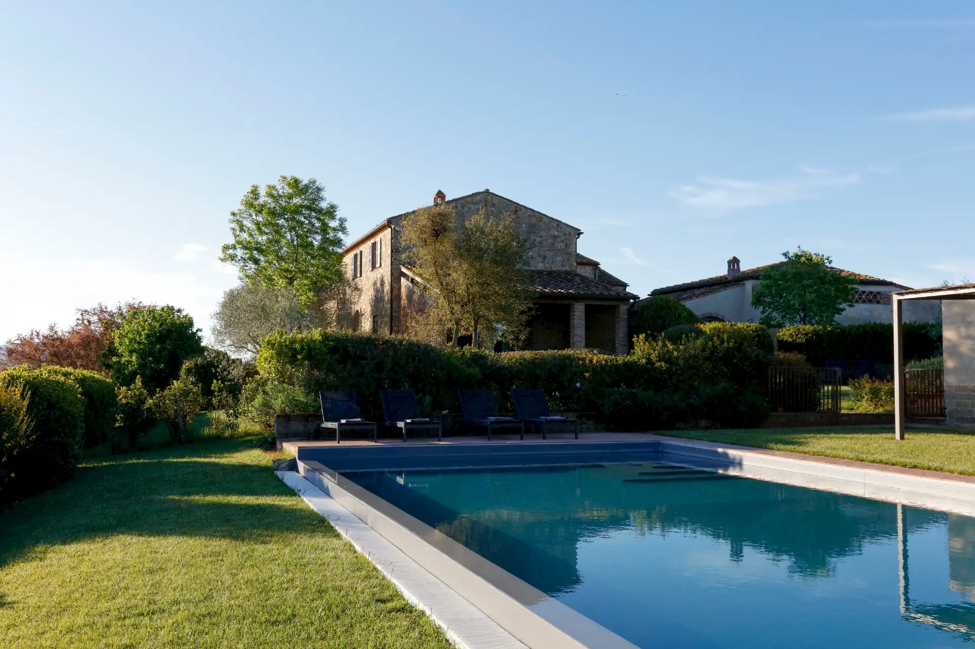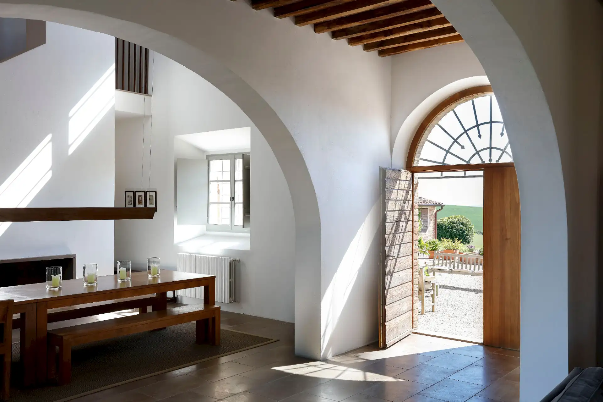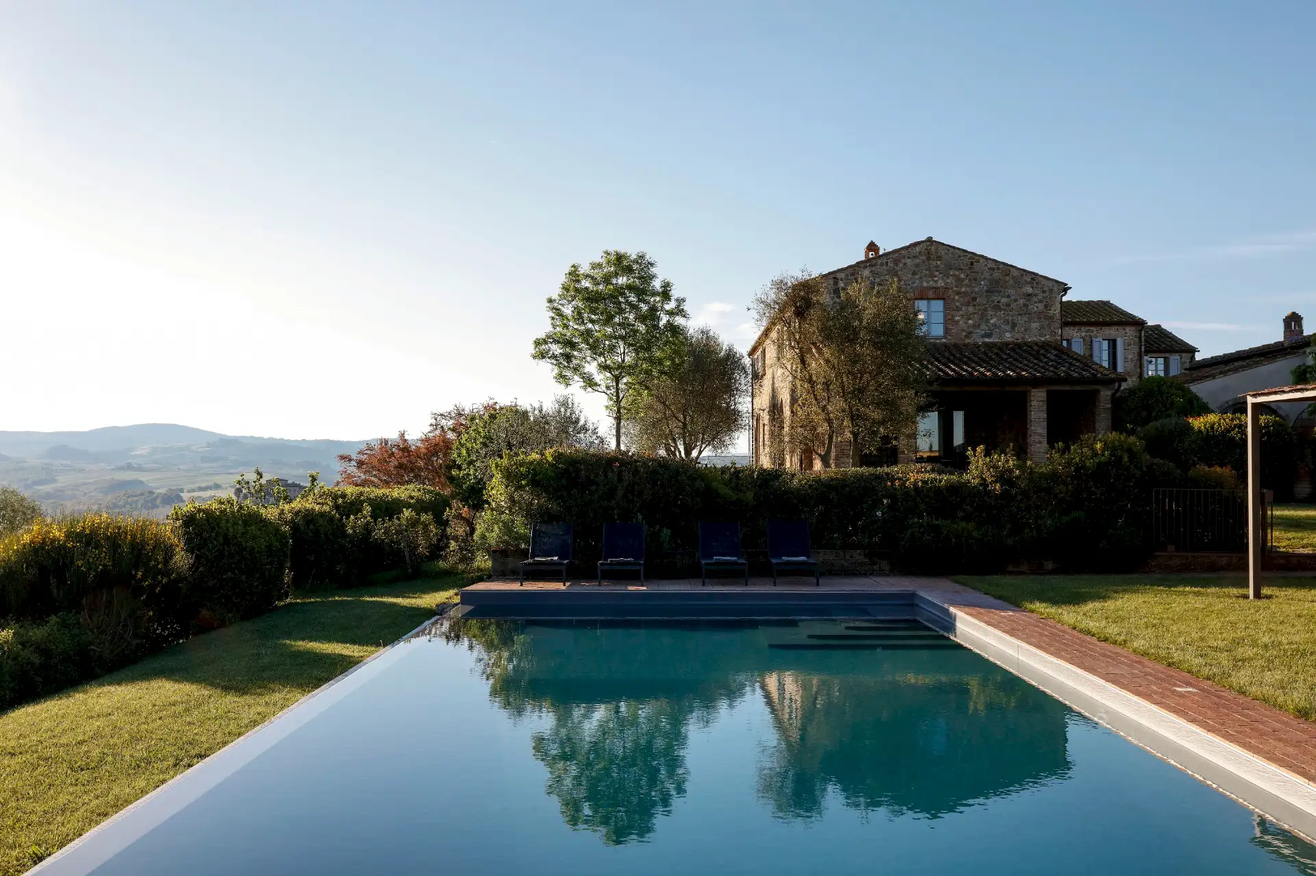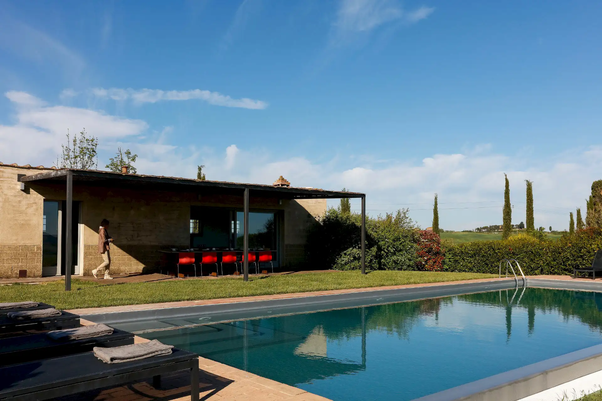 Villa D'Orcia is an old farm for 22 guests, located in the heart of Tuscany near Asciano. Dating back from the middle of the 19th century, it was abandoned in the fifties and remained a ruin until 2002. The farm was reconstructed in the original rural Tuscan style found in the ”Crete Senesi” area, and offers the opportunity to spend dream holidays. The luxurious interior of minimalist architecture perfectly matches the simplicity of the old Tuscan farm style.