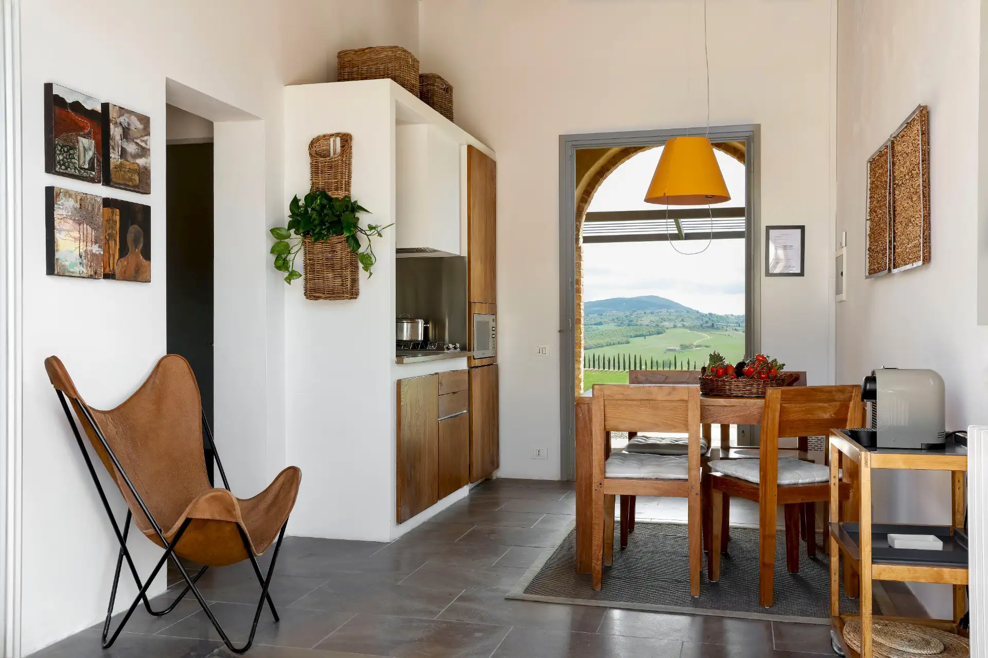 Una Giornata Particolare is perfect for two people. It is located on the first floor and offers a splendid view towards Pienza. It is equipped with a small kitchen, a bedroom and a bathroom. The surface is 30 m².