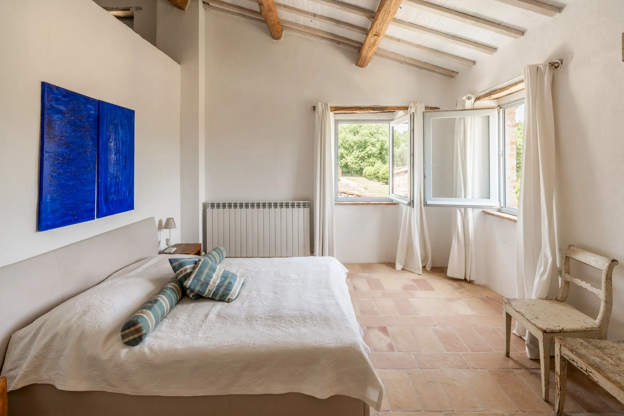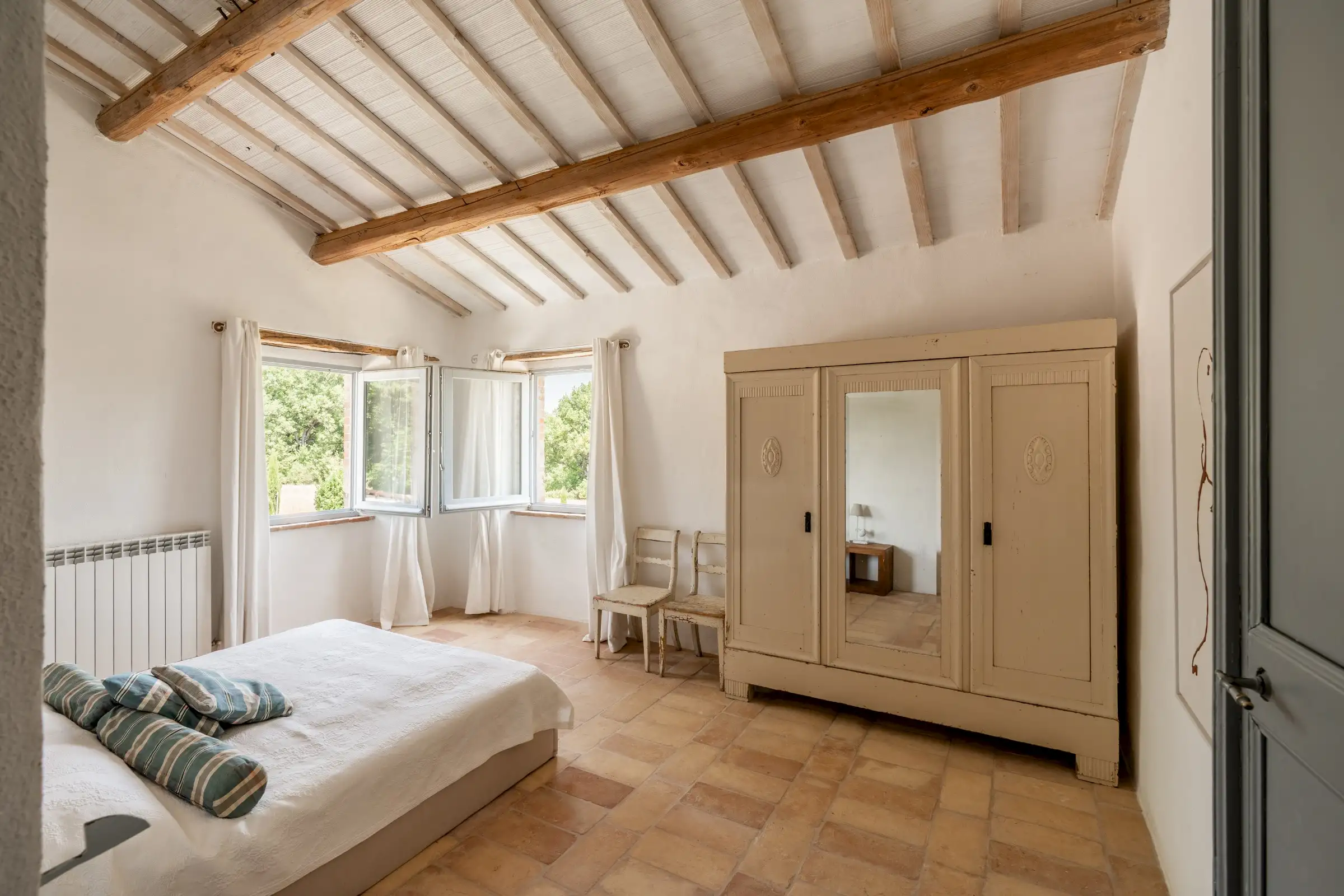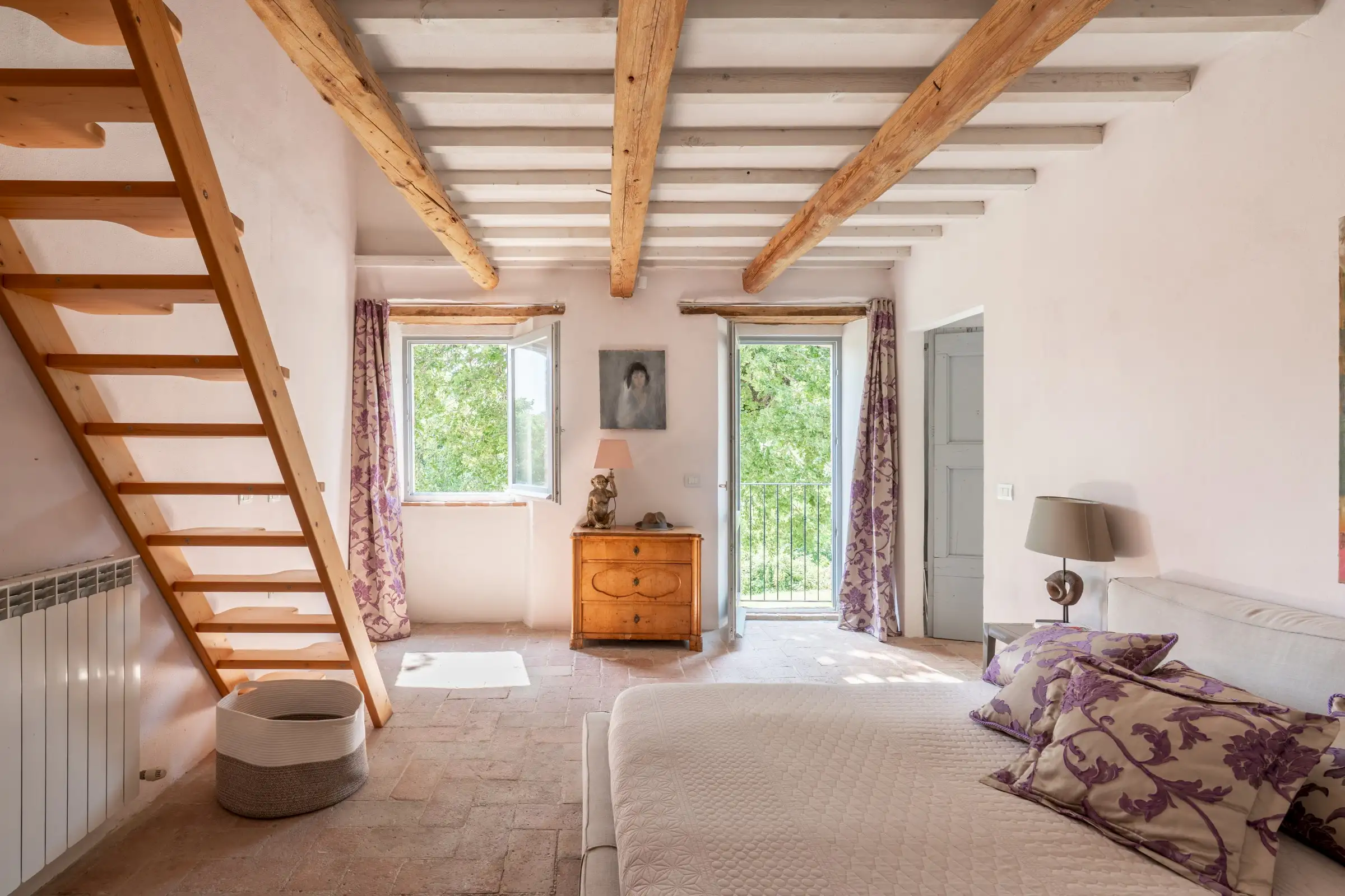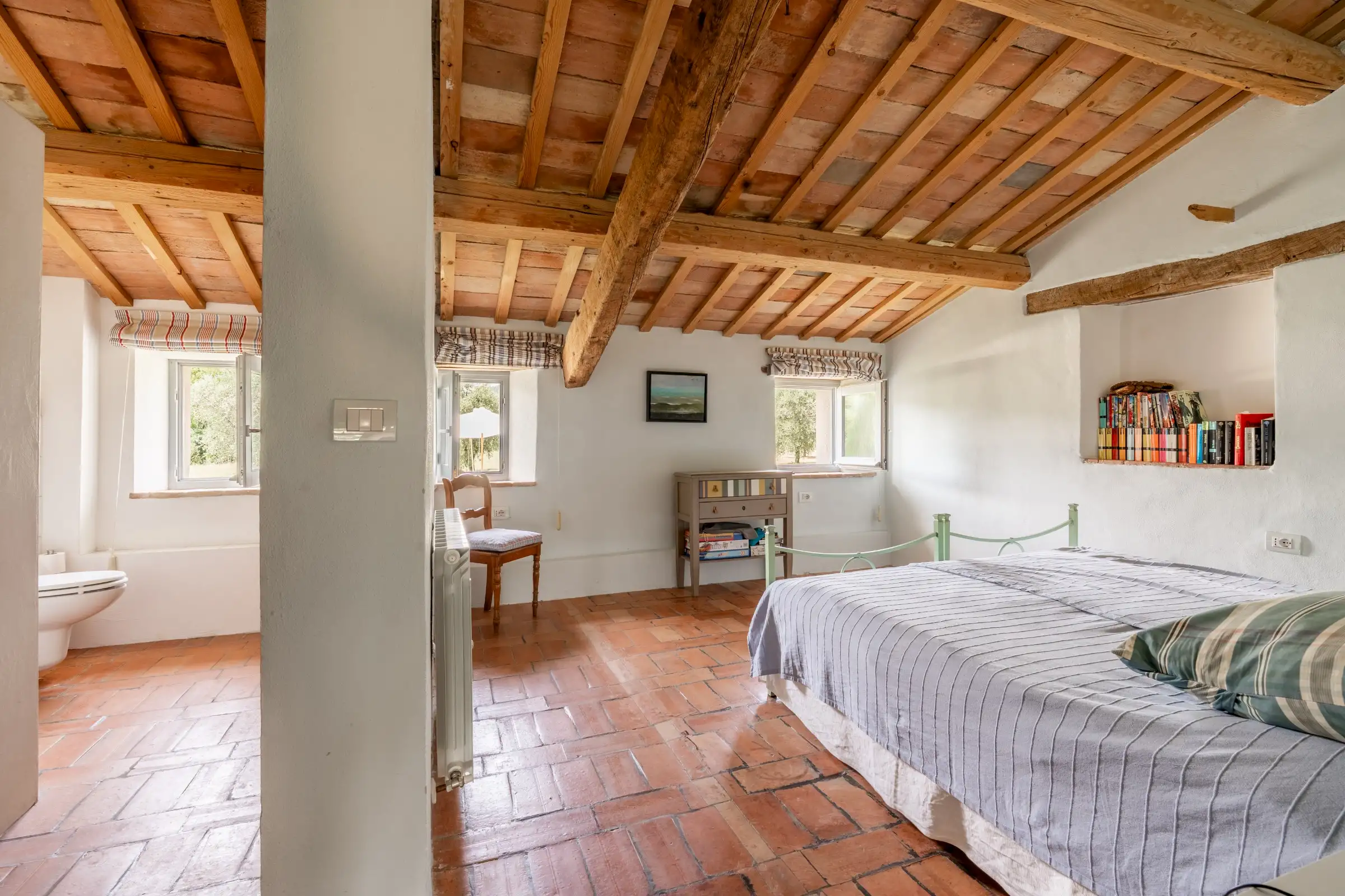 Each of the seven double en-suite bedrooms is traditionally decorated with simple white walls, cotto floor tiles and wooden ceiling beams. The principal bedroom has a door to a Juliet balcony and steep wooden stairs up to a loft room that is currently used for yoga.