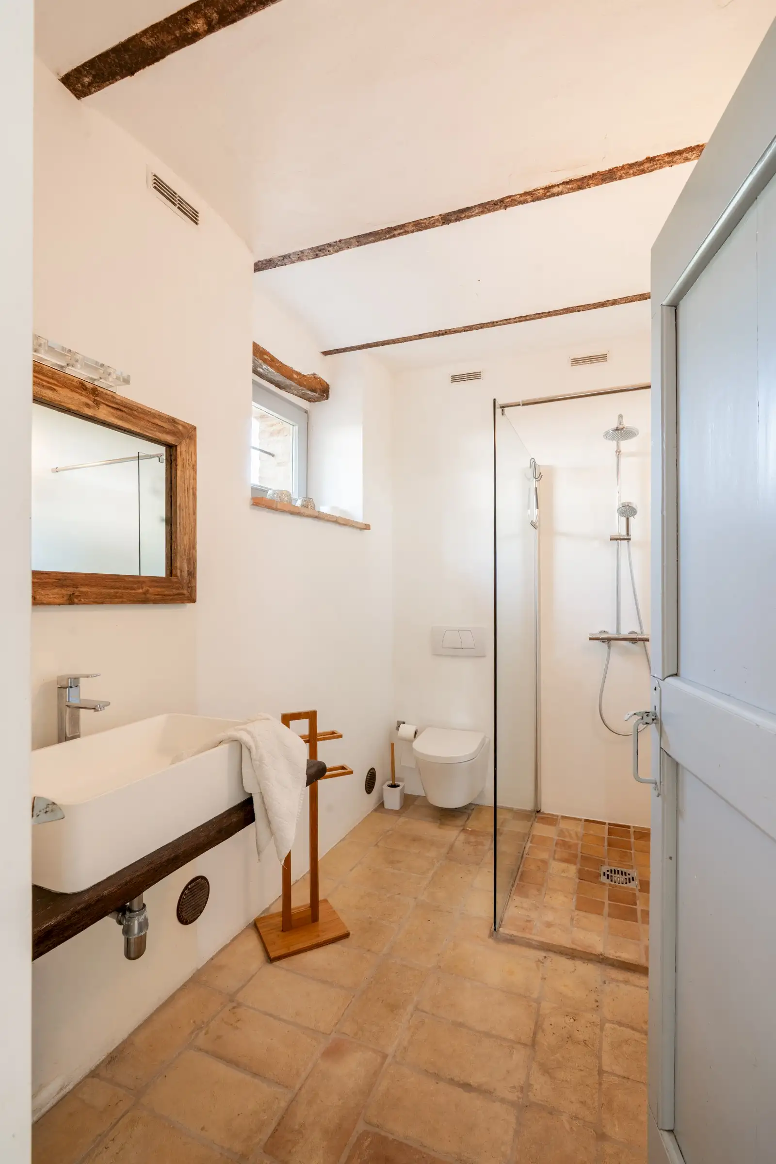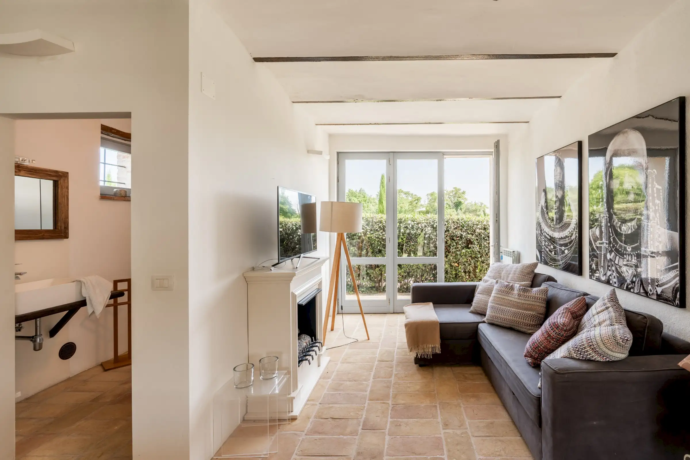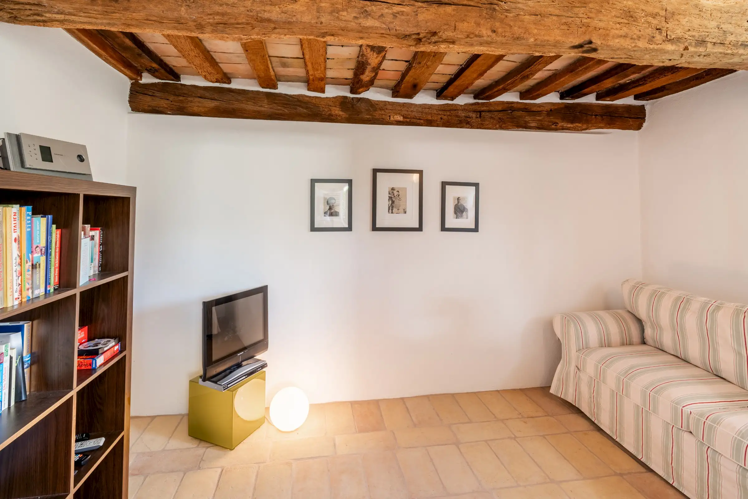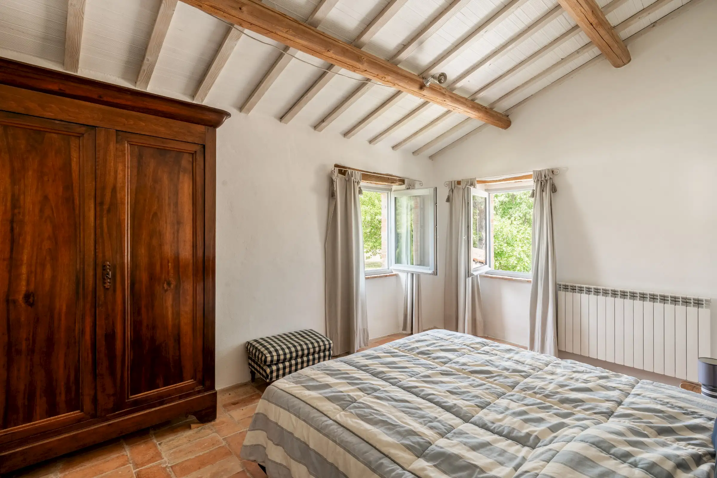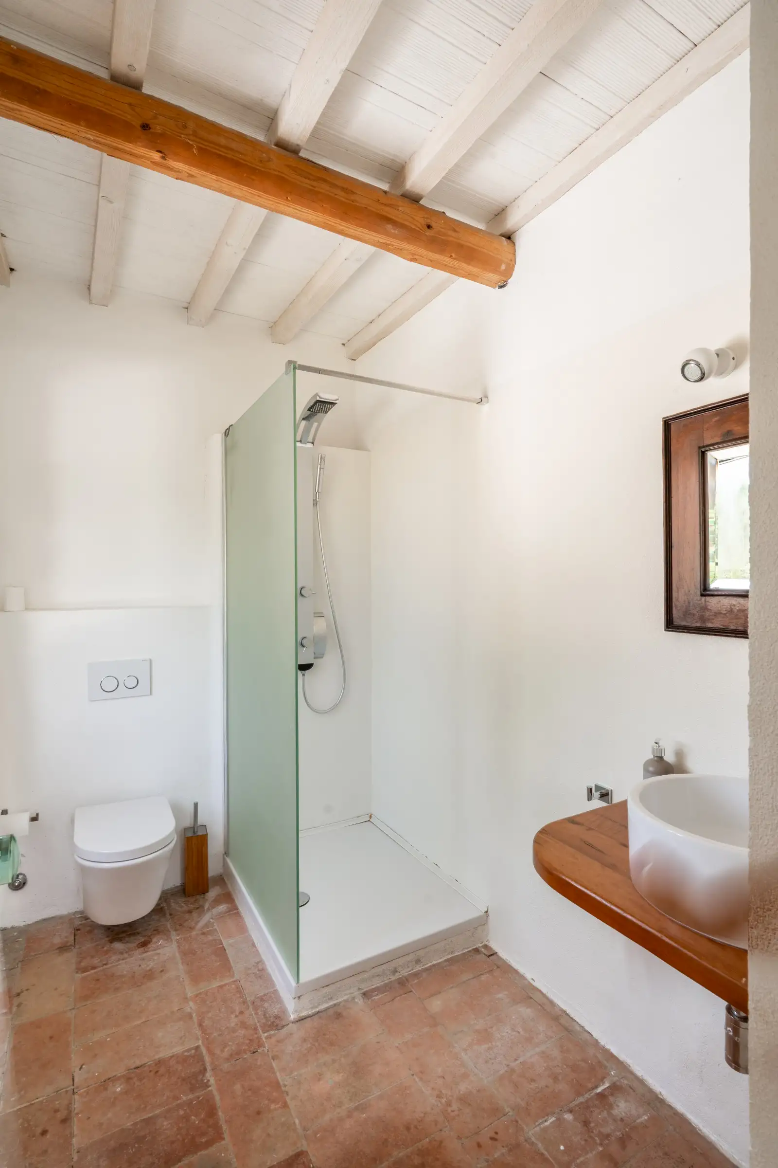 Each of the seven double en-suite bedrooms is traditionally decorated with simple white walls, cotto floor tiles and wooden ceiling beams. The principal bedroom has a door to a Juliet balcony and steep wooden stairs up to a loft room that is currently used for yoga.