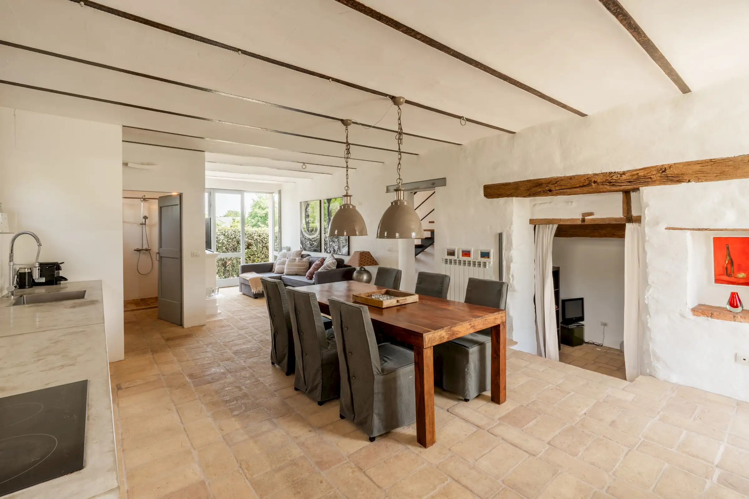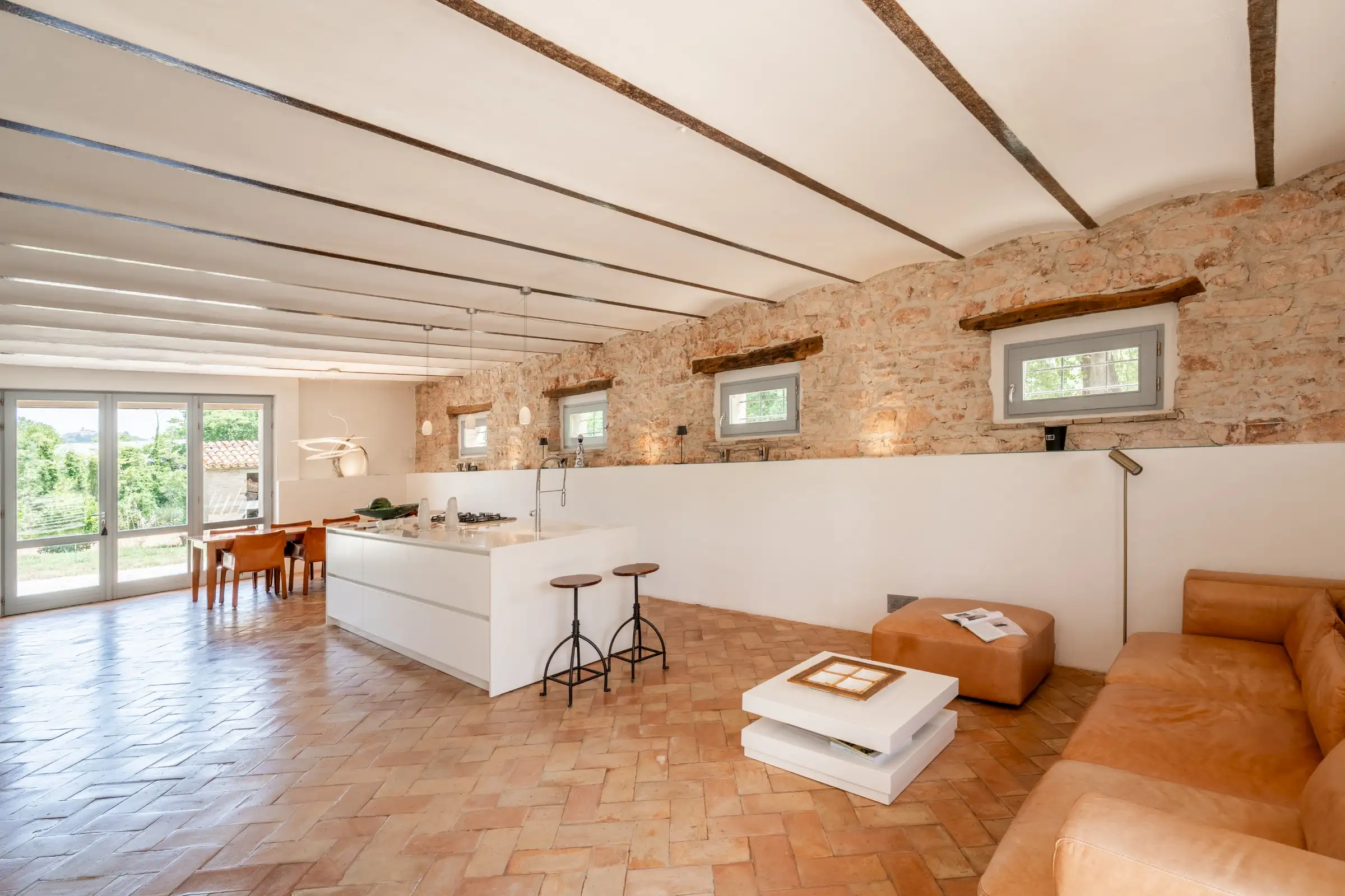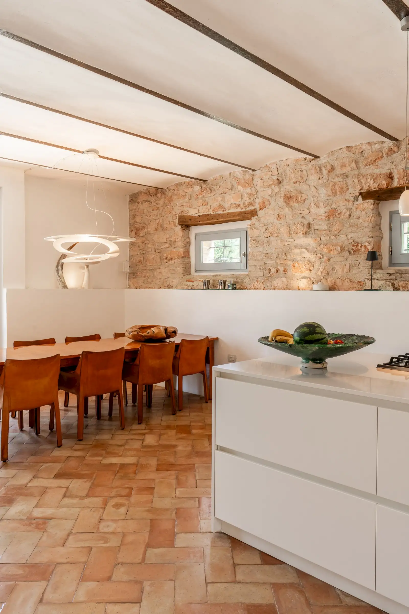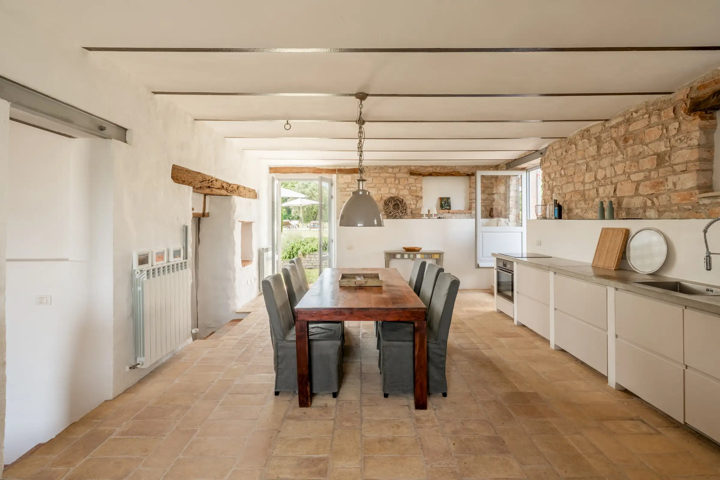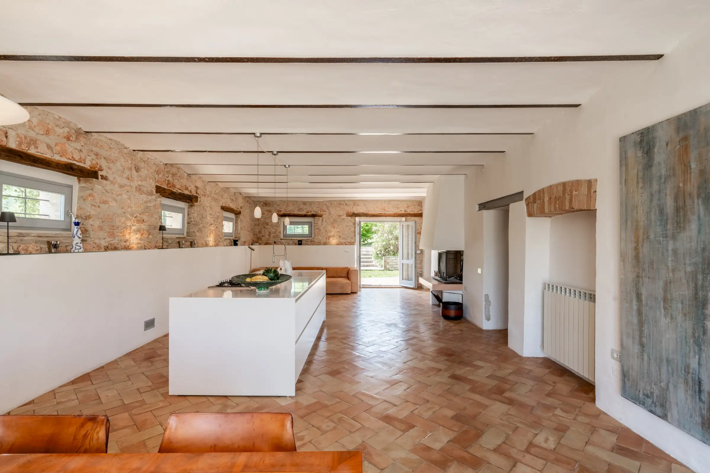 The kitchen in the main house was once the stables and still retains the original multi-arched ceiling, stone walls and high-up rectangular windows. A cotto floor and a fireplace are complemented by a modern, sleek white island. It’s a big space with a door to the garden at either end and room for a large dining table as well as a sitting area. The kitchen in the guest wing is similarly designed and well equipped, with a space for dining and a door to the terrace.