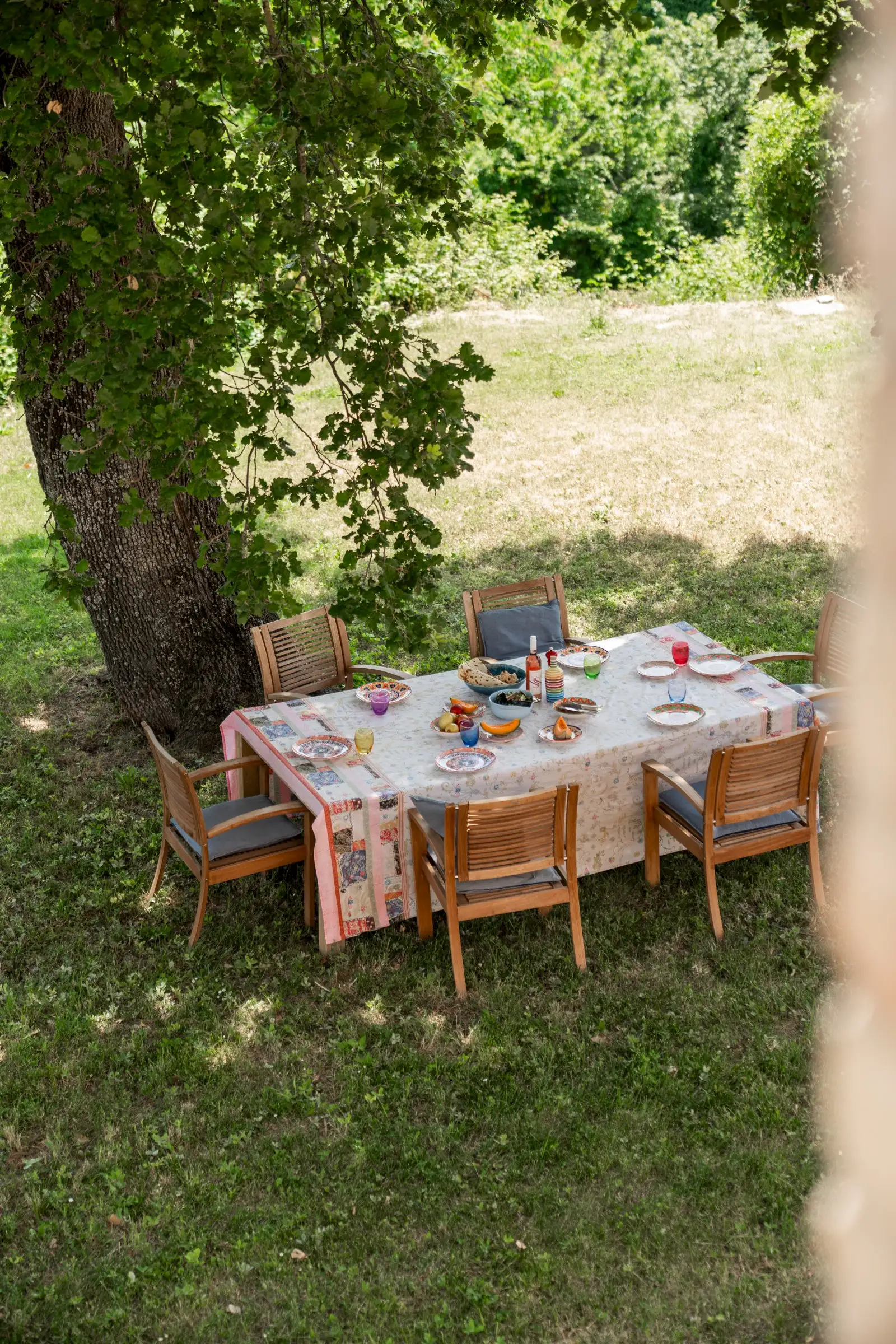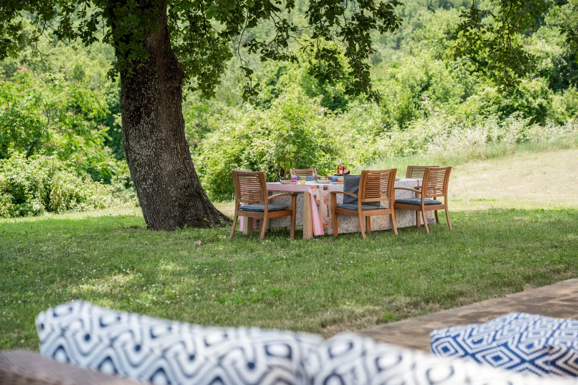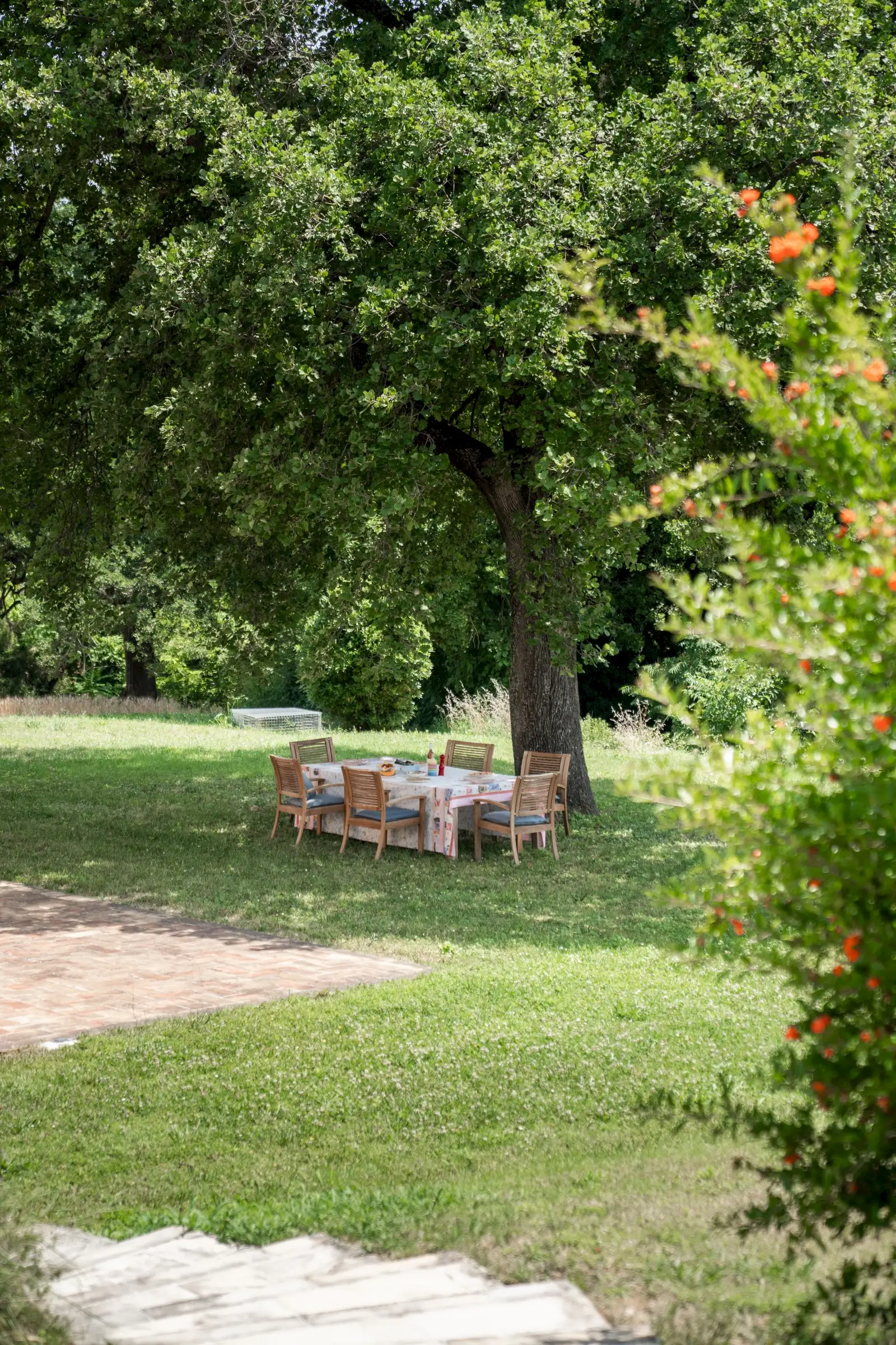Steps lead from the house up to the lovely garden, which is large, relatively flat and surrounded by mature trees. There are stunning views over woodland with a glimpse of a hilltop village in both directions. The 12m x 4m pool has a grey liner and internal steps and the paved surround is wide enough for sun loungers on either side. A magnificent oak tree offers shade in the summer and is a lovely spot for an outside dining table. The property has access to the stream below the house although currently there’s no easy way to get to it. The neighbouring field does not belong to Casa Conelle.