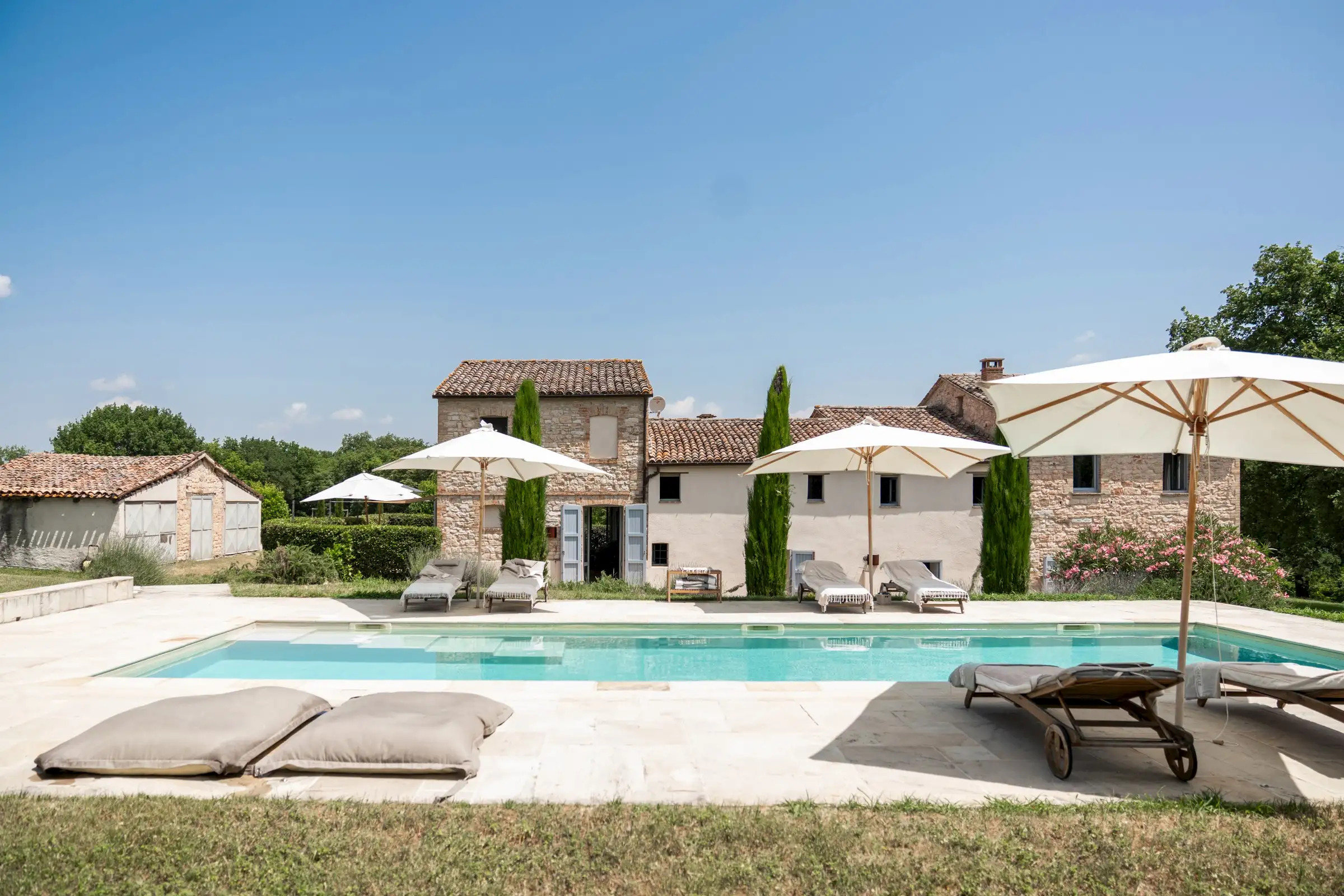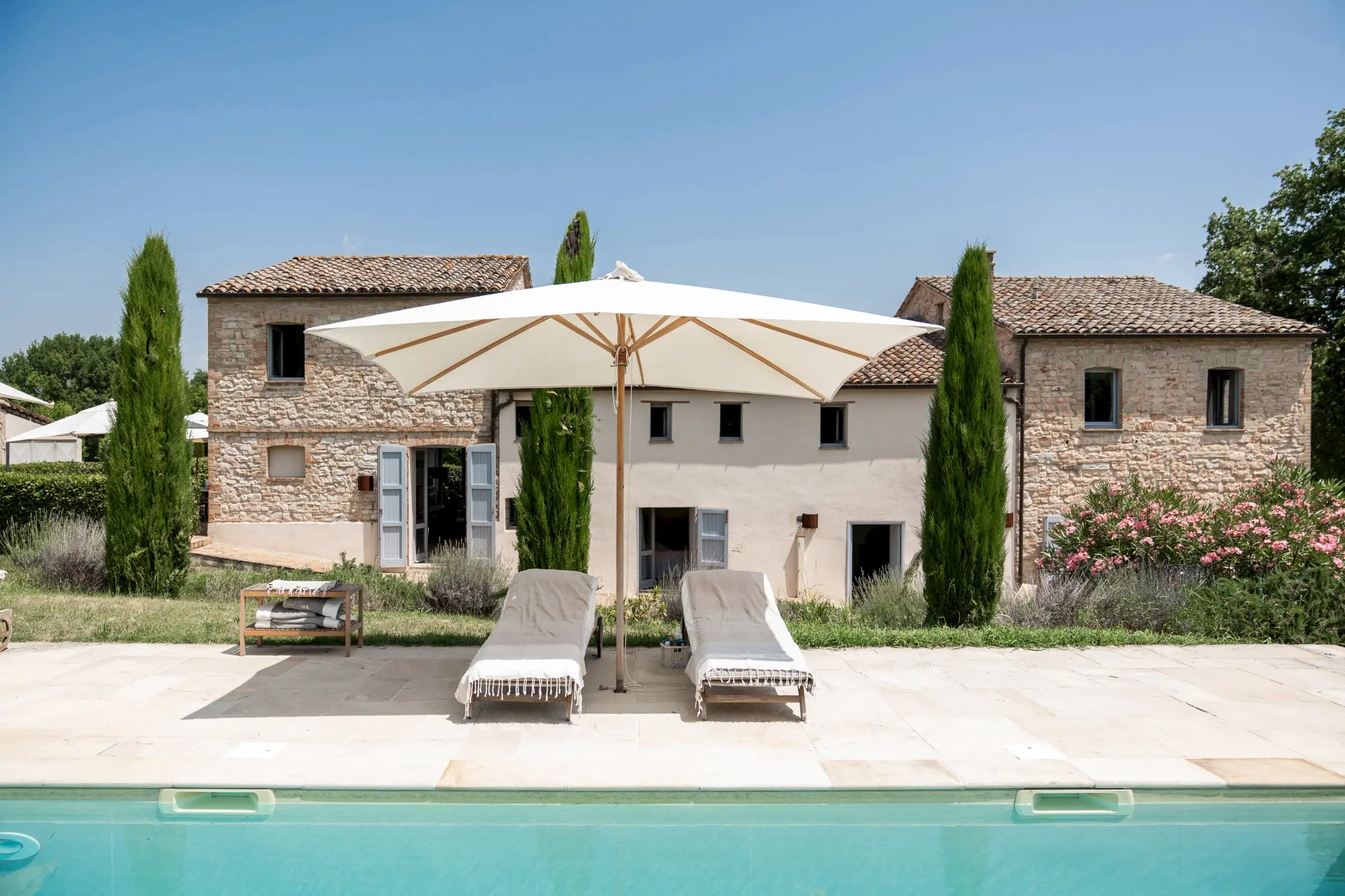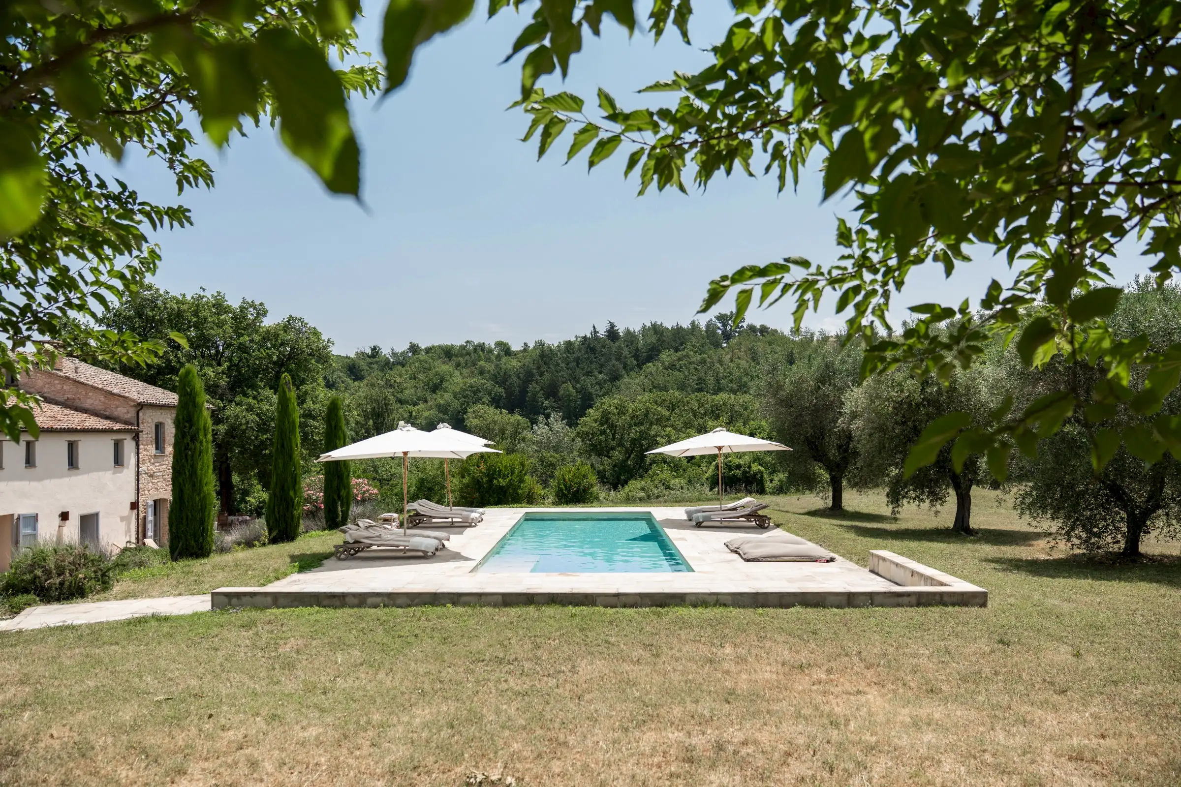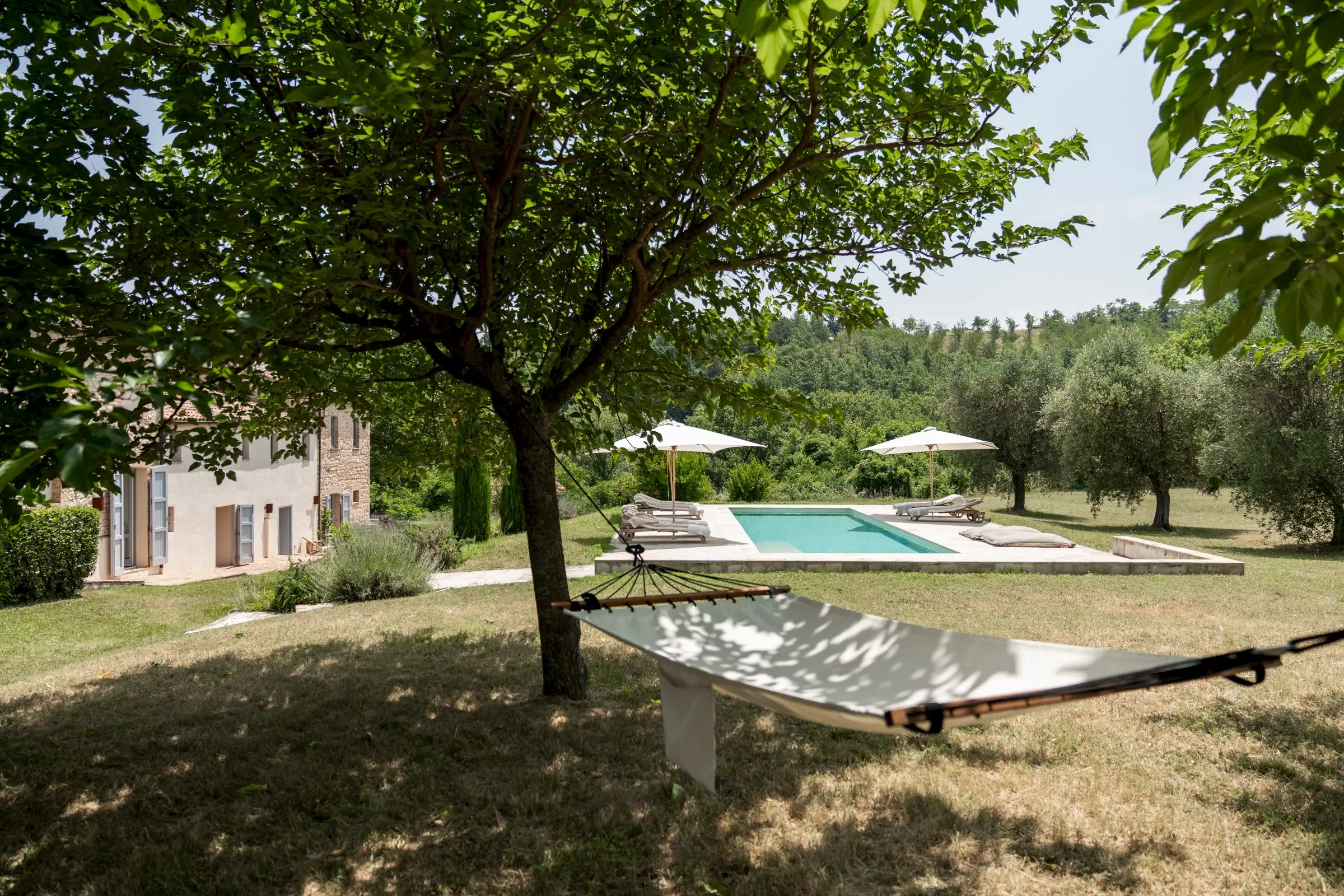 Casa Connelle is a delightful country house that exudes an easy charm. The central part of the building is painted a creamy white and sits between two taller ends of local stone. Approached by an avenue of trees, the house offers peaceful views in every direction over the olive groves and wooded hills of the Marche countryside.