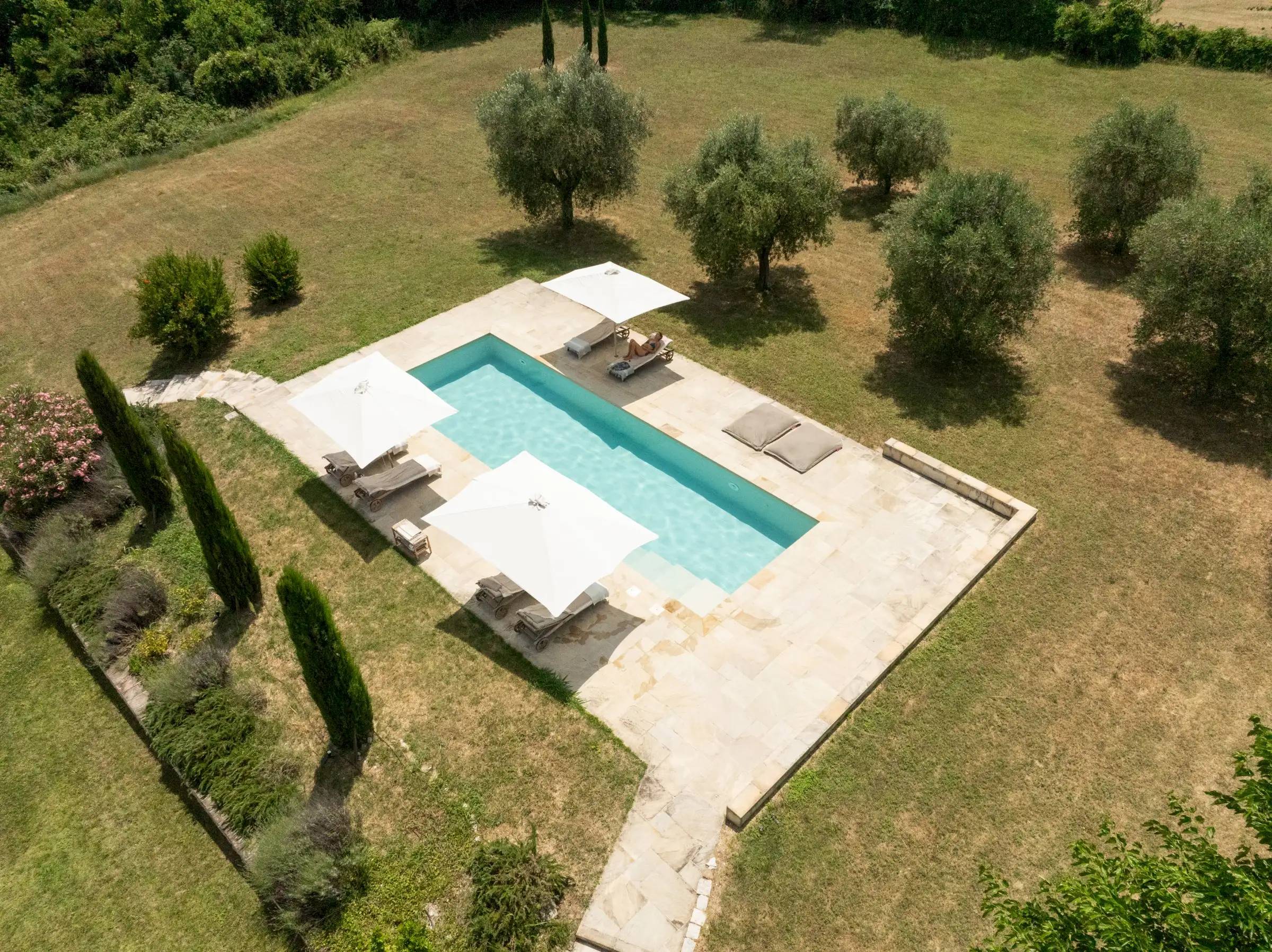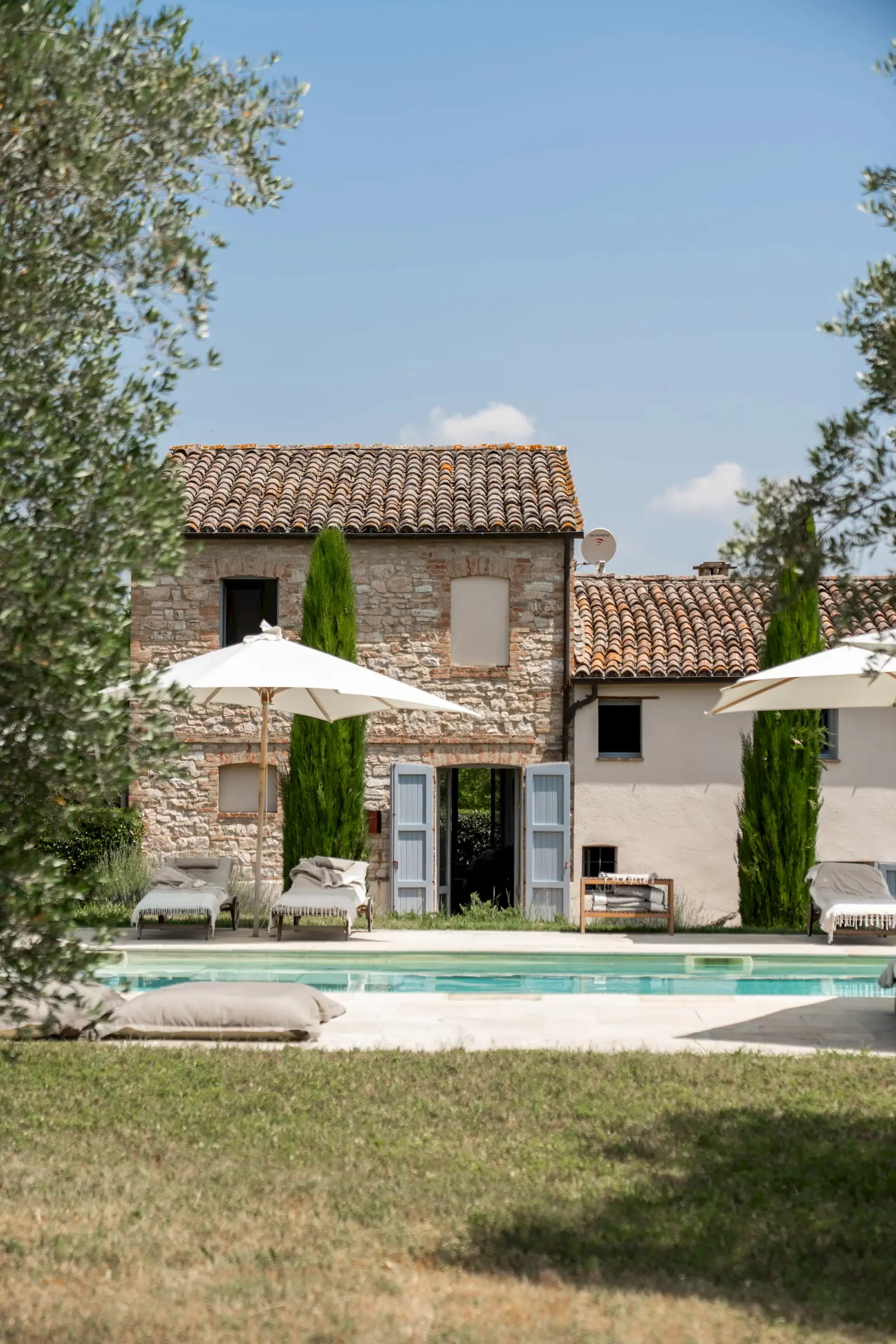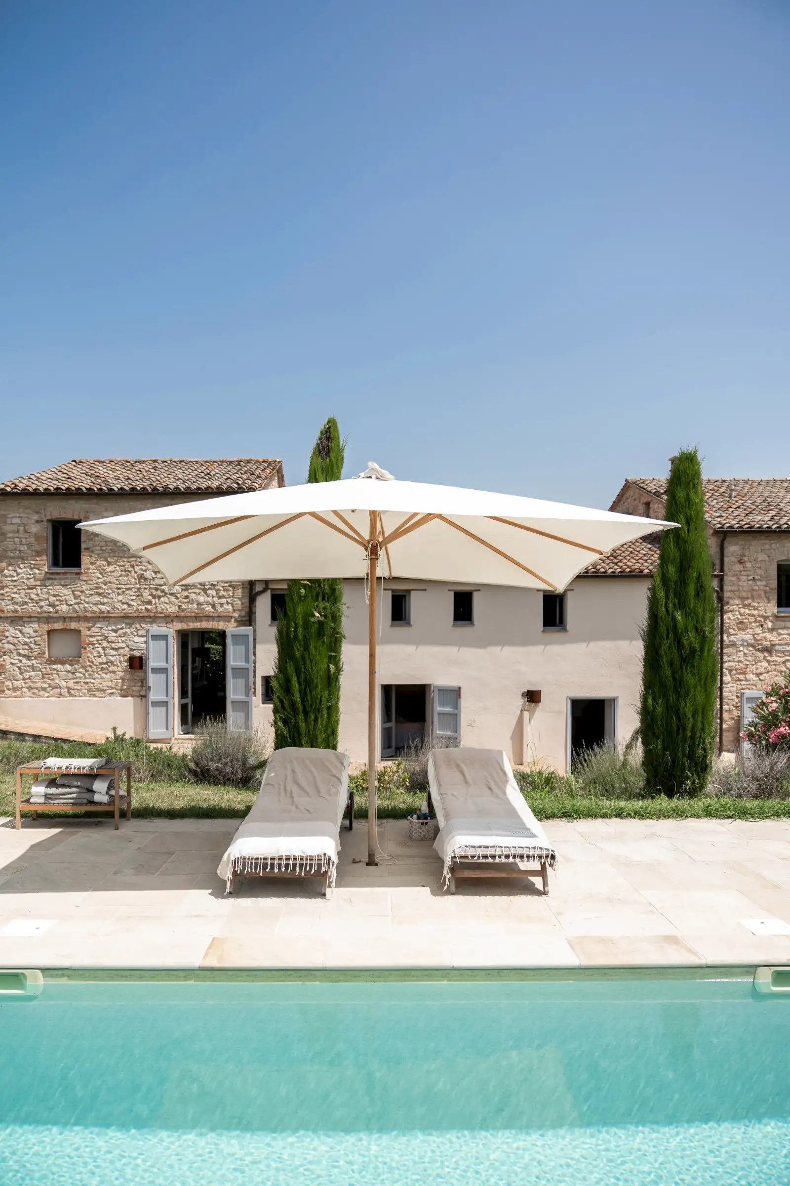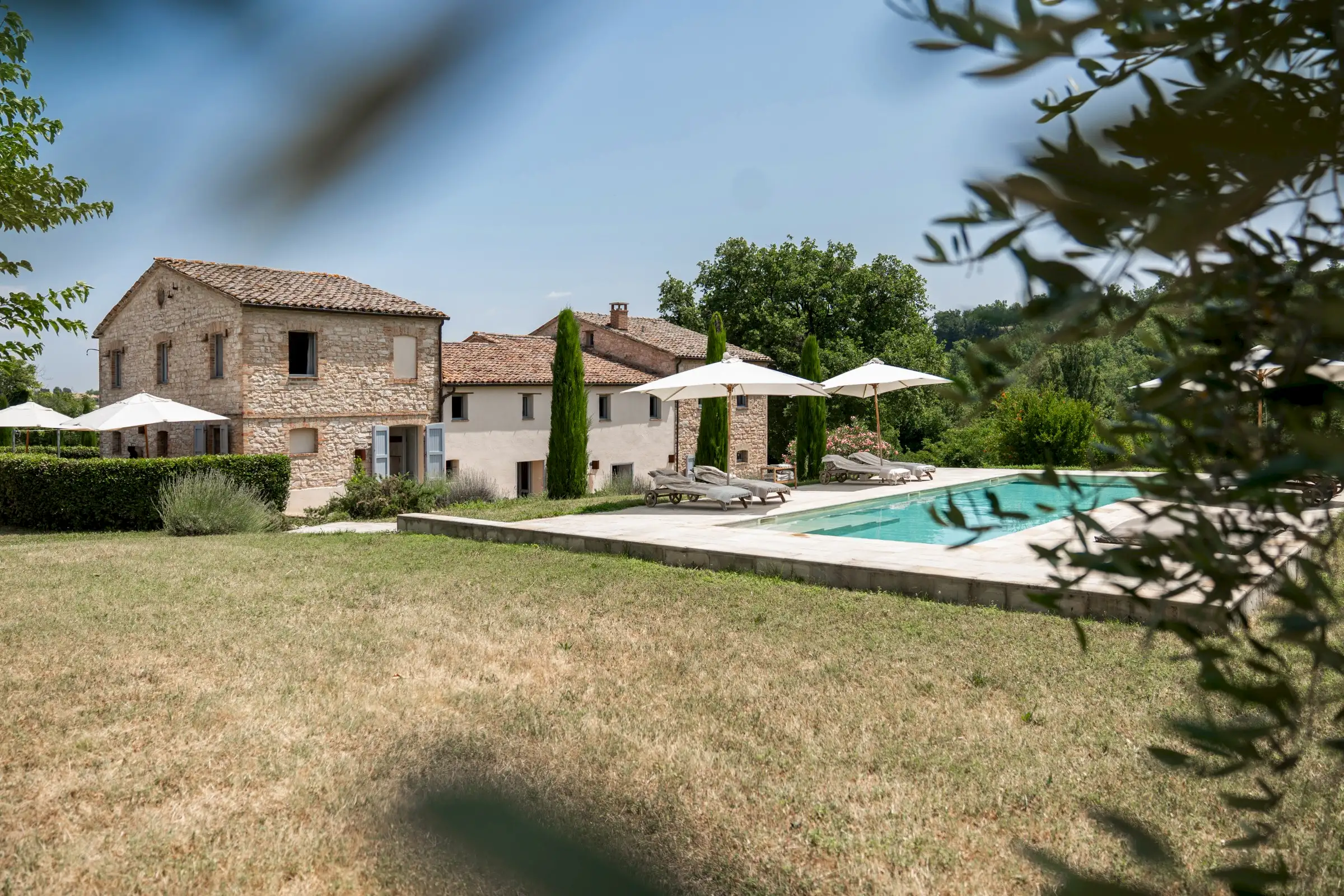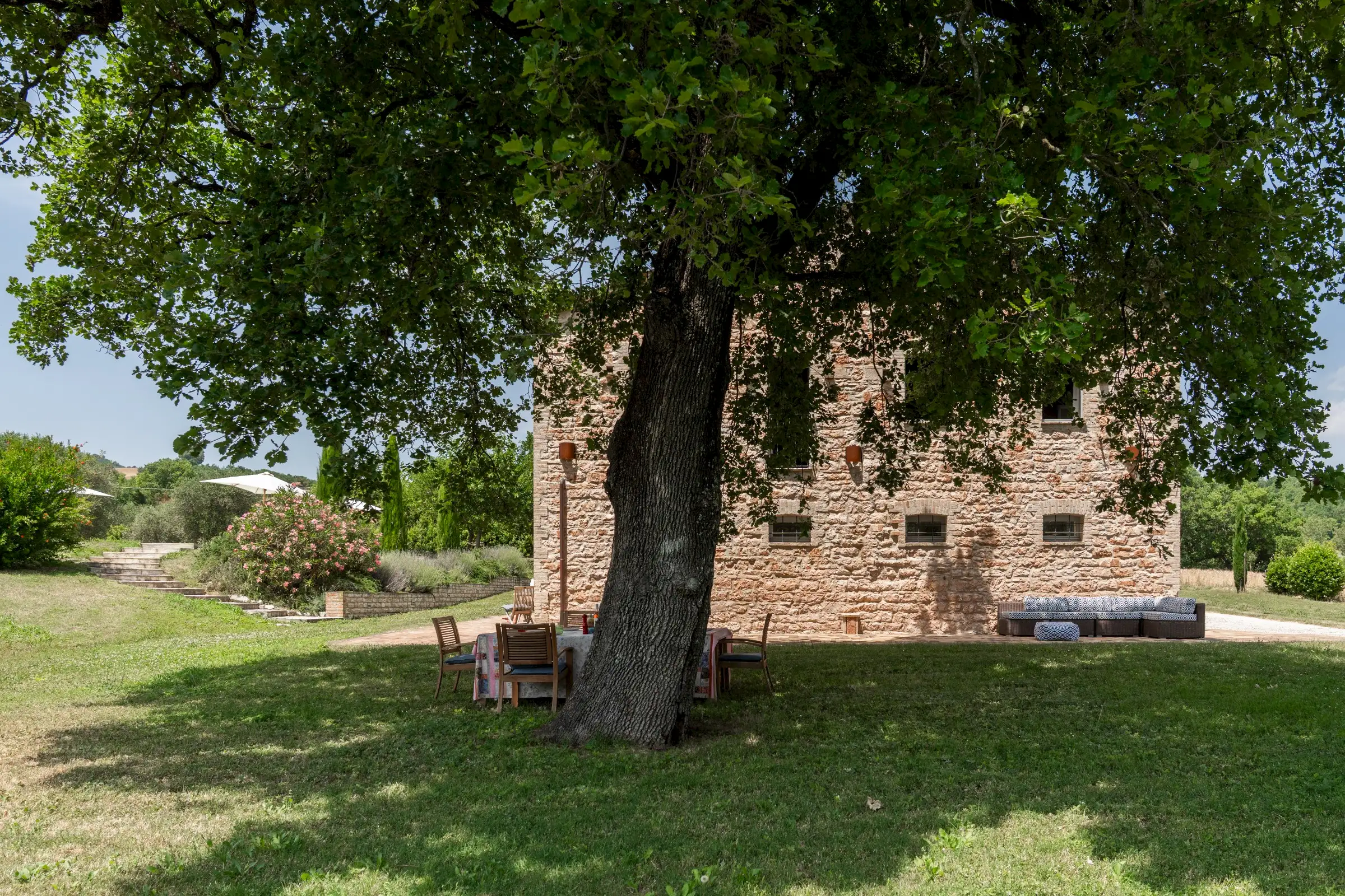 Casa Connelle is a delightful country house that exudes an easy charm. The central part of the building is painted a creamy white and sits between two taller ends of local stone. Approached by an avenue of trees, the house offers peaceful views in every direction over the olive groves and wooded hills of the Marche countryside.