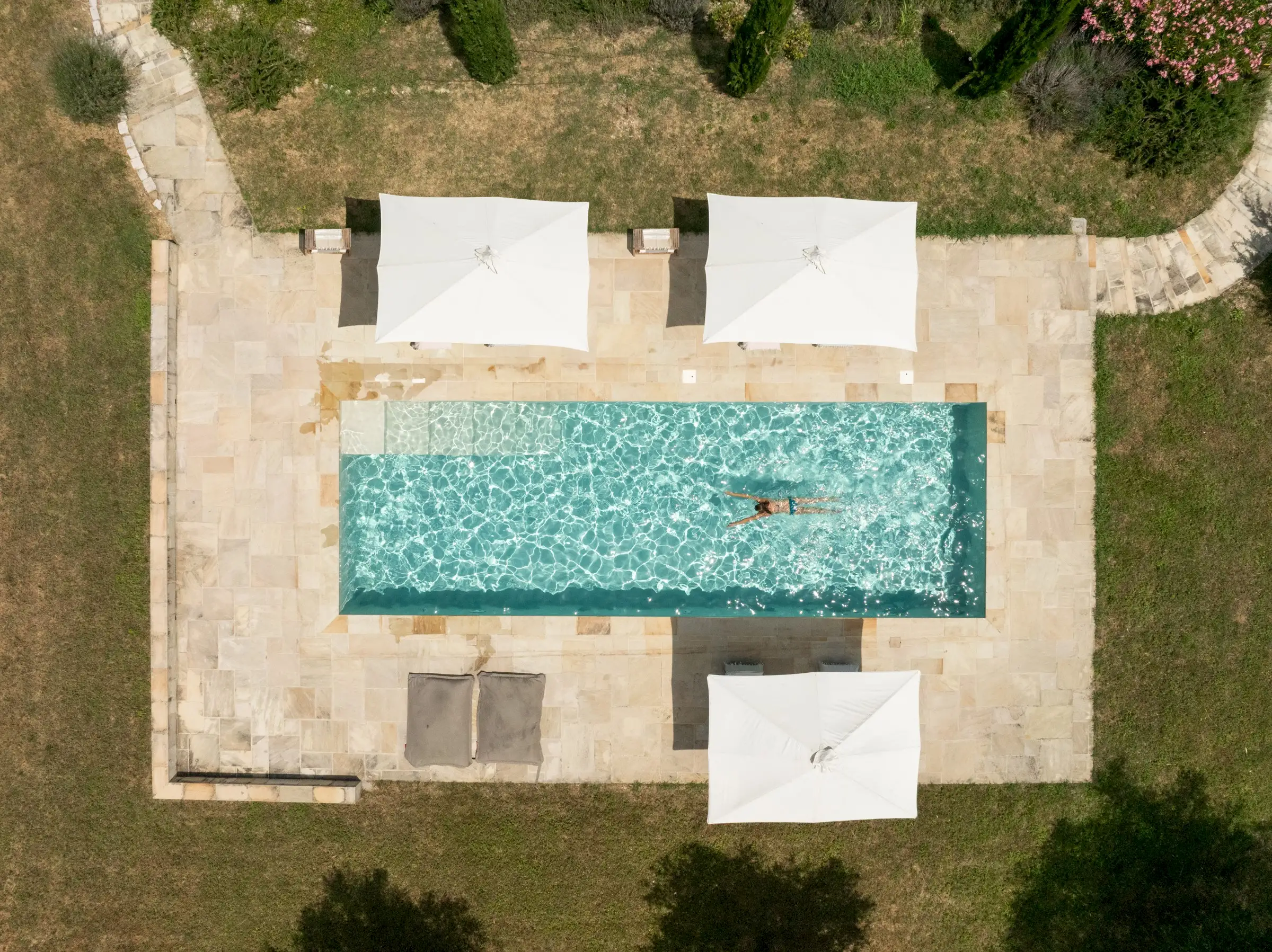 The relatively flat garden is surrounded by mature trees, including a magnificent oak that provides shade in the summer. There’s a 12m x 4m pool with a paved surround and beautiful views – you can glimpse a hilltop village in either direction.