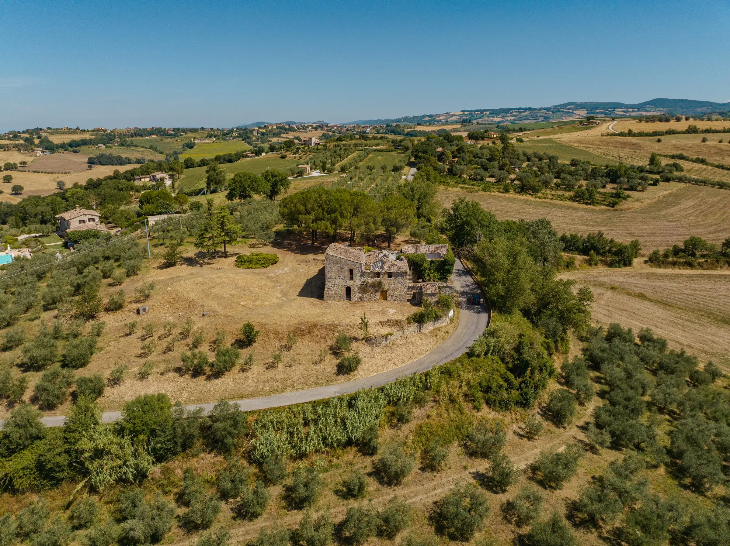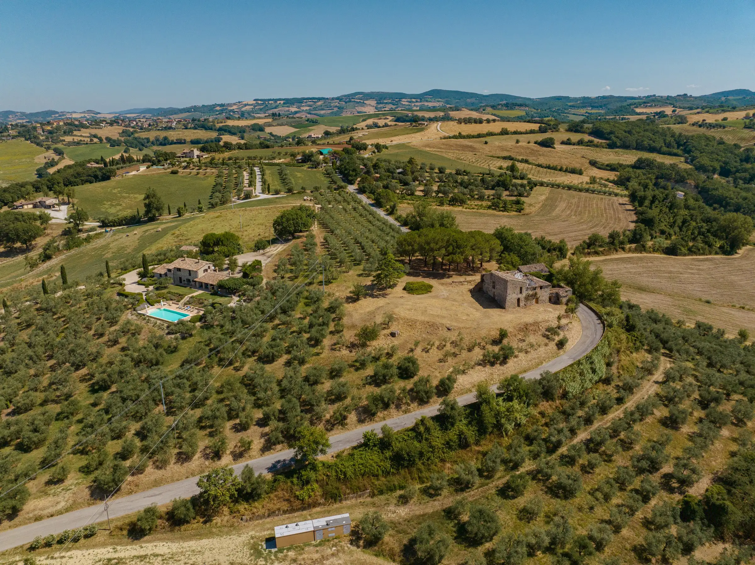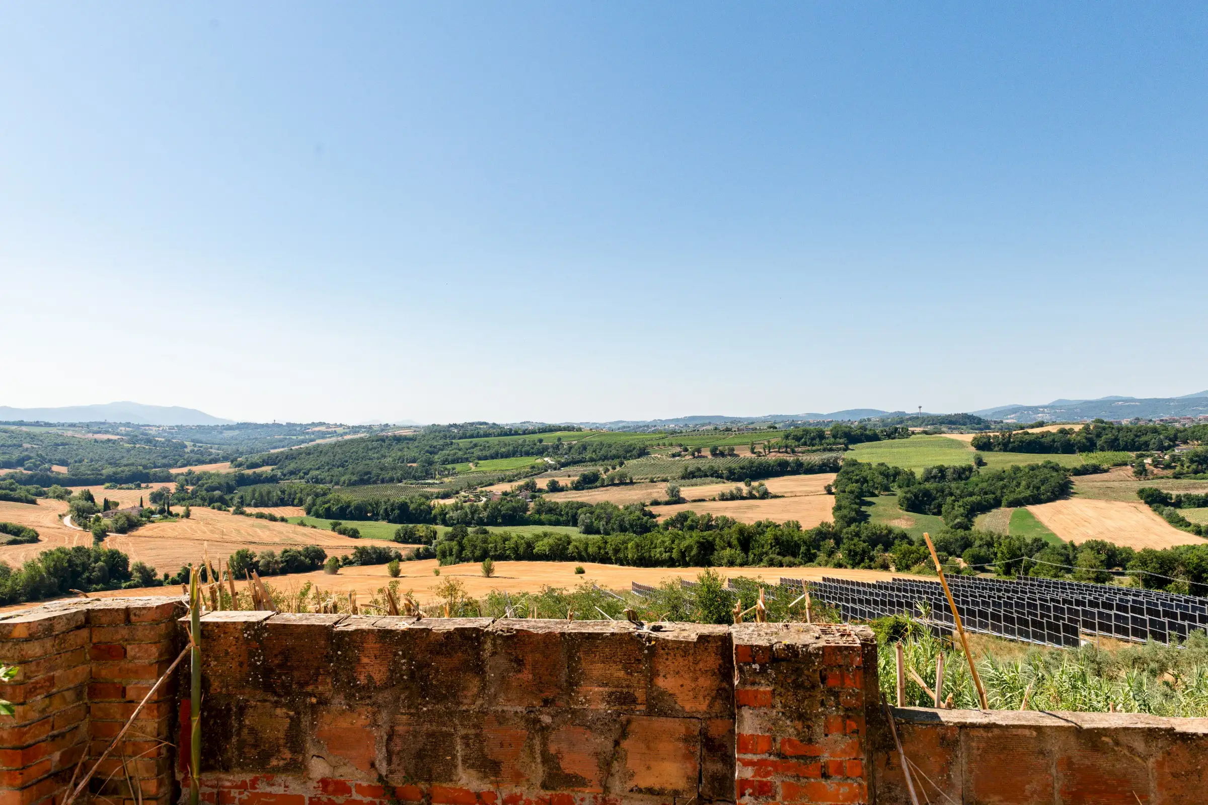 The property is set in a serene, tranquil countryside environment. On one side it neighbours to a private house at comfortable distance from the main, to be restored farmhouse, where local residents live. The photovoltaic panel park opposite of the road, is located on and belongs to third party property; standing on "Cottino" property, it doesn't impact the panoramic views over the countryside and on Todi.