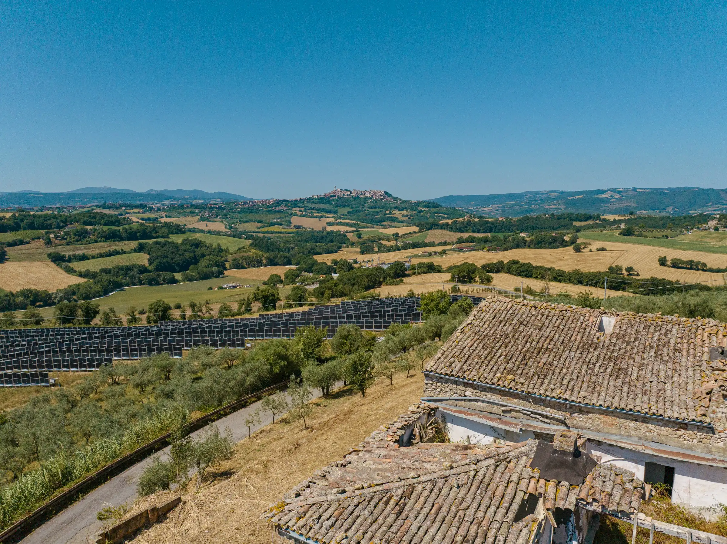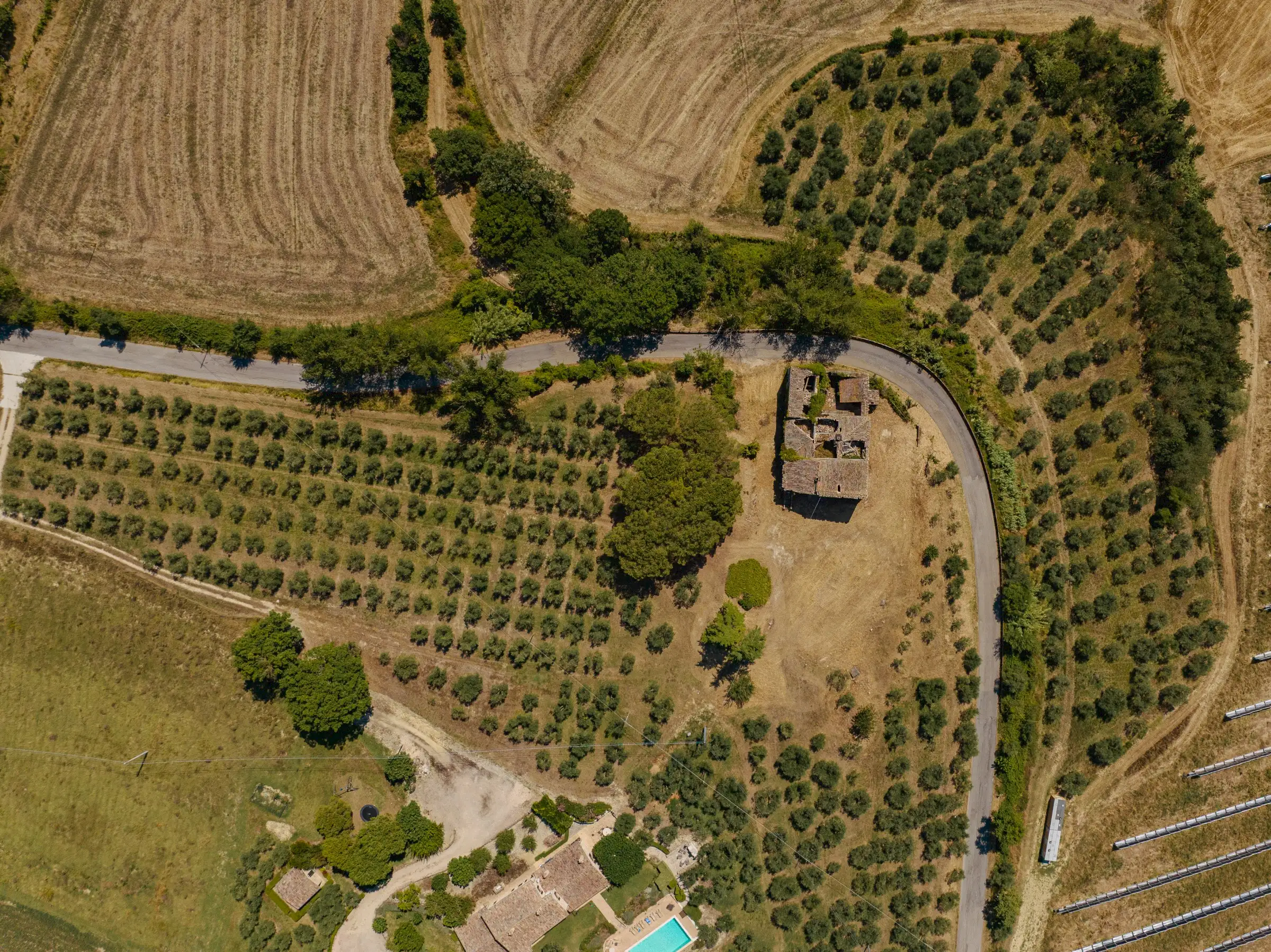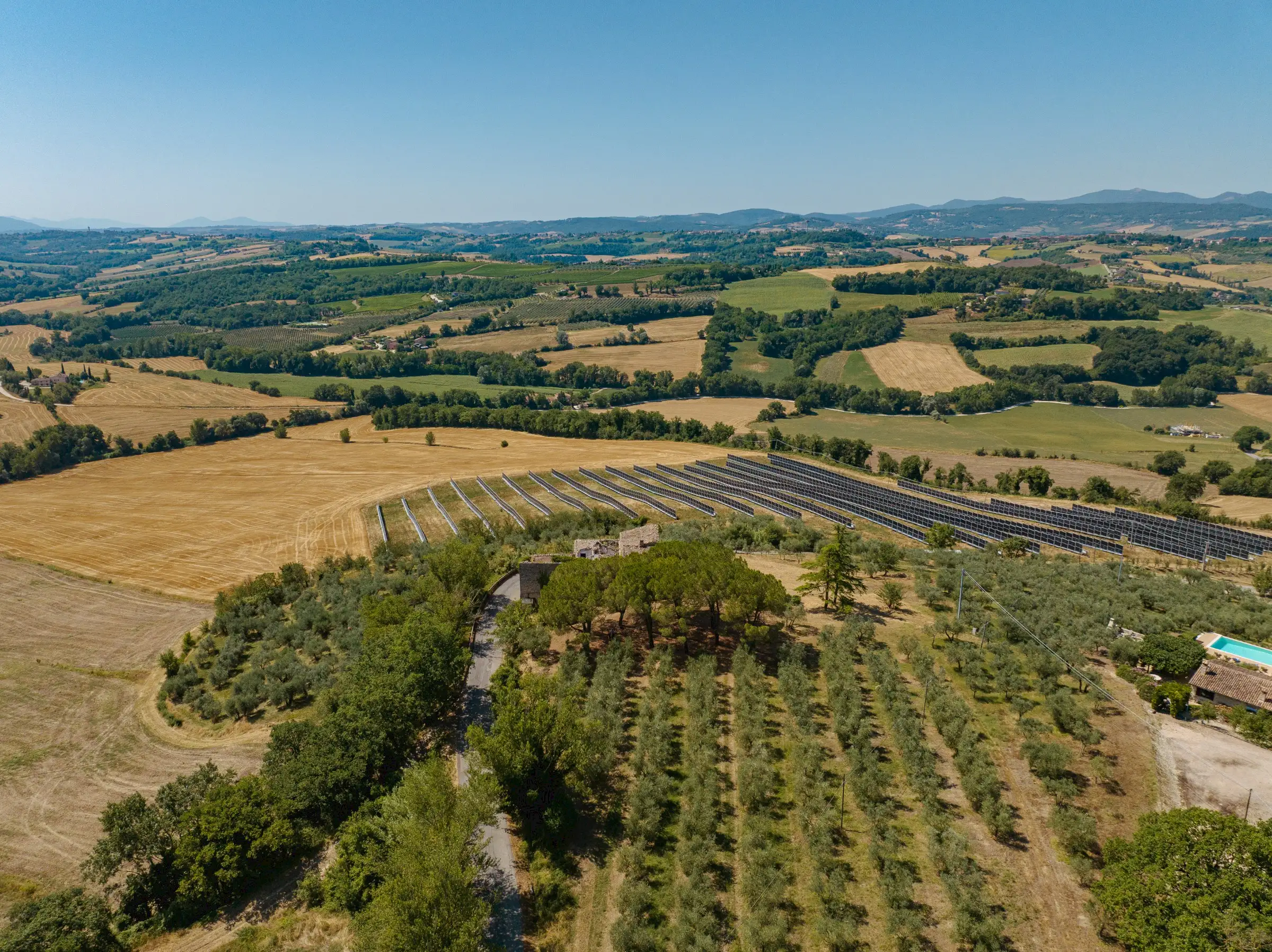 The property is set in a serene, tranquil countryside environment. On one side it neighbours to a private house at comfortable distance from the main, to be restored farmhouse, where local residents live. The photovoltaic panel park opposite of the road, is located on and belongs to third party property; standing on "Cottino" property, it doesn't impact the panoramic views over the countryside and on Todi.