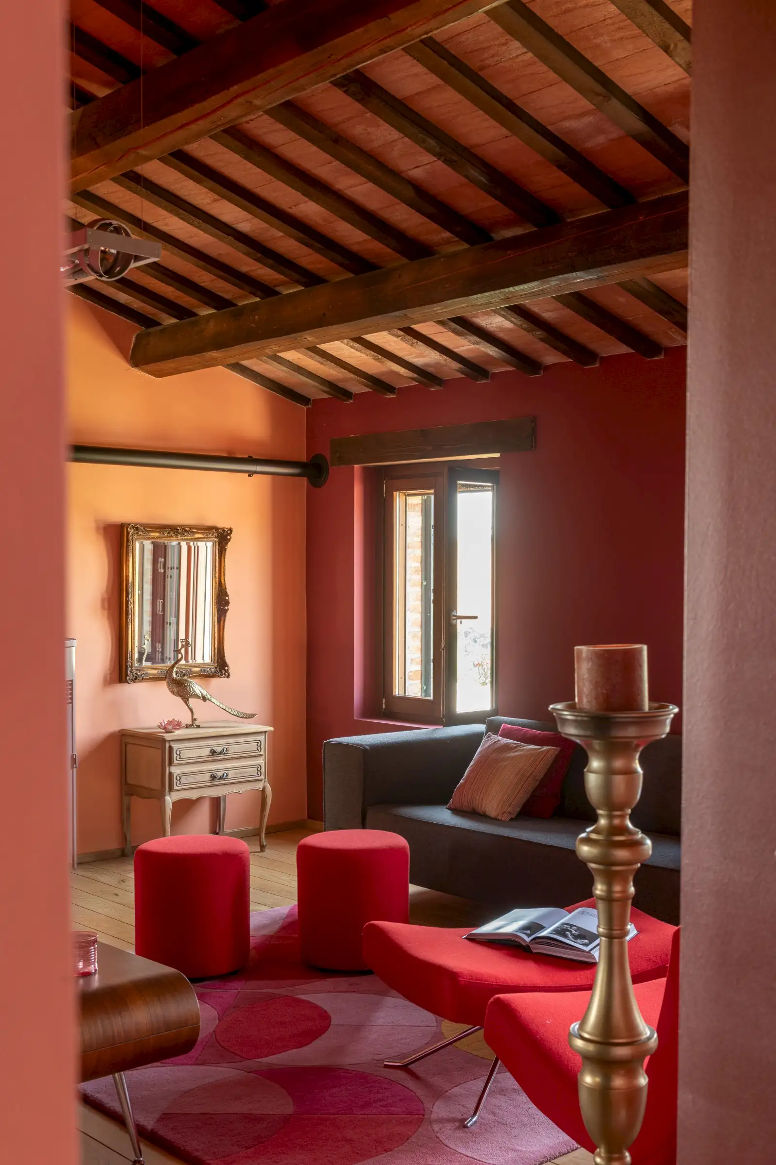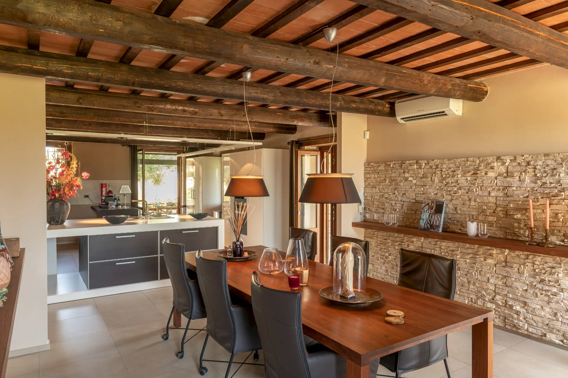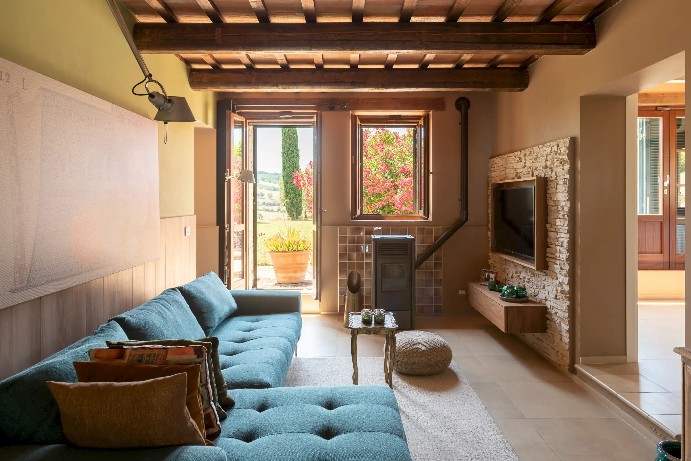 Traditional features, such as cotto and beam ceilings, sit alongside modern additions, while air conditioning, a fireplace and wood pellet stoves make the property comfortable all year round.