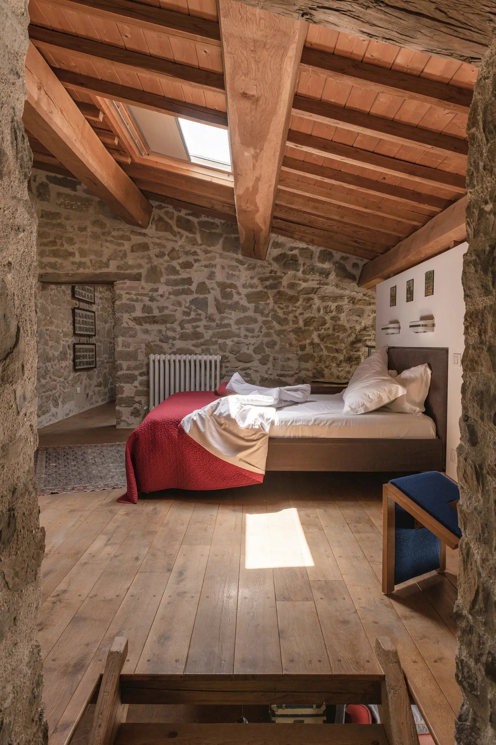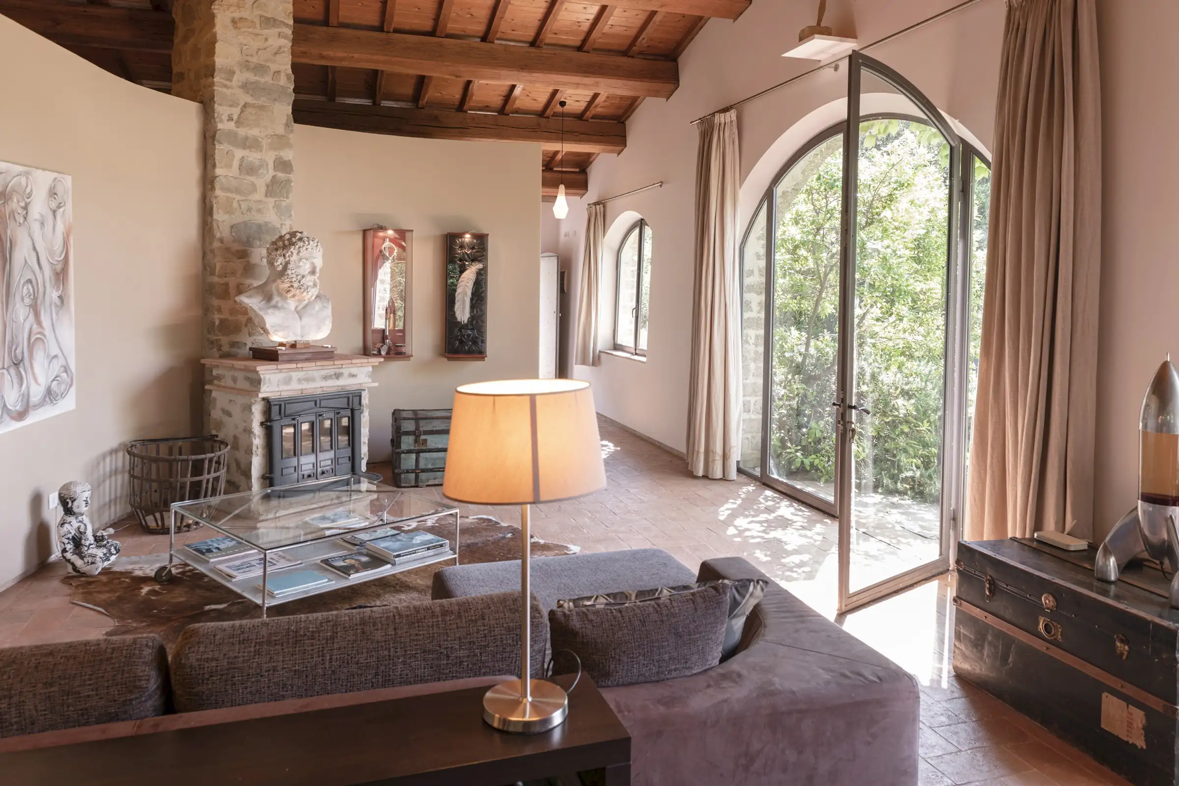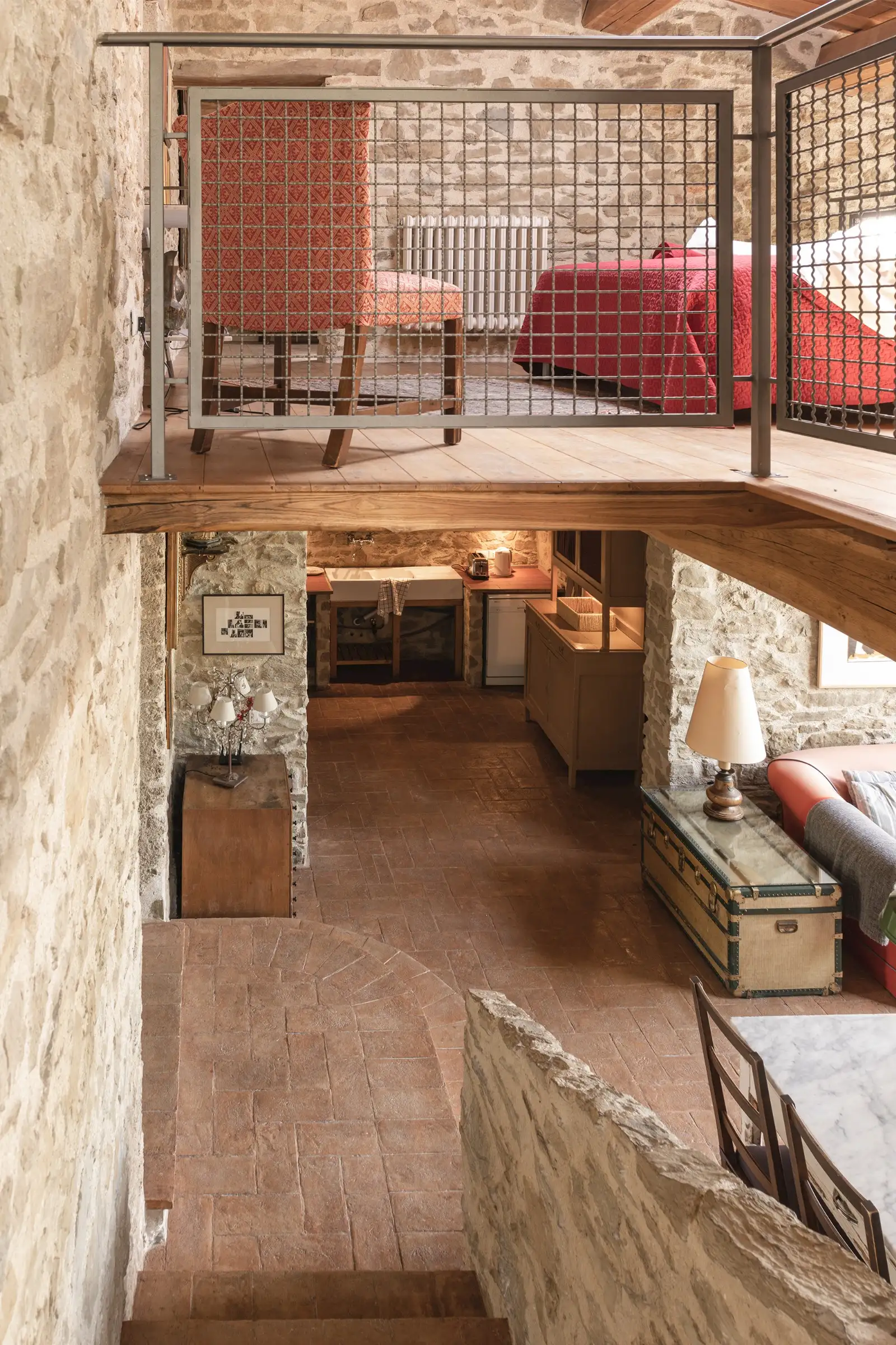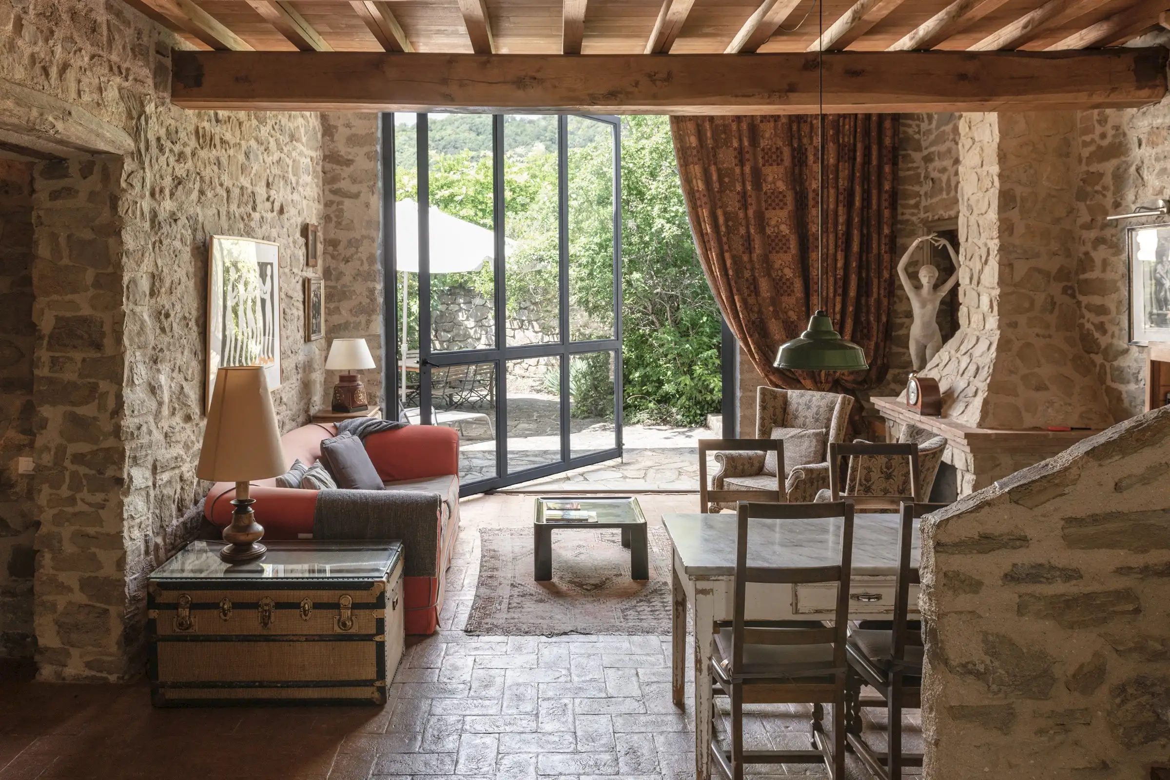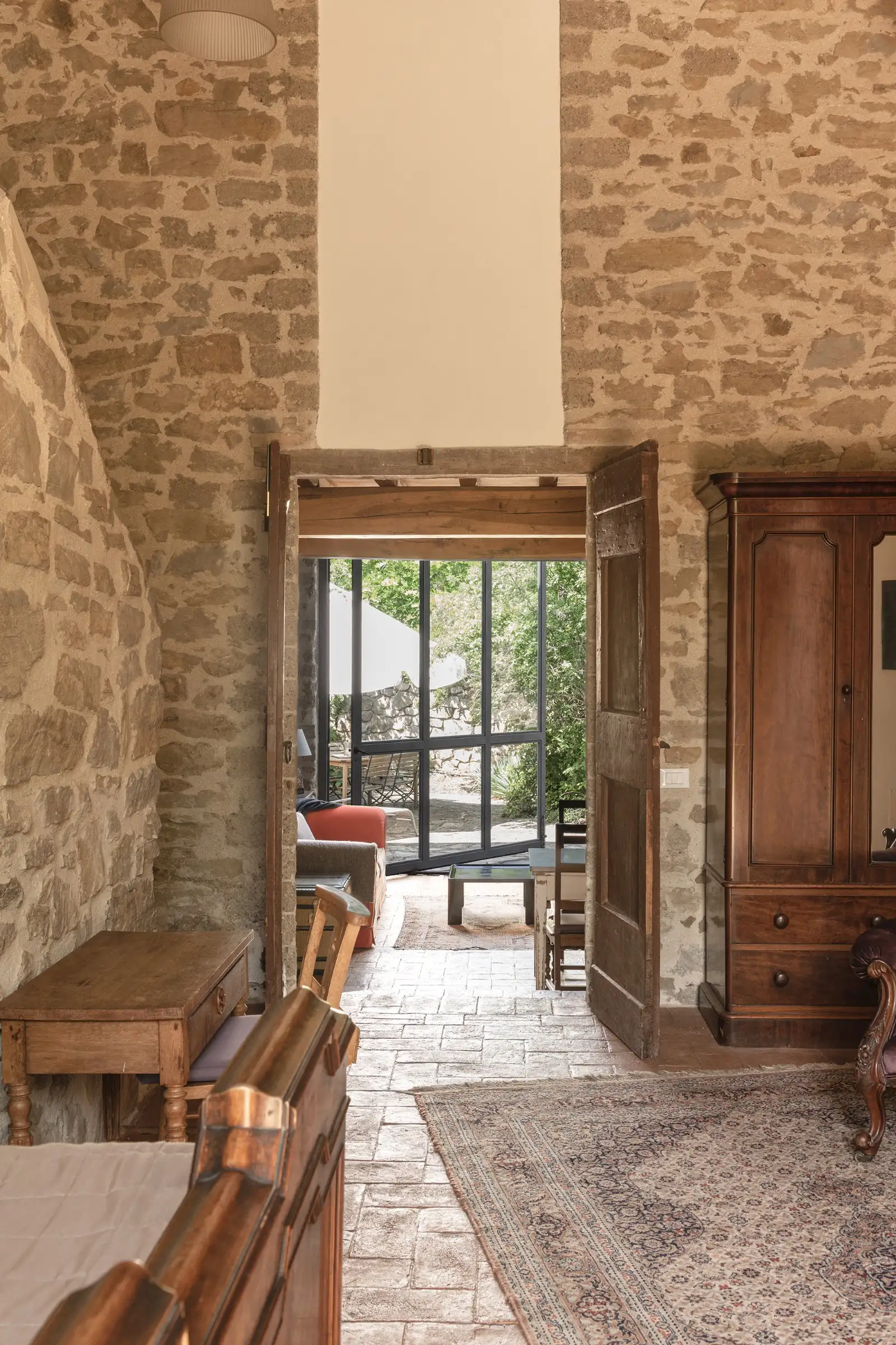 The buildings are split into five apartments – three in one and two in another - although one apartment in the larger farmhouse is yet to be finished. Each apartment has its own individual character thanks to original features such as three beautiful south-facing arched windows in what was originally a pigsty. In another apartment is a single pivoting 4m-high metal-framed glass door made by a local blacksmith for what was formerly a barn entrance and now leads from a sitting room to a terrace. The result is a graceful modernity that is found through honest design.