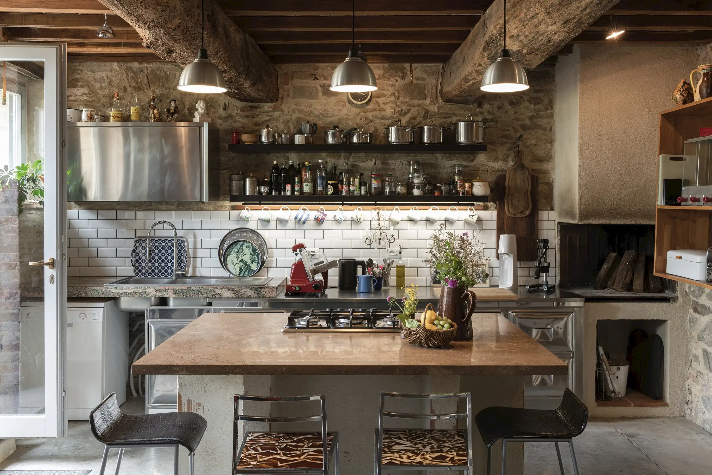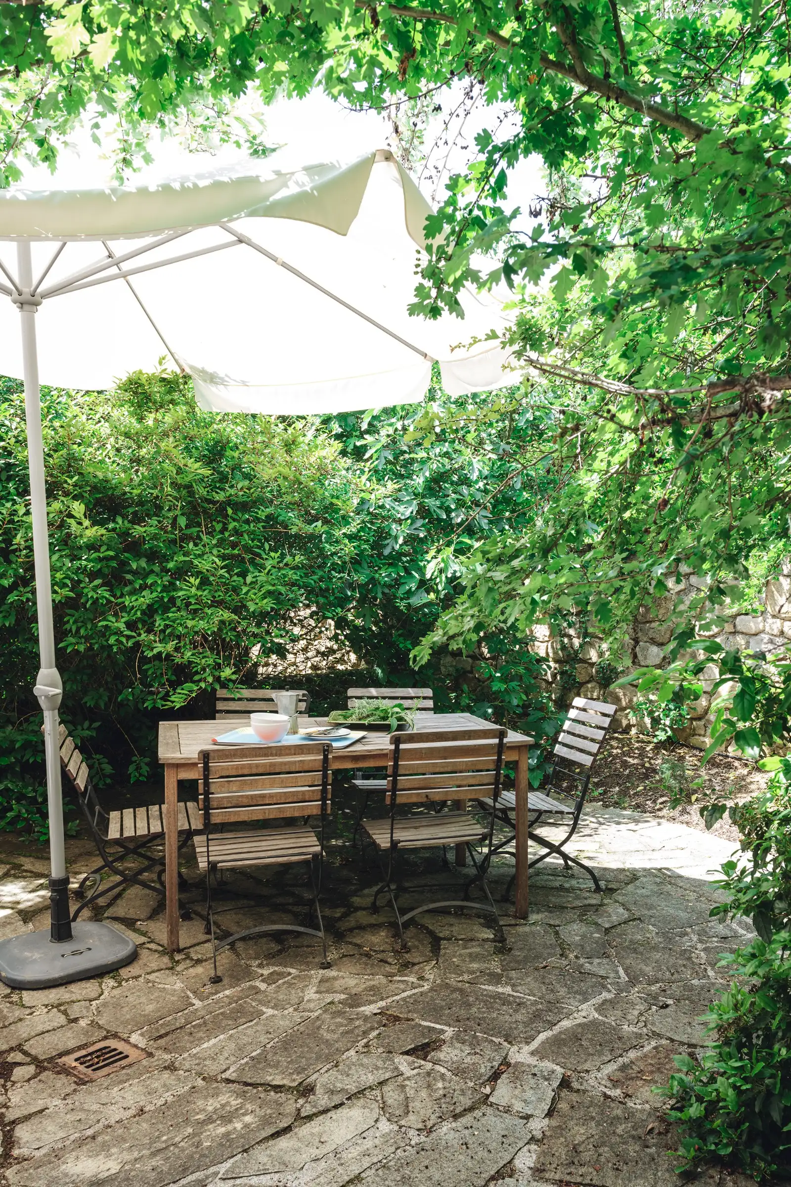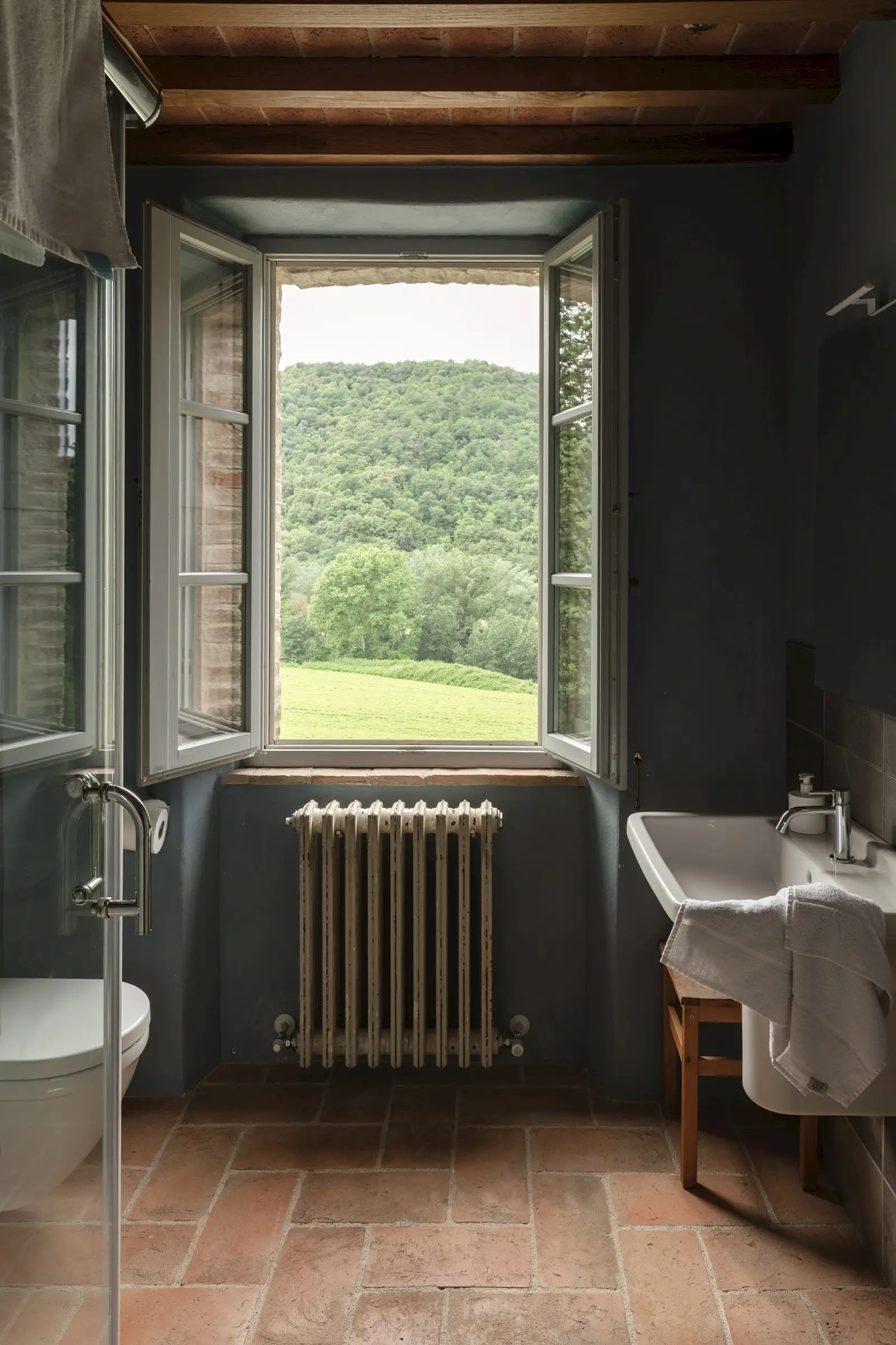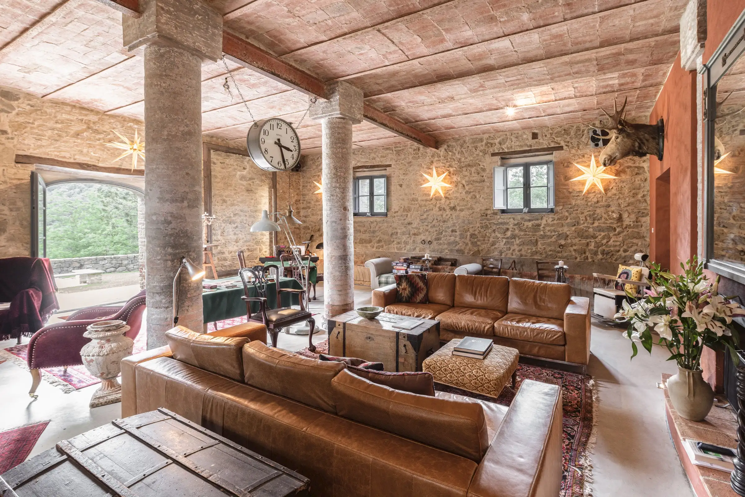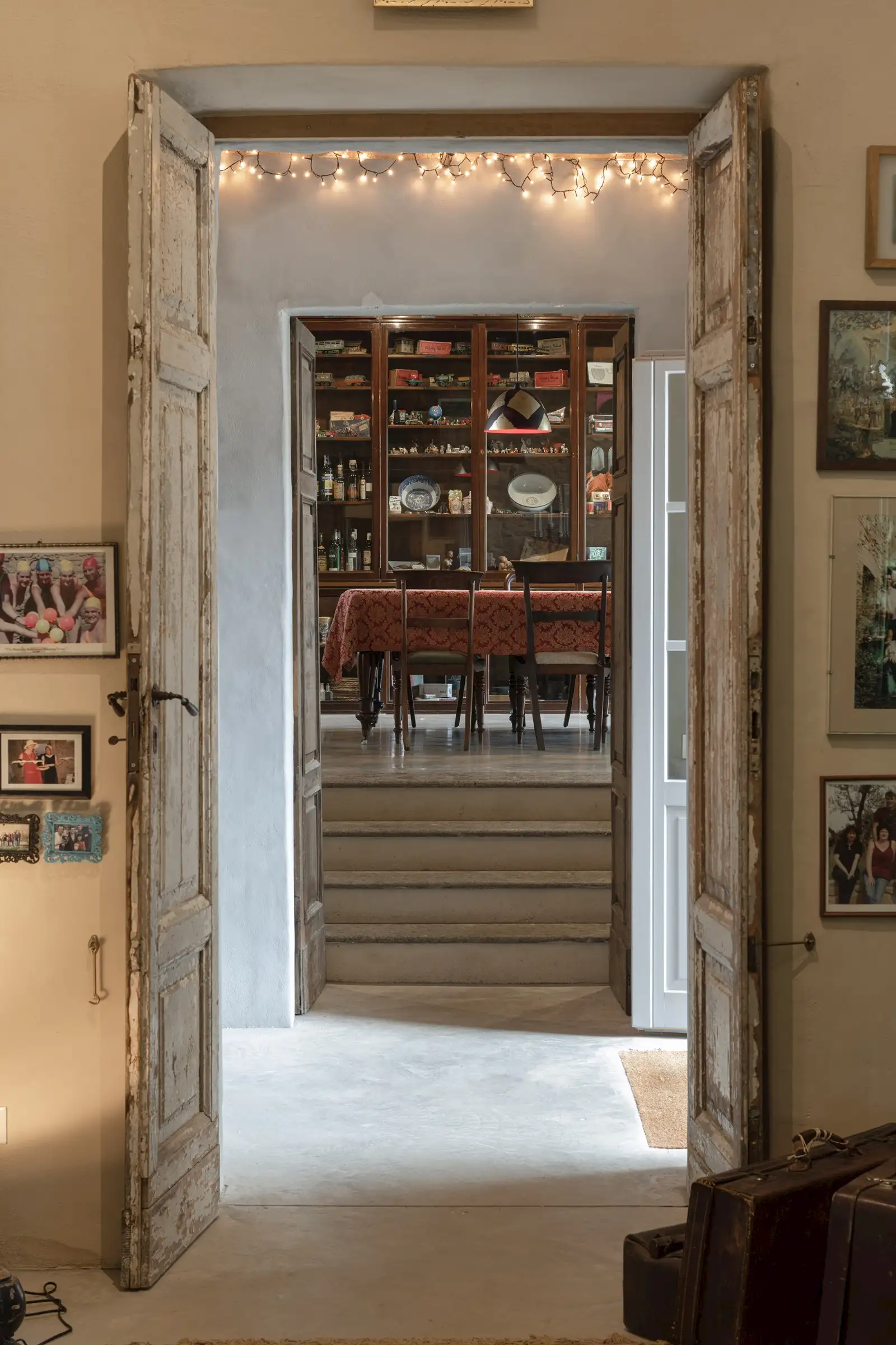 The buildings are split into five apartments – three in one and two in another - although one apartment in the larger farmhouse is yet to be finished. Each apartment has its own individual character thanks to original features such as three beautiful south-facing arched windows in what was originally a pigsty. In another apartment is a single pivoting 4m-high metal-framed glass door made by a local blacksmith for what was formerly a barn entrance and now leads from a sitting room to a terrace. The result is a graceful modernity that is found through honest design.