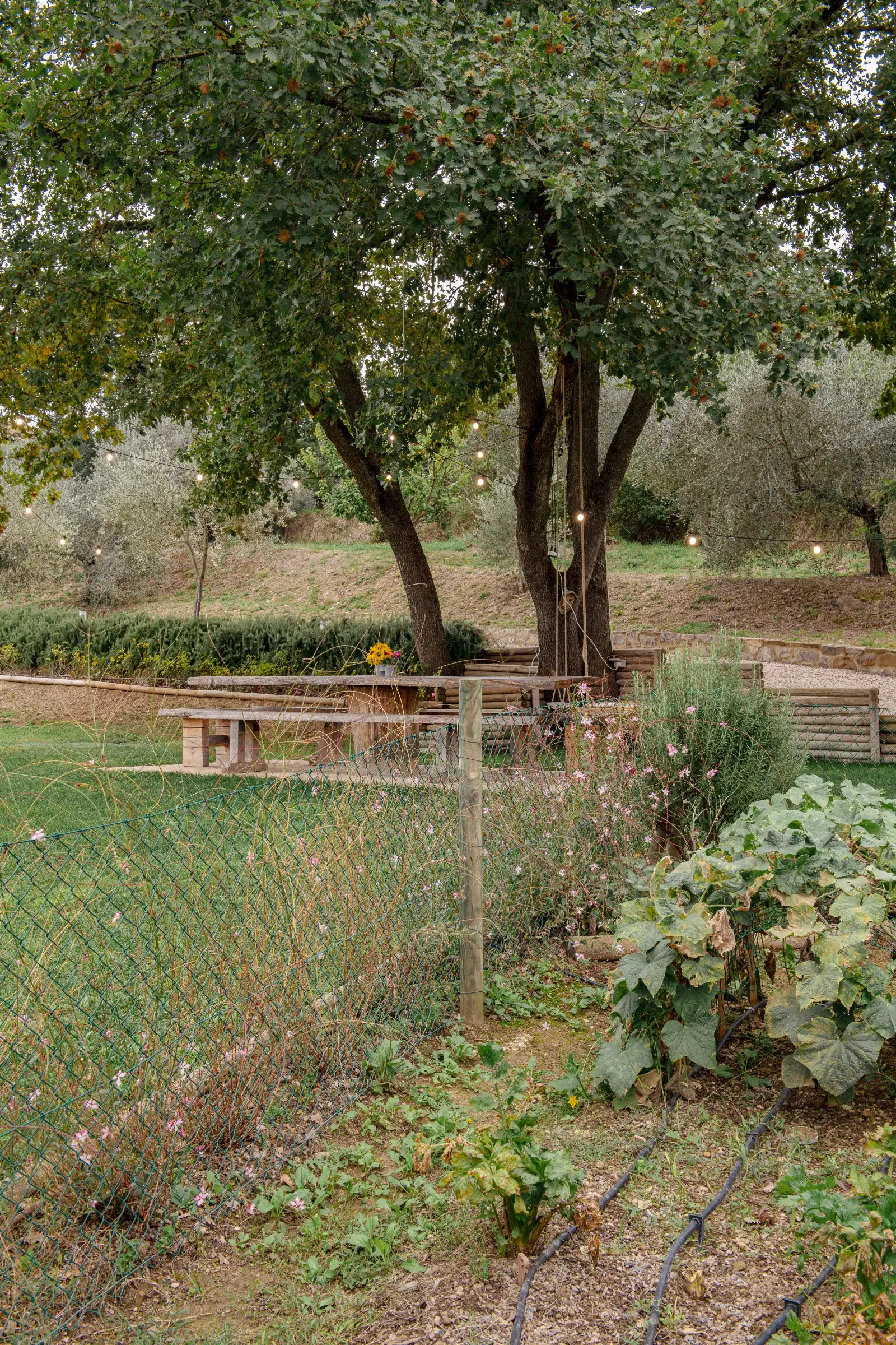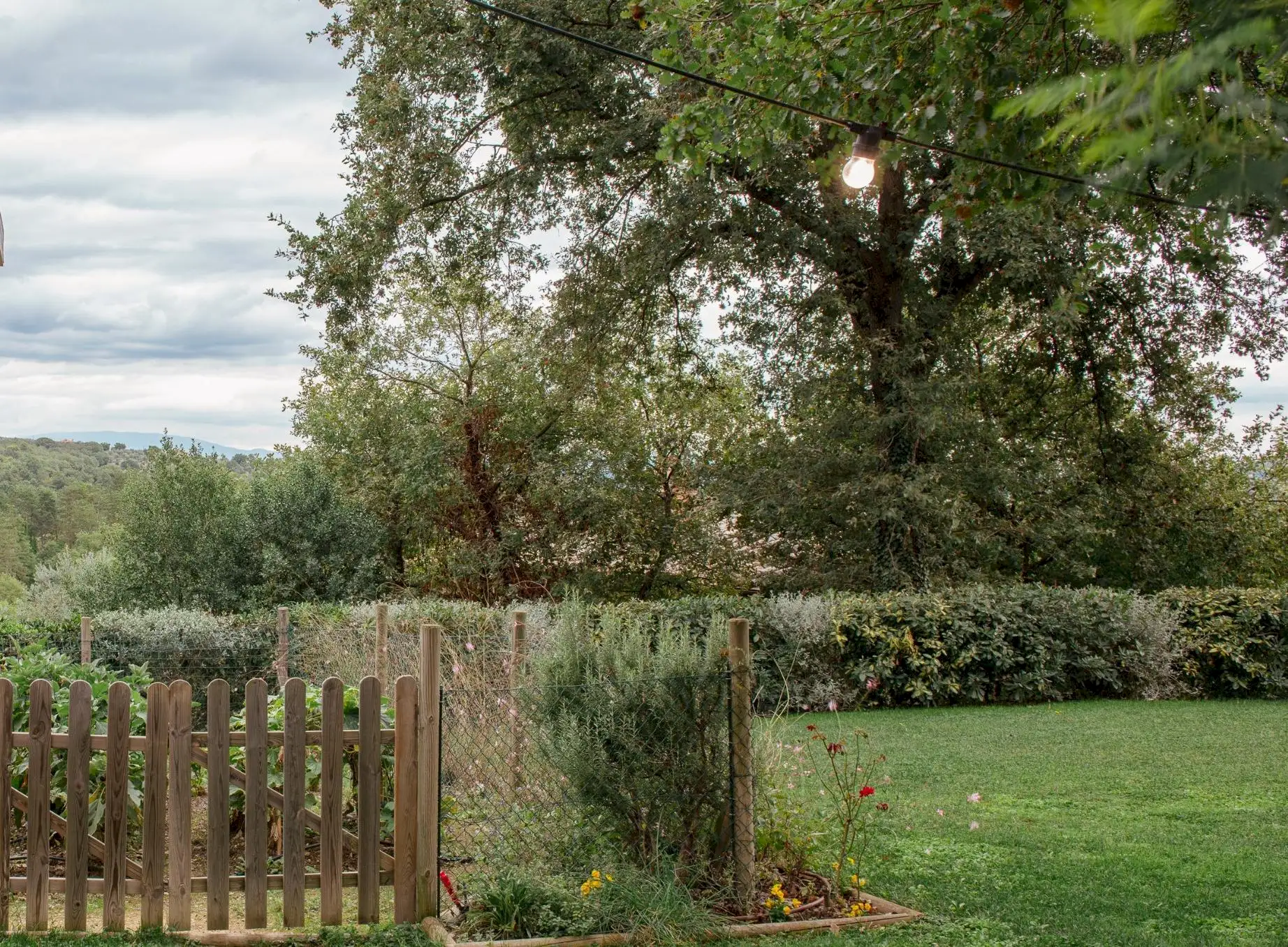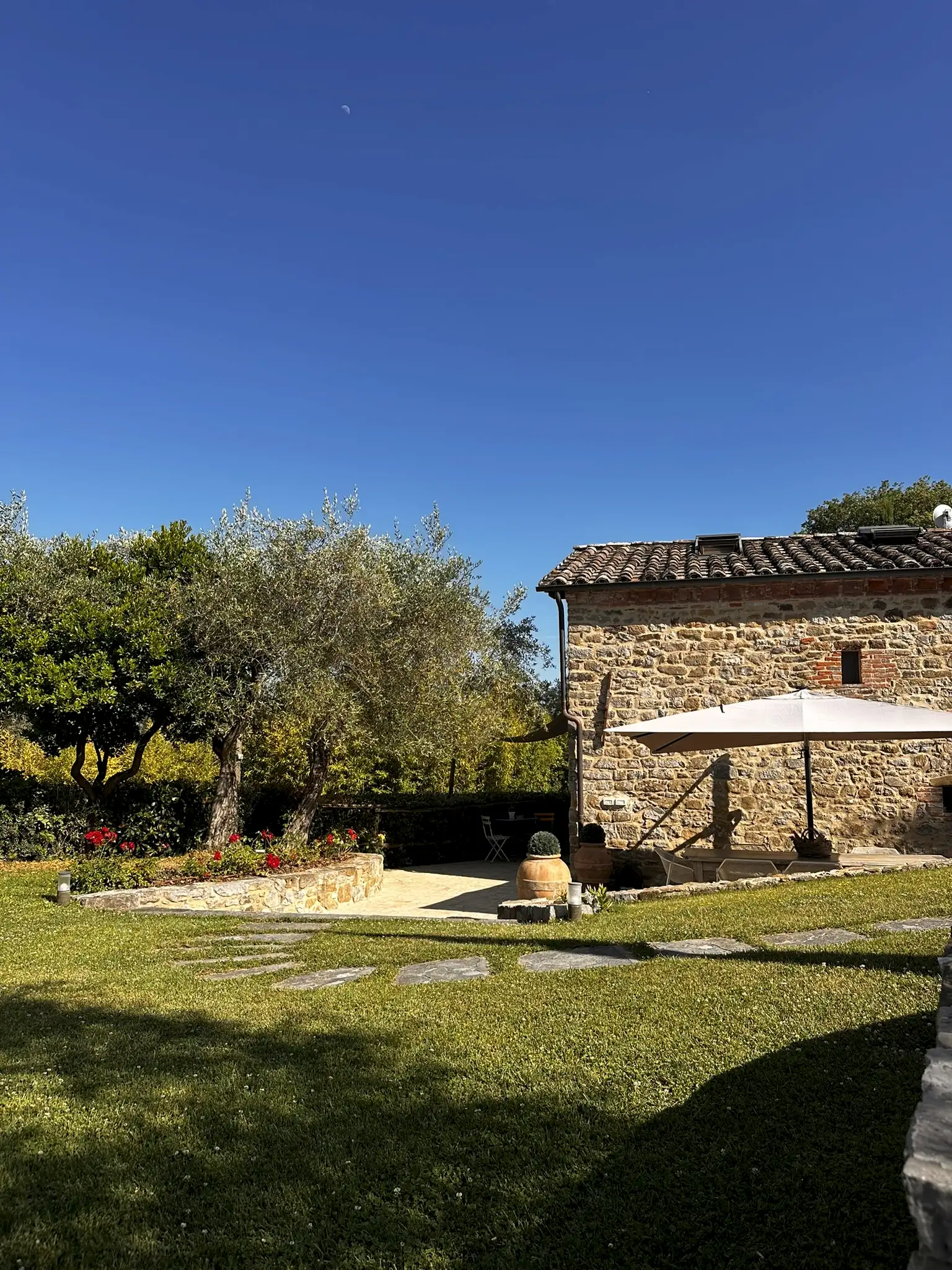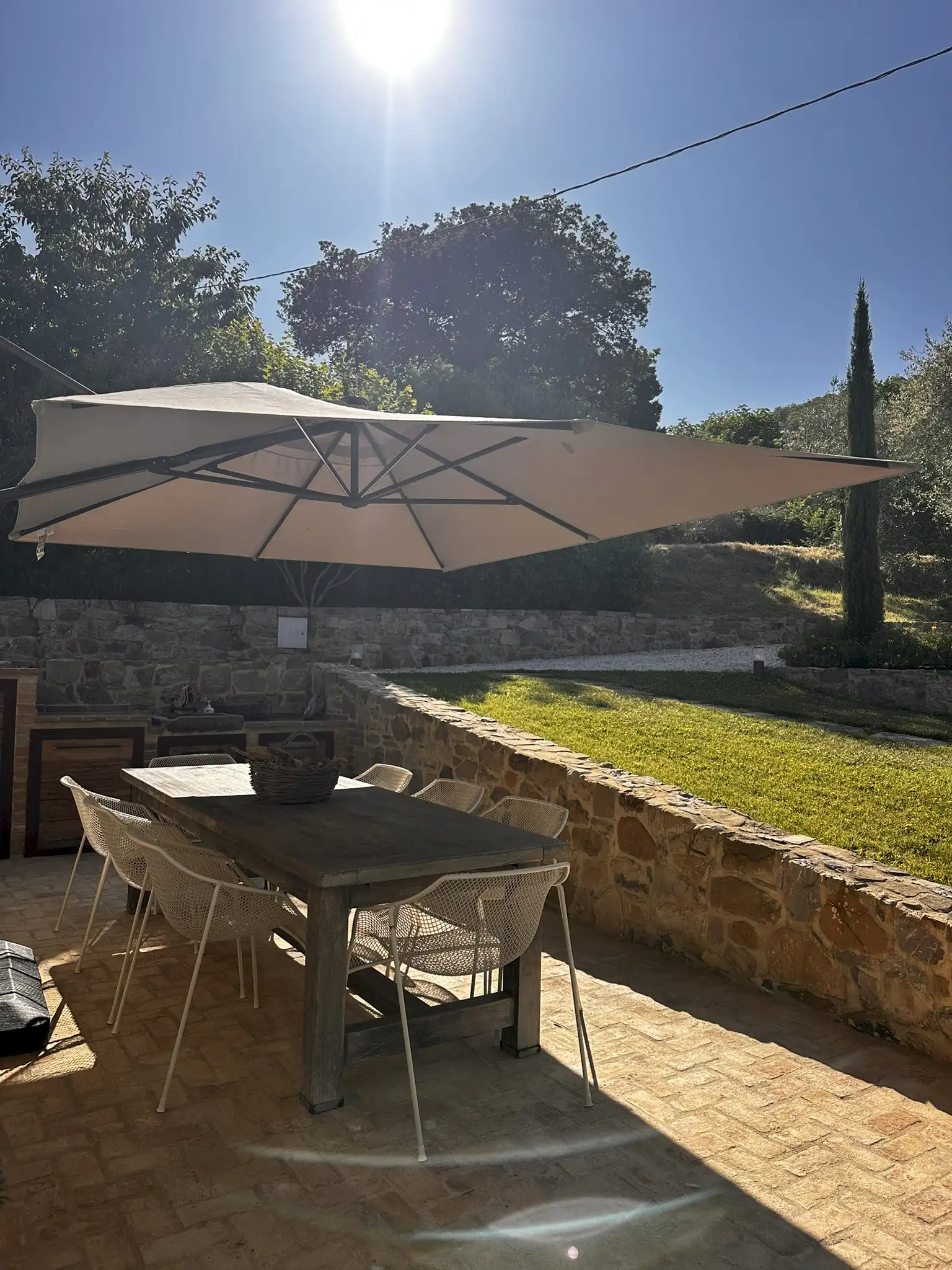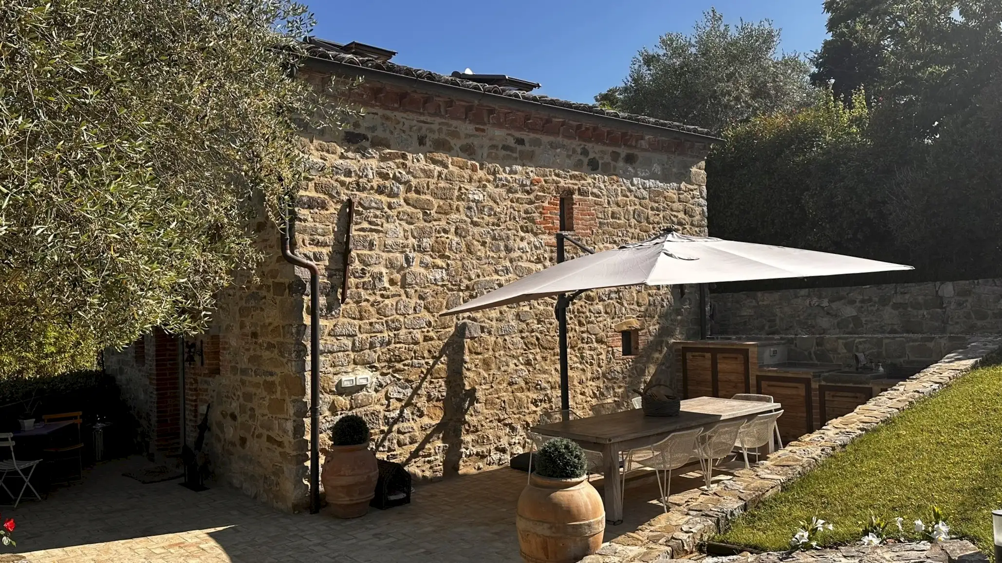 Outside, there’s a large, beautifully maintained garden surrounded by mature trees and with a neat, enclosed vegetable garden at the far end. The outdoor area, adjacent to the house, with its large sun-umbrella has been carefully designed to create an outdoor living area with a small outdoor kitchen, a large handmade table, stone countertops and a sink, and built-in space for the washing machine and boiler.