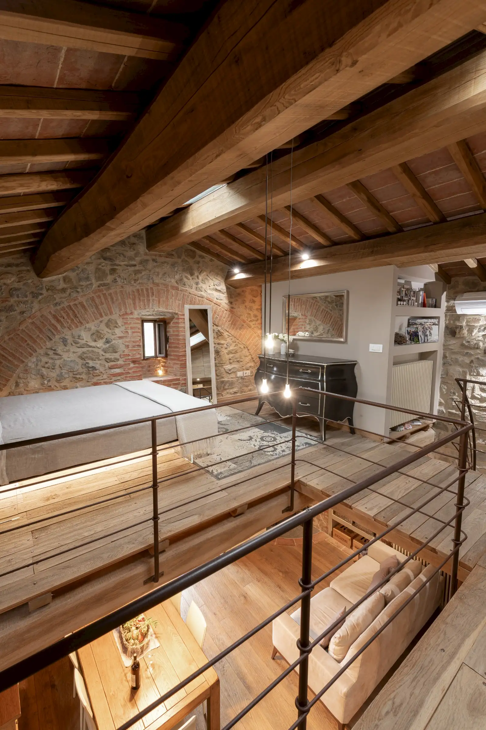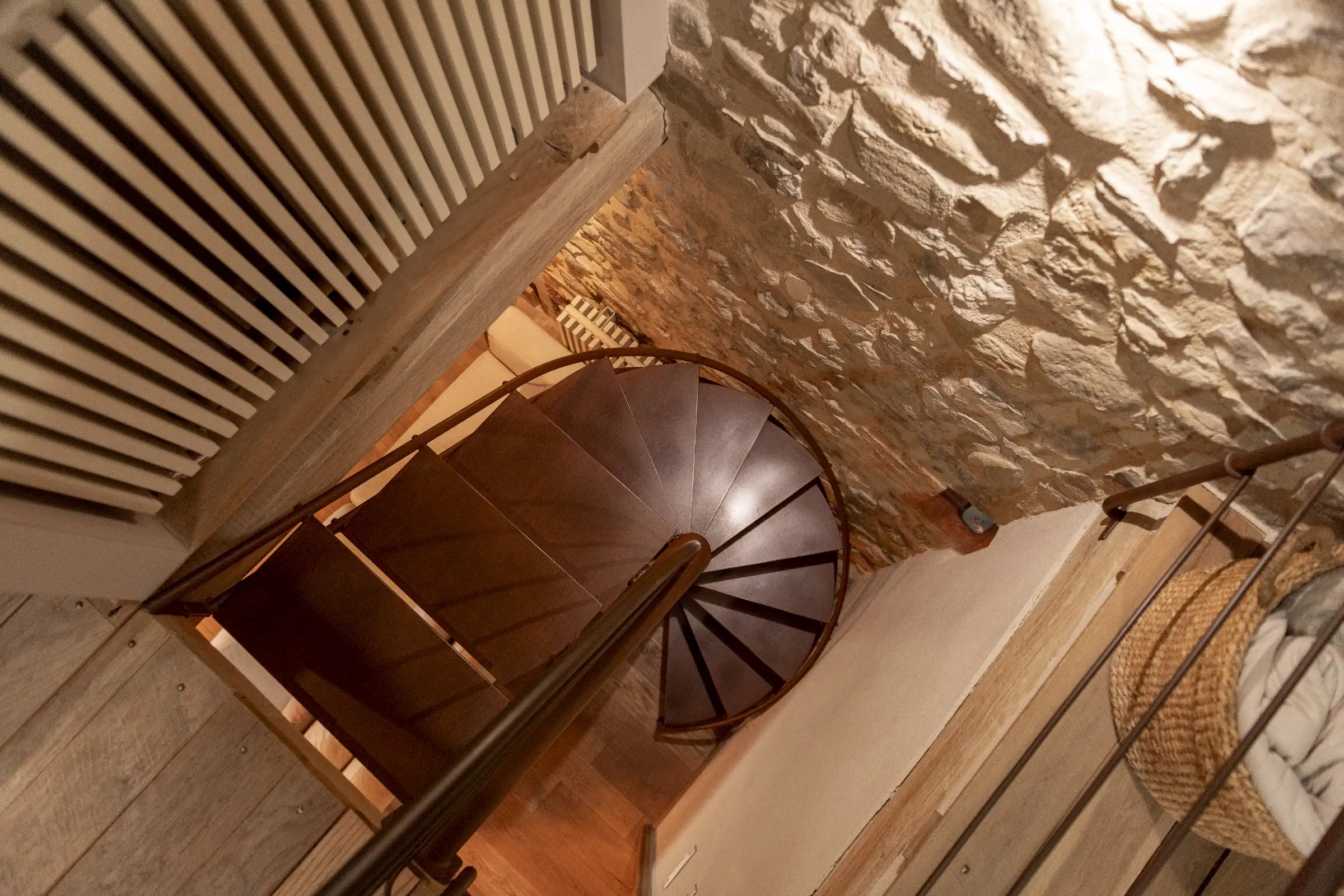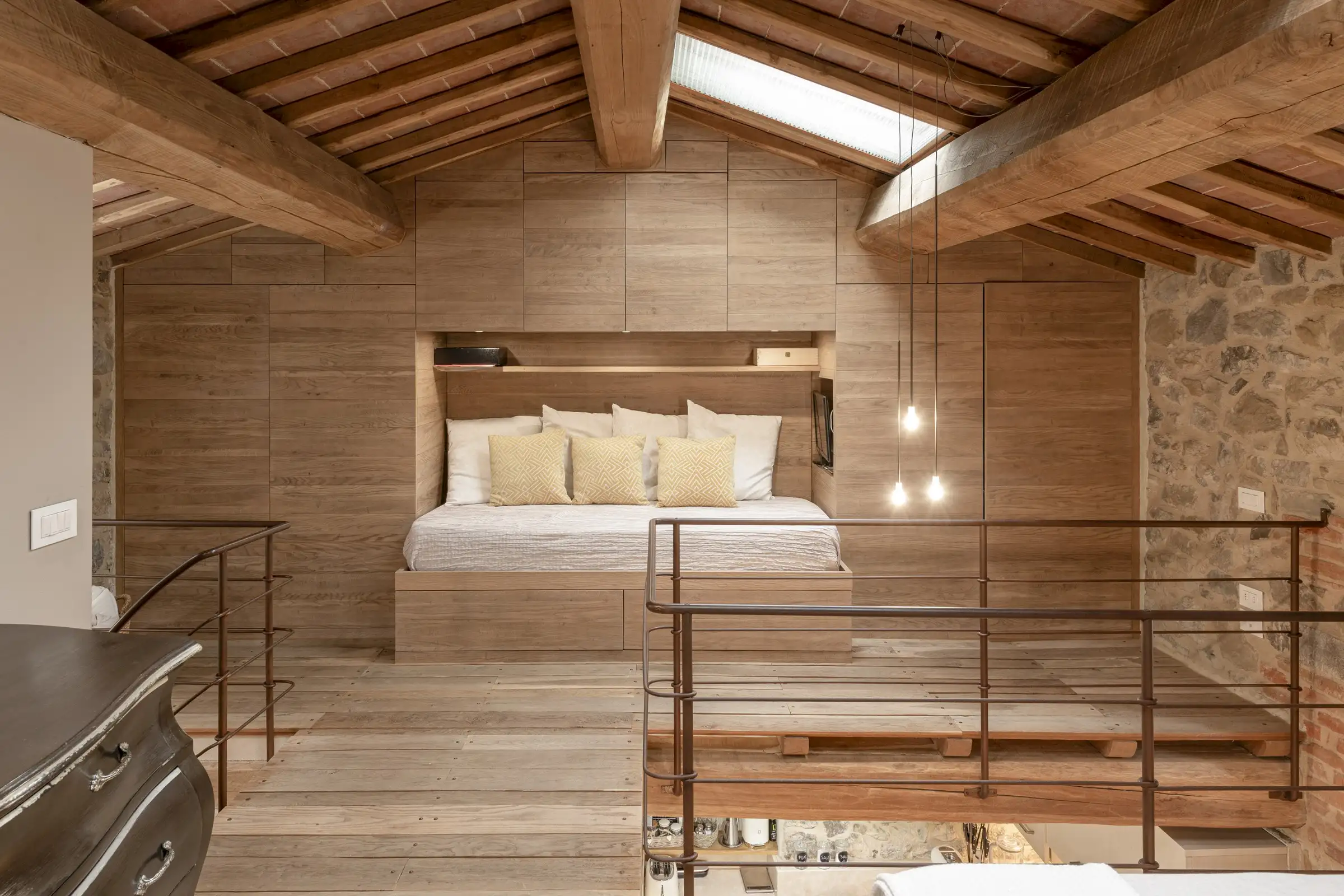 A handcrafted corten spiral staircase leads to the upper level – a semi-open mezzanine with oak floorboards laid on the ceiling beams of the floor below that are open in cross-section, showcasing the materials and traditional craftsmanship. The stairs bisect the space with the bedroom with one double bed and walk in closet on one side, and on the other side, built-in cupboard with a sofa couch in the middle that may be turned into a single bed. There are also automatic skylights and an AC unit. Each element of the property has been thoughtfully designed to maximise the space without compromising on quality. The furniture is custom-made by Paganelli.