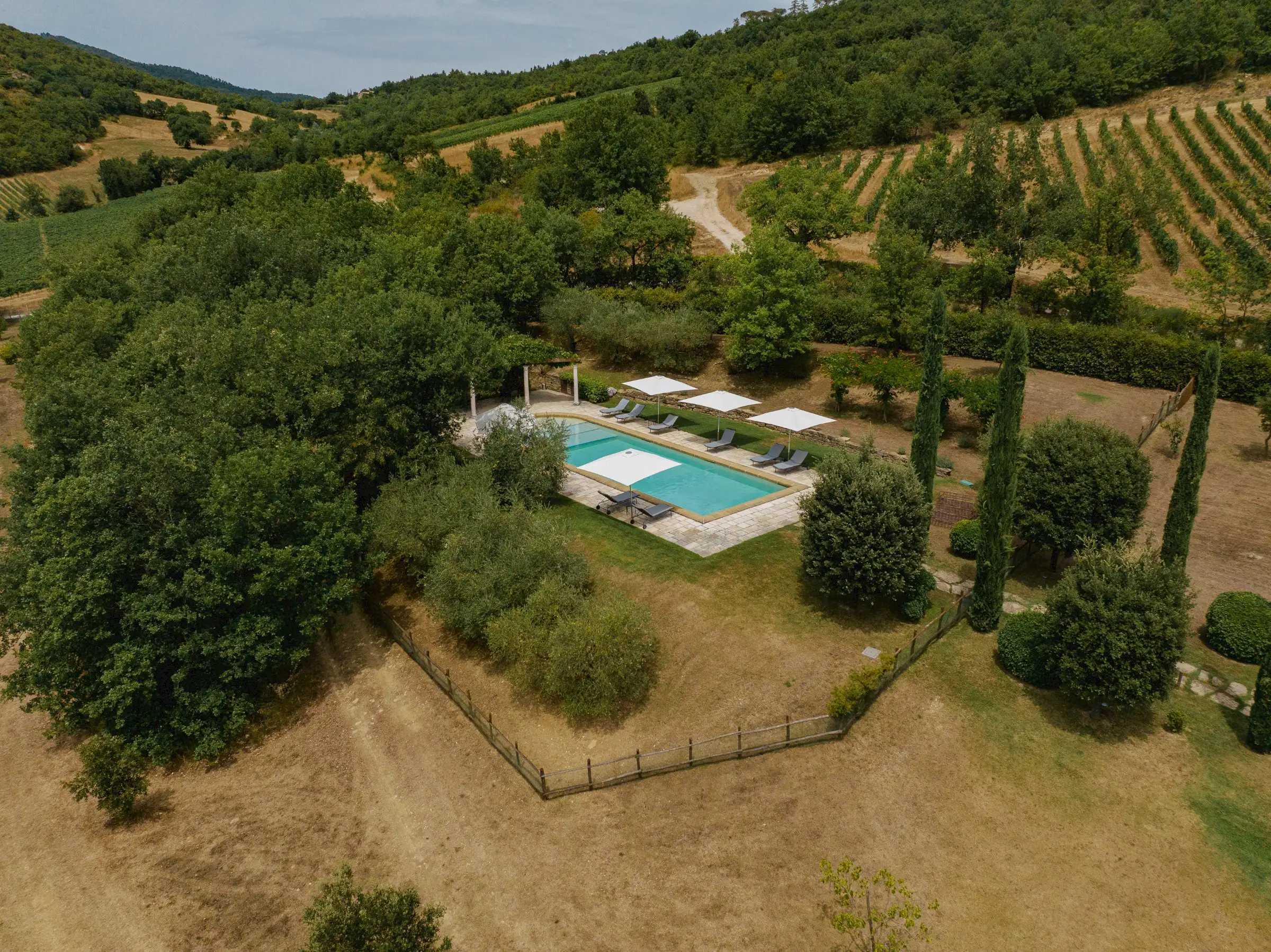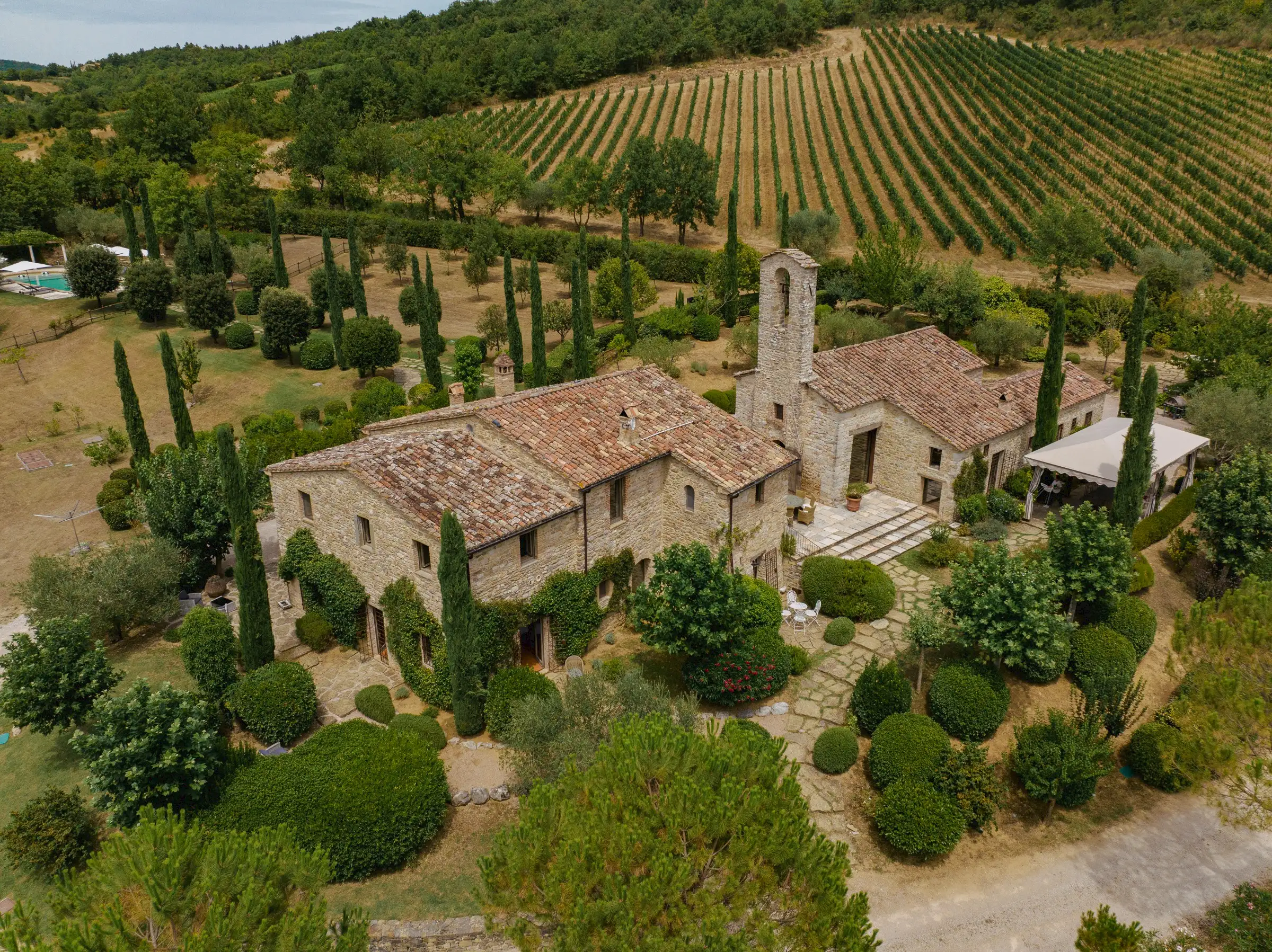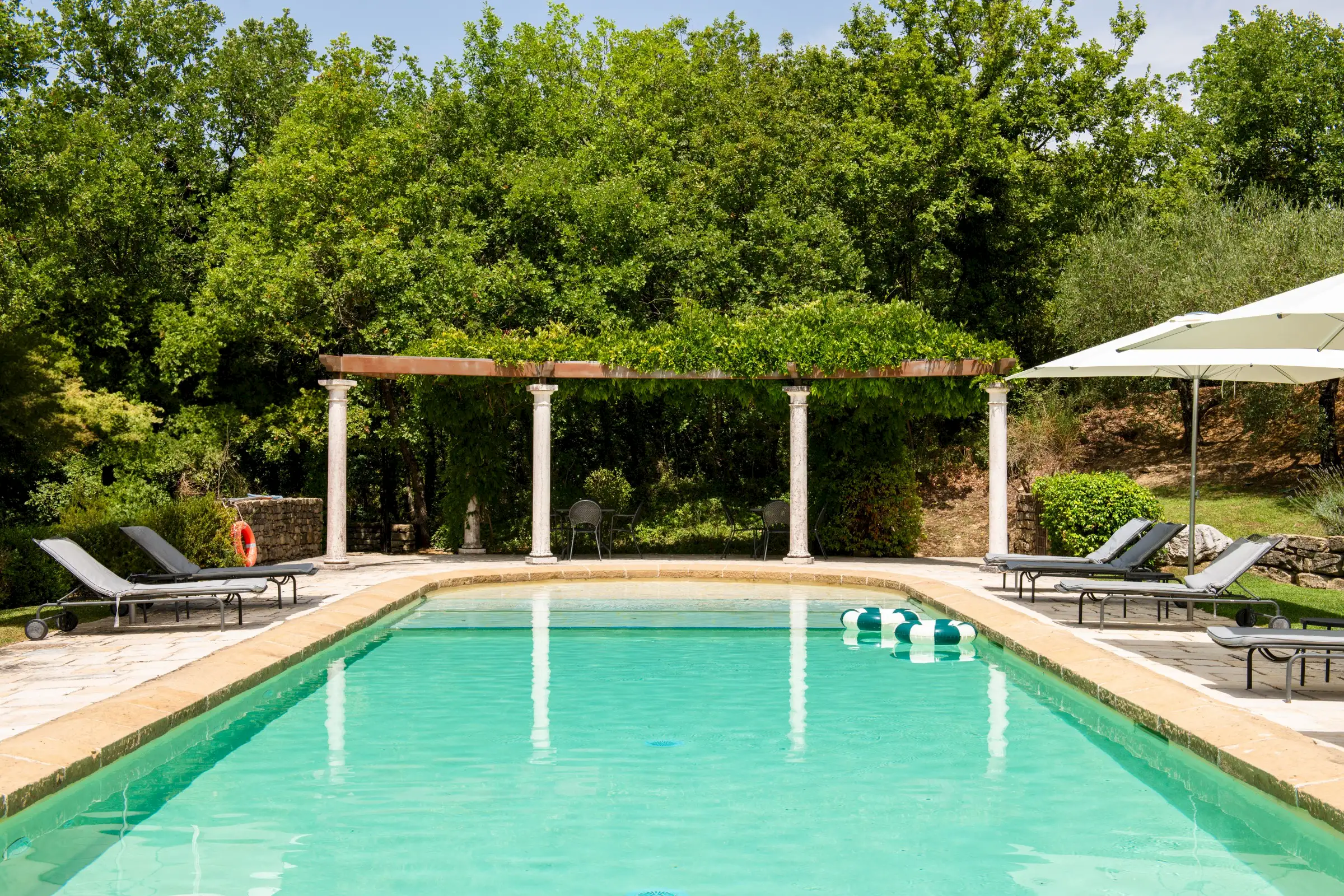 A cypress-lined avenue leads to an elegant pool area with an outdoor shower and a wisteria-clad pergola. The buildings are surrounded by fully fenced private land, partly with hedges and on one side by a small local river stream, on which one may find an olive grove, truffle wood, fields and very well kept lush gardens.