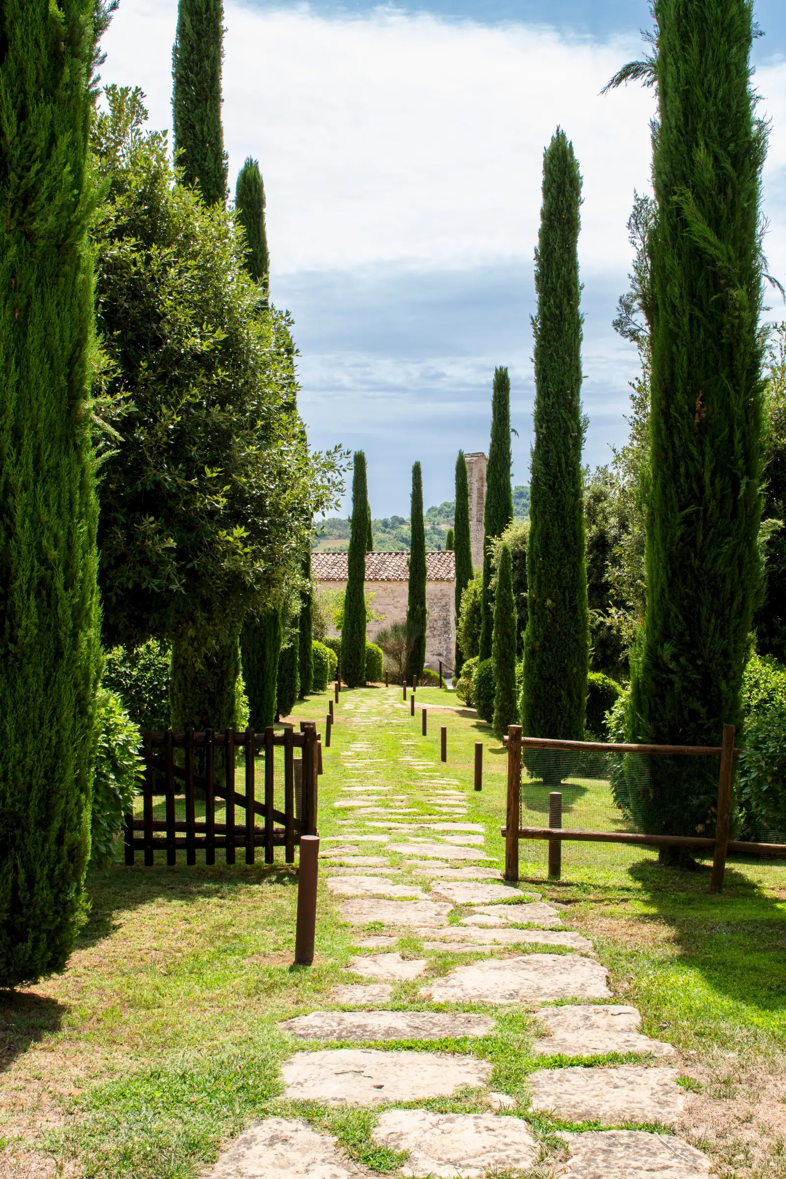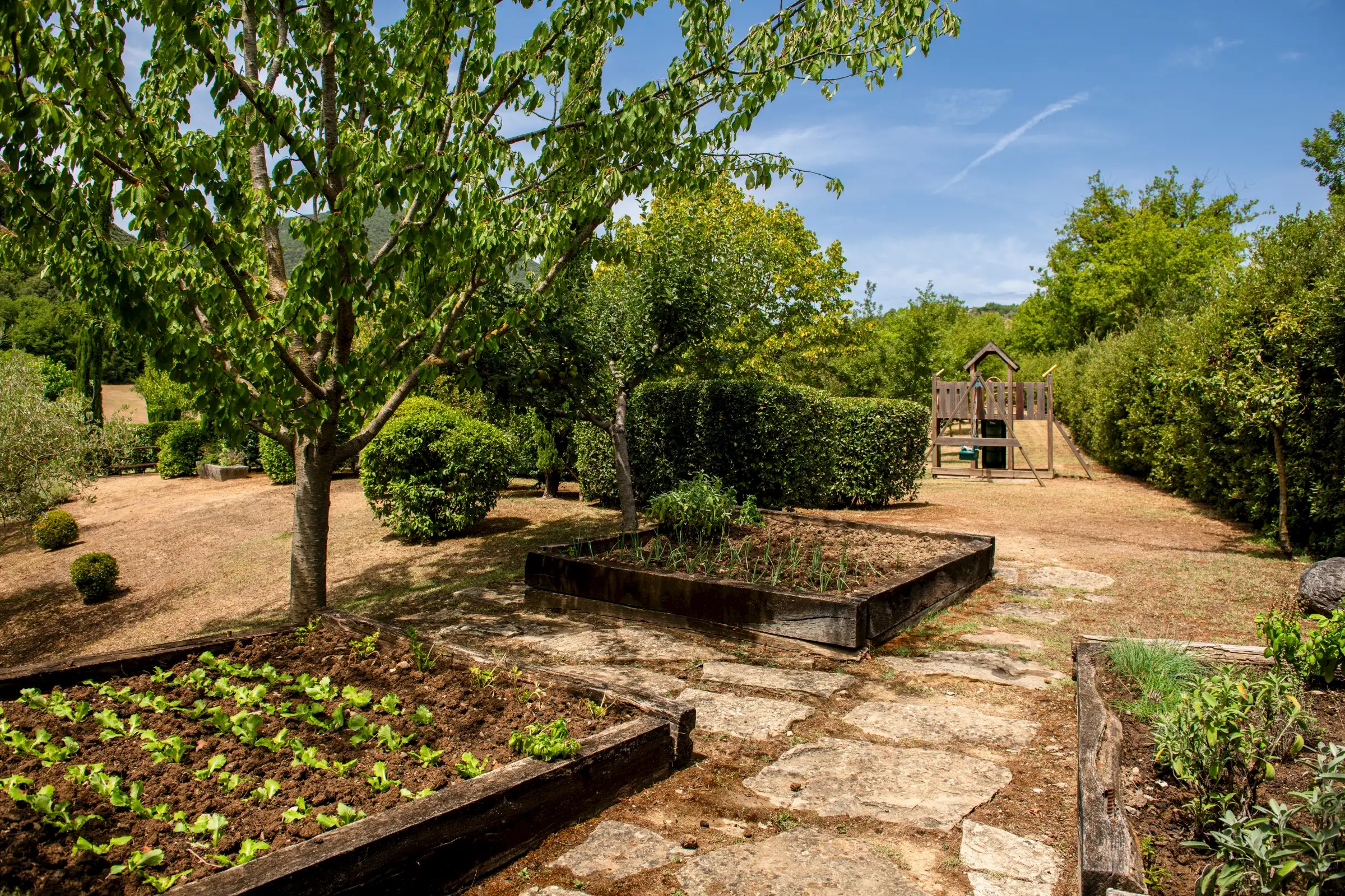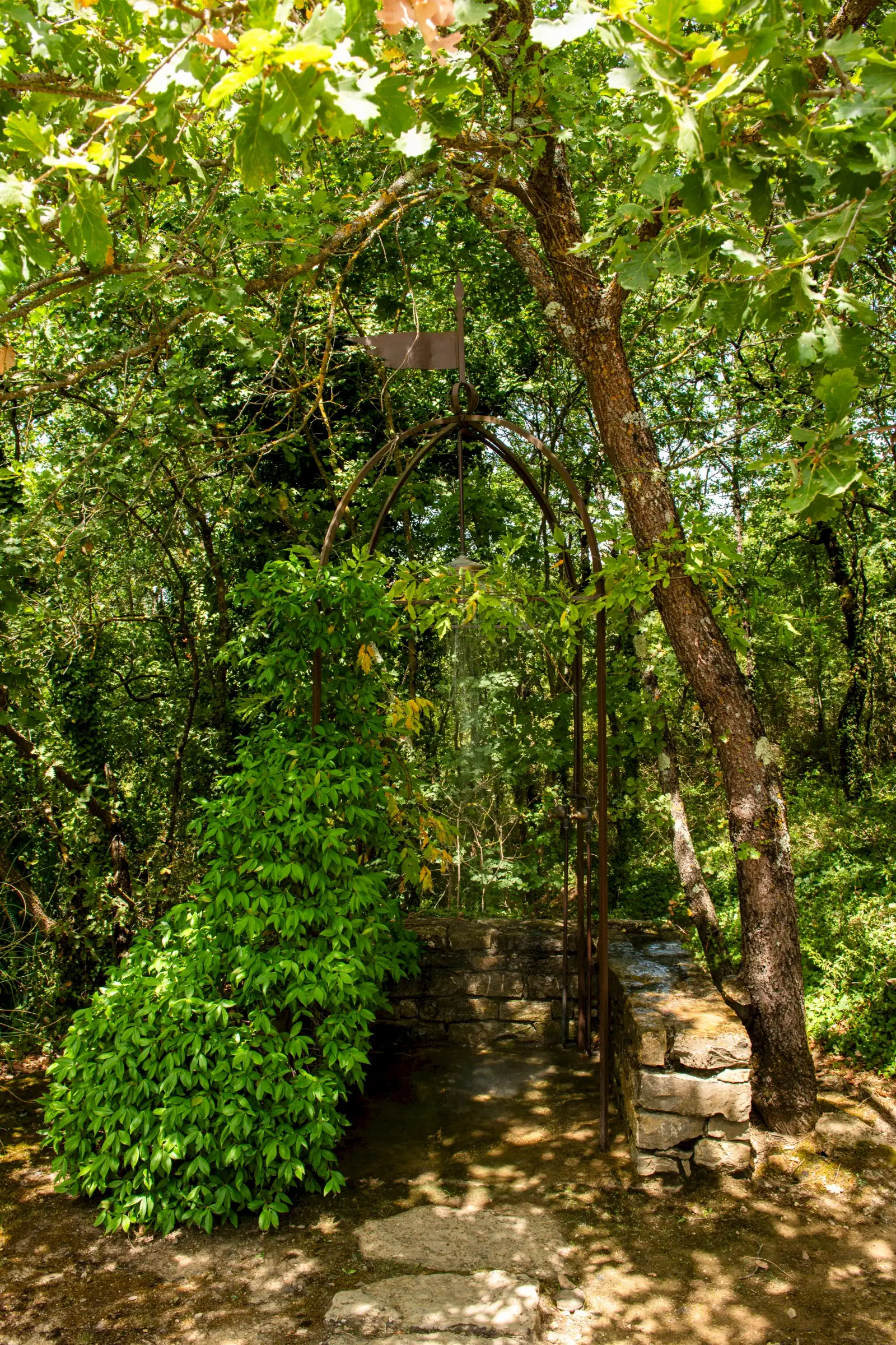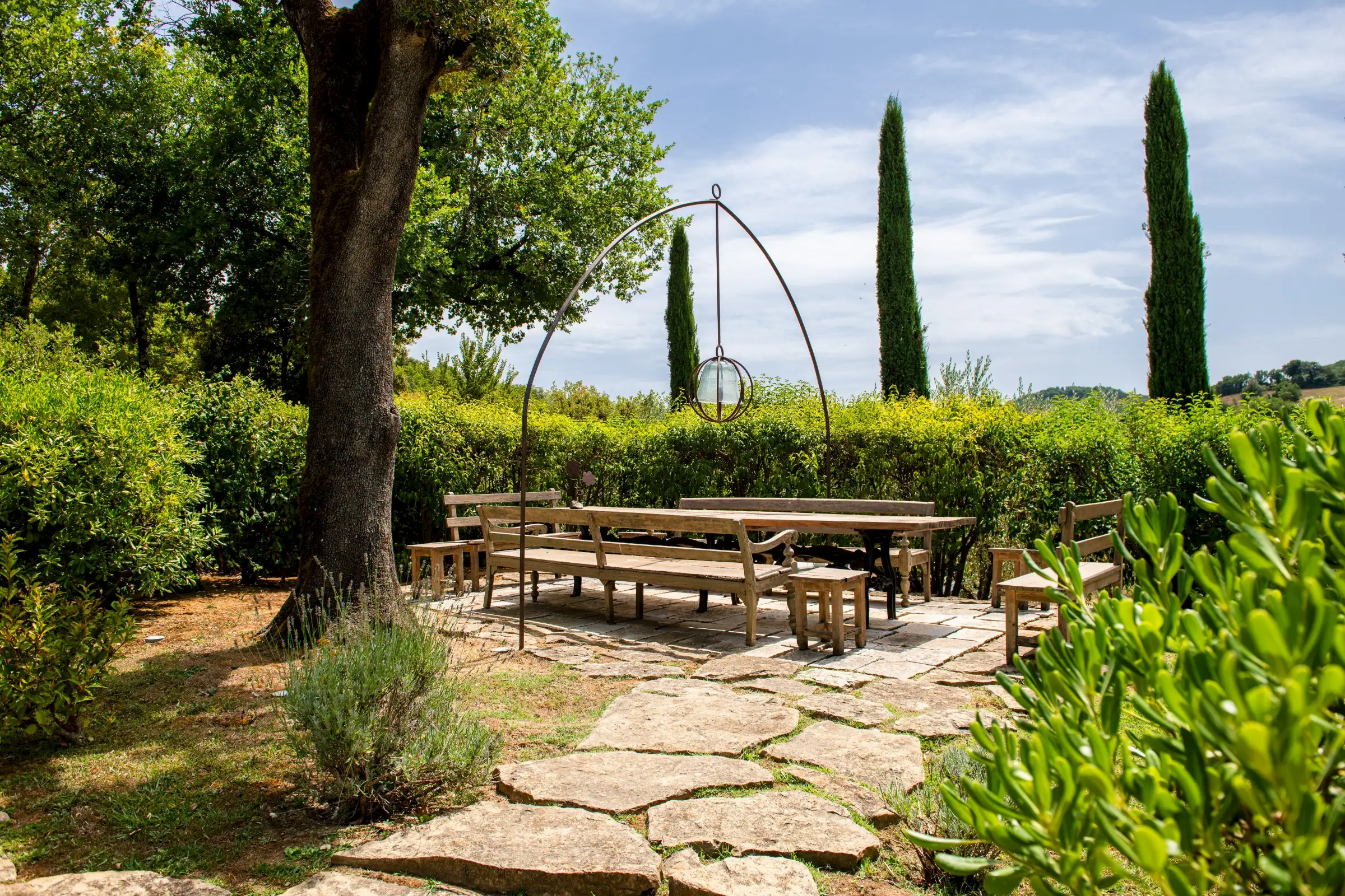 A cypress-lined avenue leads to an elegant pool area with an outdoor shower and a wisteria-clad pergola. The buildings are surrounded by fully fenced private land, partly with hedges and on one side by a small local river stream, on which one may find an olive grove, truffle wood, fields and very well kept lush gardens.