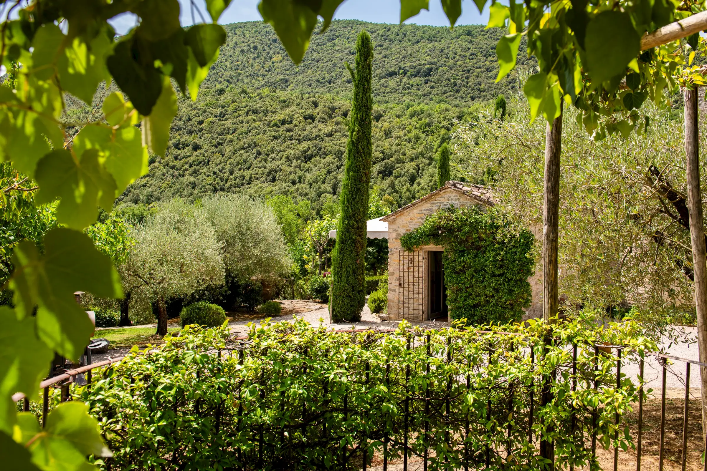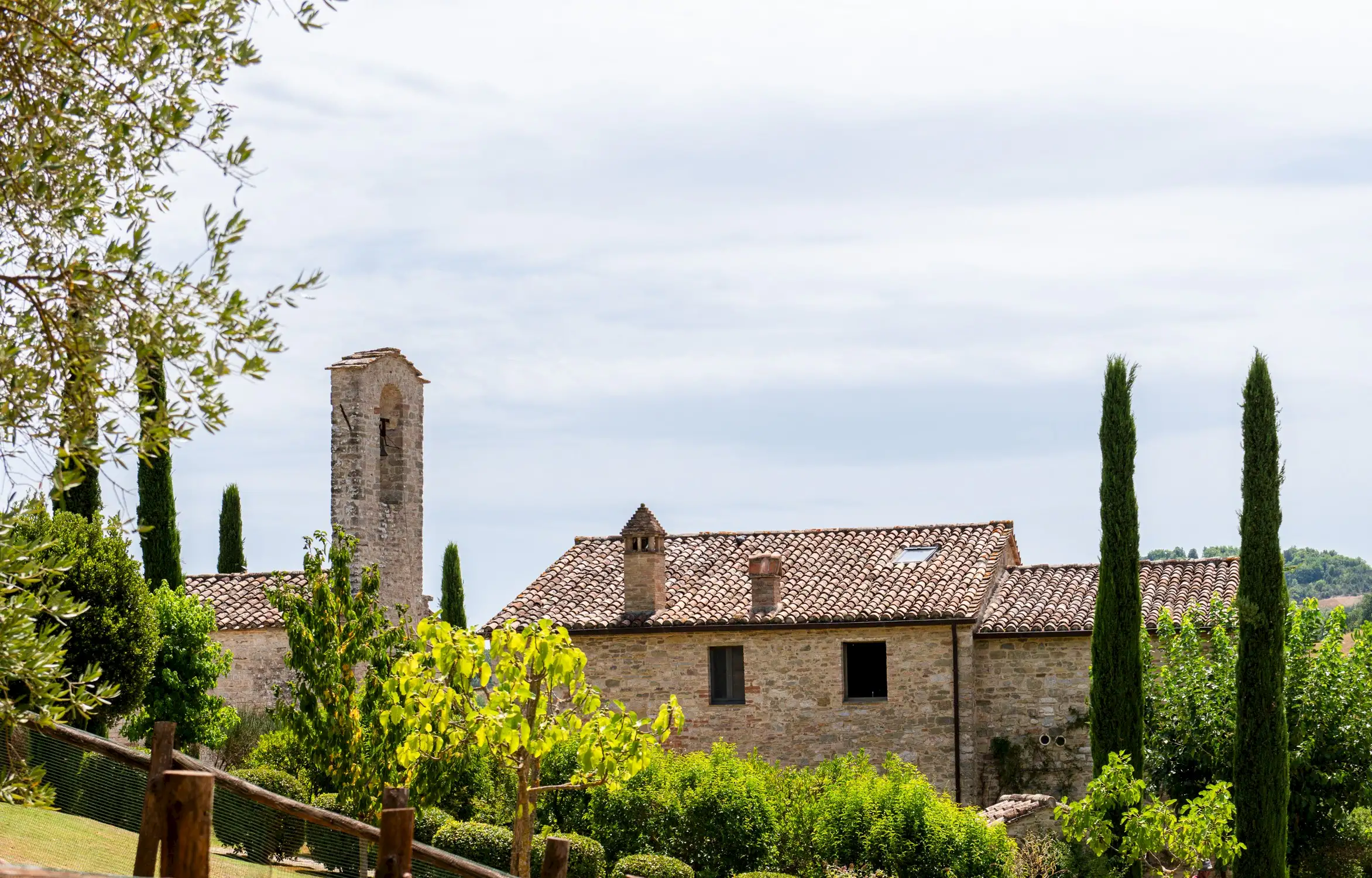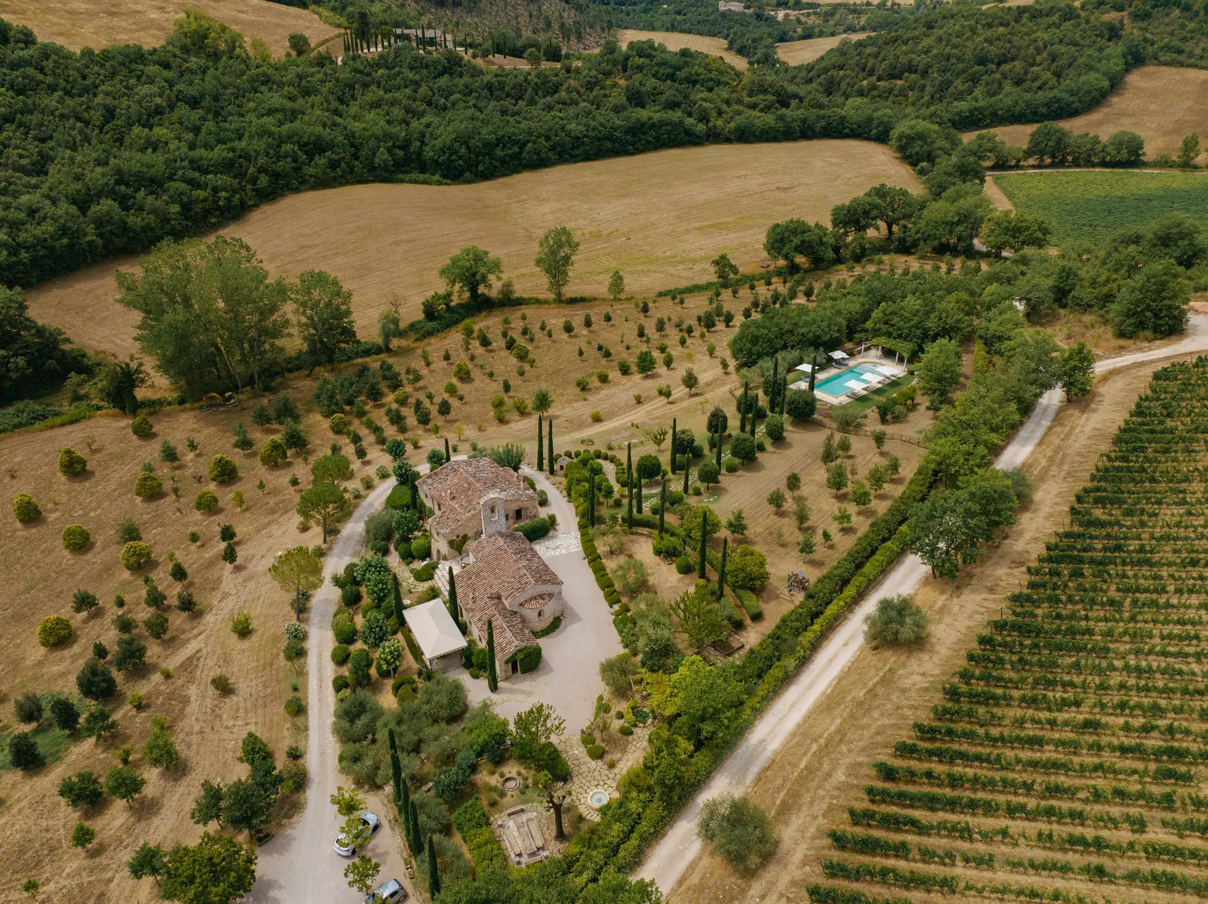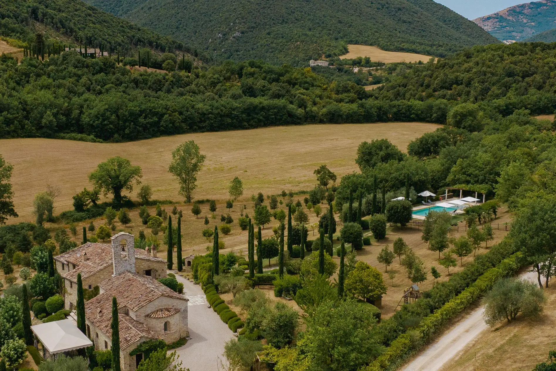 The current owners took on this once-abandoned valley in 2014 and carried out a full renovation of the buildings. The estate is now thriving and includes some other well-restored private properties at comfortable distance from La Chiesetta, olive groves, vineyards, truffle wood and a winery.