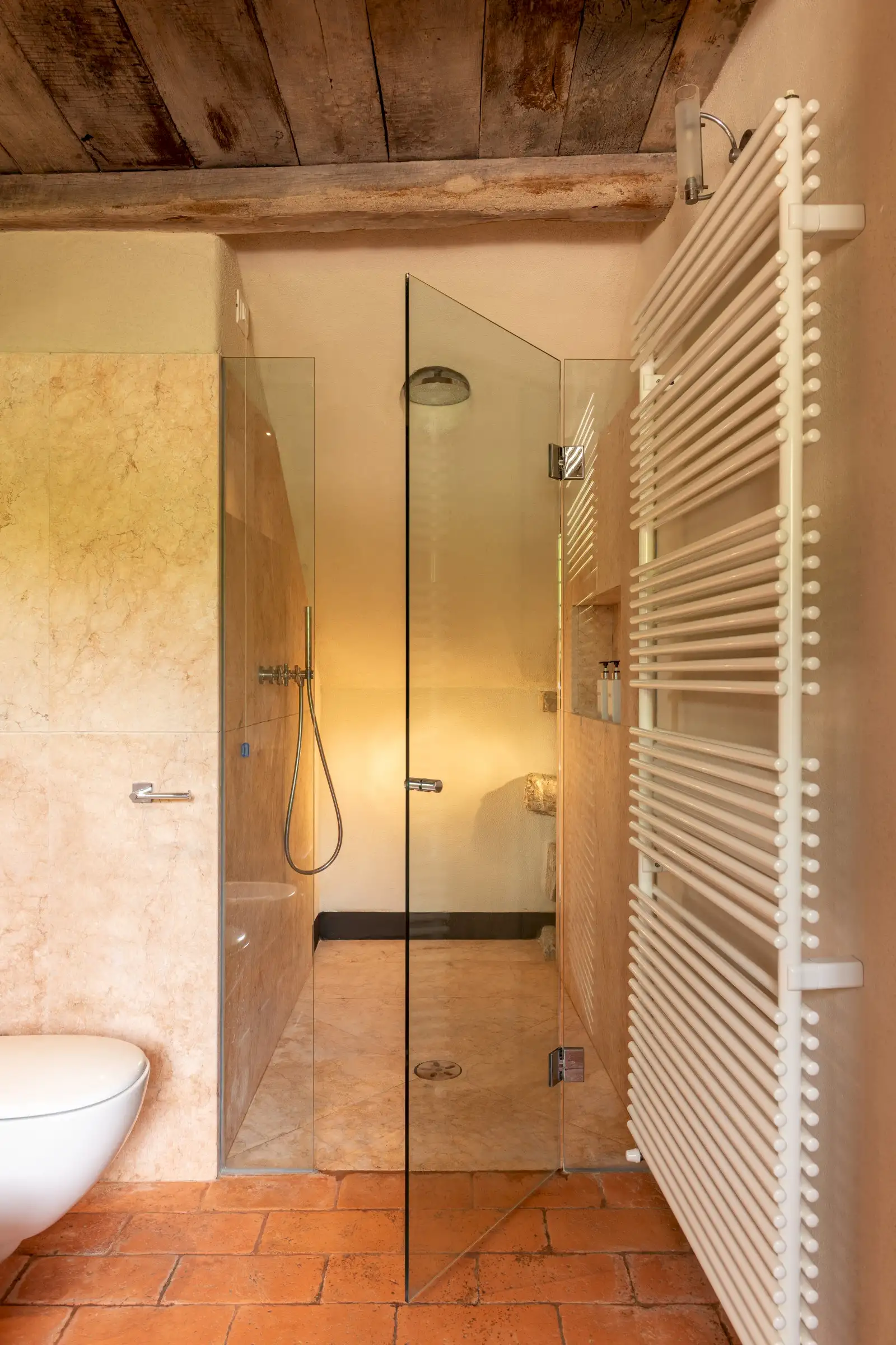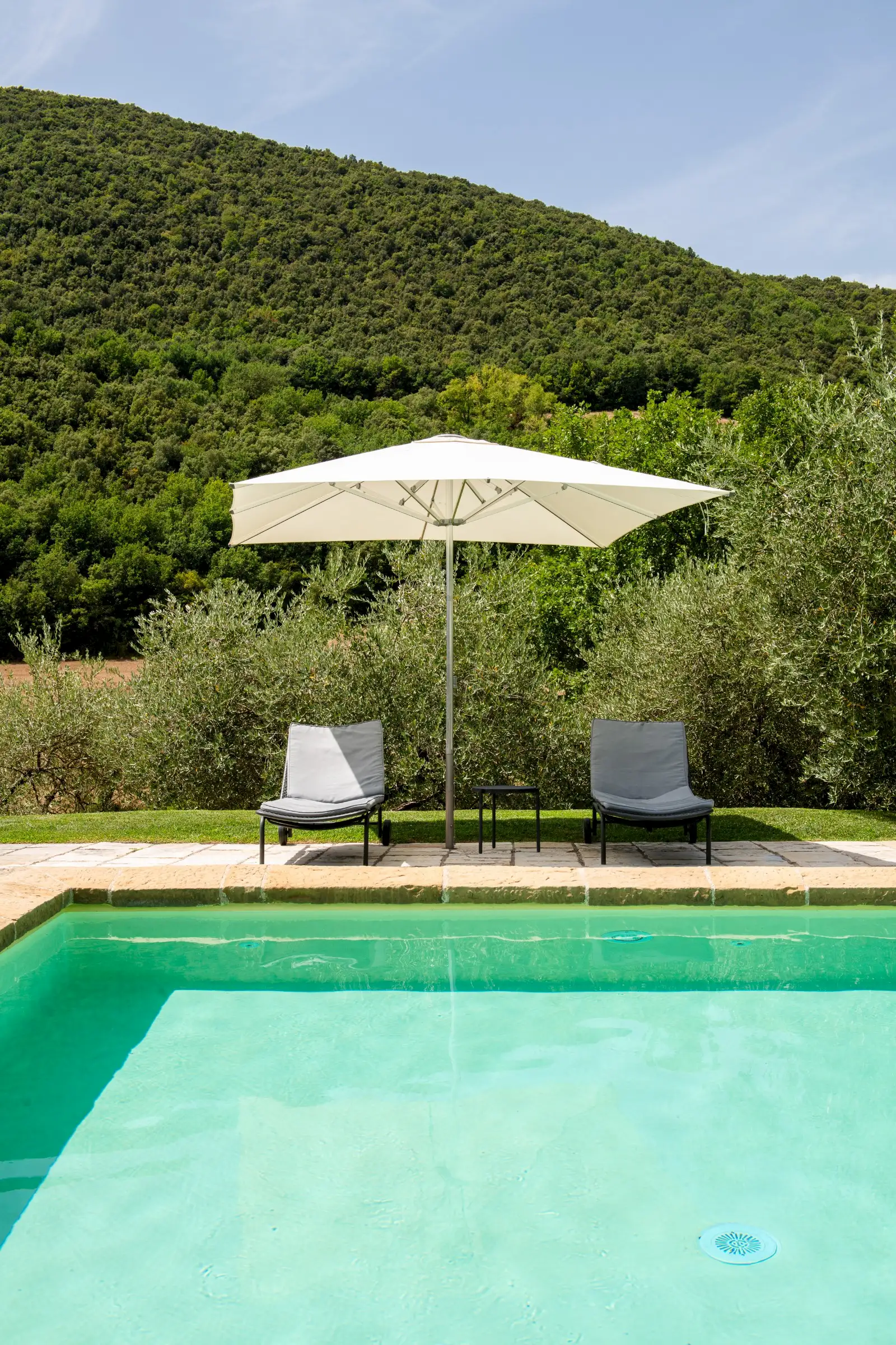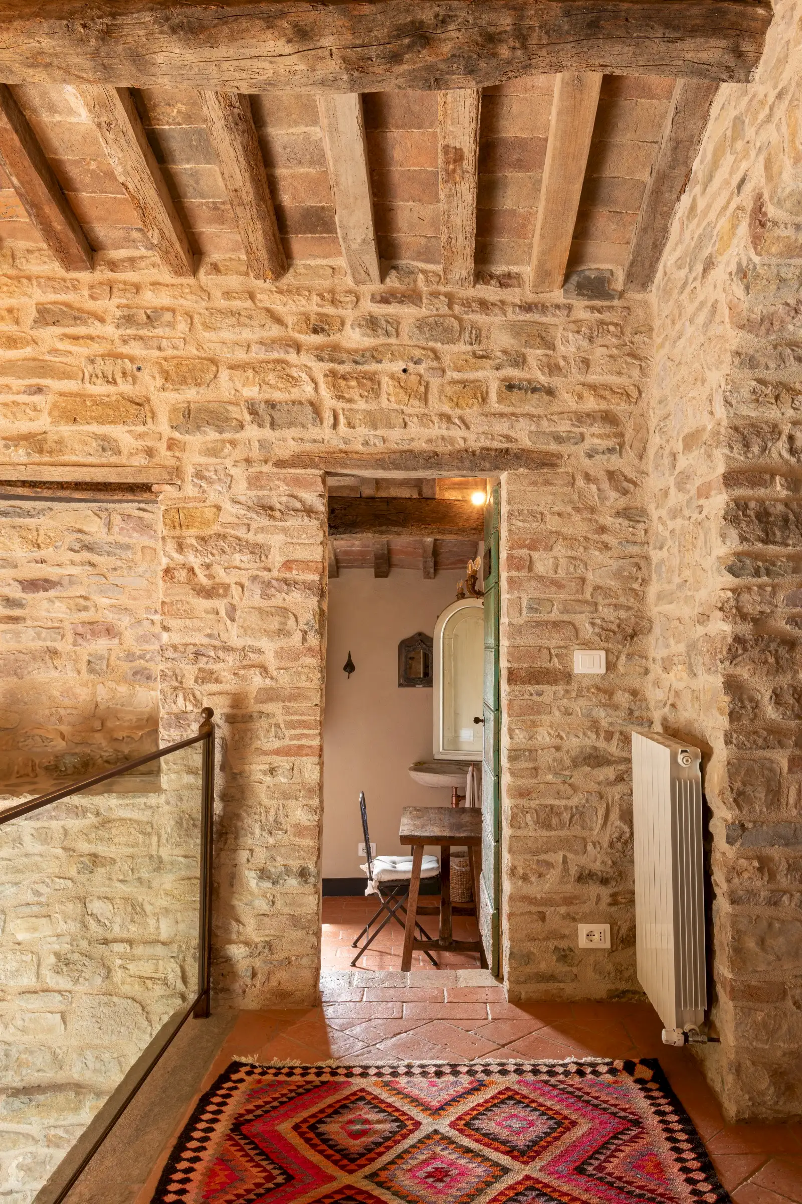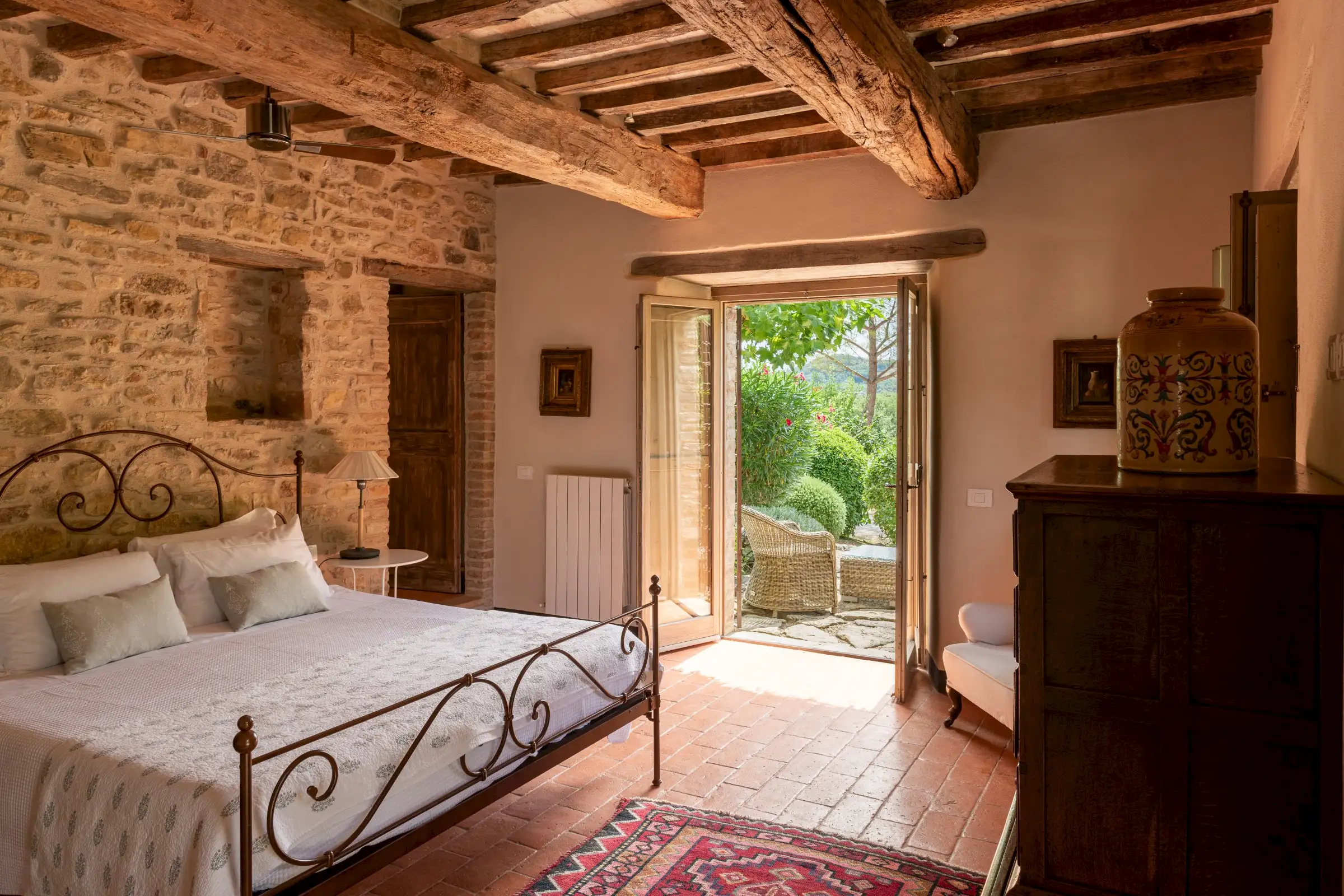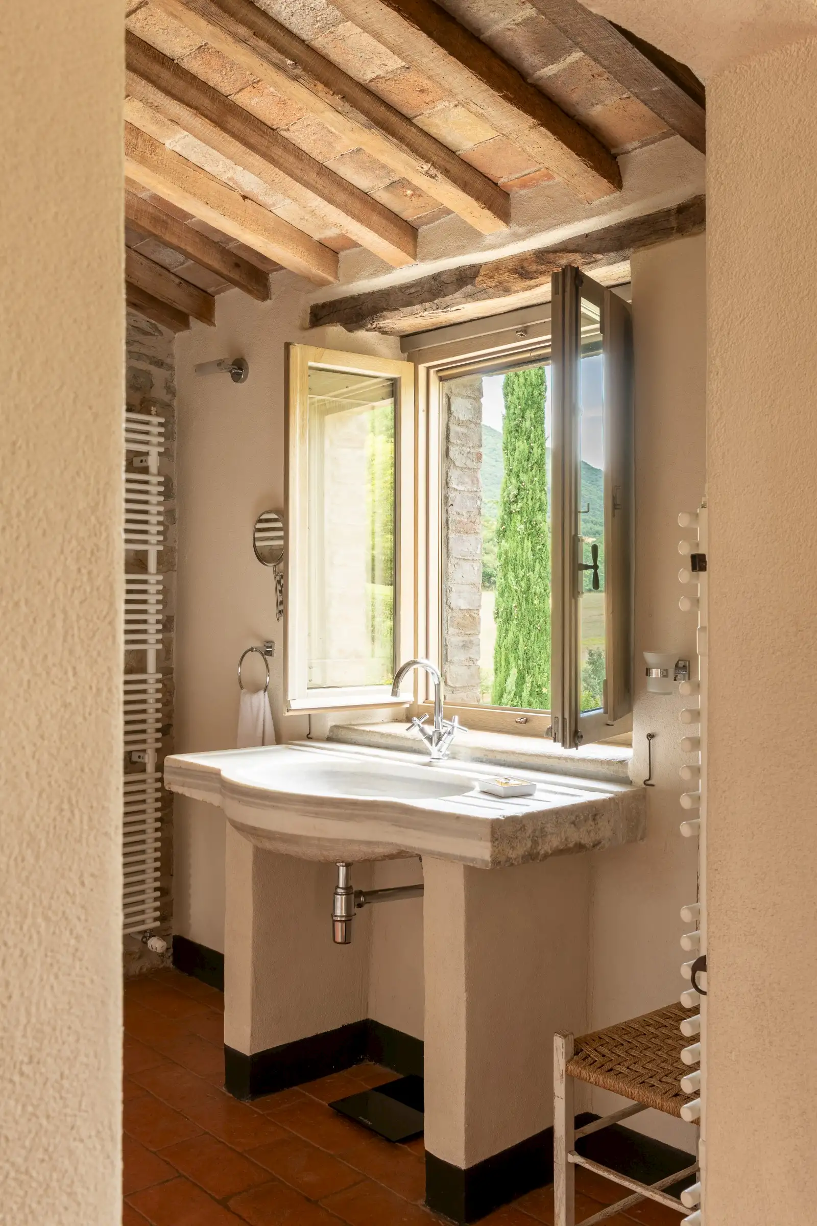 The current owners took on this once-abandoned valley in 2014 and carried out a full renovation of the buildings. The estate is now thriving and includes some other well-restored private properties at comfortable distance from La Chiesetta, olive groves, vineyards, truffle wood and a winery.