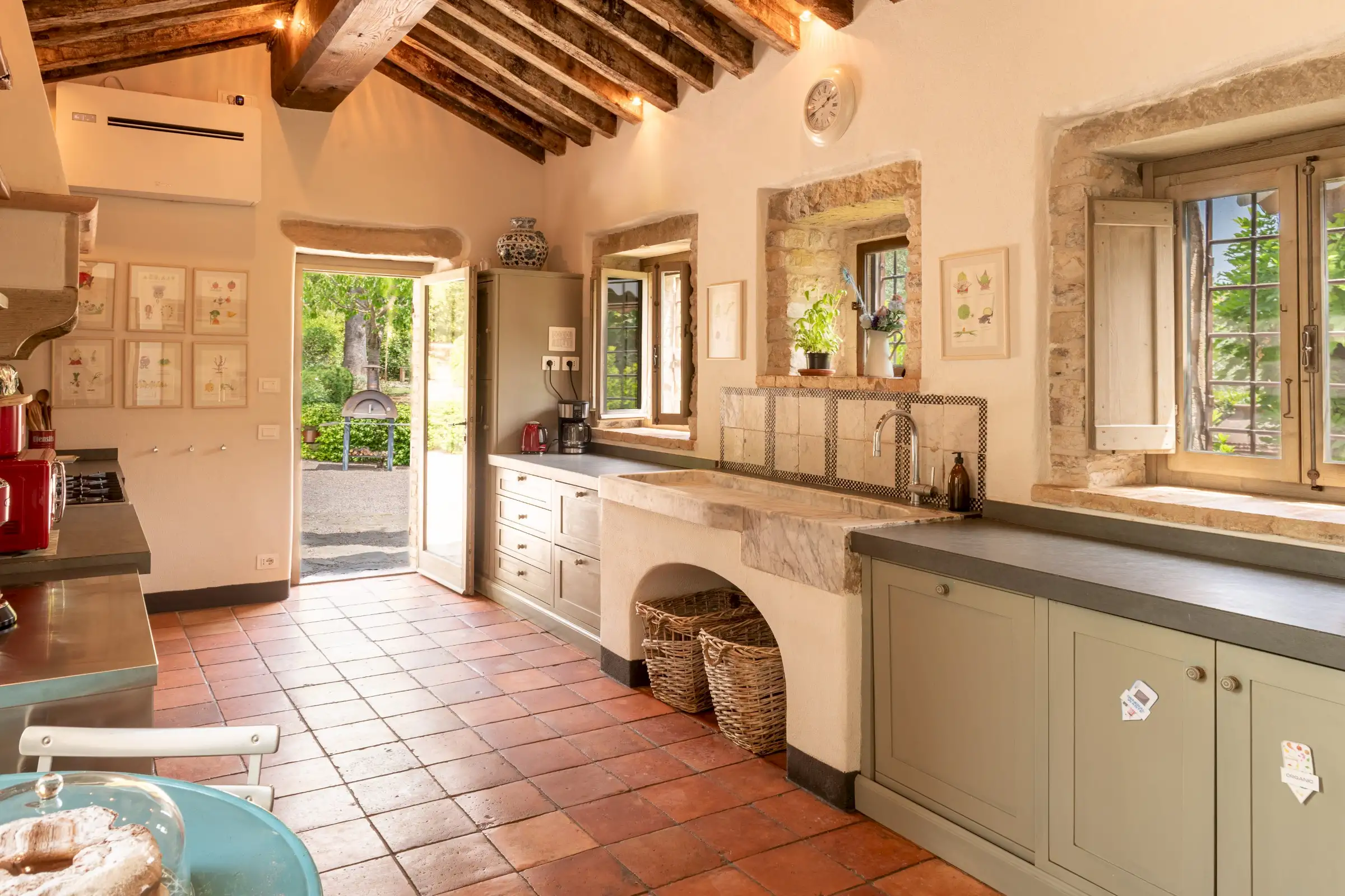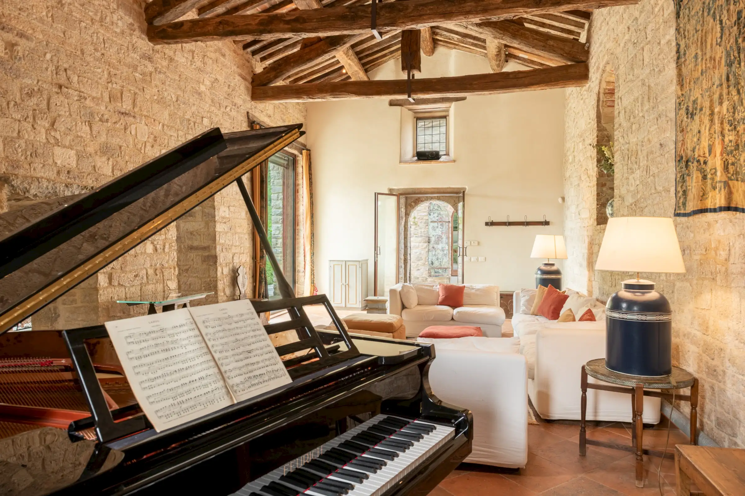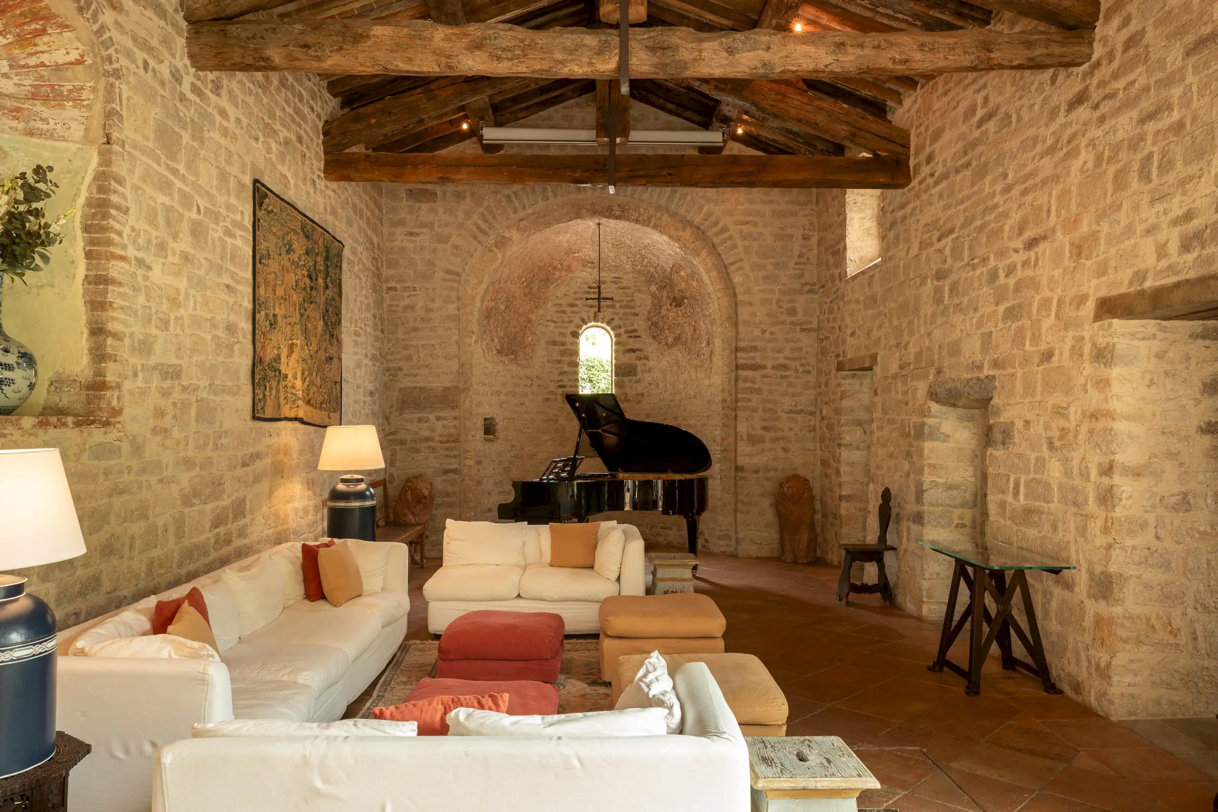 La Chiesetta is a large family home that also lends itself perfectly to weddings, concerts or any other big gathering, thanks to its captivating mix of grandeur, warmth and charm. The chapel’s pale stone walls and magnificent beamed roof offer an incredible venue space.