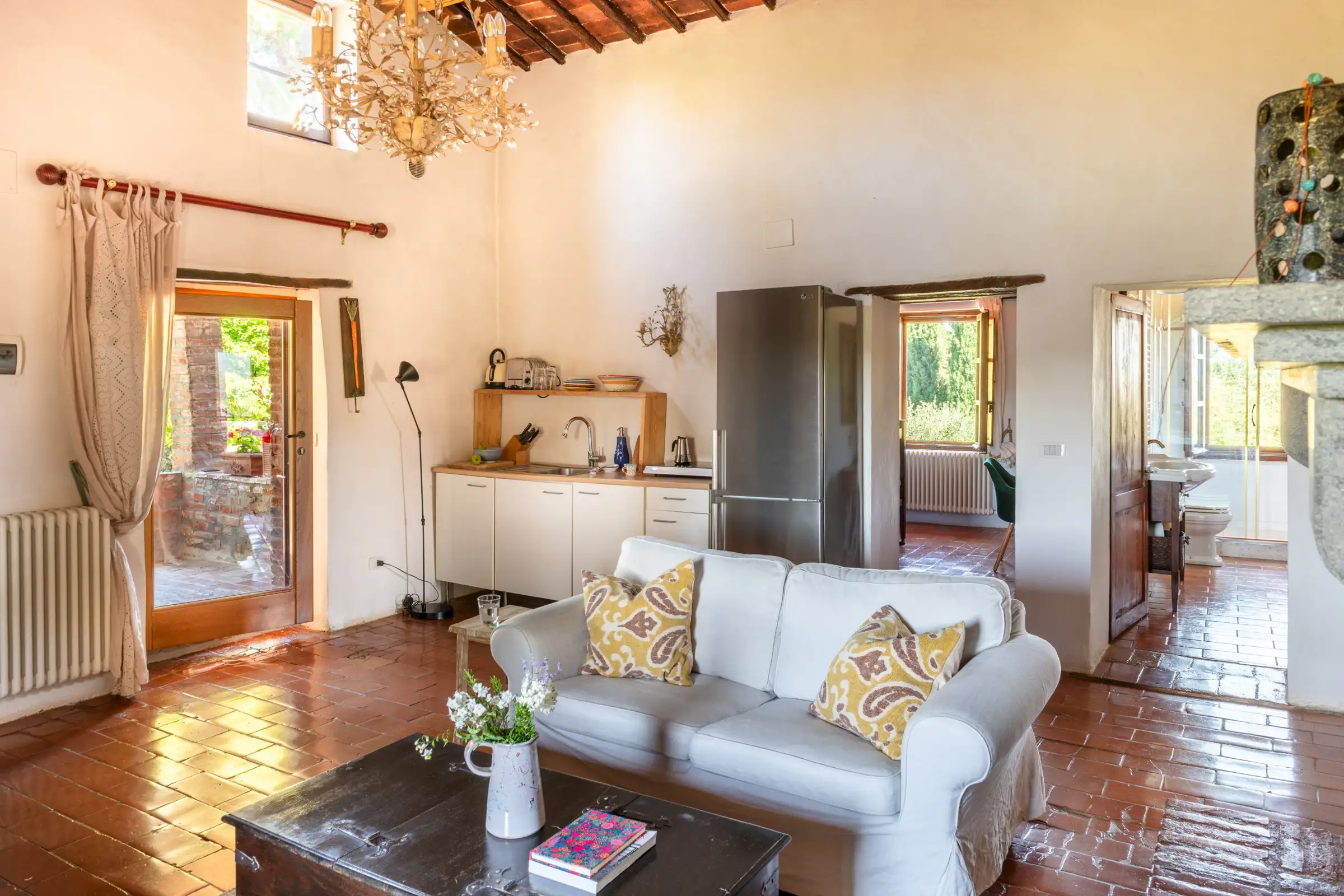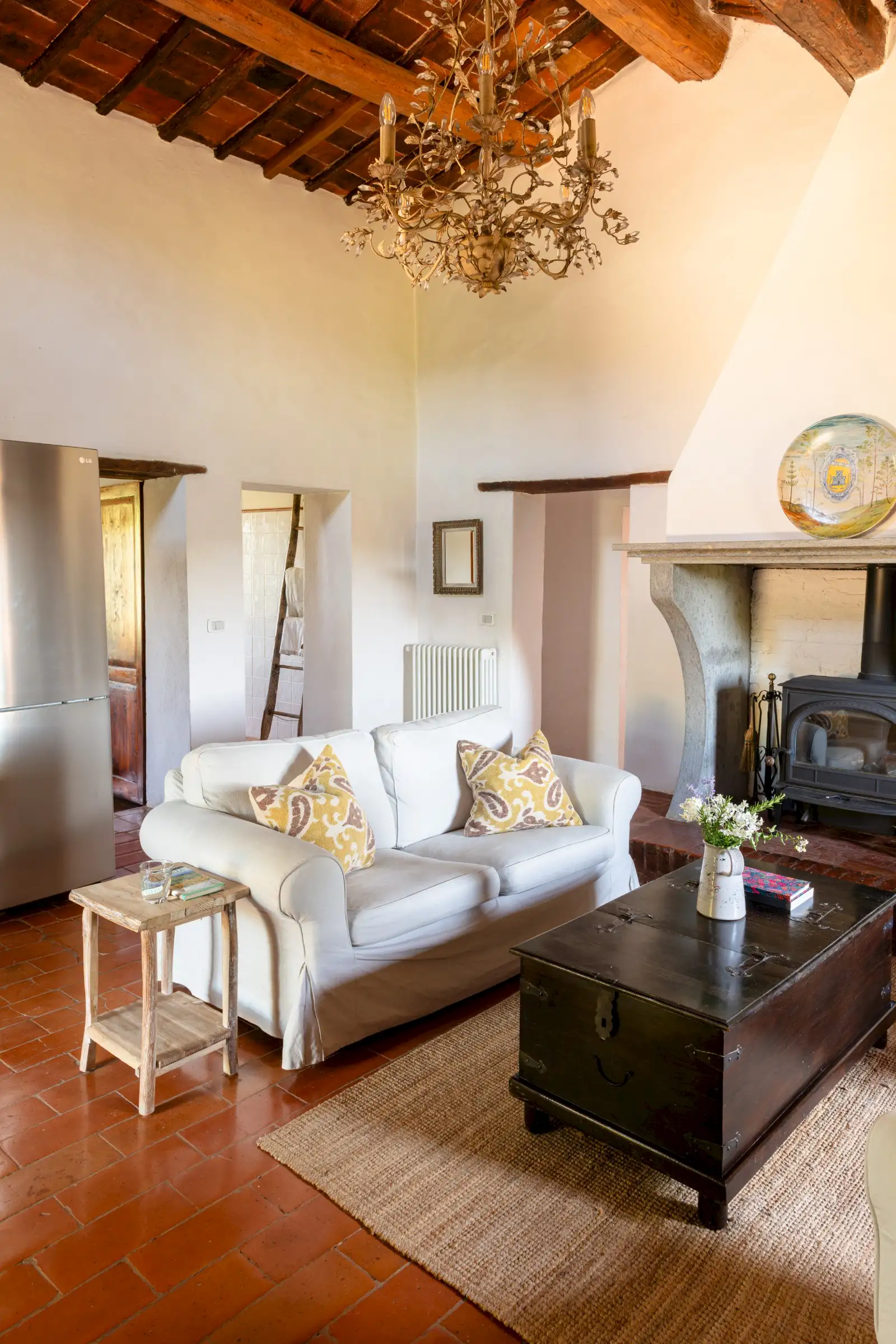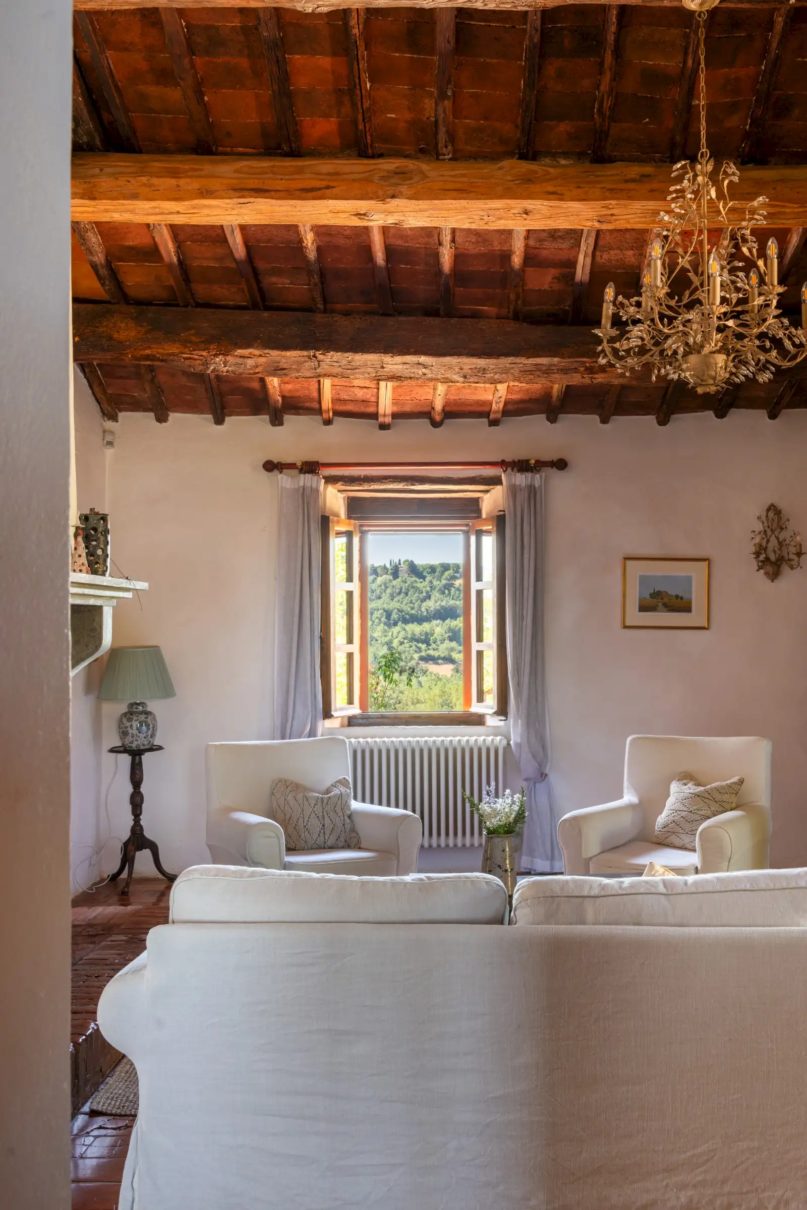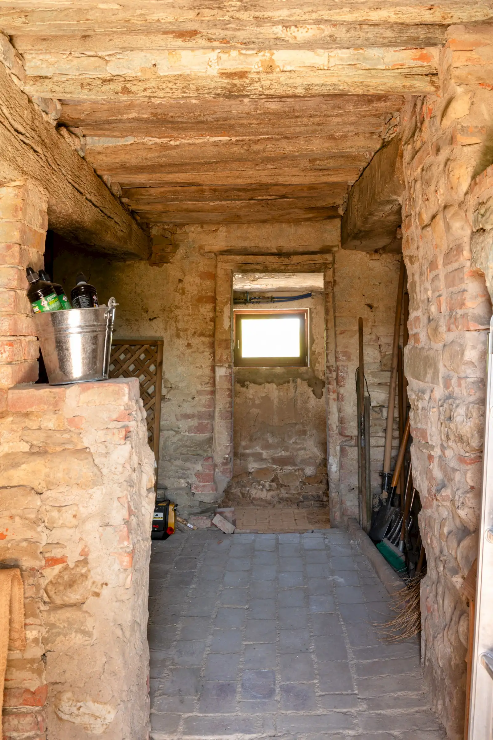 The property offers rare flexibility. The first floor has been carefully restored around 2015, and includes traditional features such as original, uneven cotto floors and wooden ceiling beams in the double-height sitting room. The result is light and inviting rooms that look out over the garden and across an olive grove to the hills beyond. The roof was renovated in 2020.